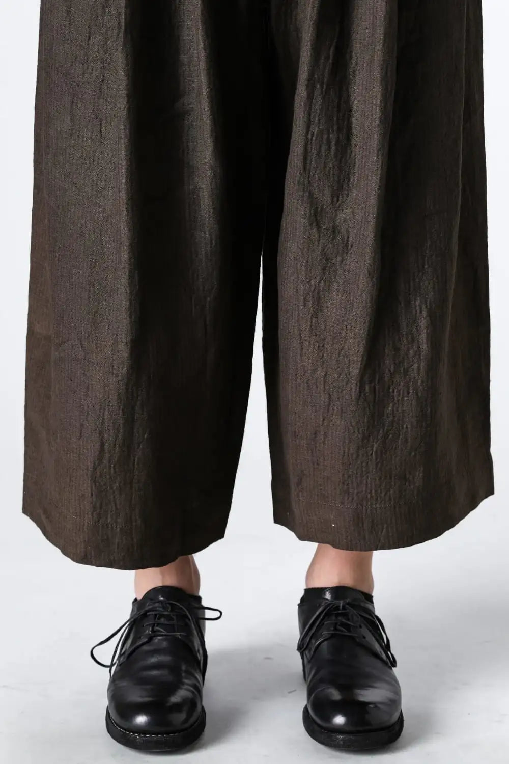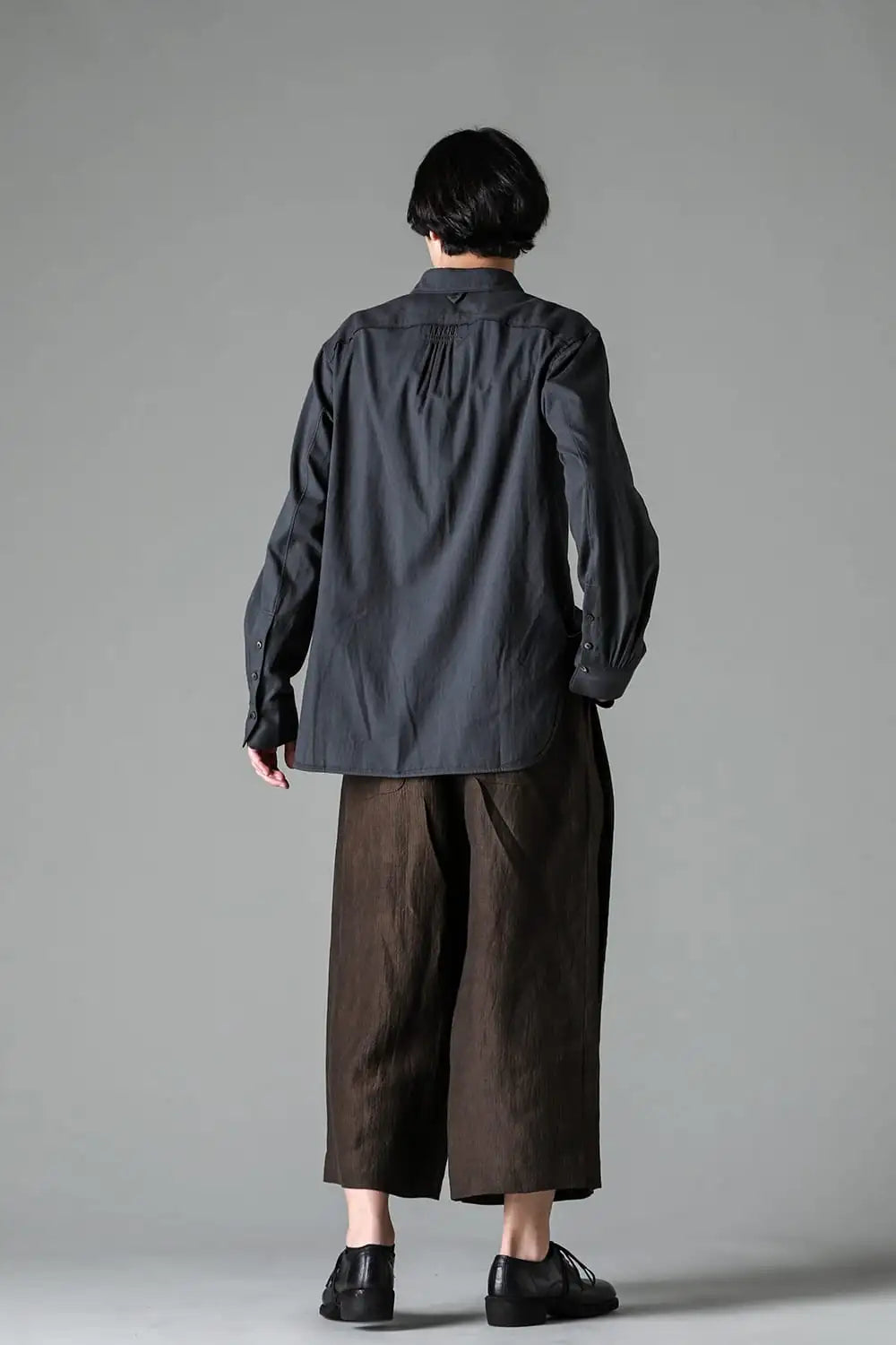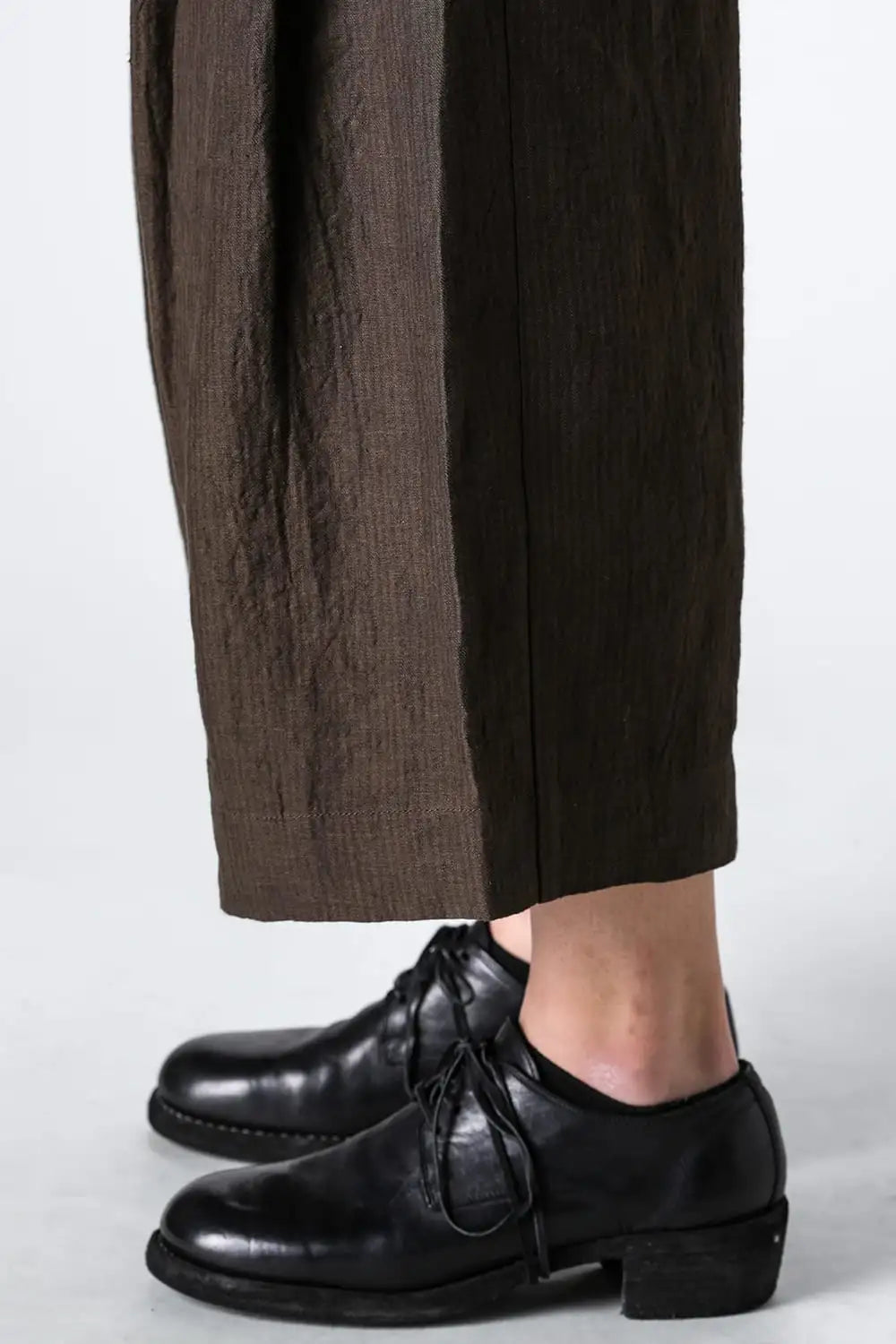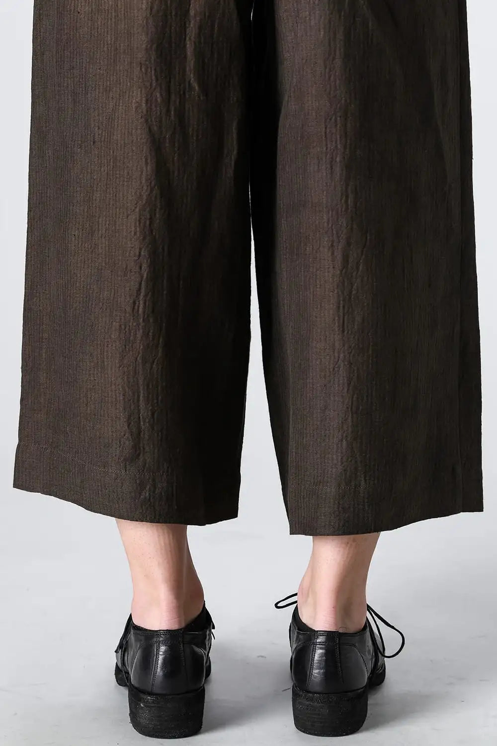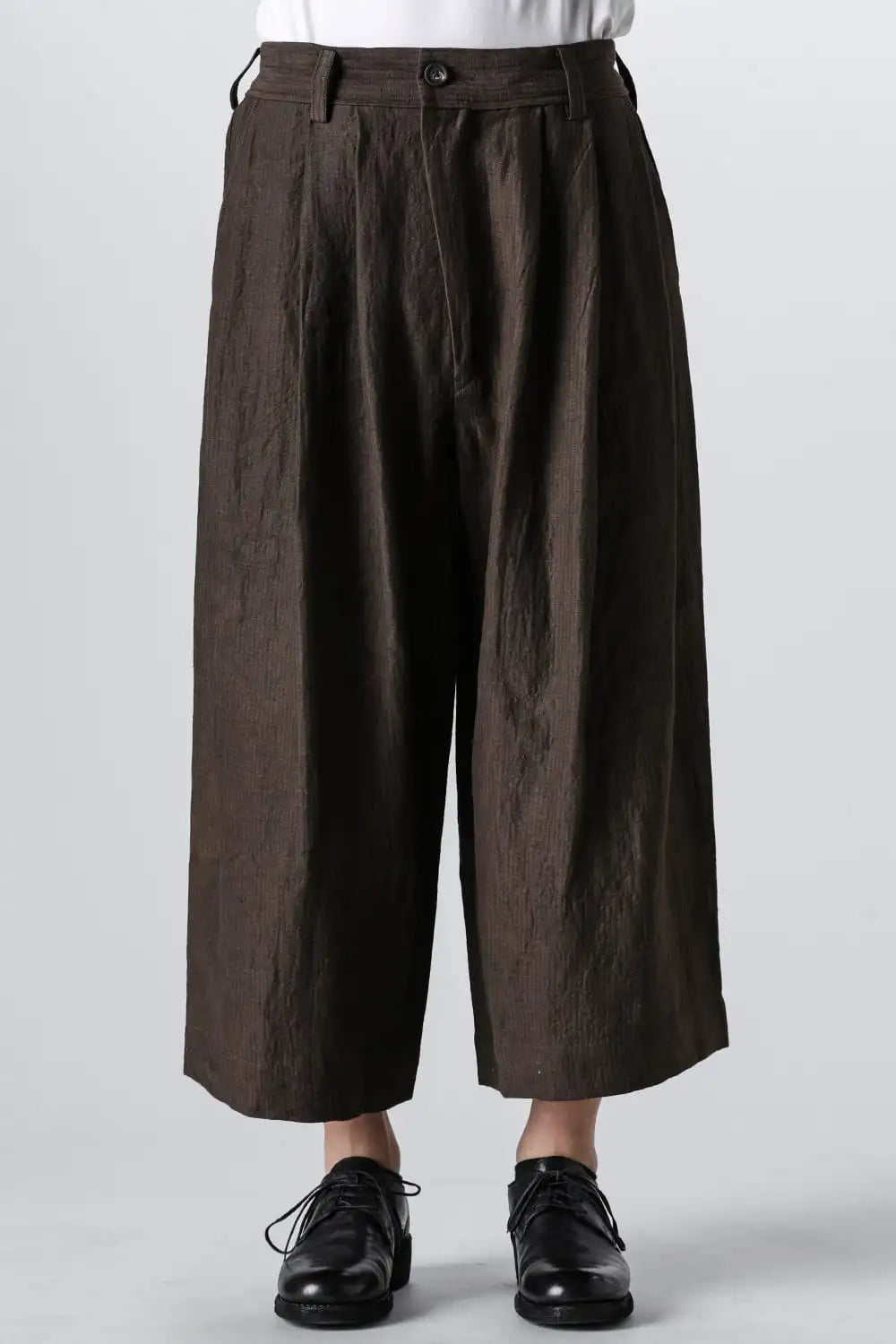 3タックのワイドシルエットのクロップドパンツ。 ベルトループ付きですが、ウエストの両サイドにゴムが着用者のサイズに合わせて伸縮するので、1つのサイズで幅広くカバーできます。 両サイドにポケット、バックポケットは水牛ボタン付きのパッチポケットがついています。 素材はリネンで透け感はないですが薄手で通気性も良く、腿から裾にかけてテーパードの少ないシルエットがしなやかなドレープ性のある生地感とよくマッチしています。