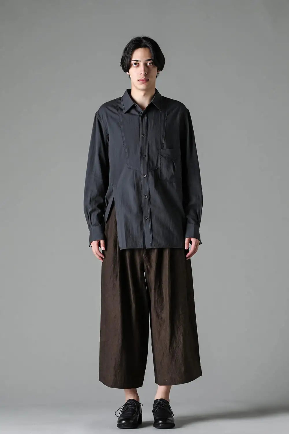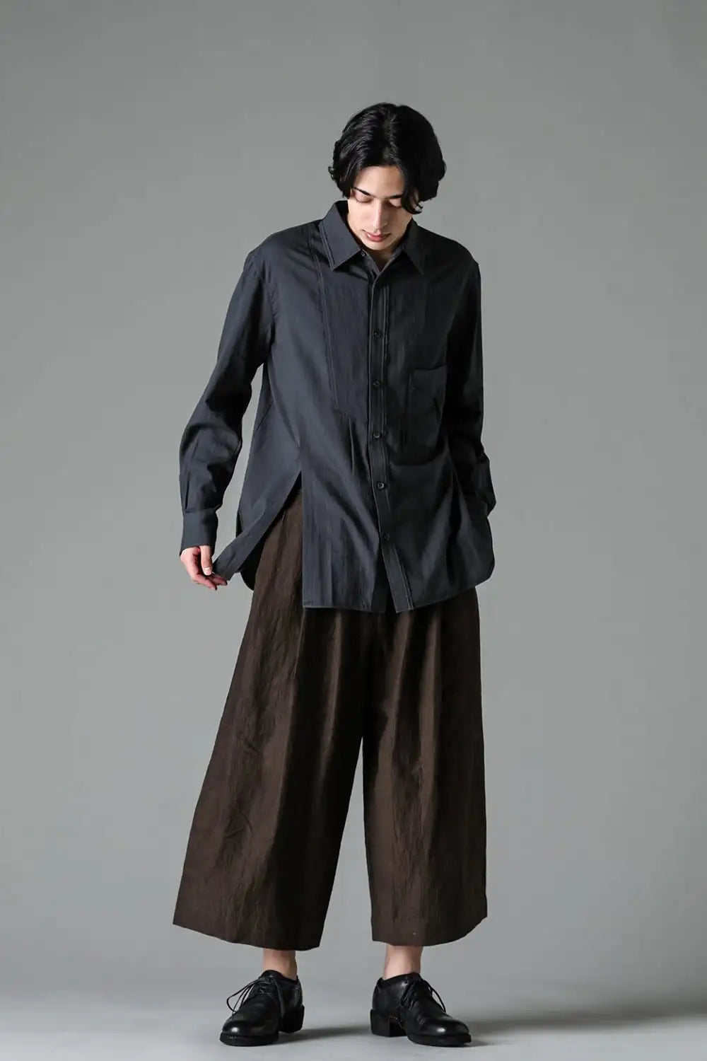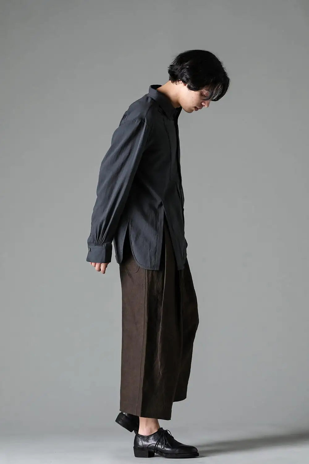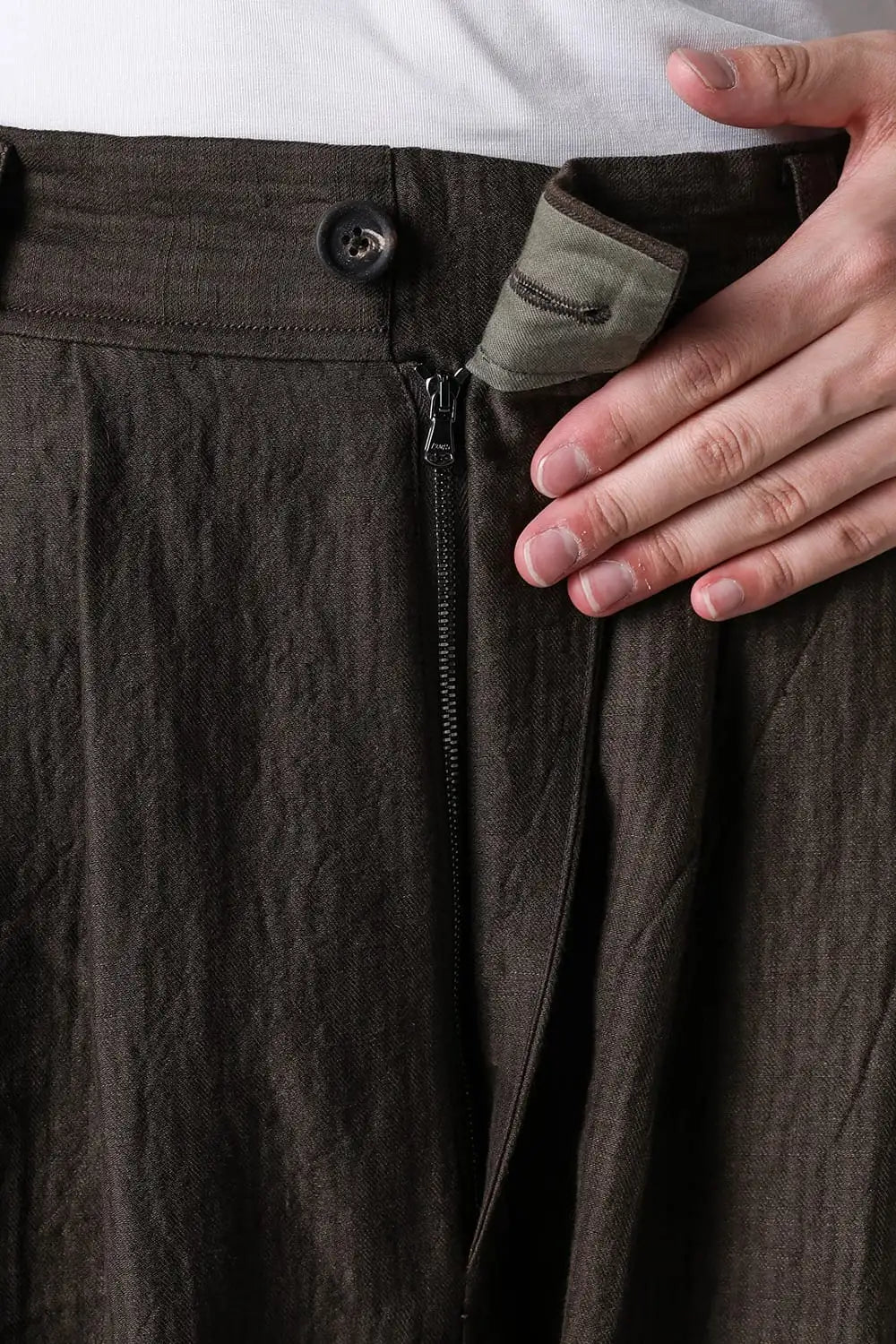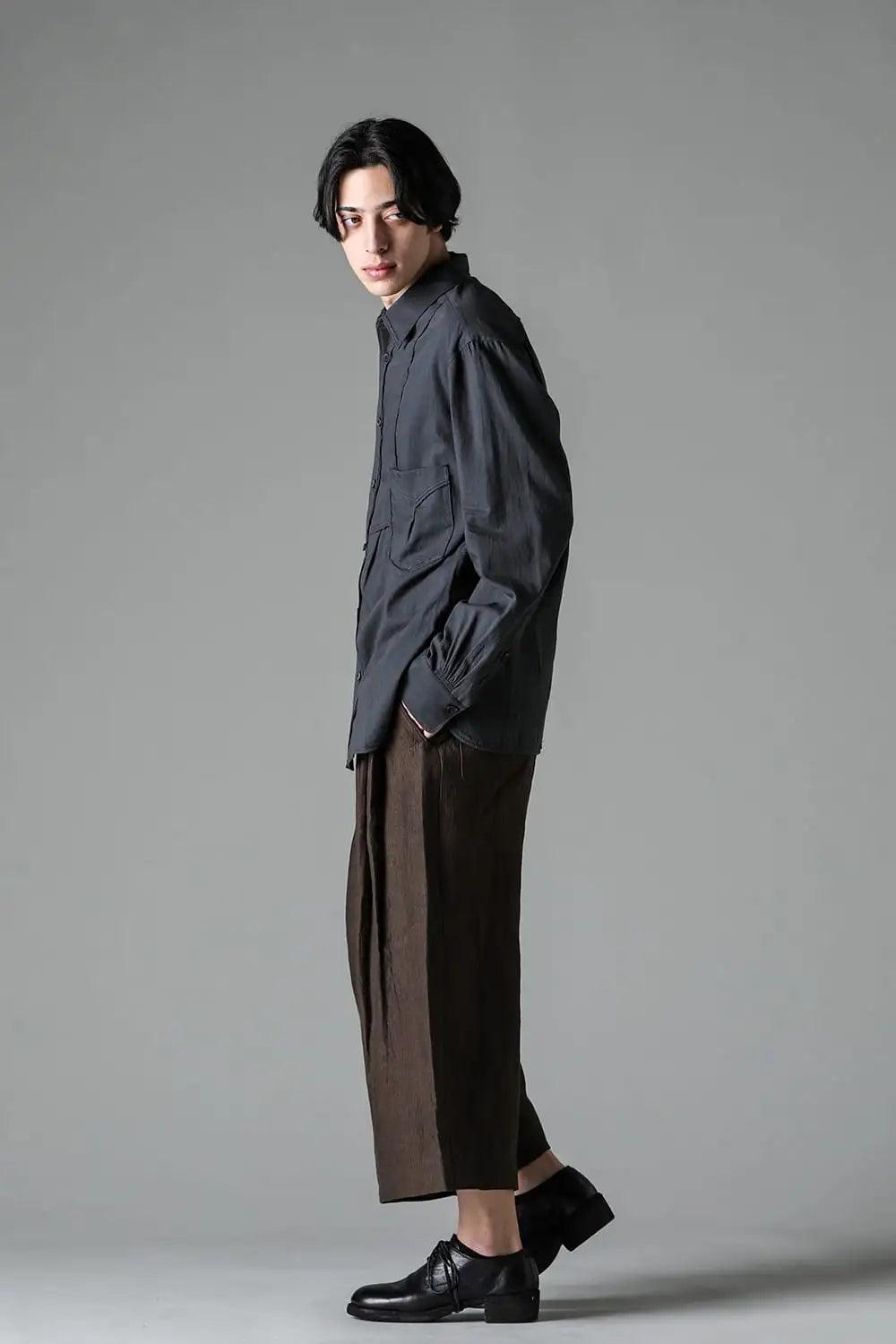 3タックのワイドシルエットのクロップドパンツ。 ベルトループ付きですが、ウエストの両サイドにゴムが着用者のサイズに合わせて伸縮するので、1つのサイズで幅広くカバーできます。 両サイドにポケット、バックポケットは水牛ボタン付きのパッチポケットがついています。 素材はリネンで透け感はないですが薄手で通気性も良く、腿から裾にかけてテーパードの少ないシルエットがしなやかなドレープ性のある生地感とよくマッチしています。