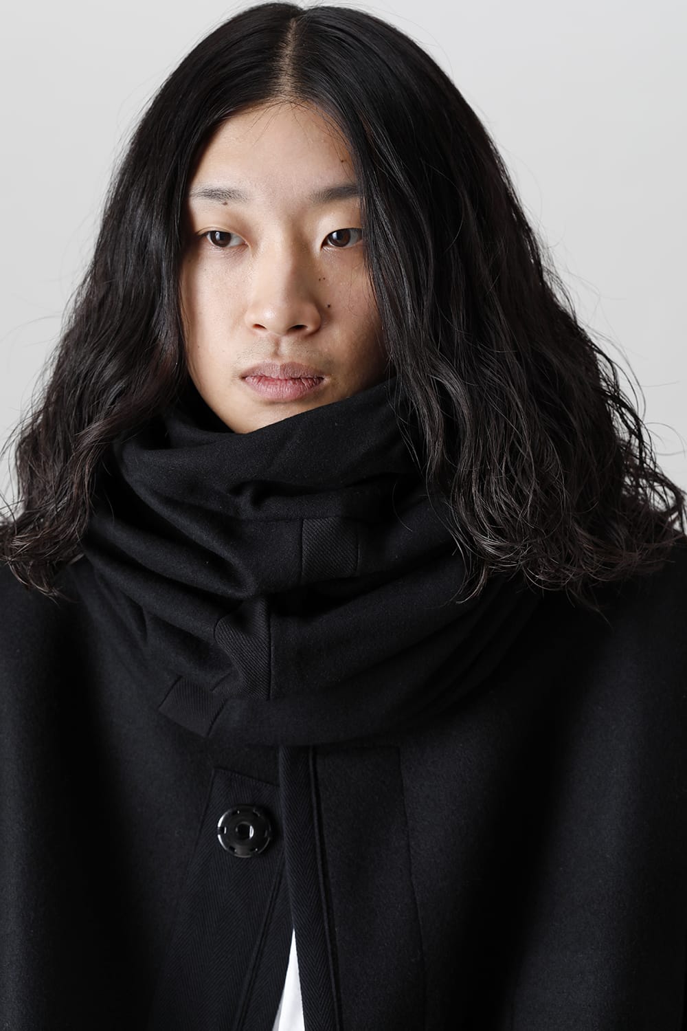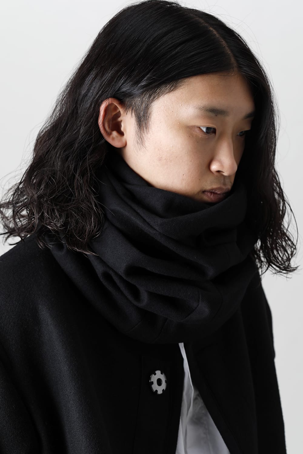 表はメルトンスムース、裏はフラノ素材のネックウォーマー。ラインに立体的な斜め畝が特徴のカルゼを配し、ねじり縫製でうまくドレープが出てくれる仕様です。リバーシブルでご着用いただけます。