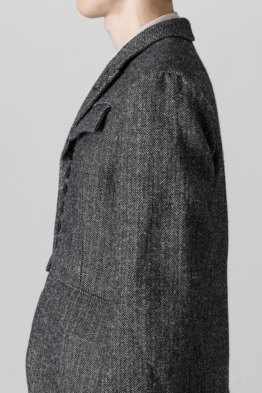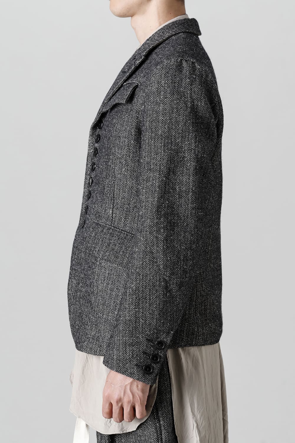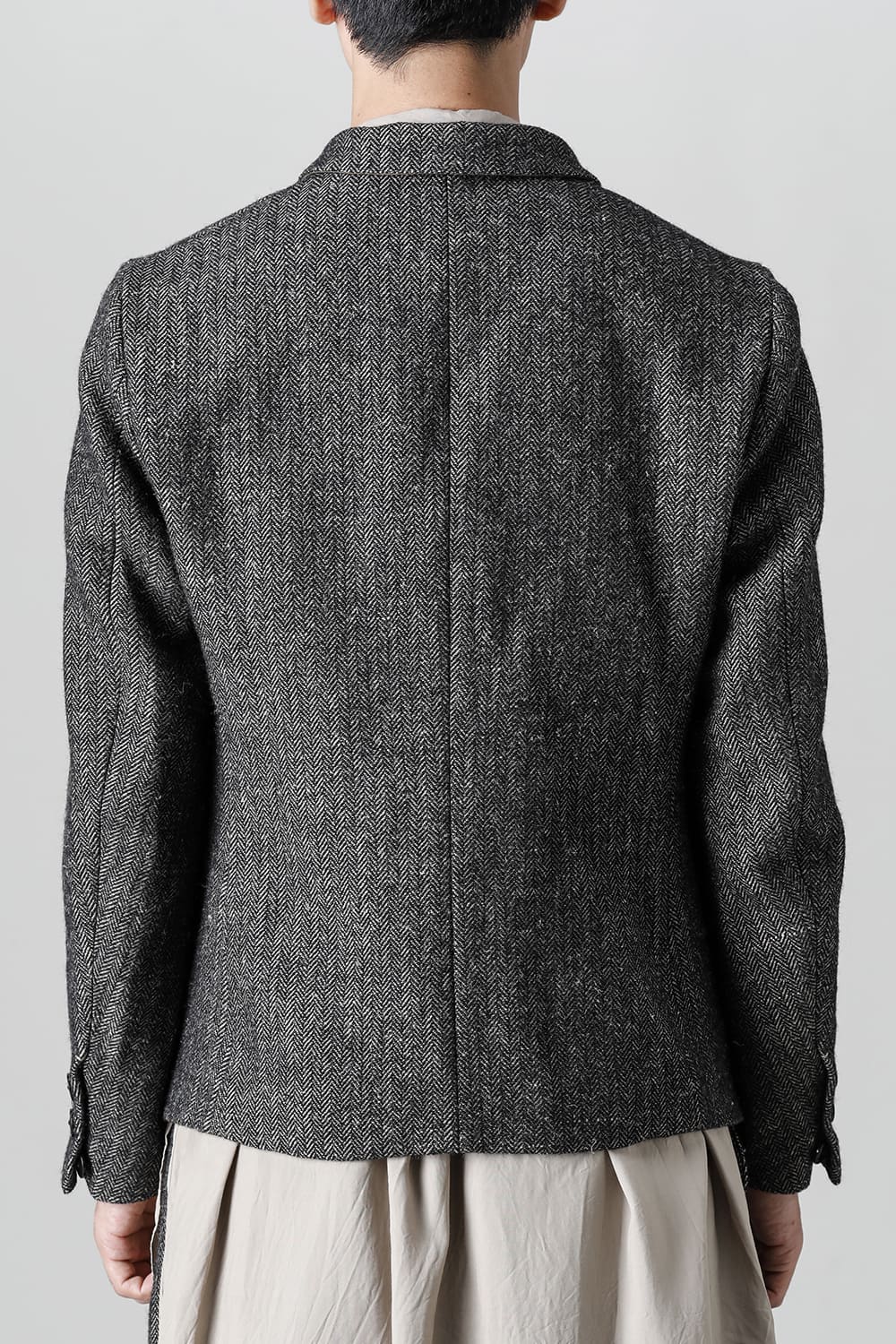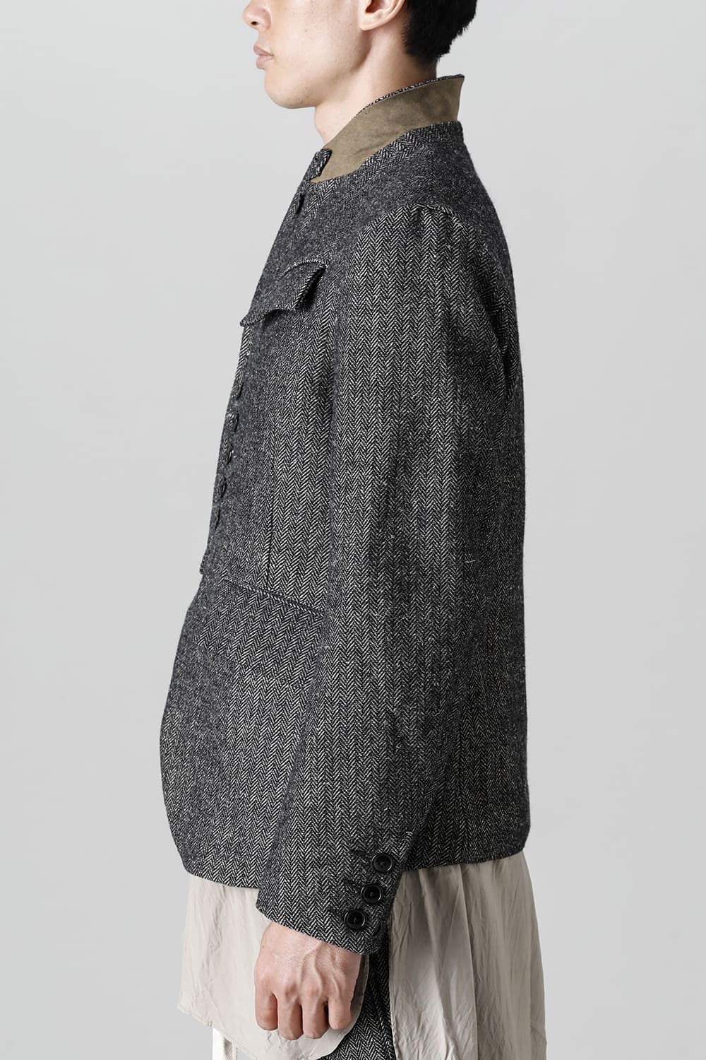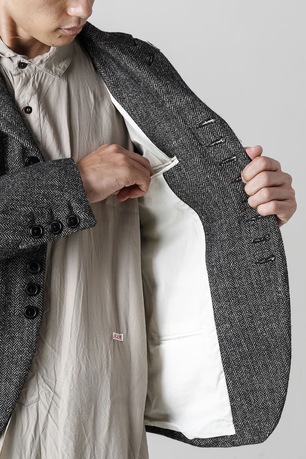 全体的のデザインはクラシカルなテーラードジャケットですが、立ち襟で着用した際に見える裏地のバランス、角度に変化を持たせたフラップポケットの配置など隅々にまで思考を巡らせ制作されたヘリンボーンブレザーです。フロントにはKLASICAらしいアイコニックな9個のボタンと利便性も十分な4つのポケットを配置しています。内側には胸ポケット x 2と腰にシガレットポケットが付属。素材はウールリネン生地のヘリンボーン。タンブラー仕上げを施すことでふっくらとした風合いが生まれます。ウールの重量感とリネンのドレープ感が美しくブレンドされています。