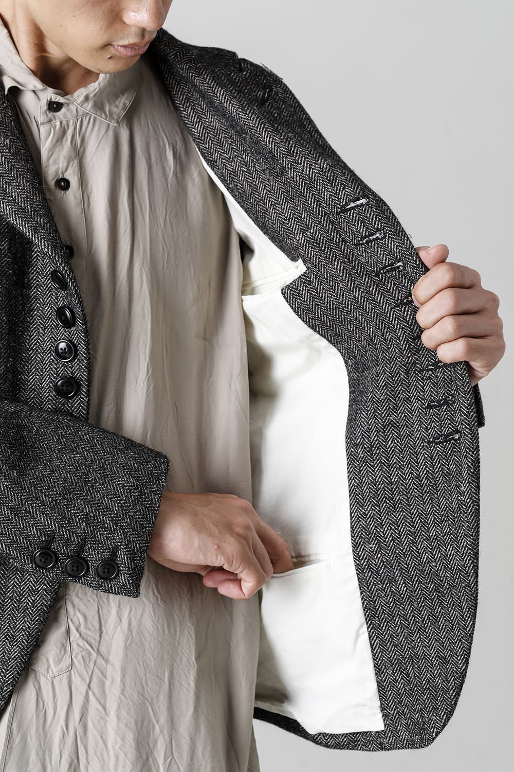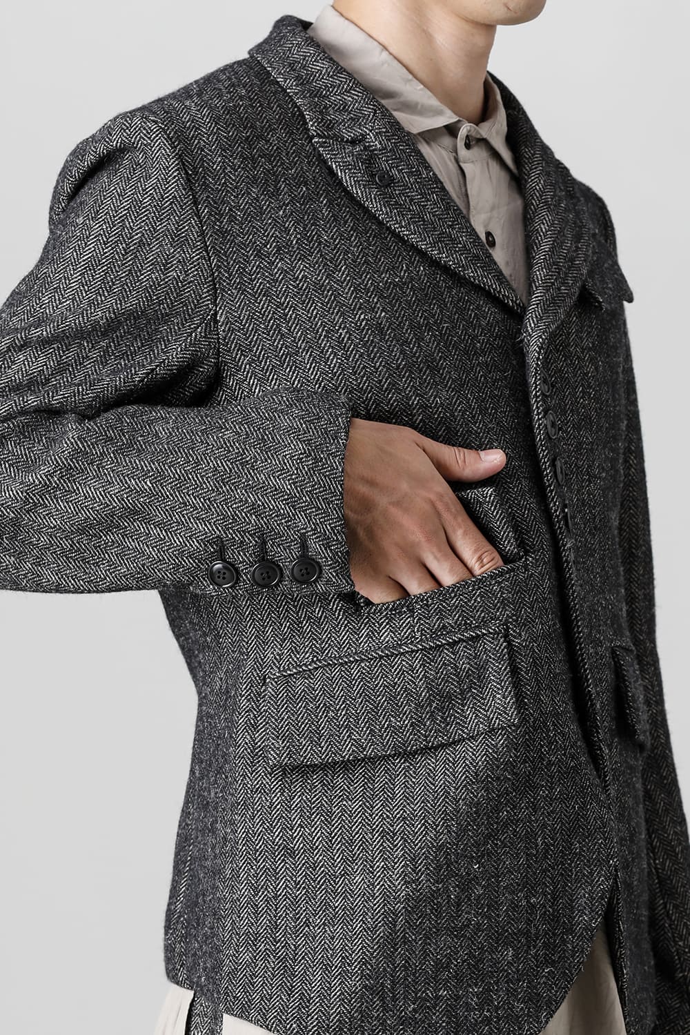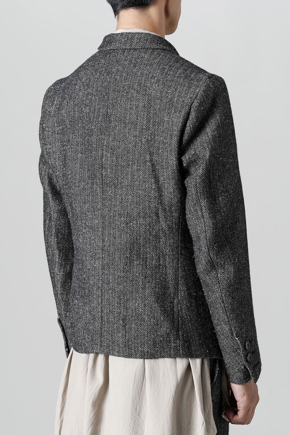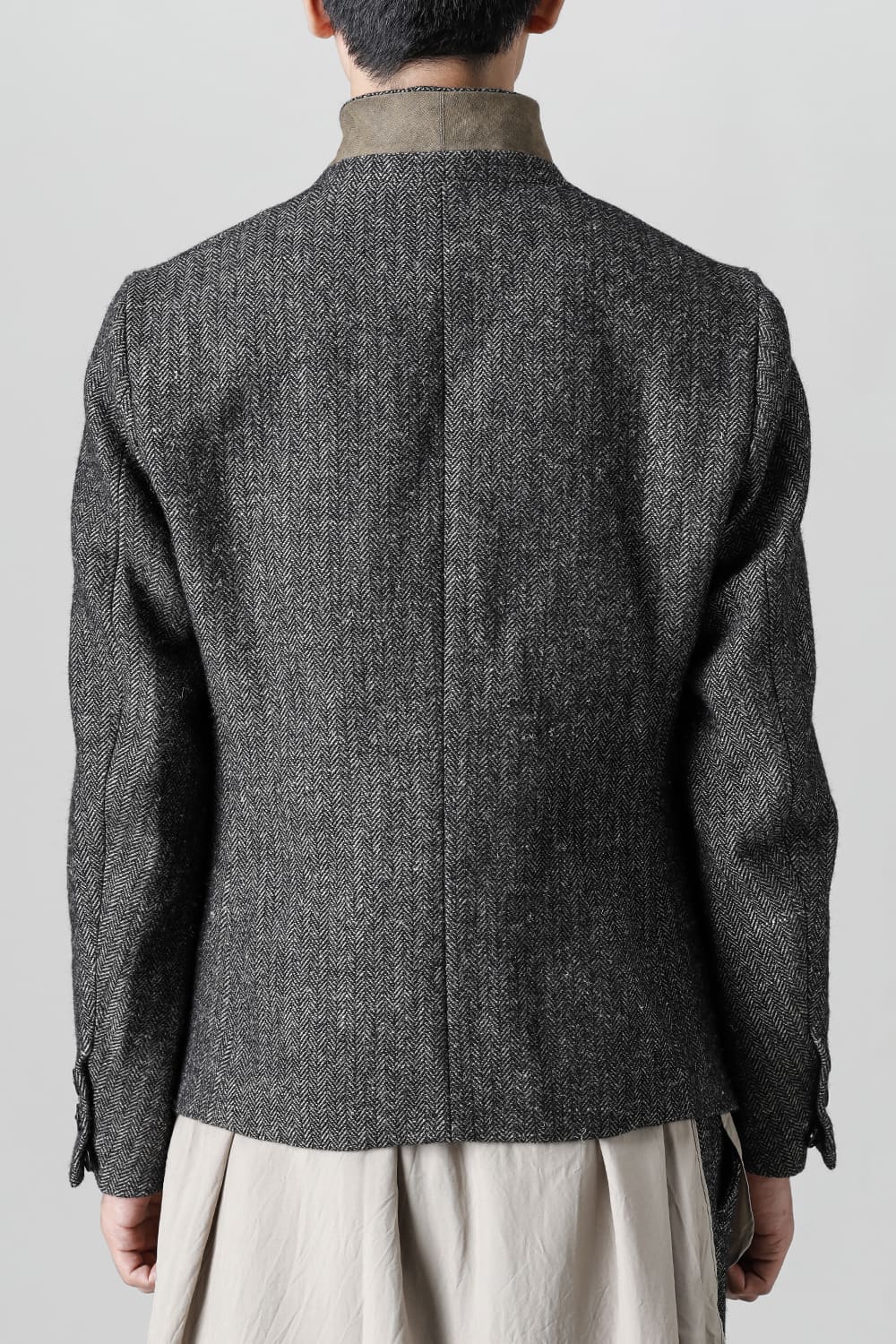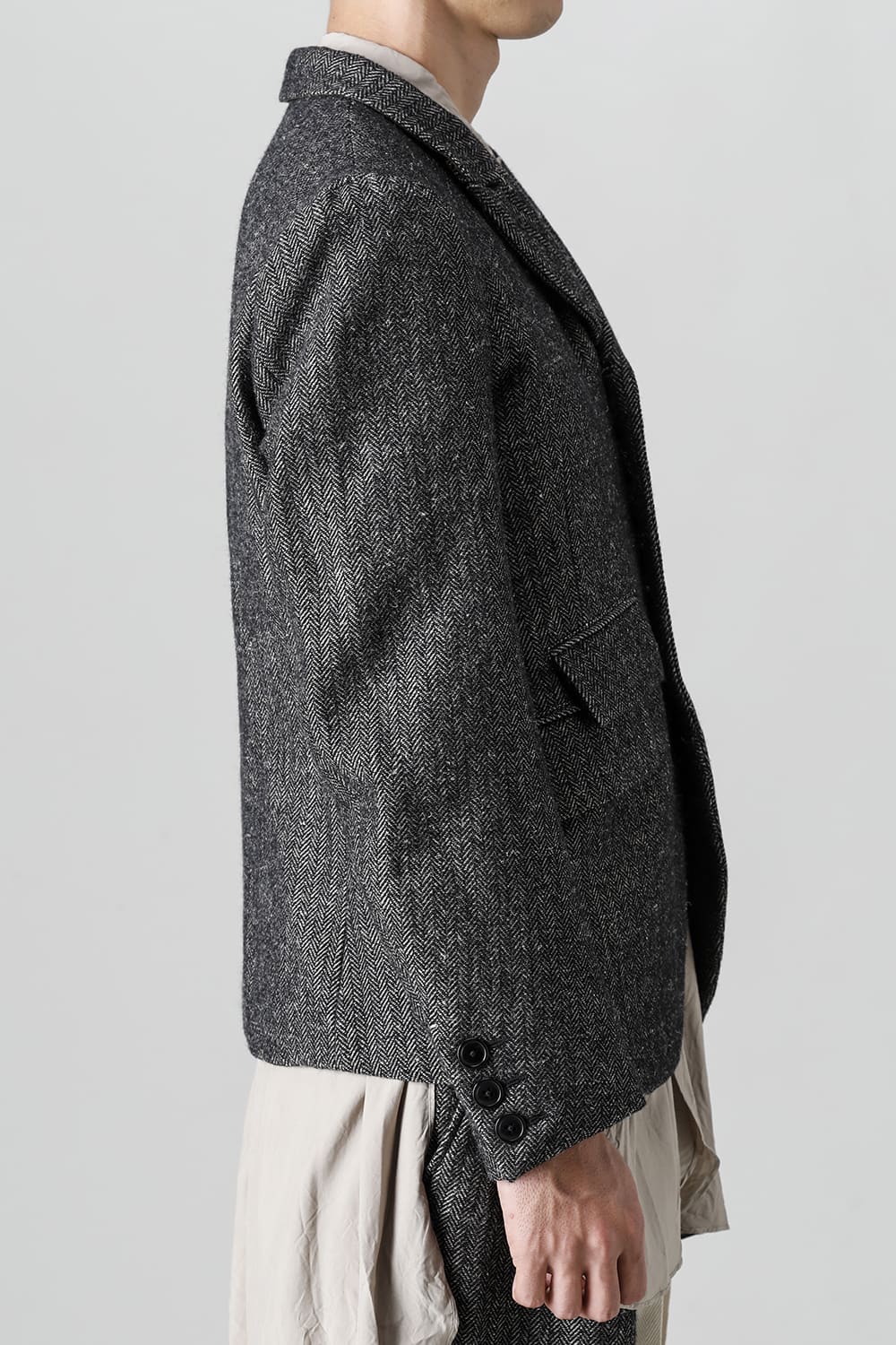全体的のデザインはクラシカルなテーラードジャケットですが、立ち襟で着用した際に見える裏地のバランス、角度に変化を持たせたフラップポケットの配置など隅々にまで思考を巡らせ制作されたヘリンボーンブレザーです。フロントにはKLASICAらしいアイコニックな9個のボタンと利便性も十分な4つのポケットを配置しています。内側には胸ポケット x 2と腰にシガレットポケットが付属。素材はウールリネン生地のヘリンボーン。タンブラー仕上げを施すことでふっくらとした風合いが生まれます。ウールの重量感とリネンのドレープ感が美しくブレンドされています。