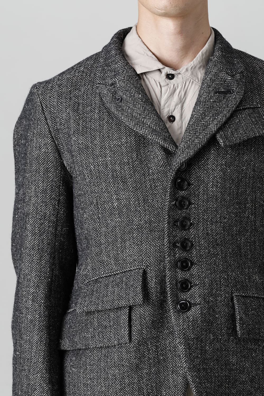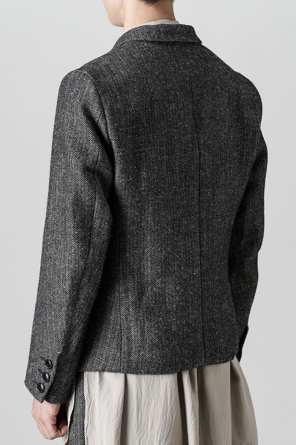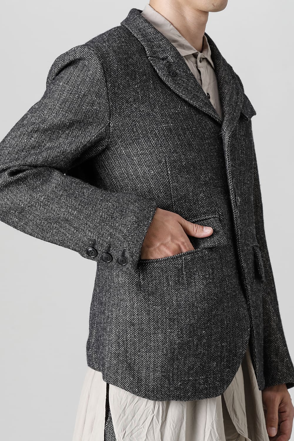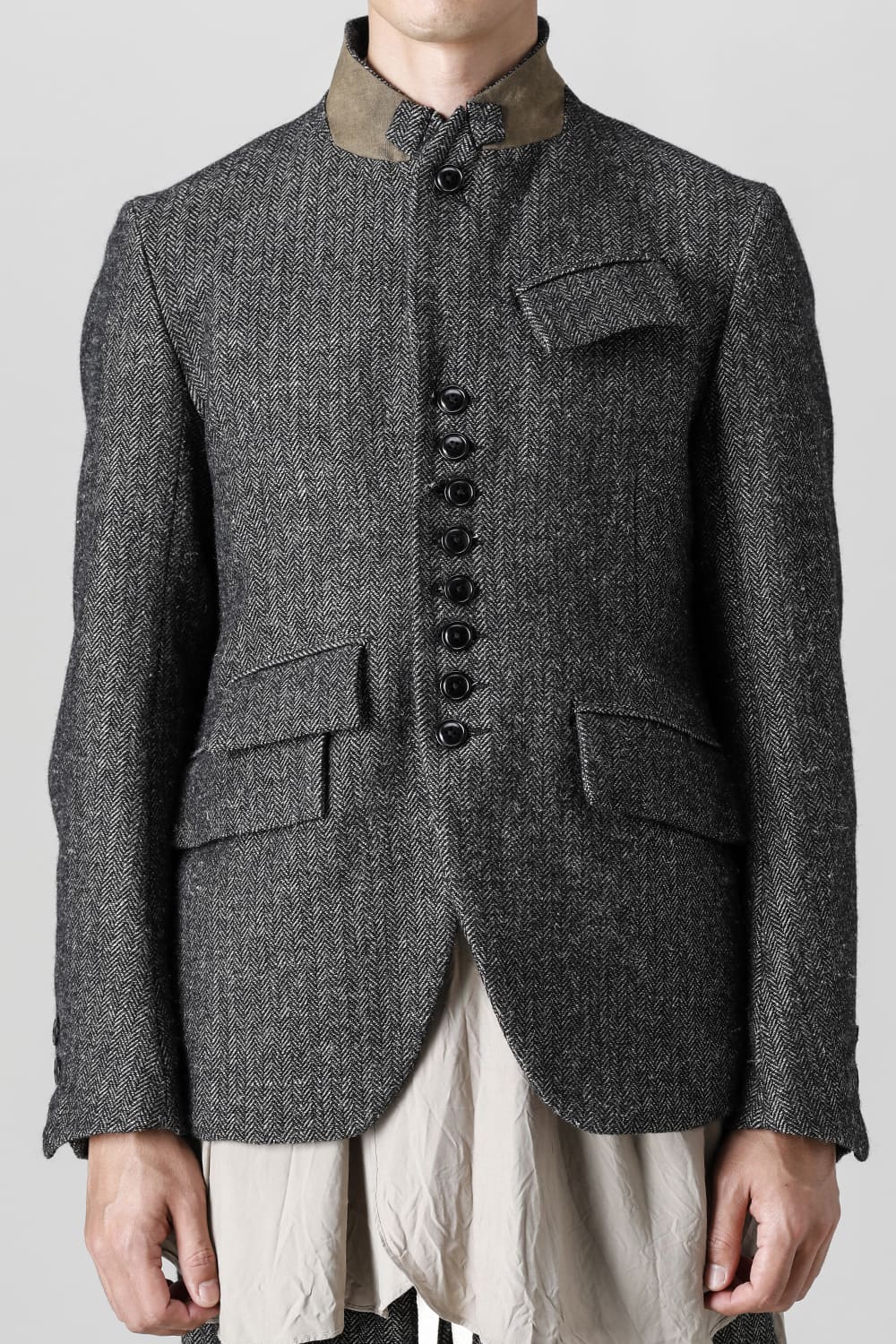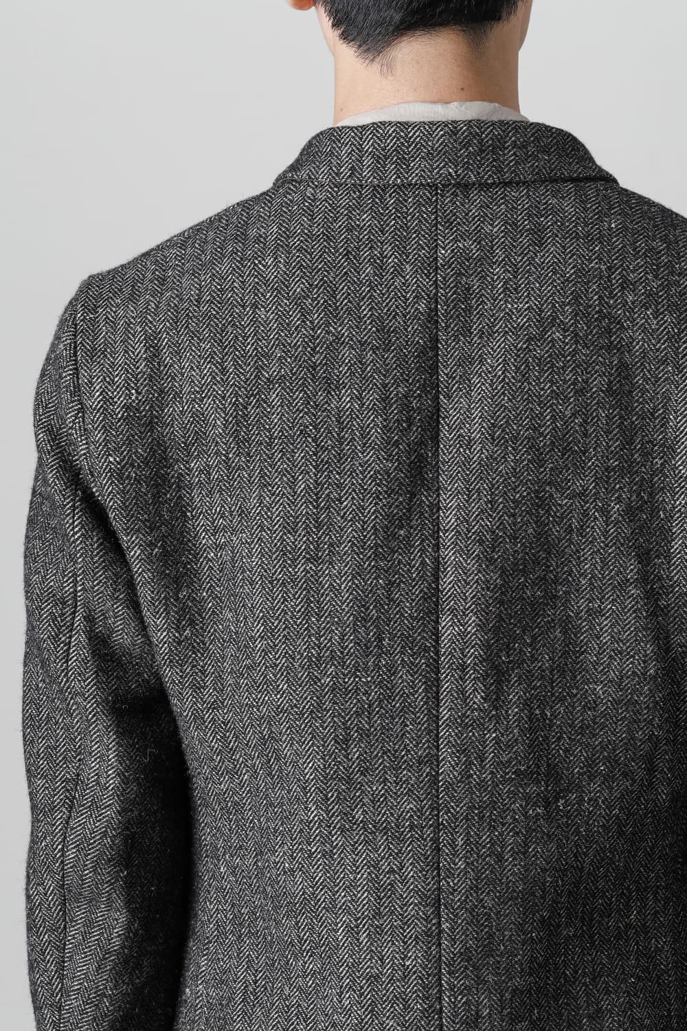 全体的のデザインはクラシカルなテーラードジャケットですが、立ち襟で着用した際に見える裏地のバランス、角度に変化を持たせたフラップポケットの配置など隅々にまで思考を巡らせ制作されたヘリンボーンブレザーです。フロントにはKLASICAらしいアイコニックな9個のボタンと利便性も十分な4つのポケットを配置しています。内側には胸ポケット x 2と腰にシガレットポケットが付属。素材はウールリネン生地のヘリンボーン。タンブラー仕上げを施すことでふっくらとした風合いが生まれます。ウールの重量感とリネンのドレープ感が美しくブレンドされています。