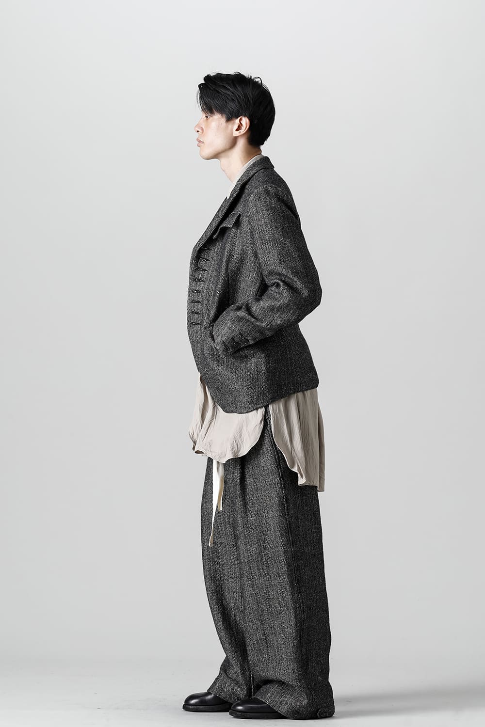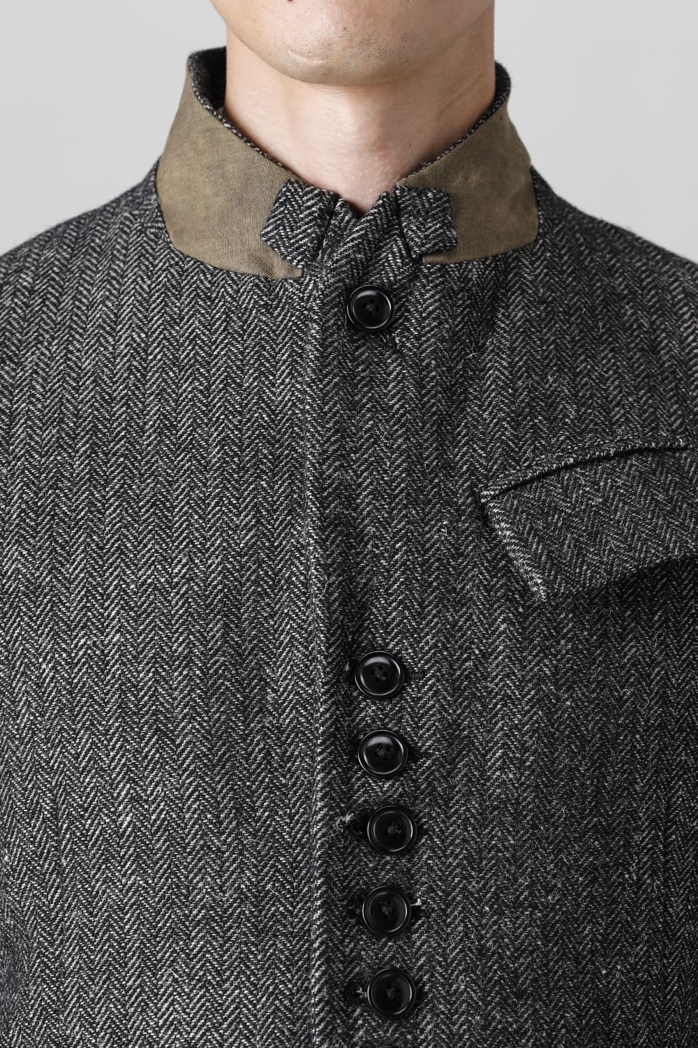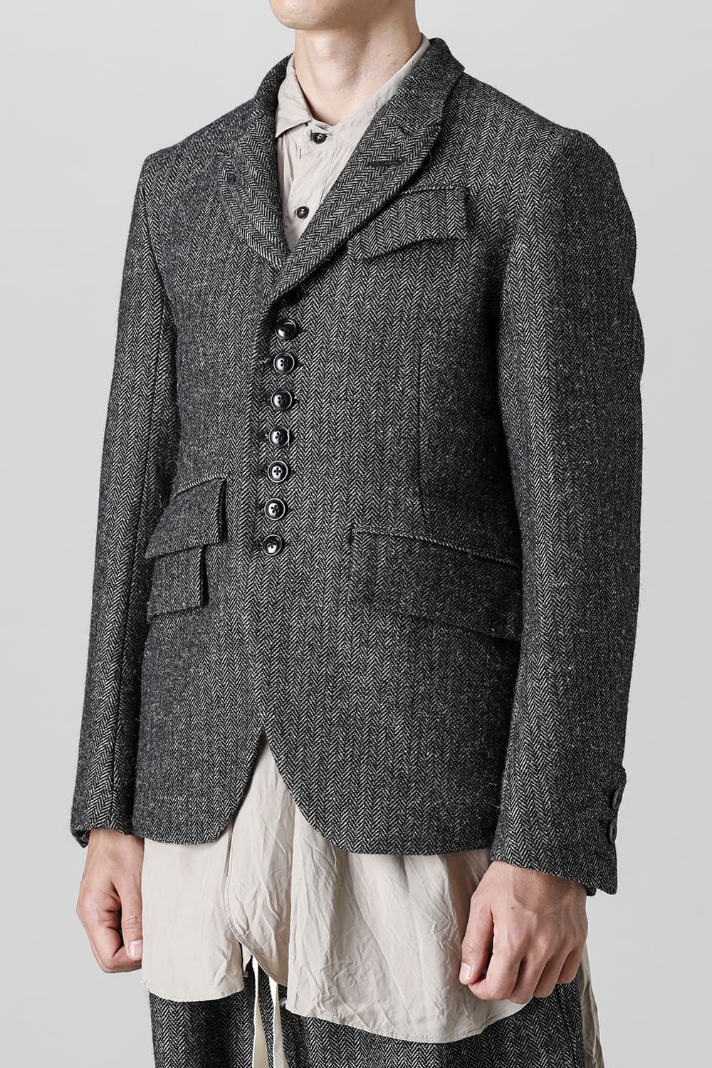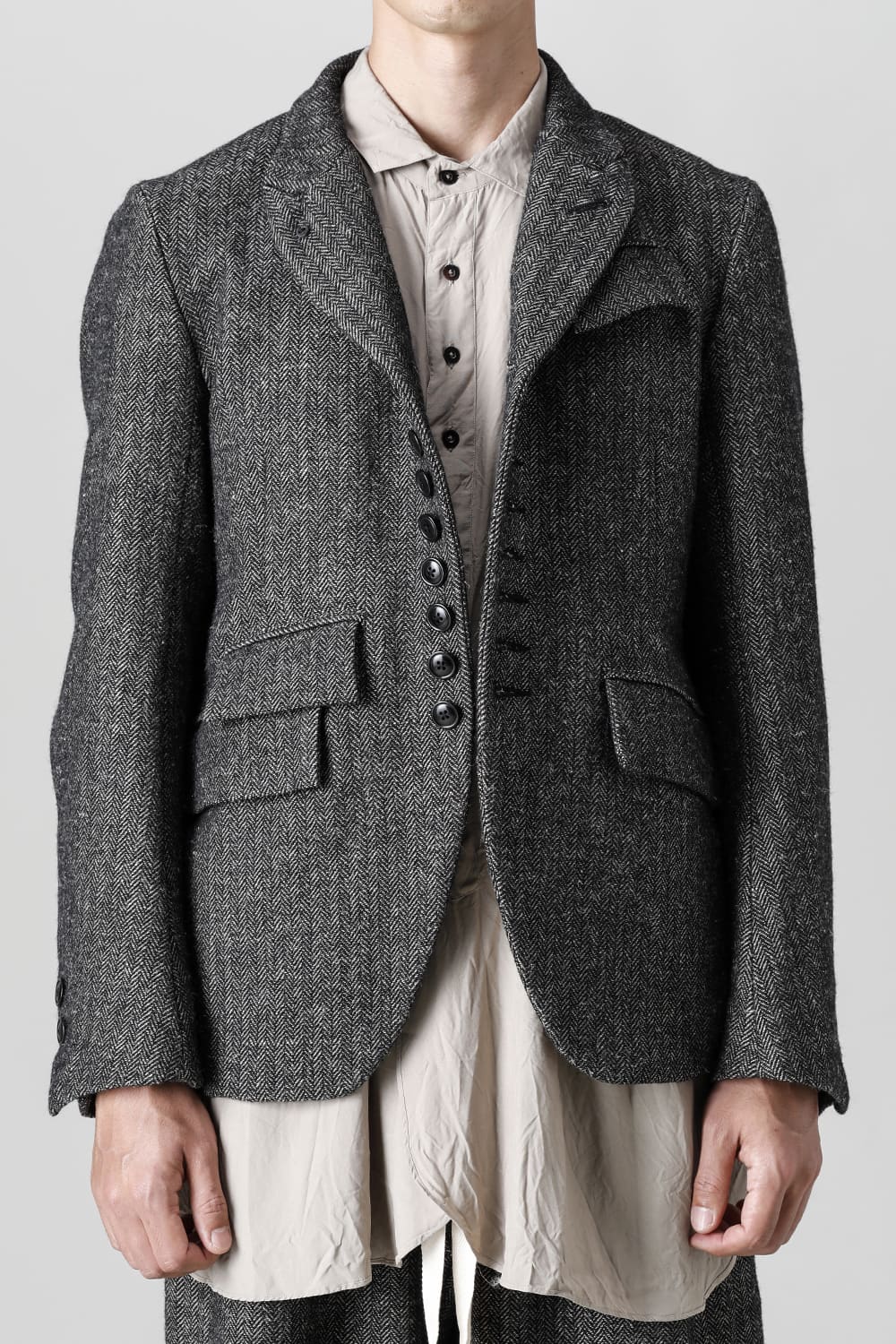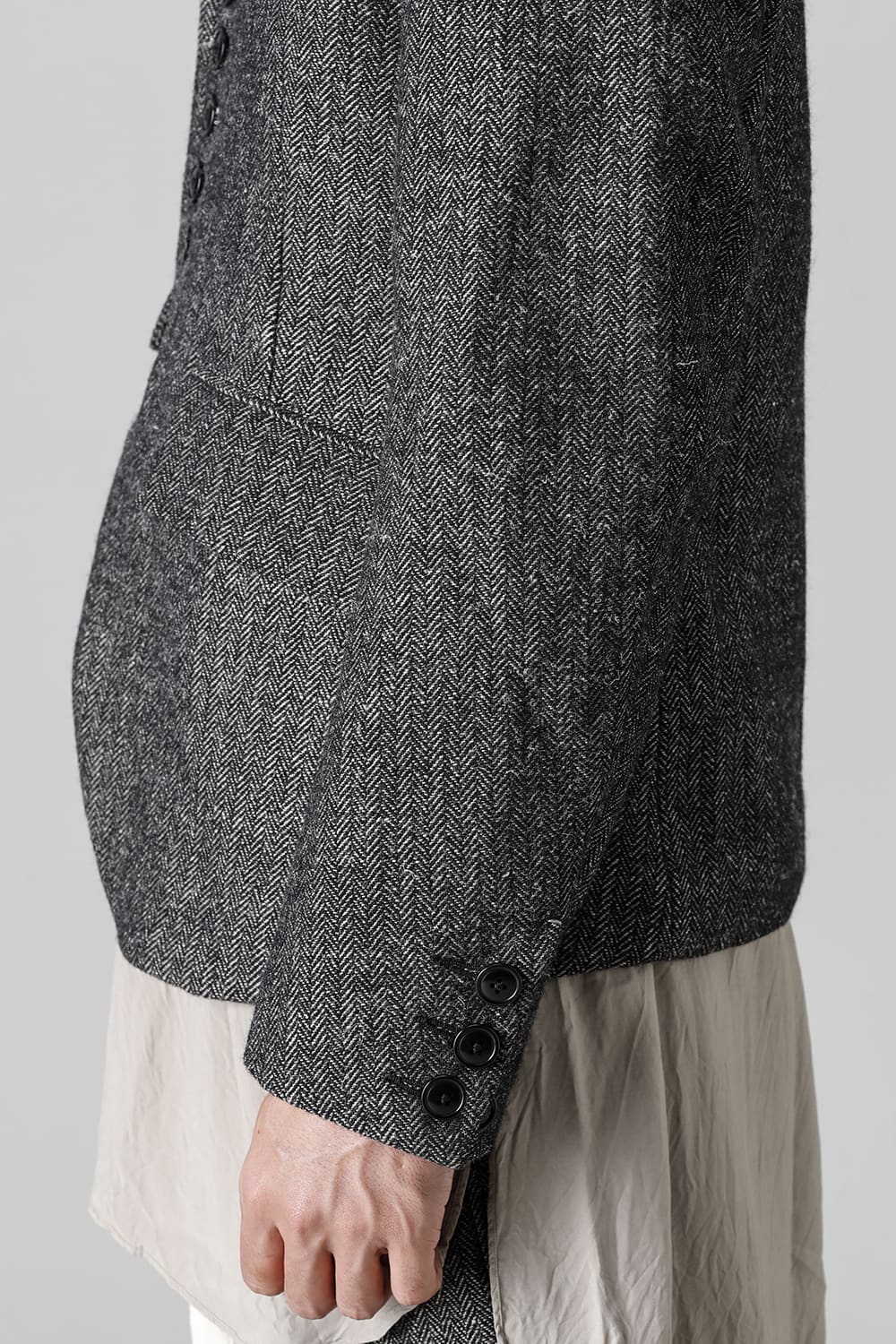 全体的のデザインはクラシカルなテーラードジャケットですが、立ち襟で着用した際に見える裏地のバランス、角度に変化を持たせたフラップポケットの配置など隅々にまで思考を巡らせ制作されたヘリンボーンブレザーです。フロントにはKLASICAらしいアイコニックな9個のボタンと利便性も十分な4つのポケットを配置しています。内側には胸ポケット x 2と腰にシガレットポケットが付属。素材はウールリネン生地のヘリンボーン。タンブラー仕上げを施すことでふっくらとした風合いが生まれます。ウールの重量感とリネンのドレープ感が美しくブレンドされています。