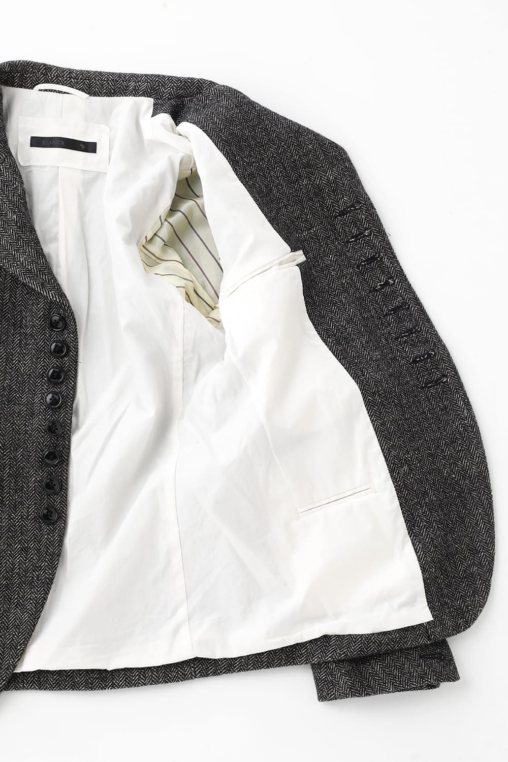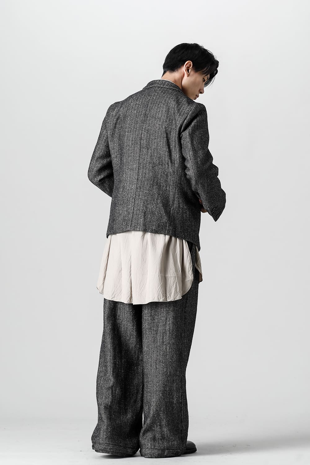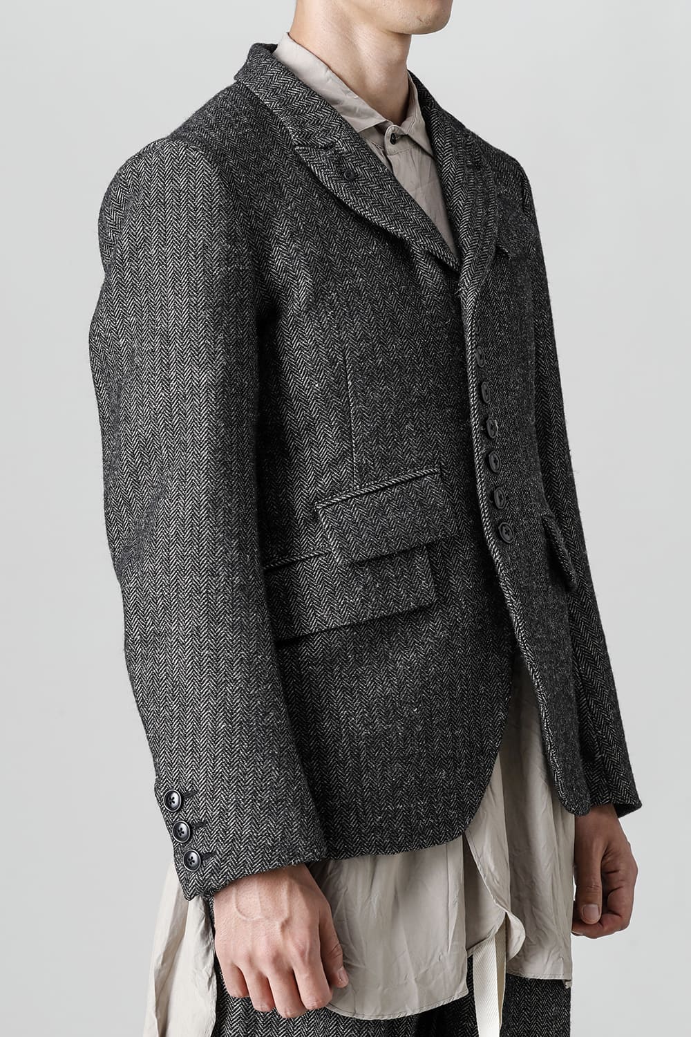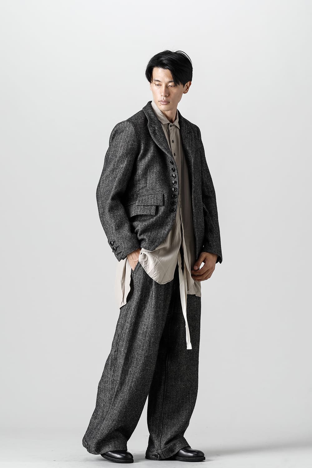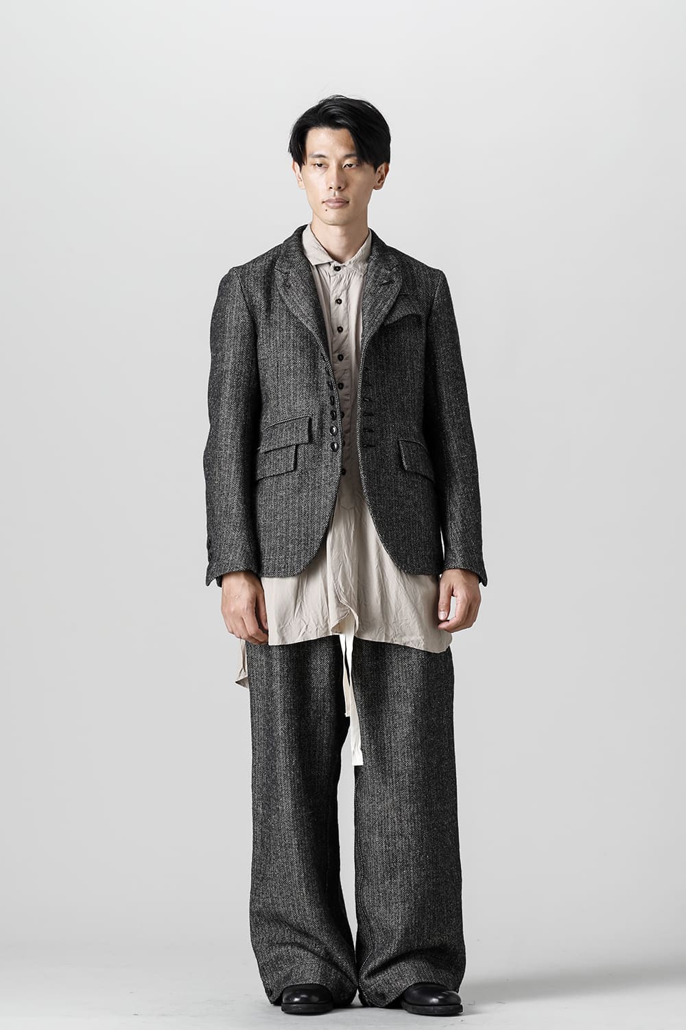全体的のデザインはクラシカルなテーラードジャケットですが、立ち襟で着用した際に見える裏地のバランス、角度に変化を持たせたフラップポケットの配置など隅々にまで思考を巡らせ制作されたヘリンボーンブレザーです。フロントにはKLASICAらしいアイコニックな9個のボタンと利便性も十分な4つのポケットを配置しています。内側には胸ポケット x 2と腰にシガレットポケットが付属。素材はウールリネン生地のヘリンボーン。タンブラー仕上げを施すことでふっくらとした風合いが生まれます。ウールの重量感とリネンのドレープ感が美しくブレンドされています。