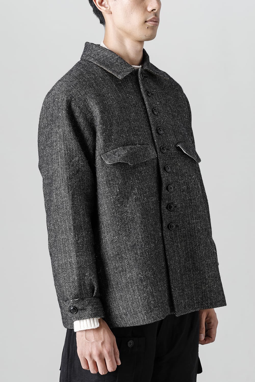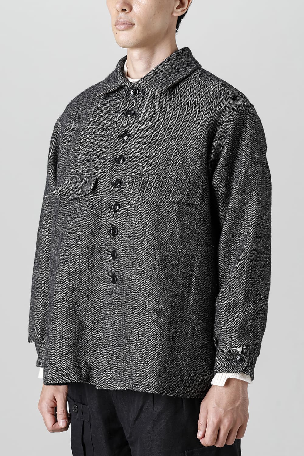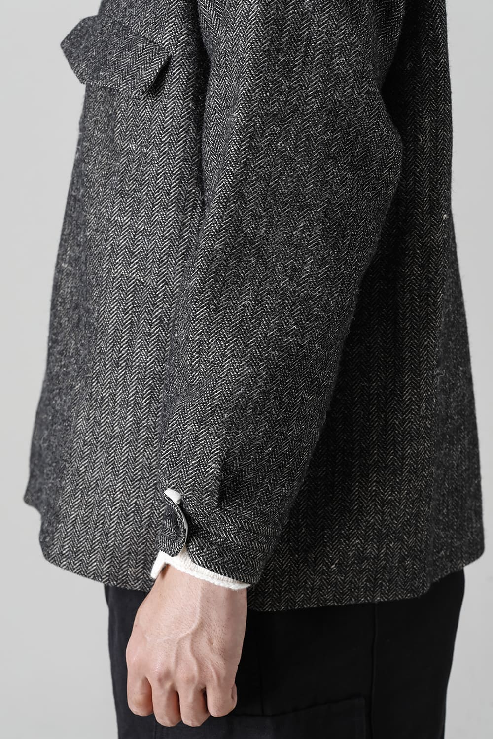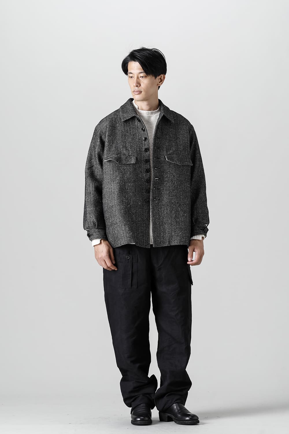デザイナー河村氏が10代の頃に着用していたアウターをベースに制作されたシンプルなシャツジャケット。フロントパネルは9つのボタンに2つのフラップ付きのポケットのみのデザイン。どこかノスタルジックな雰囲気を漂わせるヴィンテージテイストなデザインに仕上がっています。サイドにシームポケット、袖口はストームカフスを採用しています。素材はウールリネン生地のヘリンボーン。タンブラー仕上げを施すことでふっくらとした風合いが生まれます。ウールの重量感とリネンのドレープ感が美しくブレンドされています。