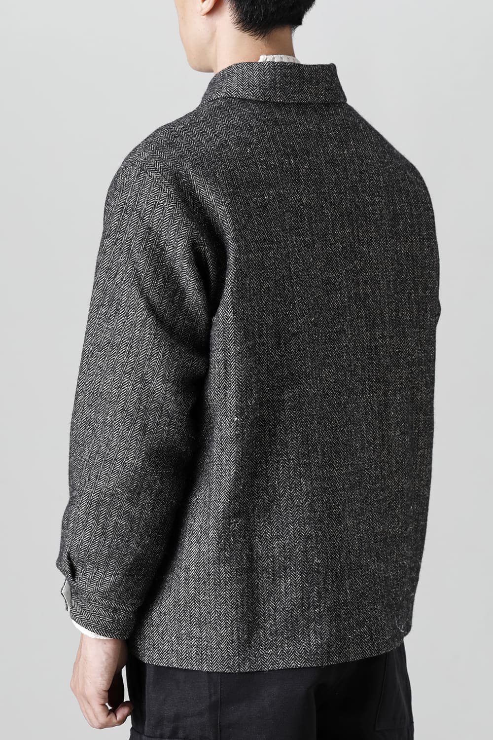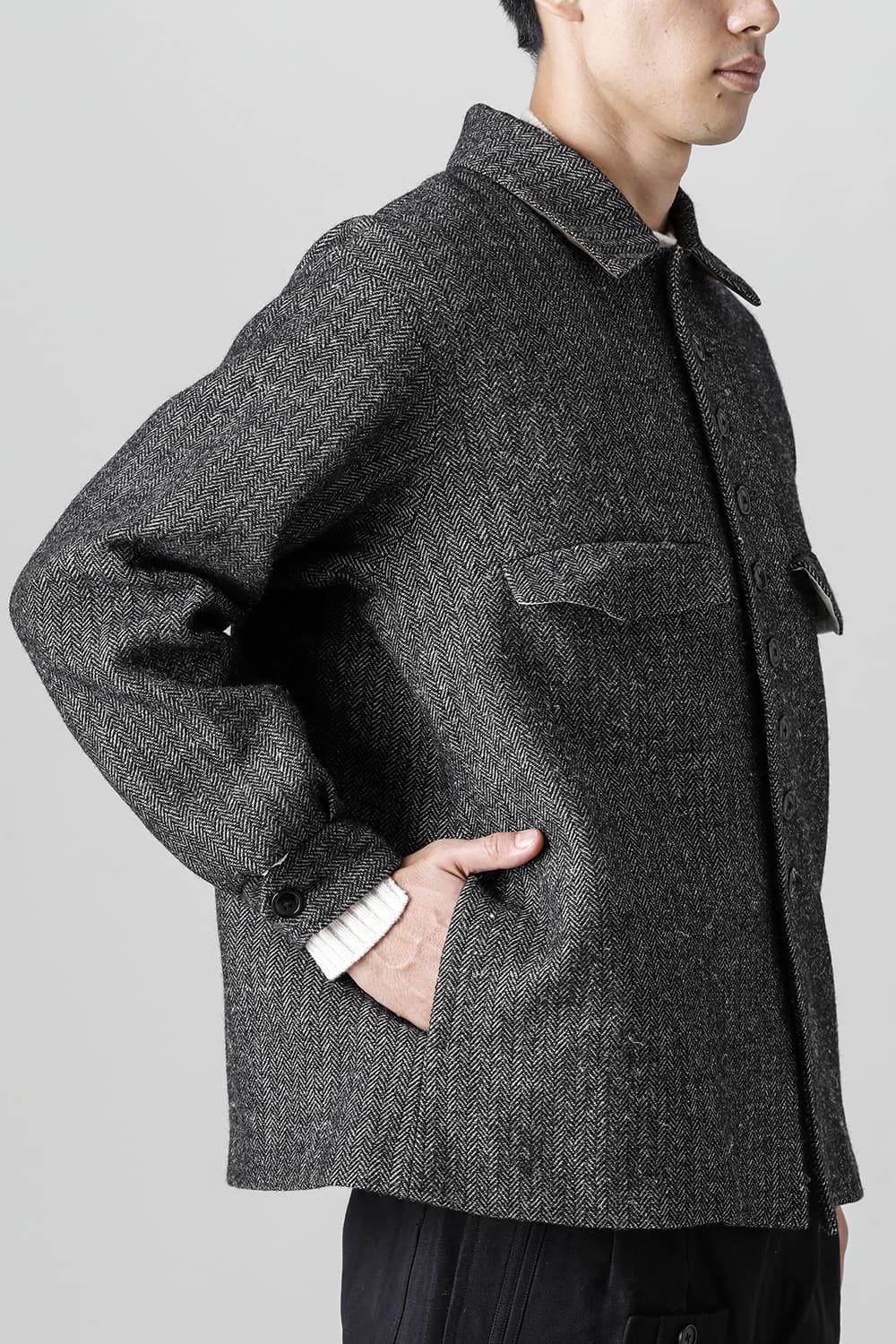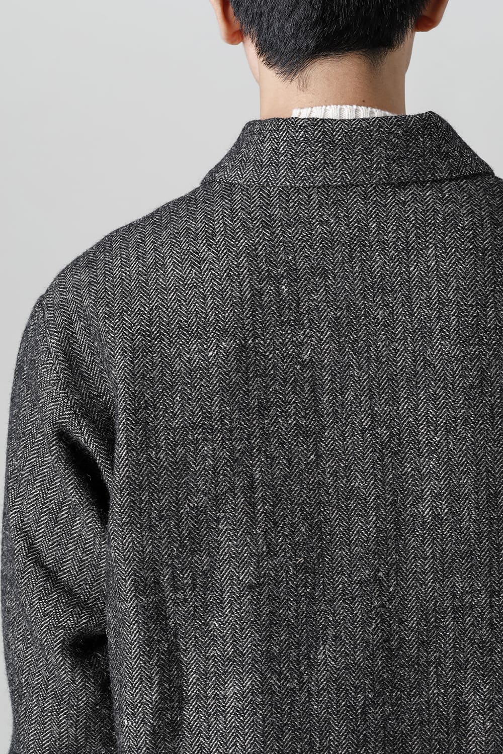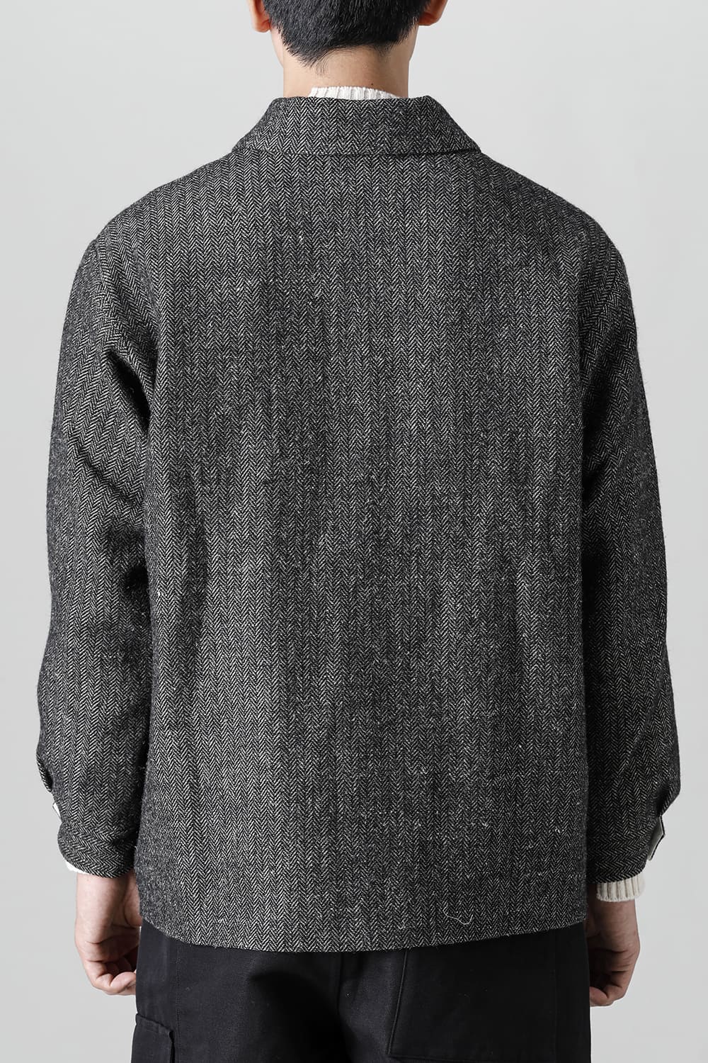 デザイナー河村氏が10代の頃に着用していたアウターをベースに制作されたシンプルなシャツジャケット。フロントパネルは9つのボタンに2つのフラップ付きのポケットのみのデザイン。どこかノスタルジックな雰囲気を漂わせるヴィンテージテイストなデザインに仕上がっています。サイドにシームポケット、袖口はストームカフスを採用しています。素材はウールリネン生地のヘリンボーン。タンブラー仕上げを施すことでふっくらとした風合いが生まれます。ウールの重量感とリネンのドレープ感が美しくブレンドされています。