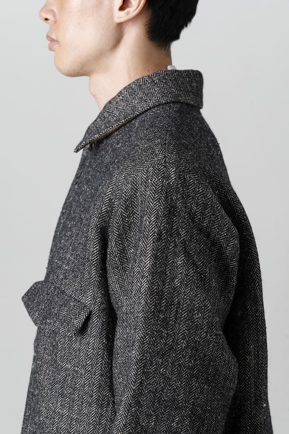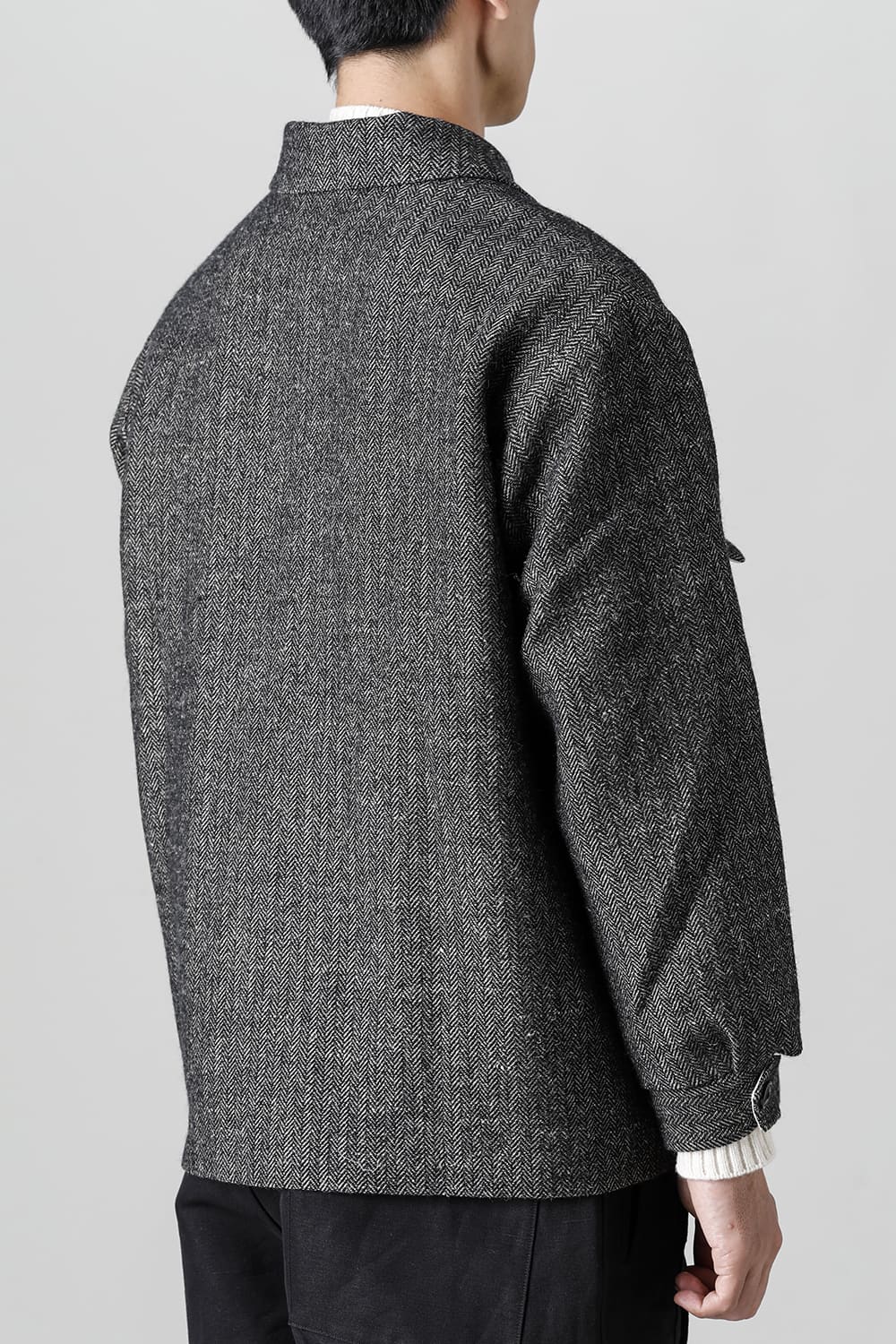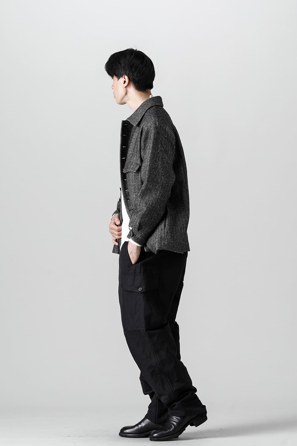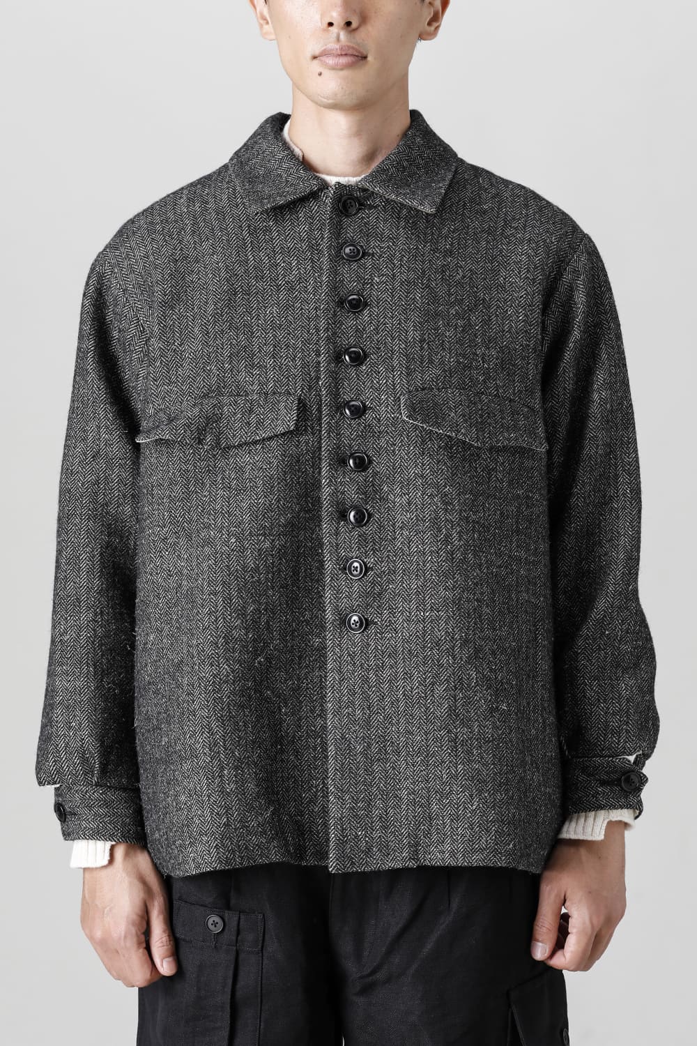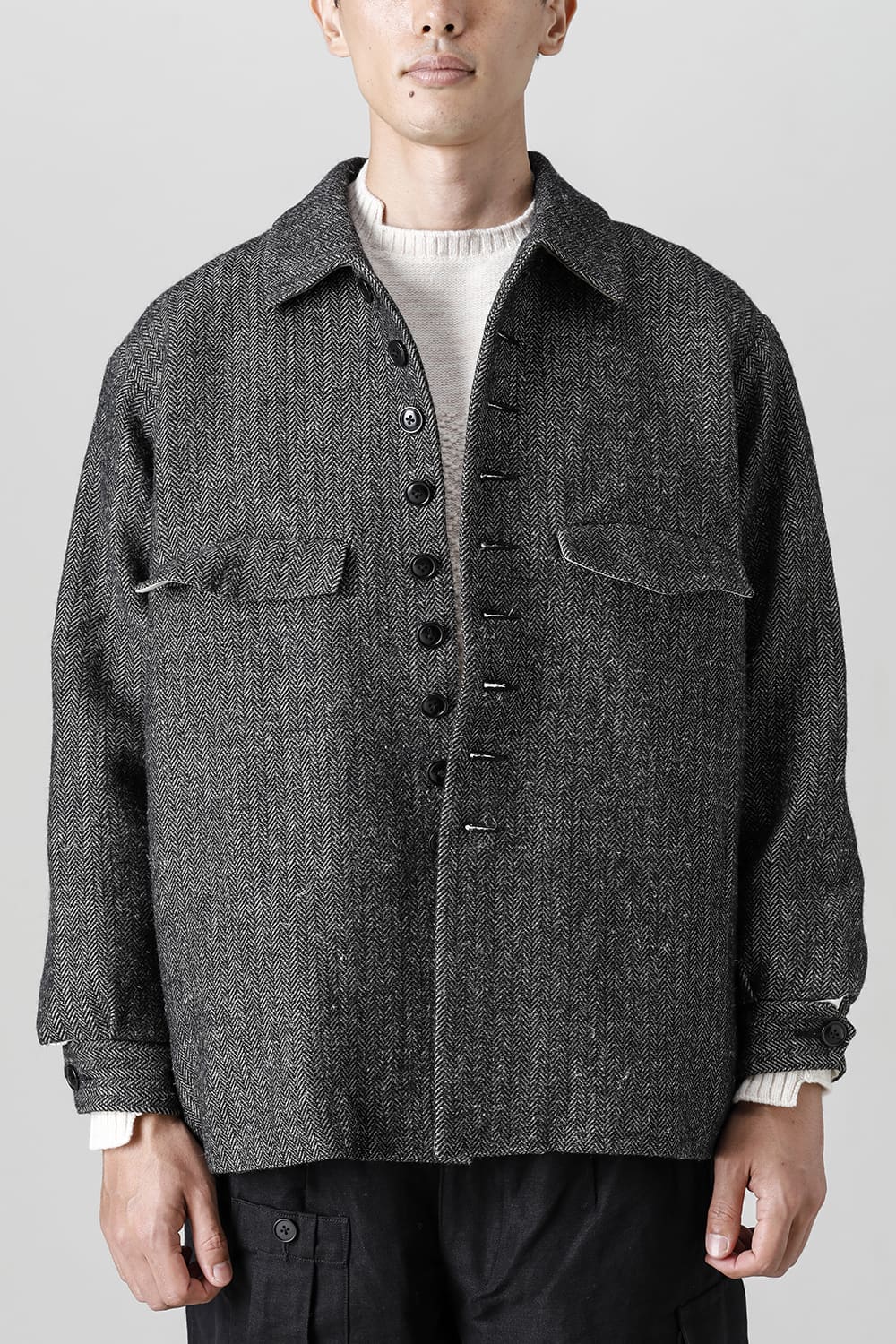 デザイナー河村氏が10代の頃に着用していたアウターをベースに制作されたシンプルなシャツジャケット。フロントパネルは9つのボタンに2つのフラップ付きのポケットのみのデザイン。どこかノスタルジックな雰囲気を漂わせるヴィンテージテイストなデザインに仕上がっています。サイドにシームポケット、袖口はストームカフスを採用しています。素材はウールリネン生地のヘリンボーン。タンブラー仕上げを施すことでふっくらとした風合いが生まれます。ウールの重量感とリネンのドレープ感が美しくブレンドされています。