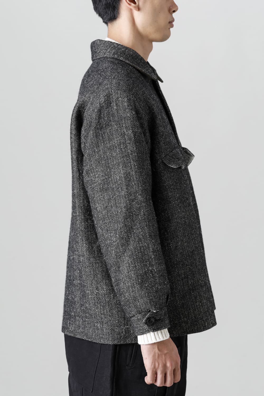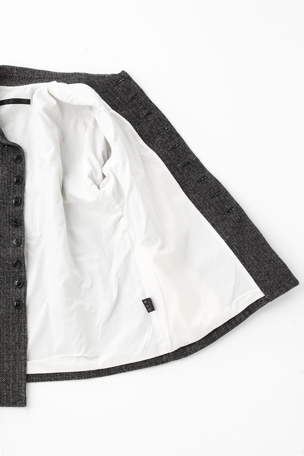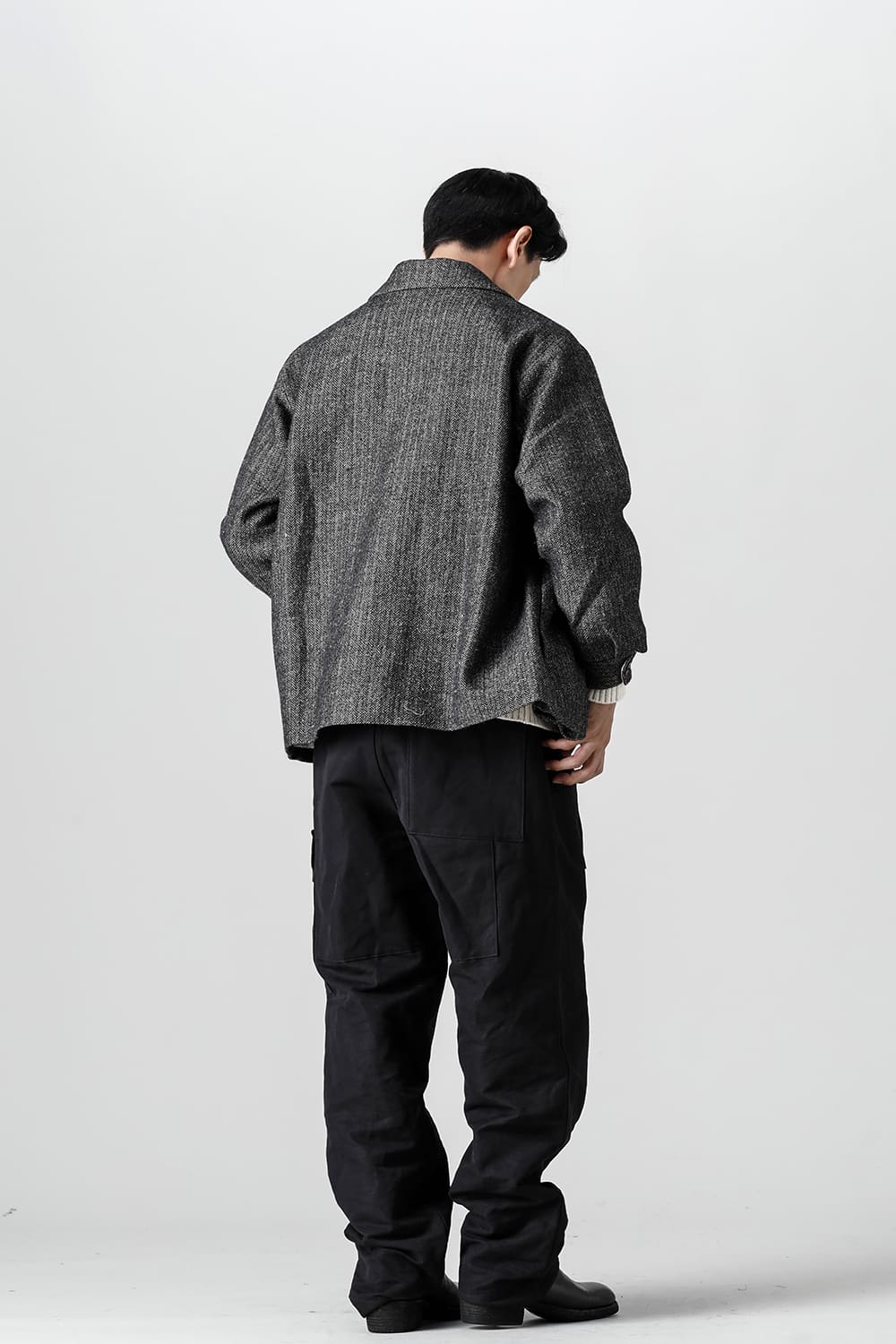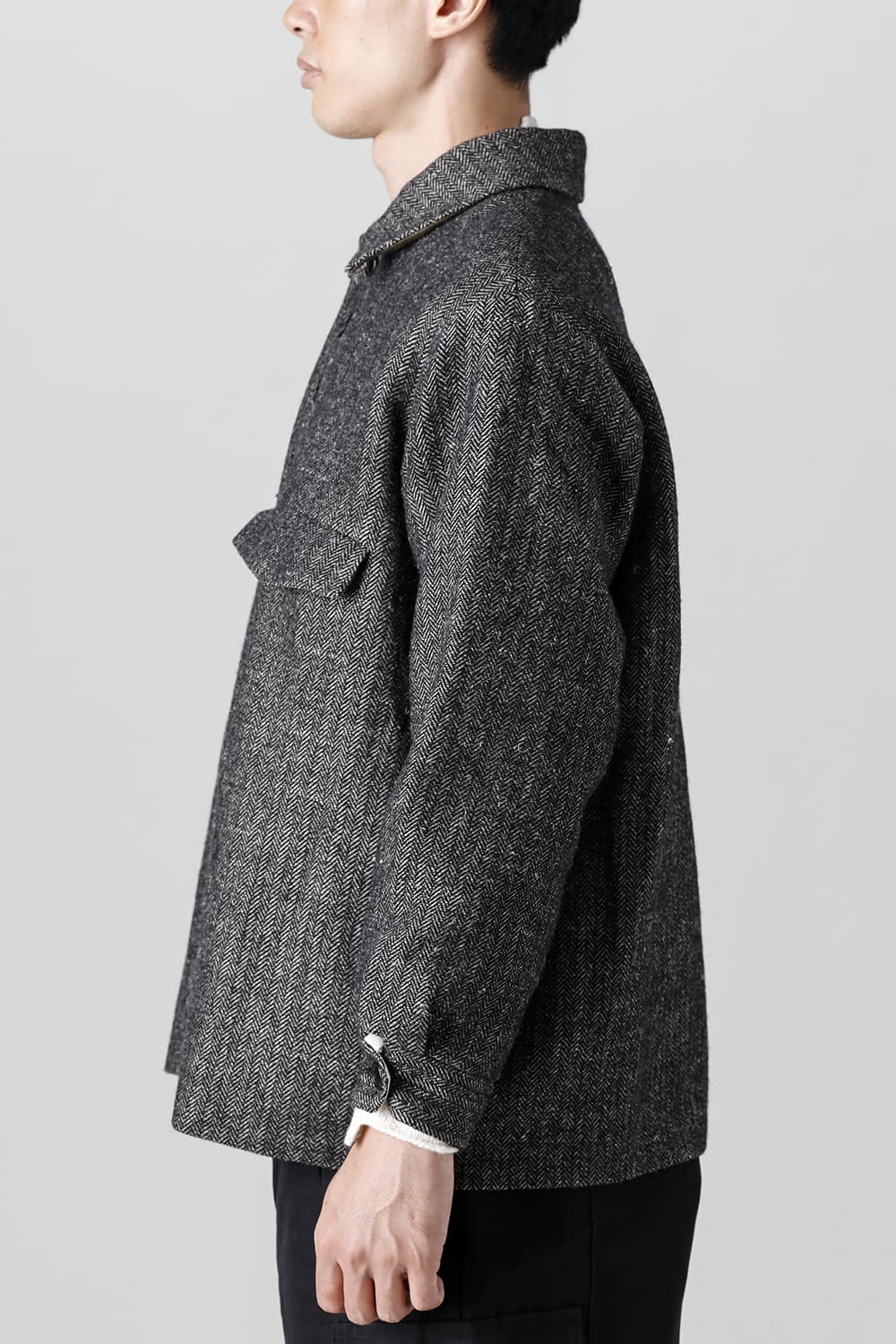 デザイナー河村氏が10代の頃に着用していたアウターをベースに制作されたシンプルなシャツジャケット。フロントパネルは9つのボタンに2つのフラップ付きのポケットのみのデザイン。どこかノスタルジックな雰囲気を漂わせるヴィンテージテイストなデザインに仕上がっています。サイドにシームポケット、袖口はストームカフスを採用しています。素材はウールリネン生地のヘリンボーン。タンブラー仕上げを施すことでふっくらとした風合いが生まれます。ウールの重量感とリネンのドレープ感が美しくブレンドされています。