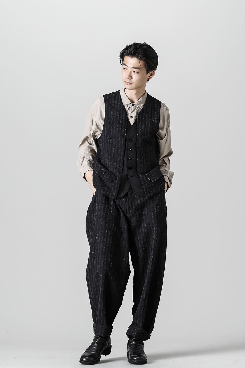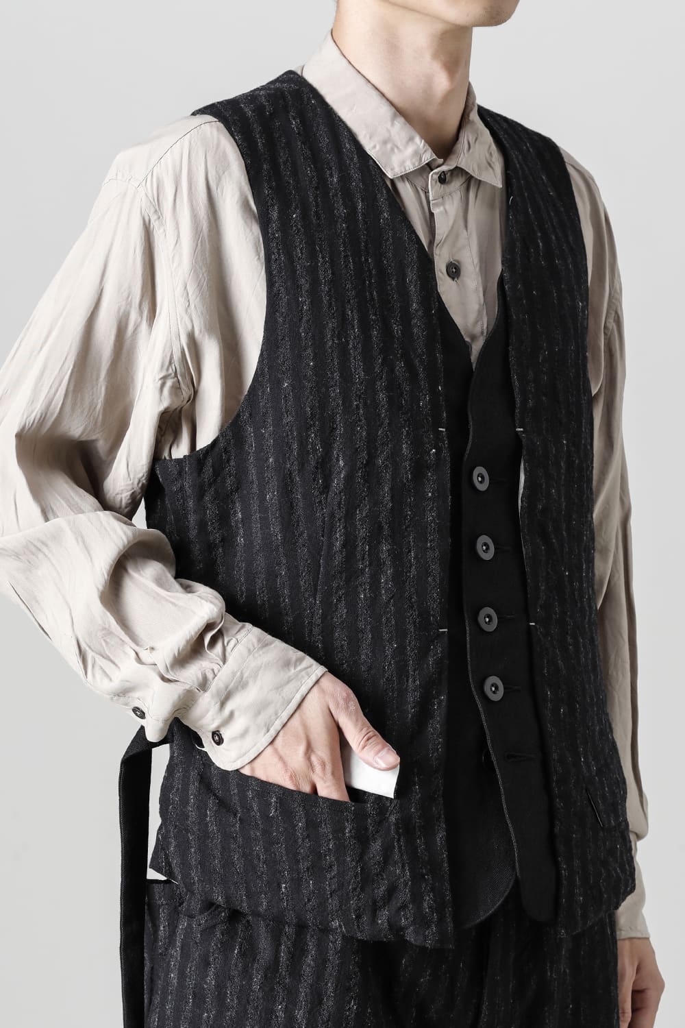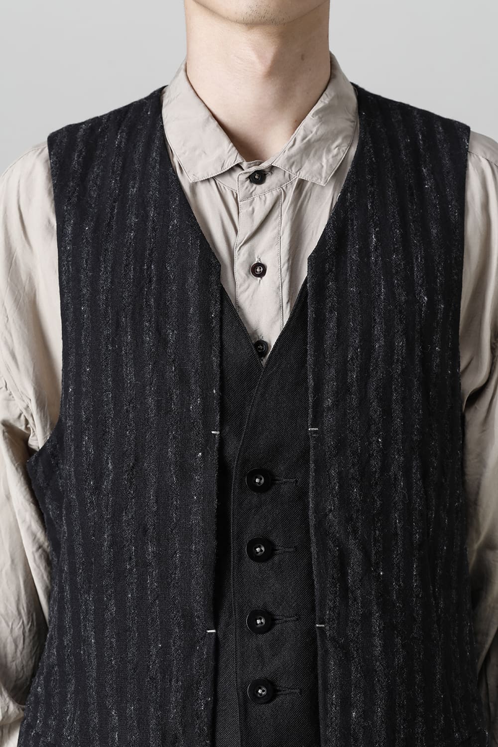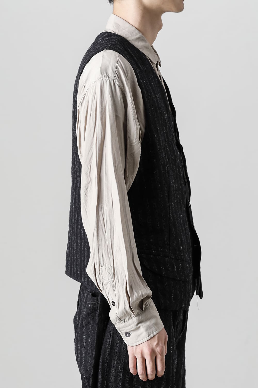 21SSから継続展開されているレギュラーフィットベスト「REVOLT」。レイヤード仕様のフロントデザインが胸ポケットを隠しアンティークなデザインにまとまっている。糸留めに隠されたバストポケットは着用者にしか分からない遊び心のある仕掛け。バックストラップが付属しておりますので、締め具合でシルエットの変化を愉しんで頂けます。素材はペルーコットンとアメリカンウールを絶妙なボケ感が生まれるように配置。密度が上手く調整されており、仕上げ洗いをかけることでラフでソフトなテキスタイルが生み出されています。見た目以上に軽やかな着用感ですので長いシーズンで活躍すること間違いありません。