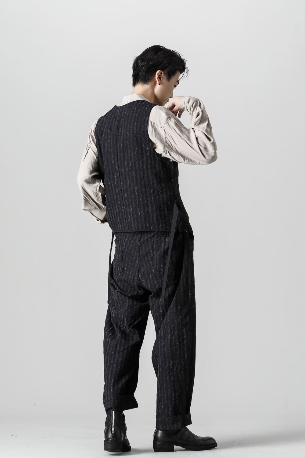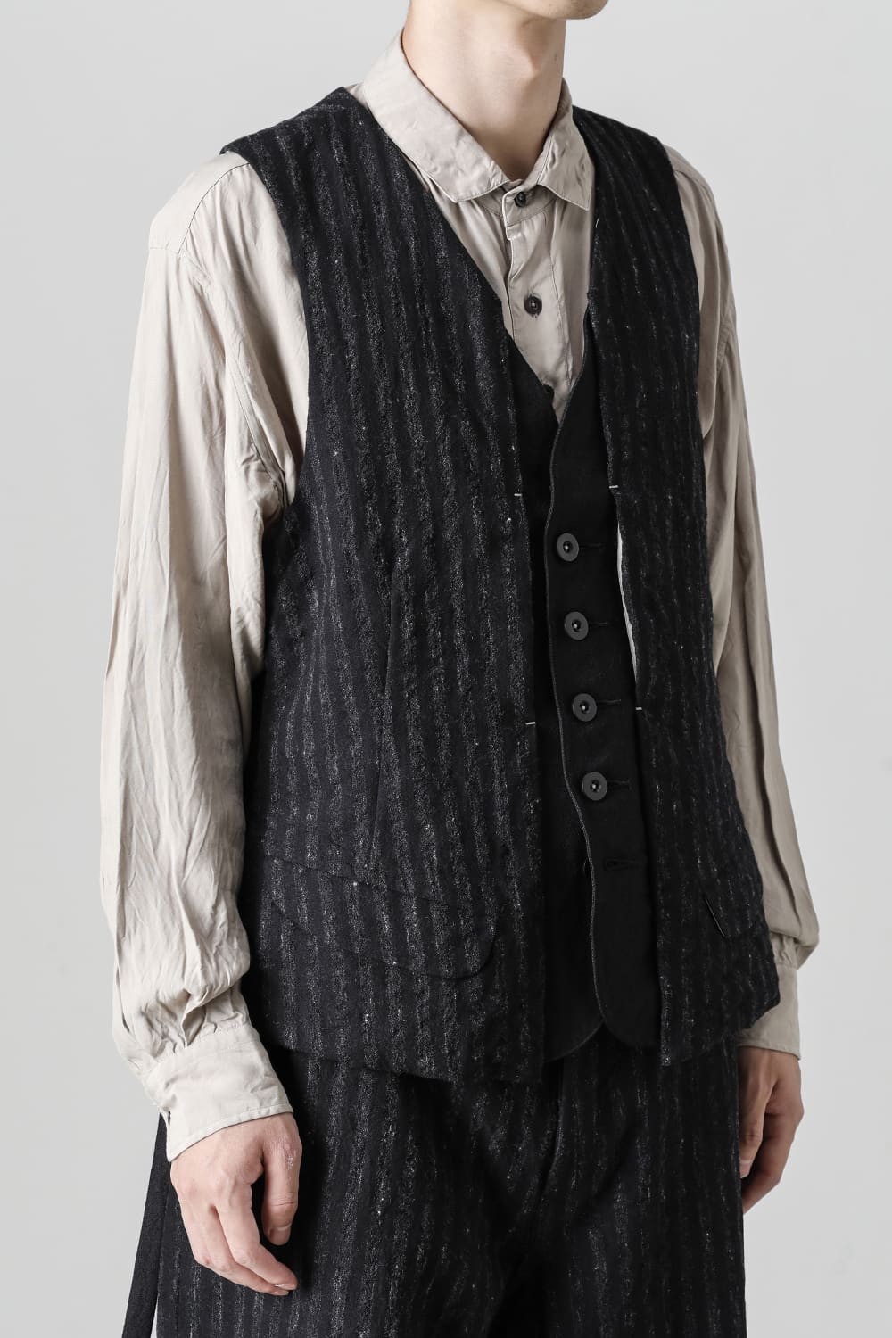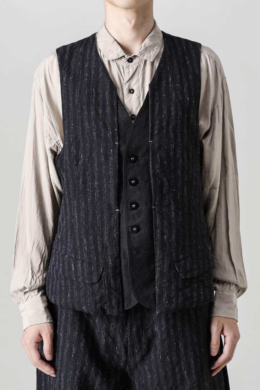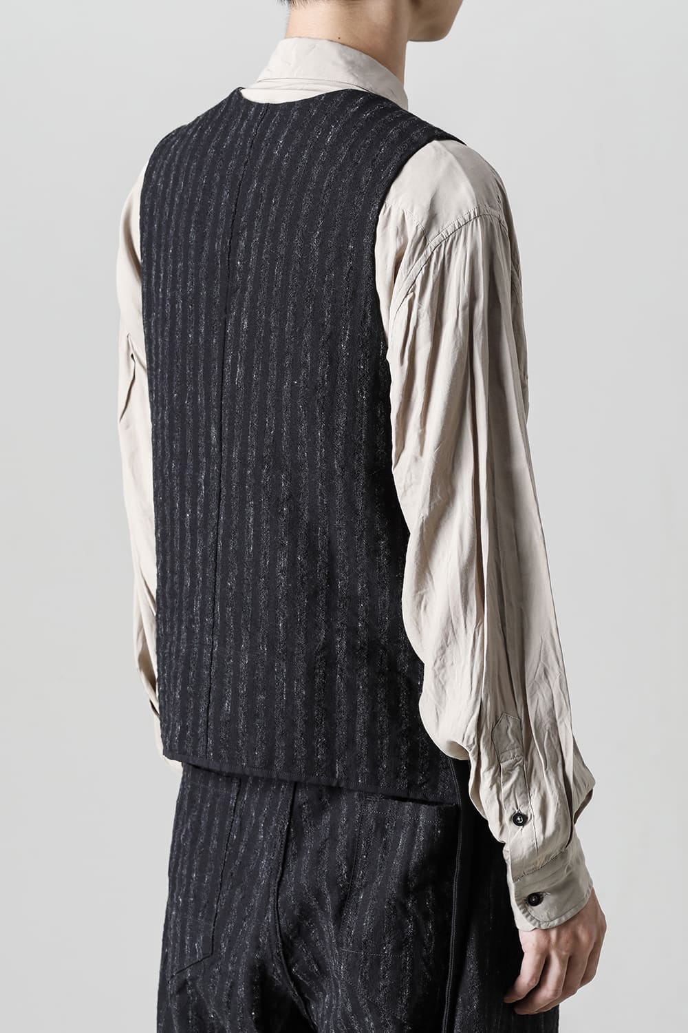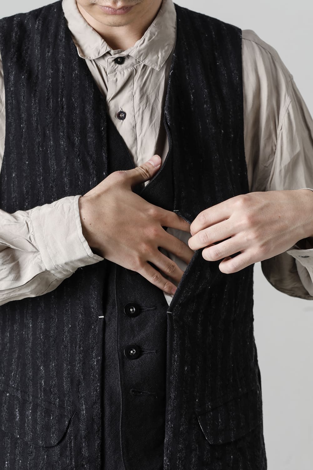 21SSから継続展開されているレギュラーフィットベスト「REVOLT」。レイヤード仕様のフロントデザインが胸ポケットを隠しアンティークなデザインにまとまっている。糸留めに隠されたバストポケットは着用者にしか分からない遊び心のある仕掛け。バックストラップが付属しておりますので、締め具合でシルエットの変化を愉しんで頂けます。素材はペルーコットンとアメリカンウールを絶妙なボケ感が生まれるように配置。密度が上手く調整されており、仕上げ洗いをかけることでラフでソフトなテキスタイルが生み出されています。見た目以上に軽やかな着用感ですので長いシーズンで活躍すること間違いありません。