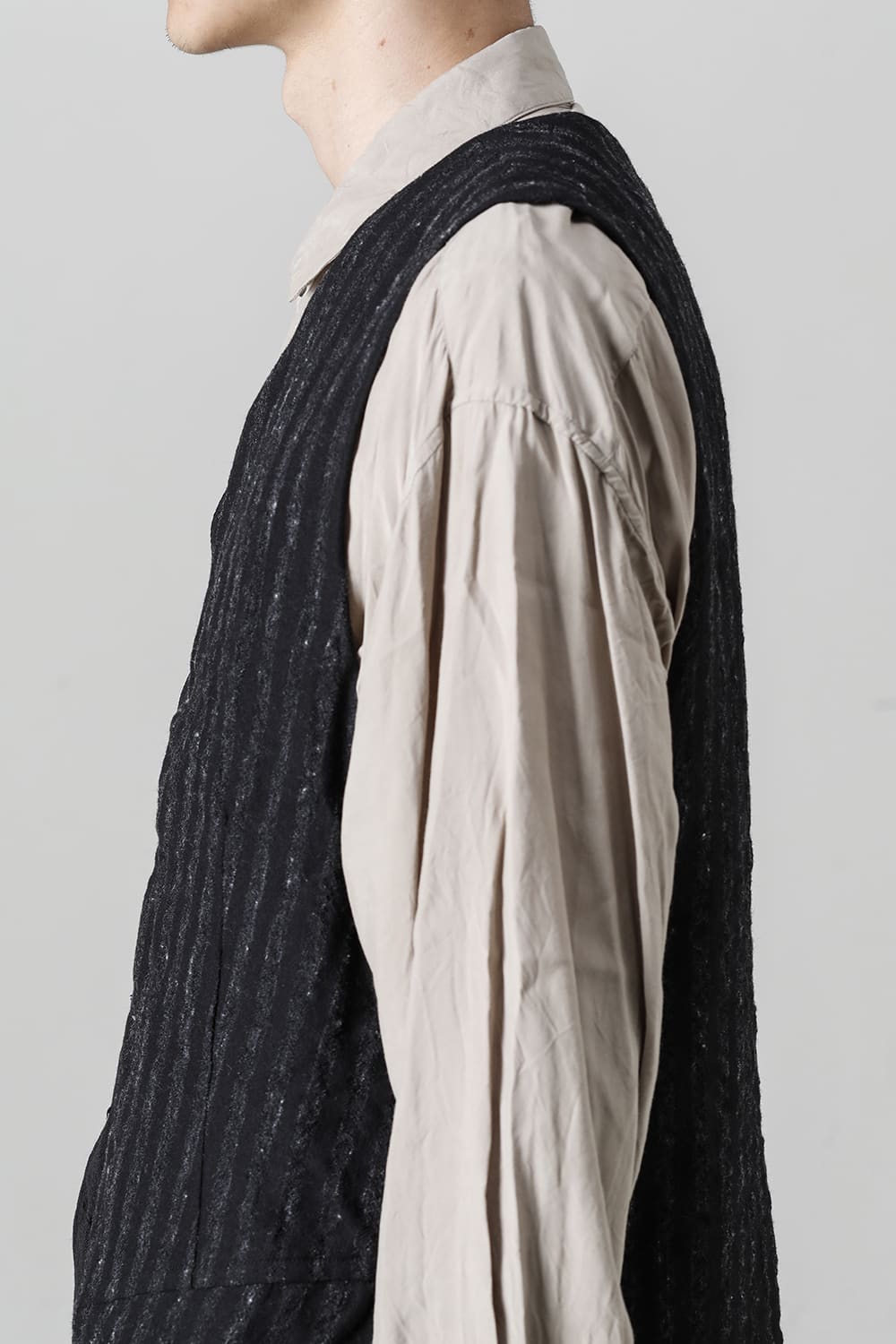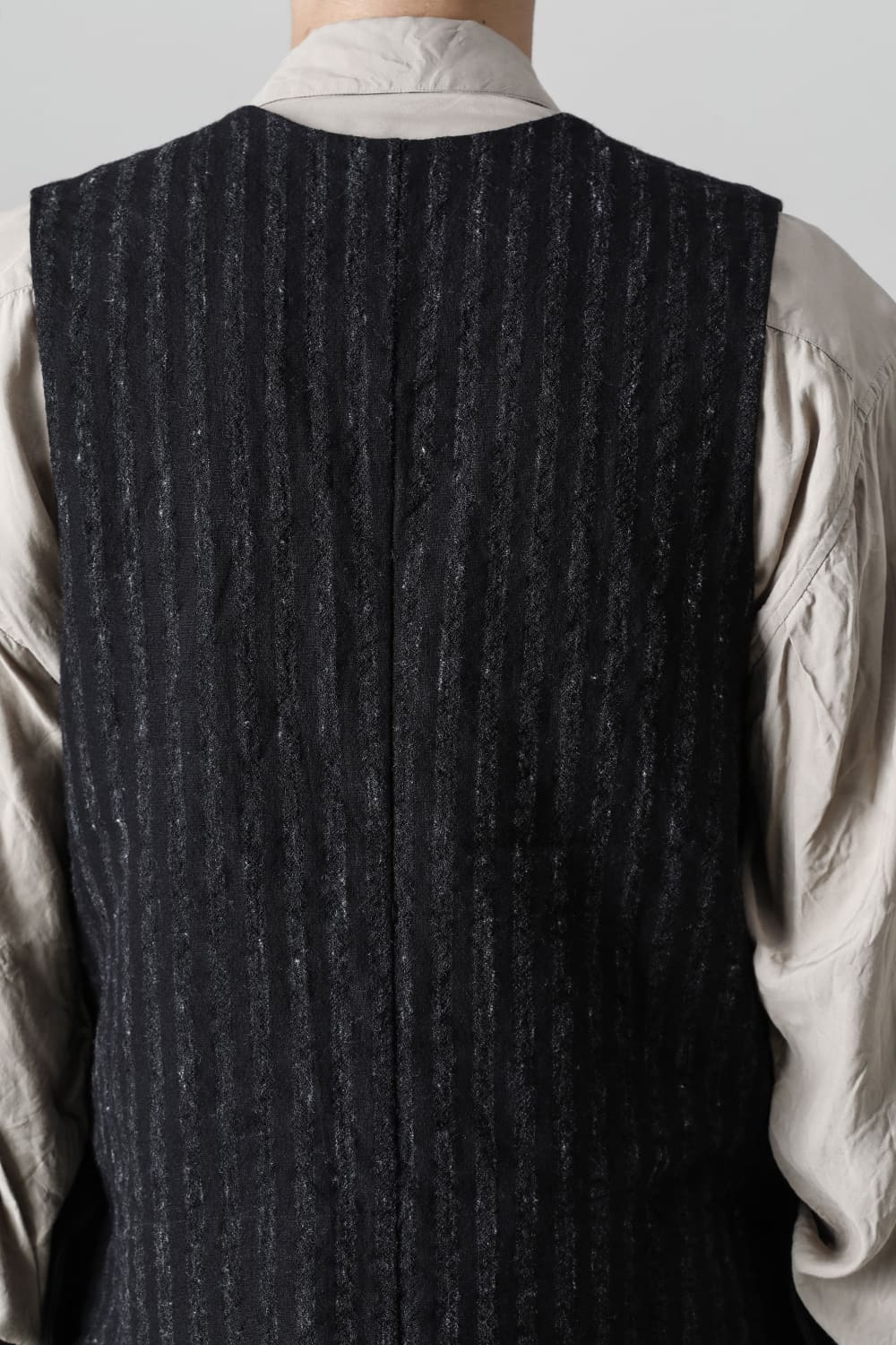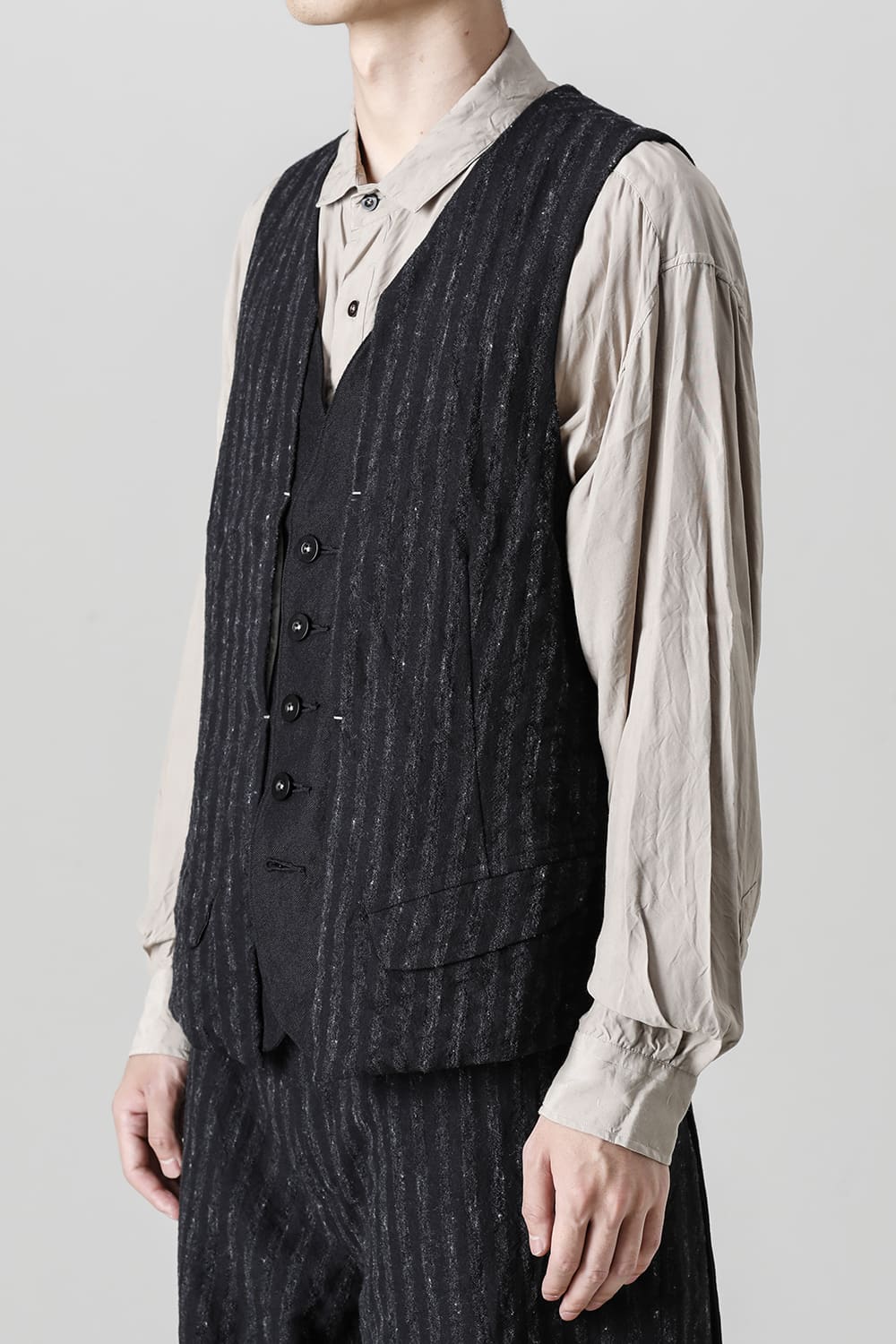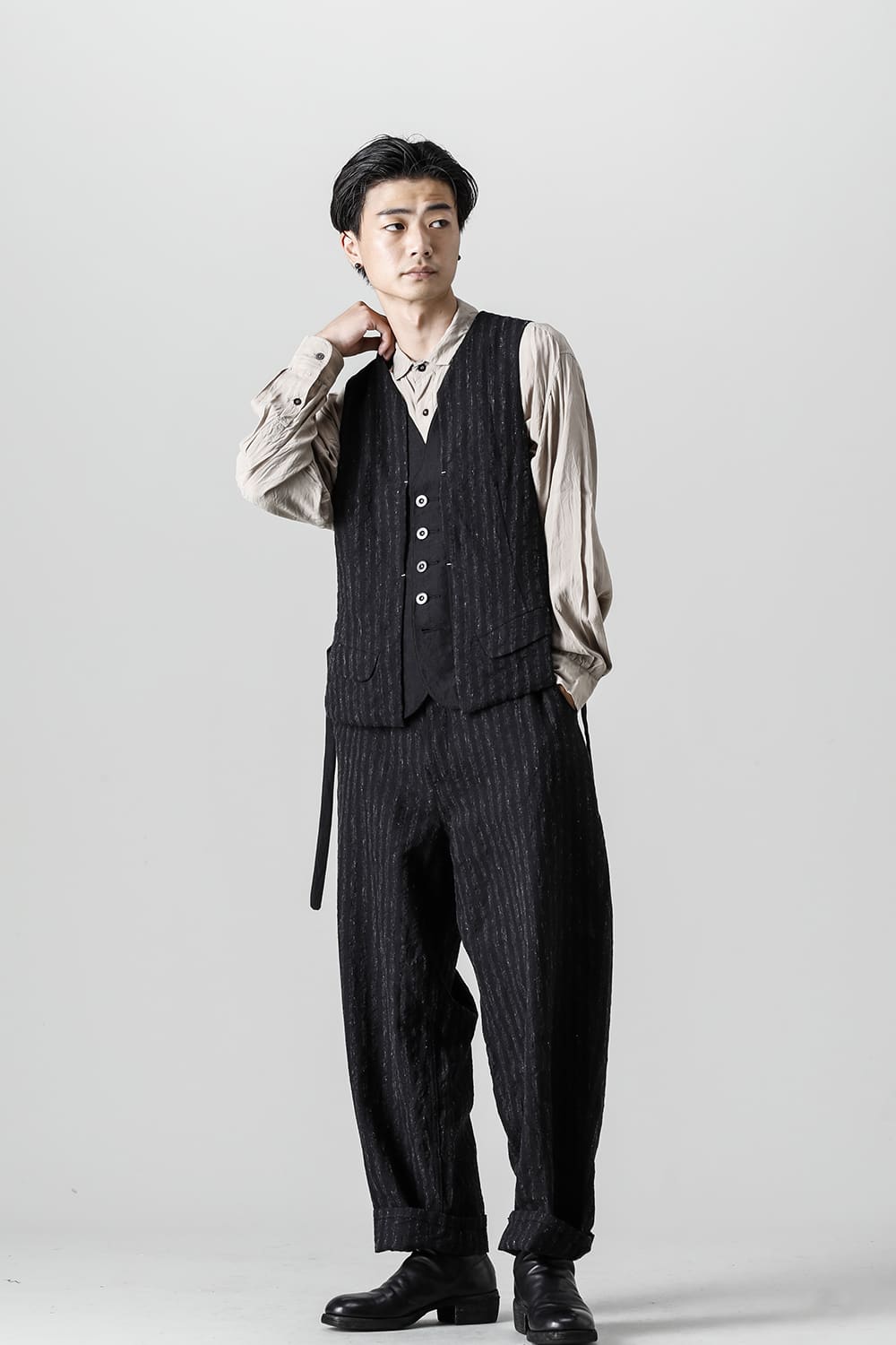 21SSから継続展開されているレギュラーフィットベスト「REVOLT」。レイヤード仕様のフロントデザインが胸ポケットを隠しアンティークなデザインにまとまっている。糸留めに隠されたバストポケットは着用者にしか分からない遊び心のある仕掛け。バックストラップが付属しておりますので、締め具合でシルエットの変化を愉しんで頂けます。素材はペルーコットンとアメリカンウールを絶妙なボケ感が生まれるように配置。密度が上手く調整されており、仕上げ洗いをかけることでラフでソフトなテキスタイルが生み出されています。見た目以上に軽やかな着用感ですので長いシーズンで活躍すること間違いありません。