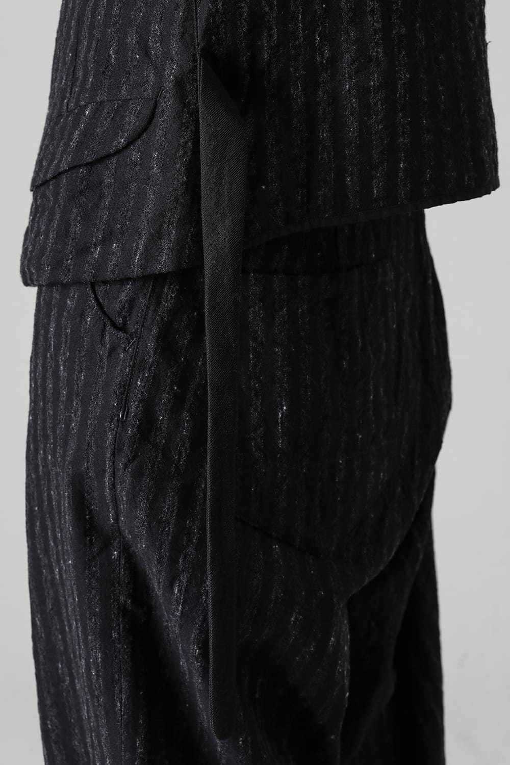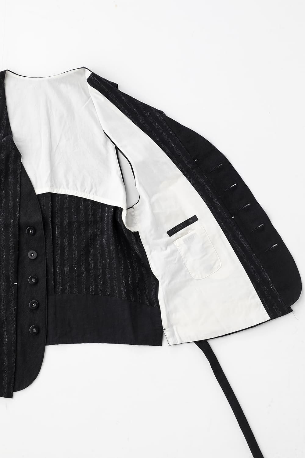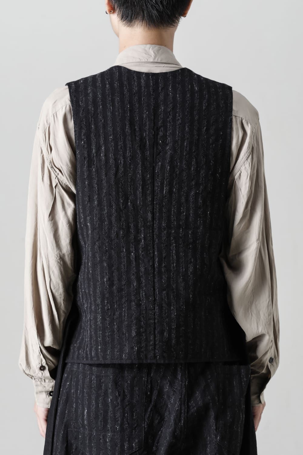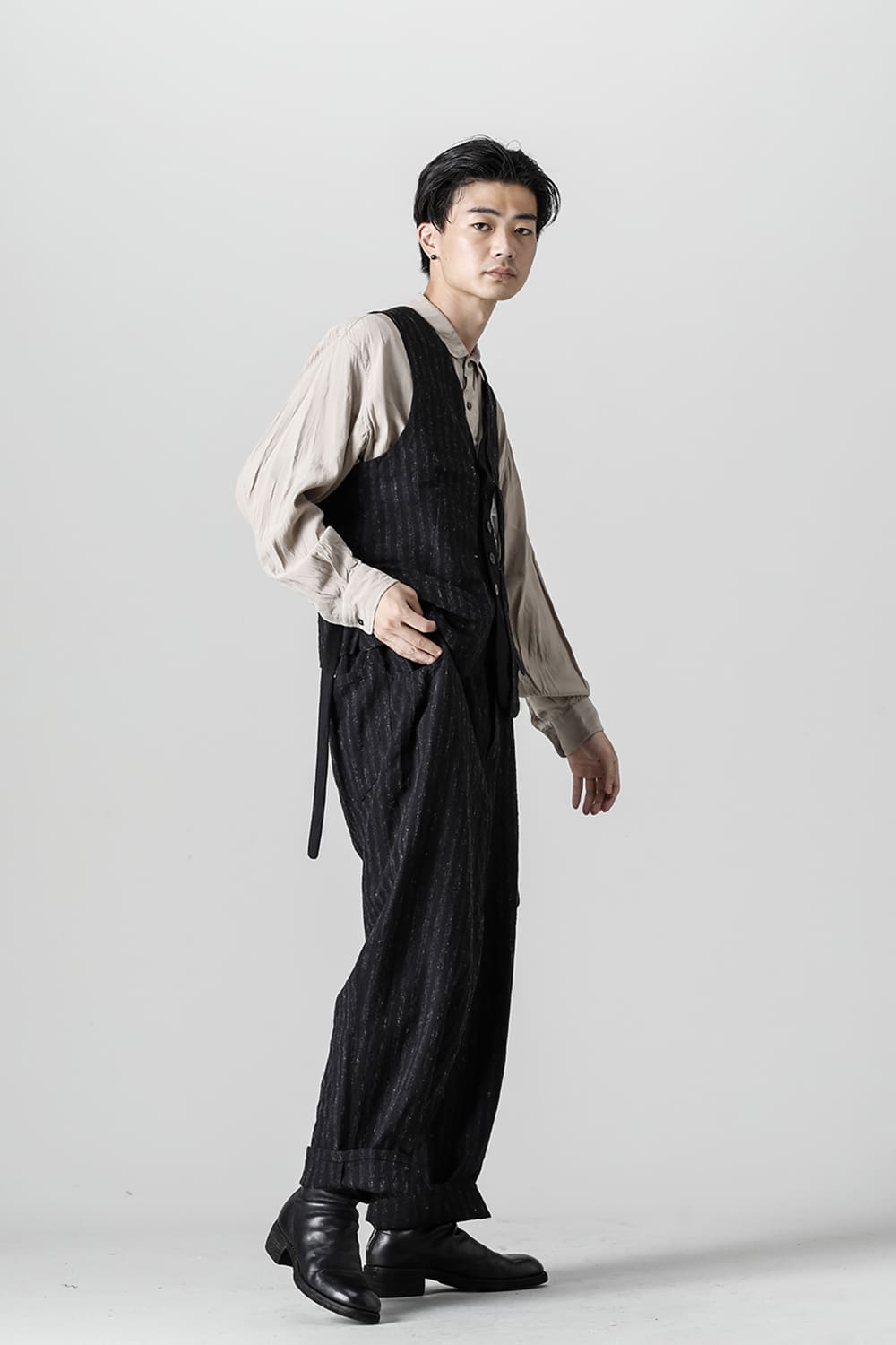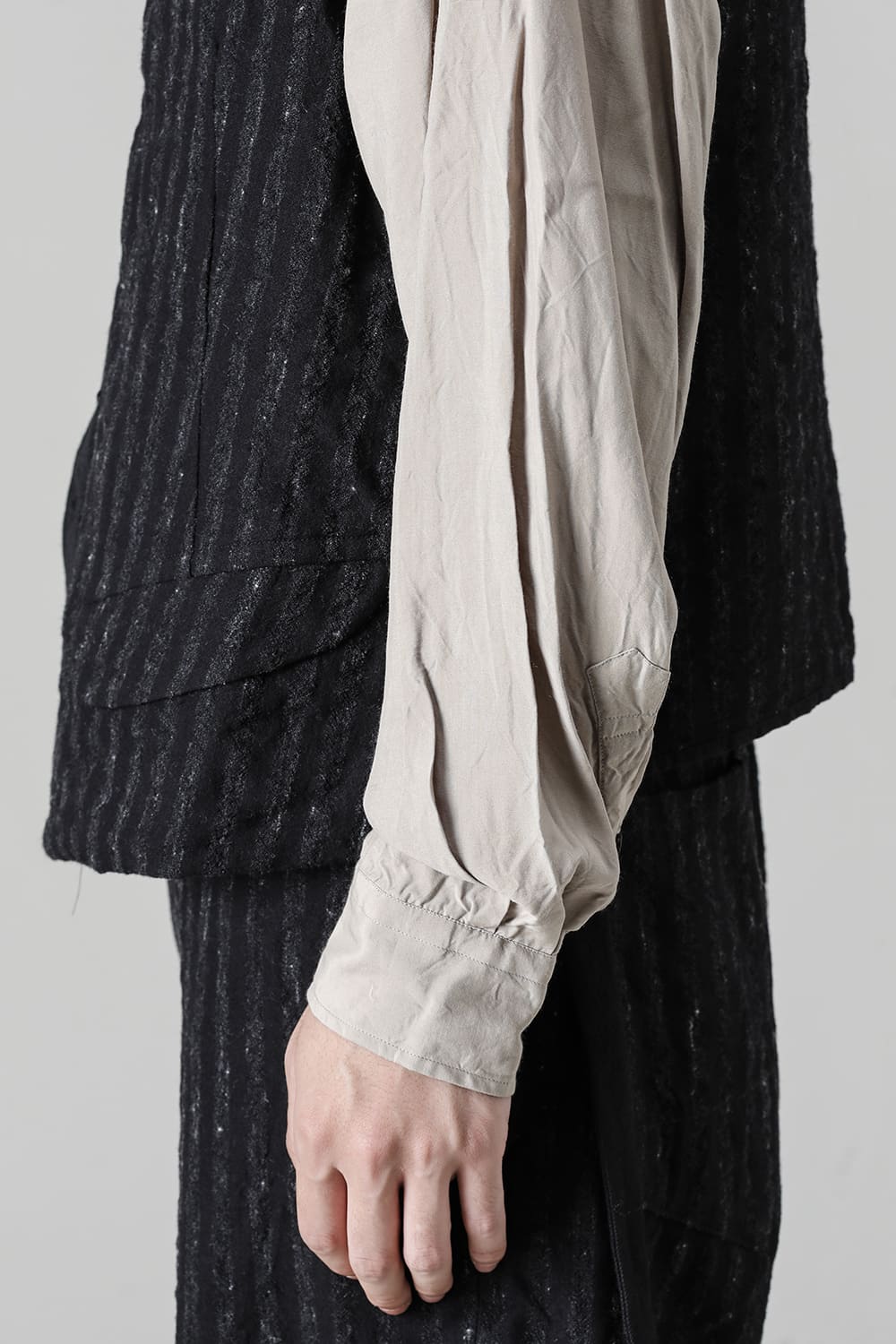 21SSから継続展開されているレギュラーフィットベスト「REVOLT」。レイヤード仕様のフロントデザインが胸ポケットを隠しアンティークなデザインにまとまっている。糸留めに隠されたバストポケットは着用者にしか分からない遊び心のある仕掛け。バックストラップが付属しておりますので、締め具合でシルエットの変化を愉しんで頂けます。素材はペルーコットンとアメリカンウールを絶妙なボケ感が生まれるように配置。密度が上手く調整されており、仕上げ洗いをかけることでラフでソフトなテキスタイルが生み出されています。見た目以上に軽やかな着用感ですので長いシーズンで活躍すること間違いありません。