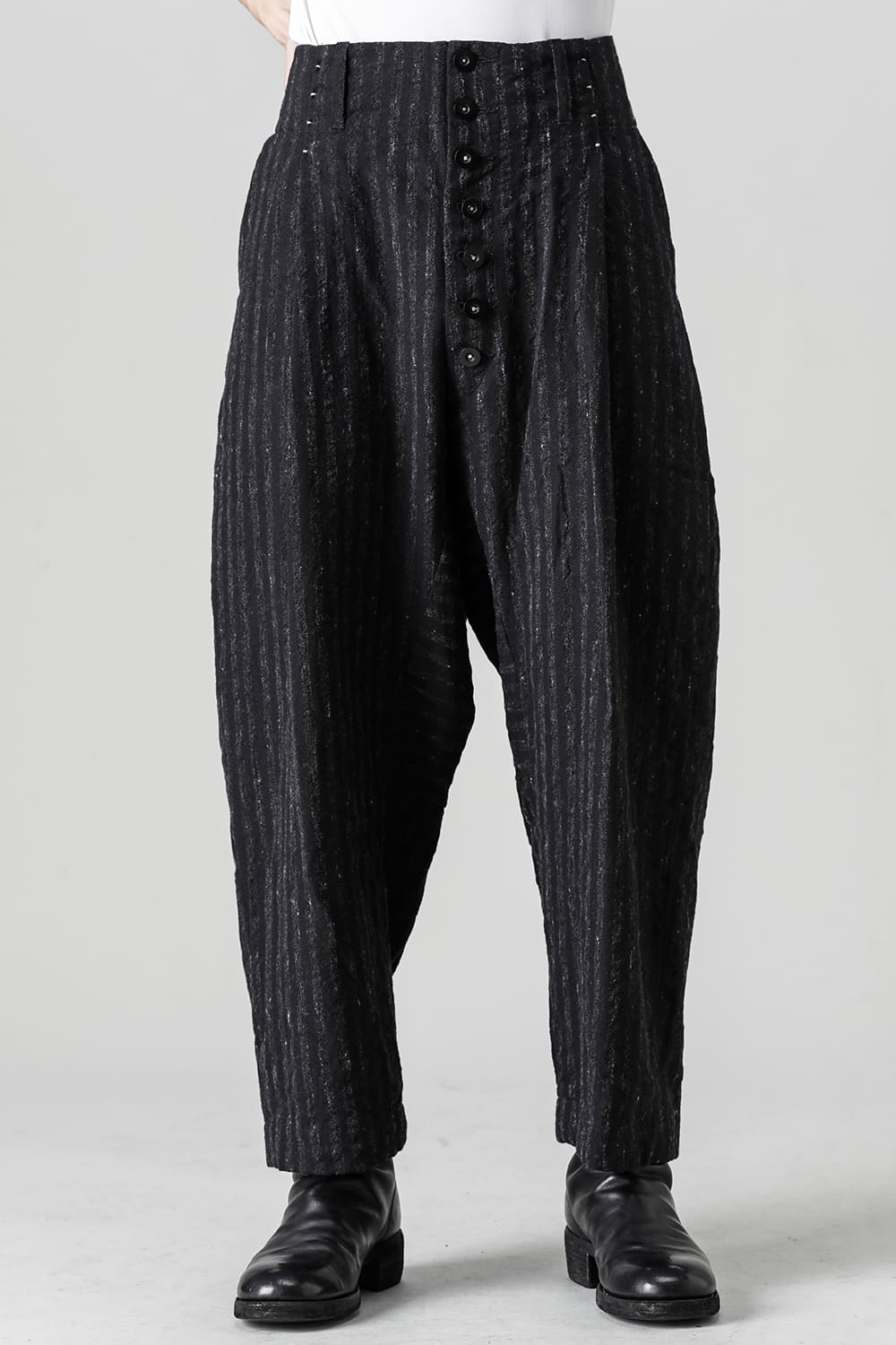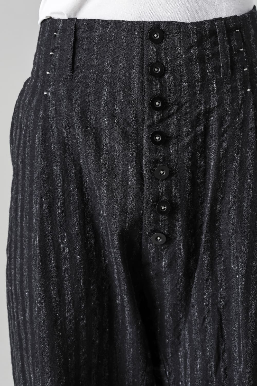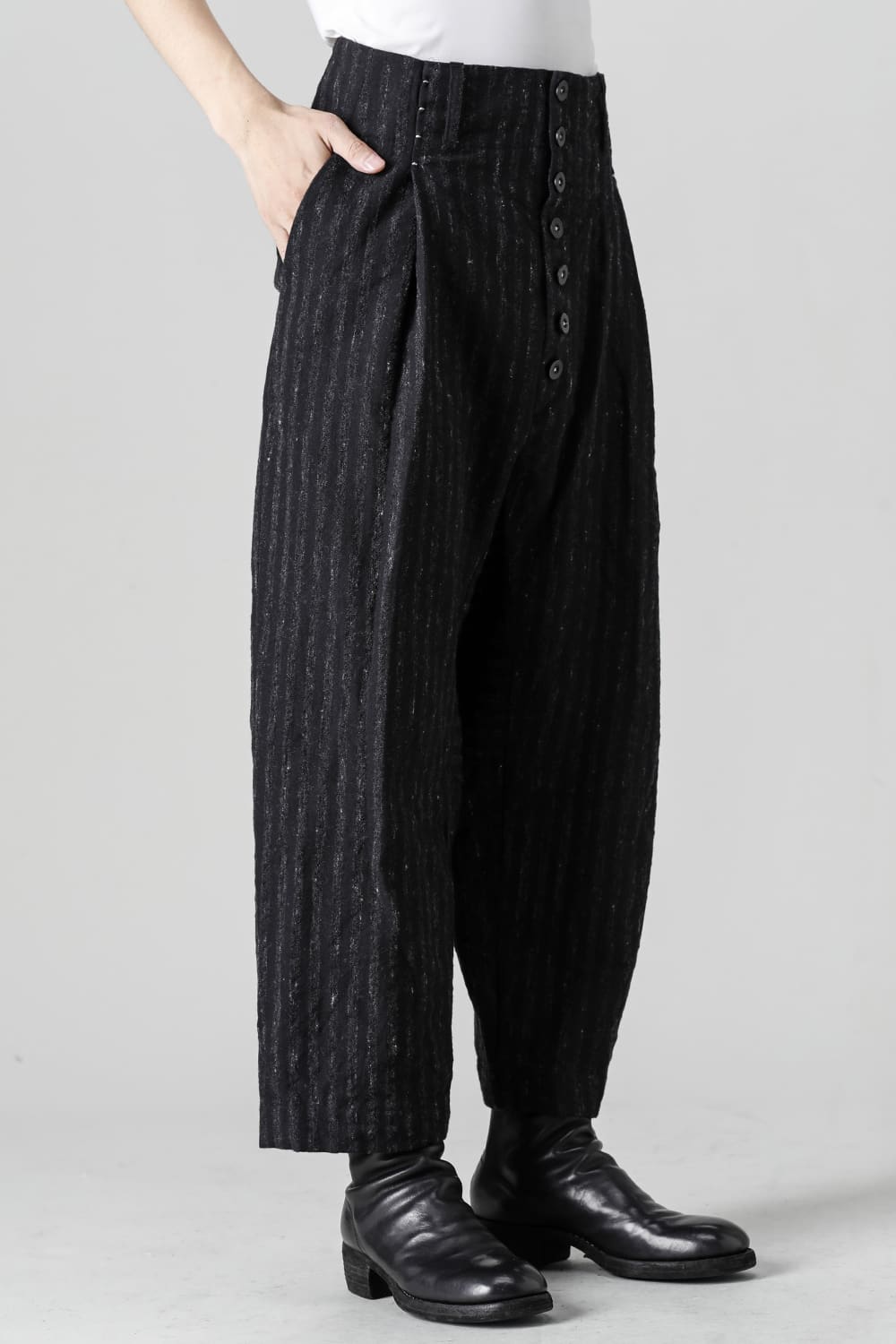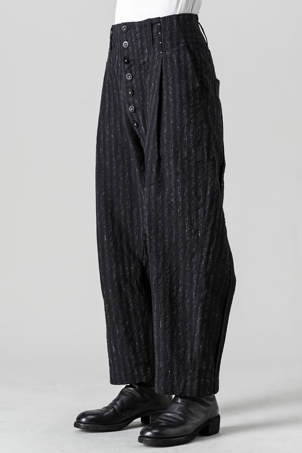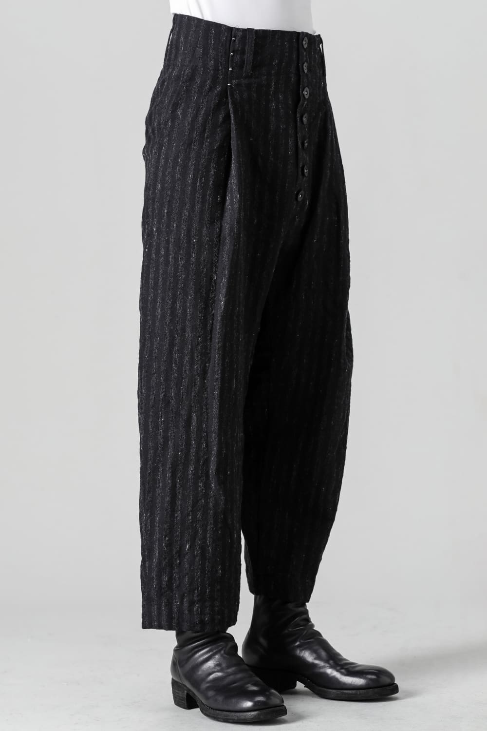 KLASICA定番のトラウザーズ「SABRON」スタンダードなビッグトラウザーズのサイジングをKLASICAらしく再解釈したのがこのトラウザーズの始まり。ユニークなディテールが随所に散りばめられています。フロントで目を引く沢山のホーンボタンとステッチ、ウエスト周りから裾にかけての丸みのあるシルエットなど、ベースのトラウザーズにブランドらしさが付加されたオンリーワンの一着です。9部丈でコーディネートが重くなり過ぎずデイリーにご着用いただけます。素材はペルーコットンとアメリカンウールを絶妙なボケ感が生まれるように配置。密度が上手く調整されており、仕上げ洗いをかけることでラフでソフトなテキスタイルが生み出されています。見た目以上に軽やかな着用感ですので長いシーズンで活躍すること間違いありません。