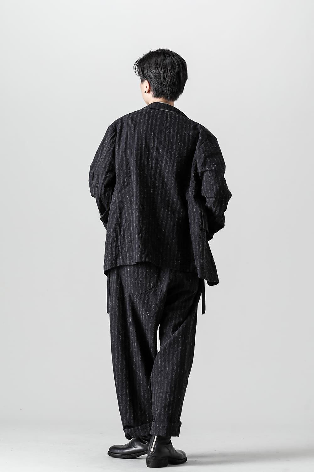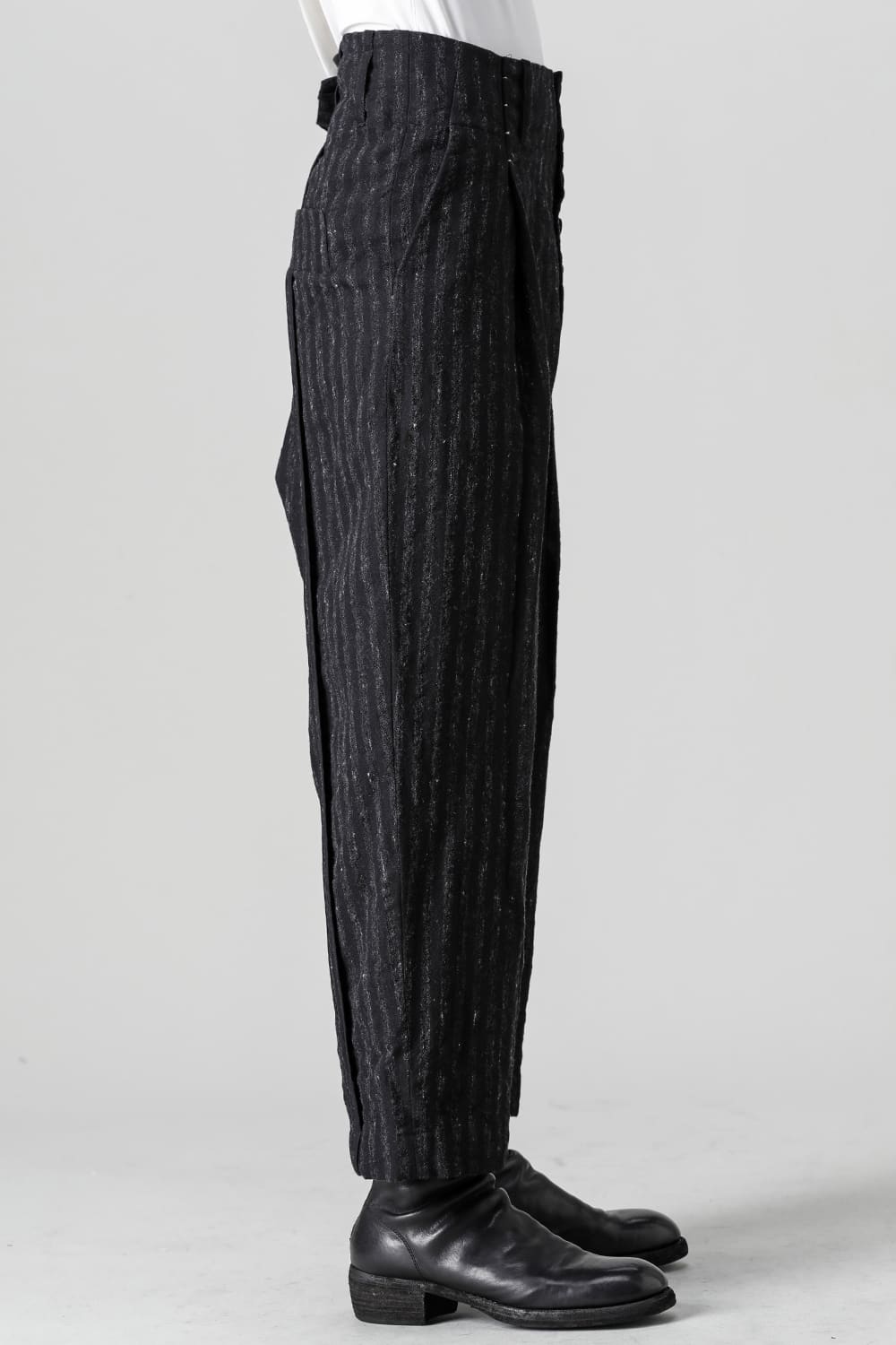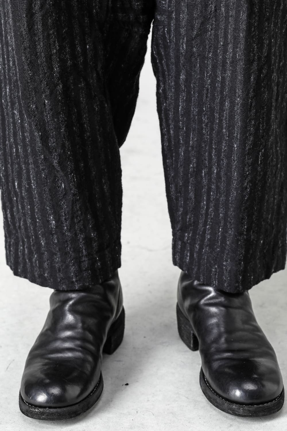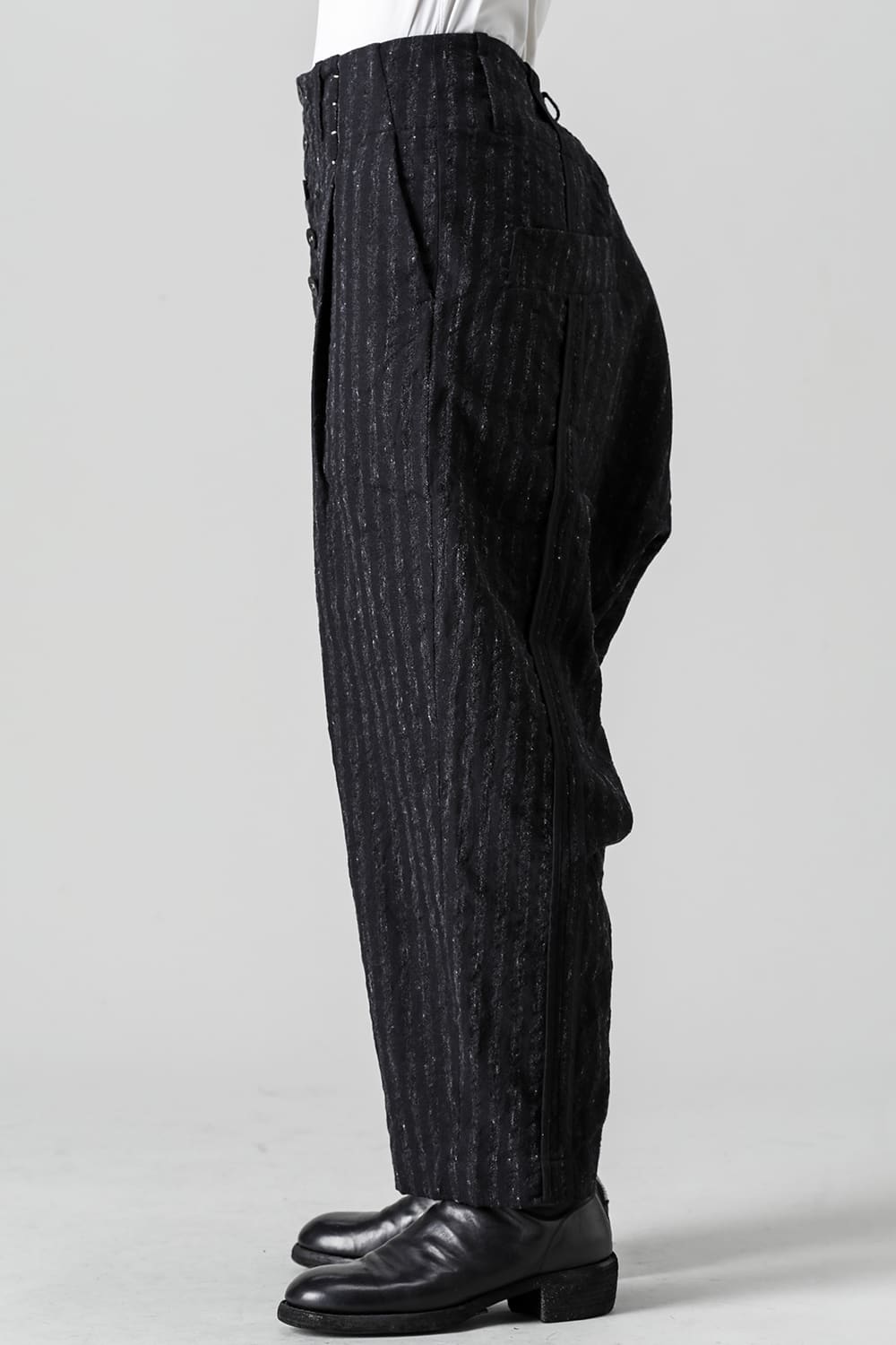 KLASICA定番のトラウザーズ「SABRON」スタンダードなビッグトラウザーズのサイジングをKLASICAらしく再解釈したのがこのトラウザーズの始まり。ユニークなディテールが随所に散りばめられています。フロントで目を引く沢山のホーンボタンとステッチ、ウエスト周りから裾にかけての丸みのあるシルエットなど、ベースのトラウザーズにブランドらしさが付加されたオンリーワンの一着です。9部丈でコーディネートが重くなり過ぎずデイリーにご着用いただけます。素材はペルーコットンとアメリカンウールを絶妙なボケ感が生まれるように配置。密度が上手く調整されており、仕上げ洗いをかけることでラフでソフトなテキスタイルが生み出されています。見た目以上に軽やかな着用感ですので長いシーズンで活躍すること間違いありません。