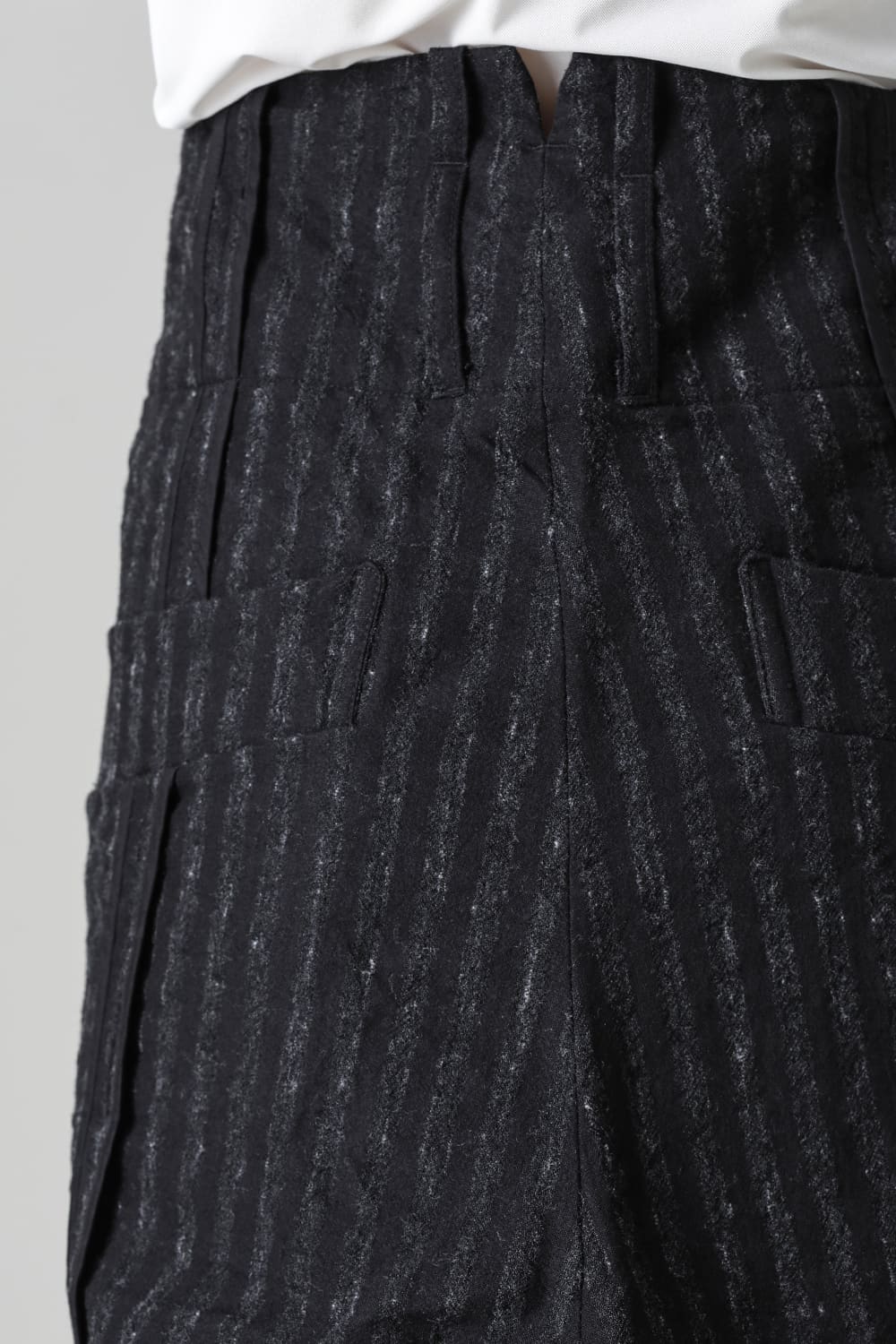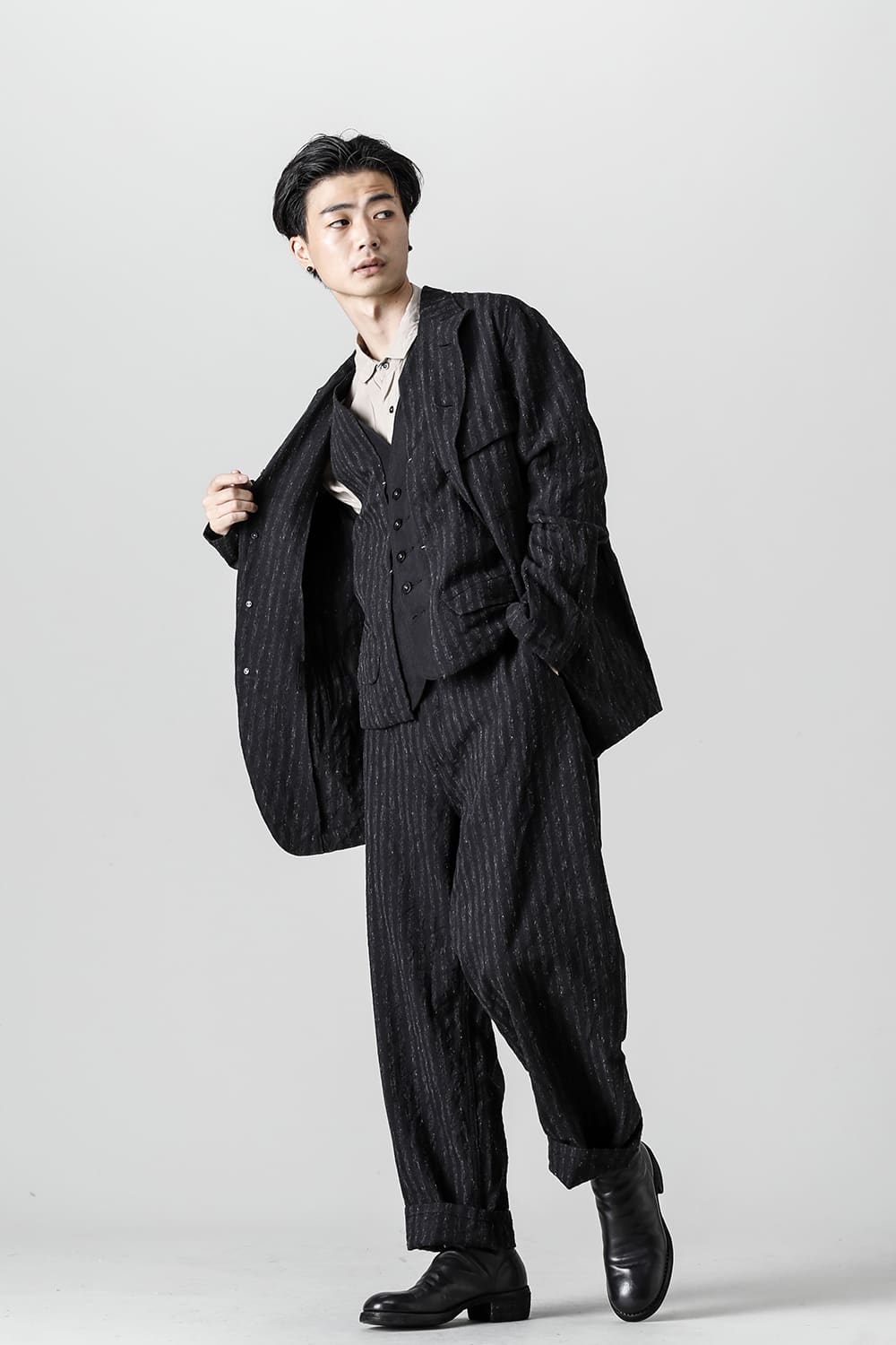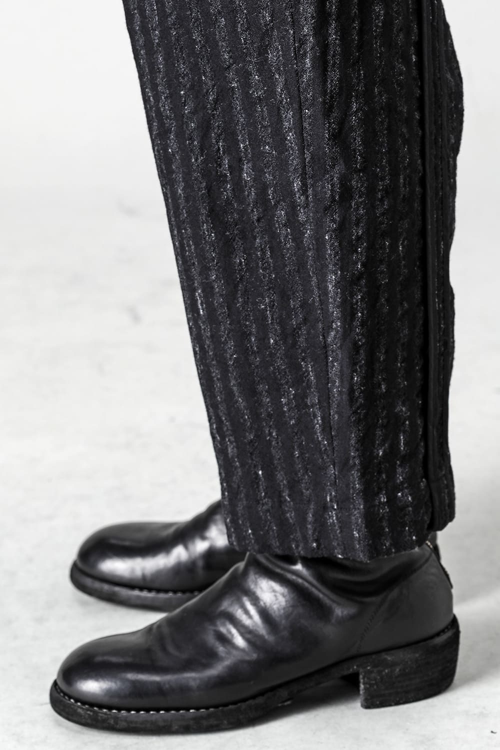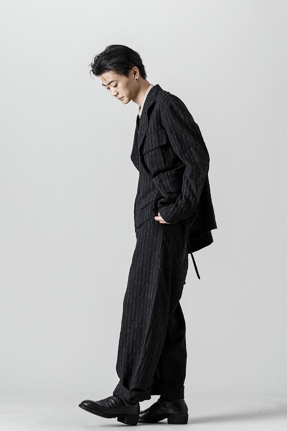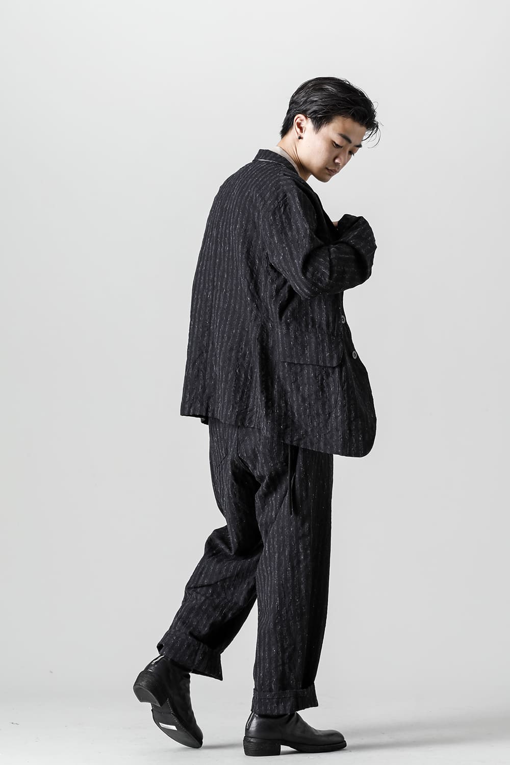 KLASICA定番のトラウザーズ「SABRON」スタンダードなビッグトラウザーズのサイジングをKLASICAらしく再解釈したのがこのトラウザーズの始まり。ユニークなディテールが随所に散りばめられています。フロントで目を引く沢山のホーンボタンとステッチ、ウエスト周りから裾にかけての丸みのあるシルエットなど、ベースのトラウザーズにブランドらしさが付加されたオンリーワンの一着です。9部丈でコーディネートが重くなり過ぎずデイリーにご着用いただけます。素材はペルーコットンとアメリカンウールを絶妙なボケ感が生まれるように配置。密度が上手く調整されており、仕上げ洗いをかけることでラフでソフトなテキスタイルが生み出されています。見た目以上に軽やかな着用感ですので長いシーズンで活躍すること間違いありません。