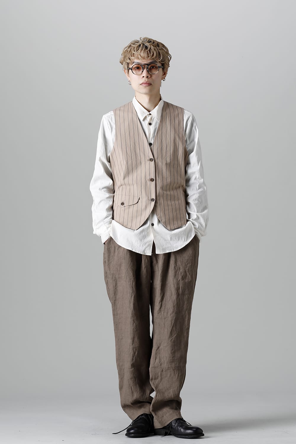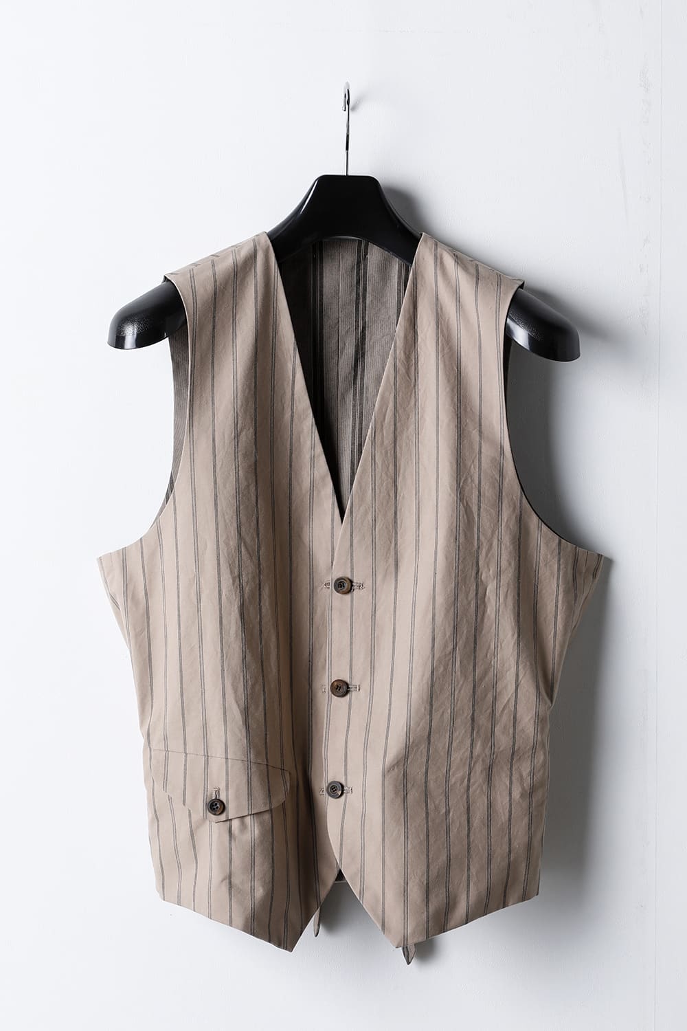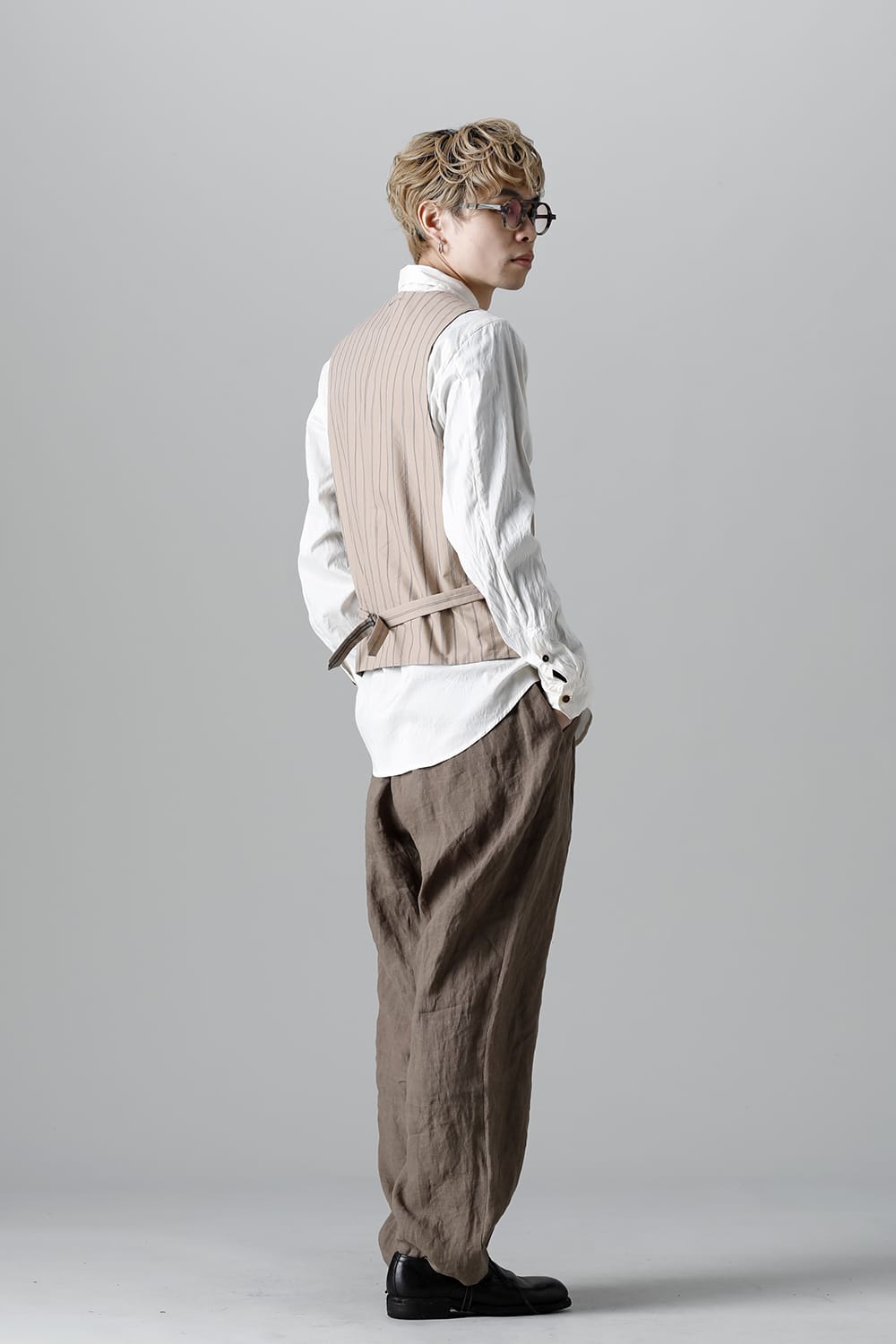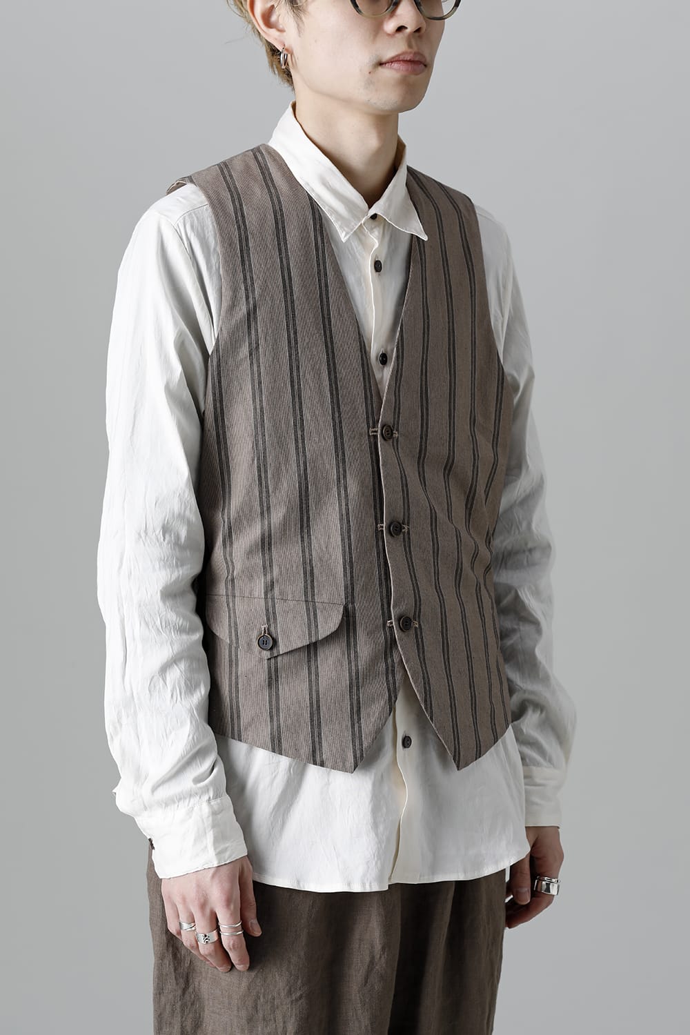 装飾デザインを施さず、素材や染色、縫製に拘り、モデル本来の良さが引き立てられたNOUSANの3Bジレ。22SSは同素材で柄違いストライプ生地のリバーシブル仕様で、片側ポケットのアシンメトリーデザインとなっています。ボタンも表裏で違うものが配らわれているため、雰囲気の異なる二面性を愉しむことができます。背面のベルトもスリットから反対側に抜き出せる丁寧なつくり。ミニマルなデザインに表裏ともにストライプ柄という粋なリバーシブルを組み合わせた味わい深い一着です。