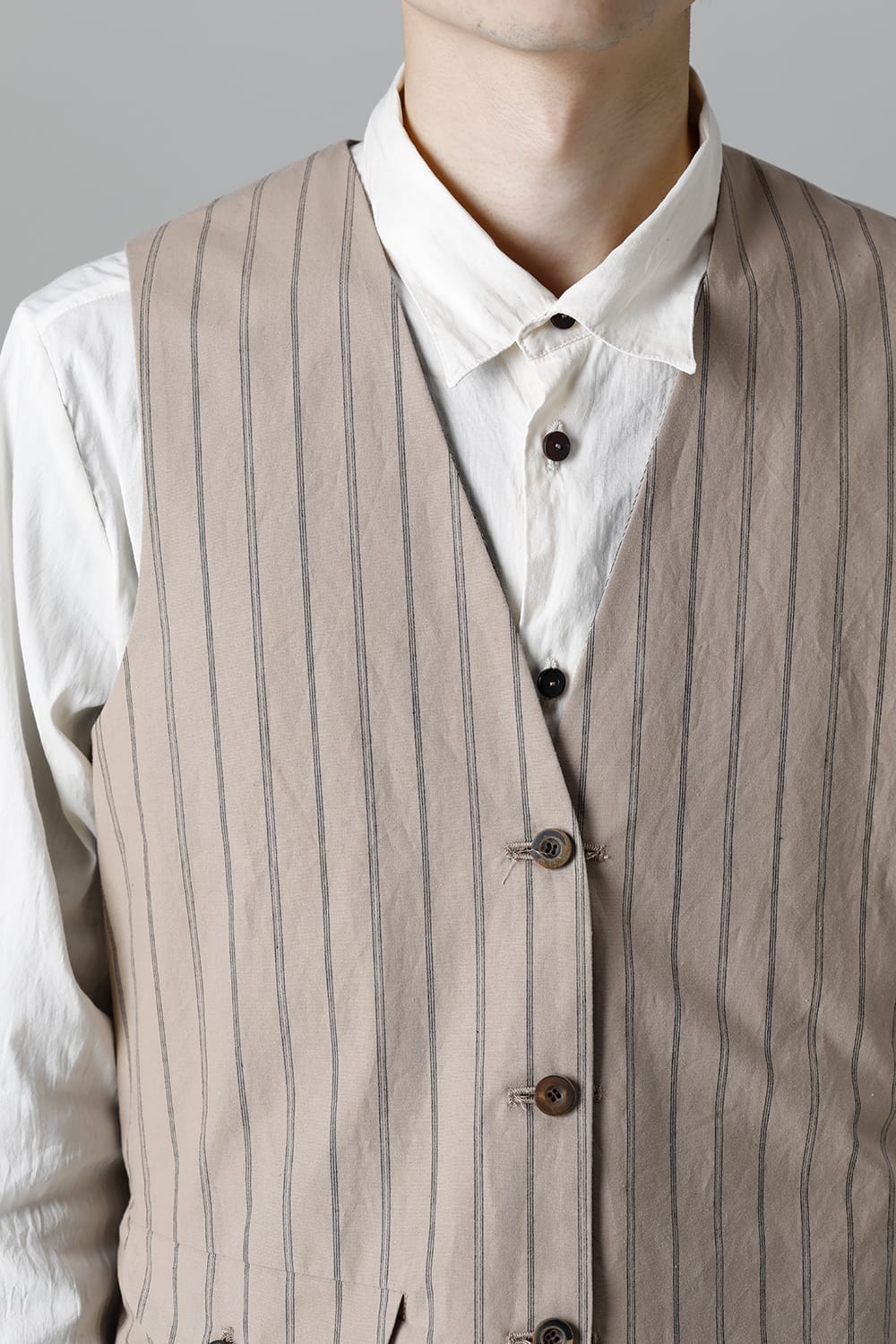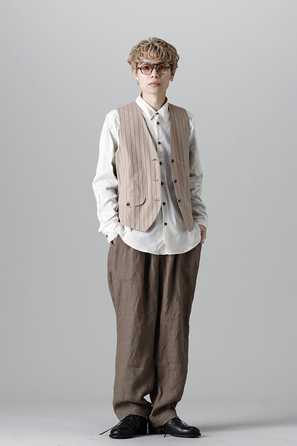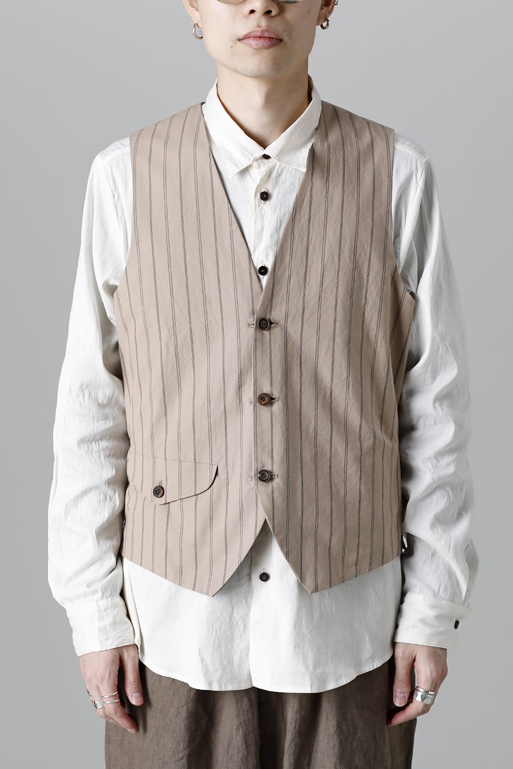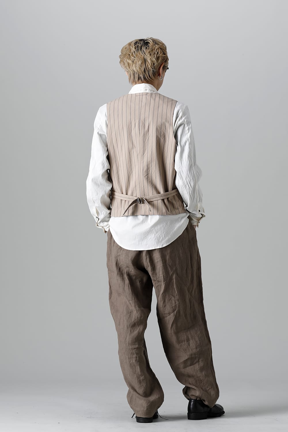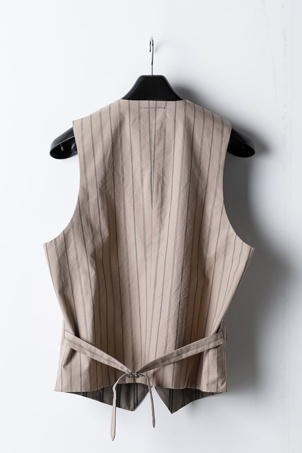 装飾デザインを施さず、素材や染色、縫製に拘り、モデル本来の良さが引き立てられたNOUSANの3Bジレ。22SSは同素材で柄違いストライプ生地のリバーシブル仕様で、片側ポケットのアシンメトリーデザインとなっています。ボタンも表裏で違うものが配らわれているため、雰囲気の異なる二面性を愉しむことができます。背面のベルトもスリットから反対側に抜き出せる丁寧なつくり。ミニマルなデザインに表裏ともにストライプ柄という粋なリバーシブルを組み合わせた味わい深い一着です。