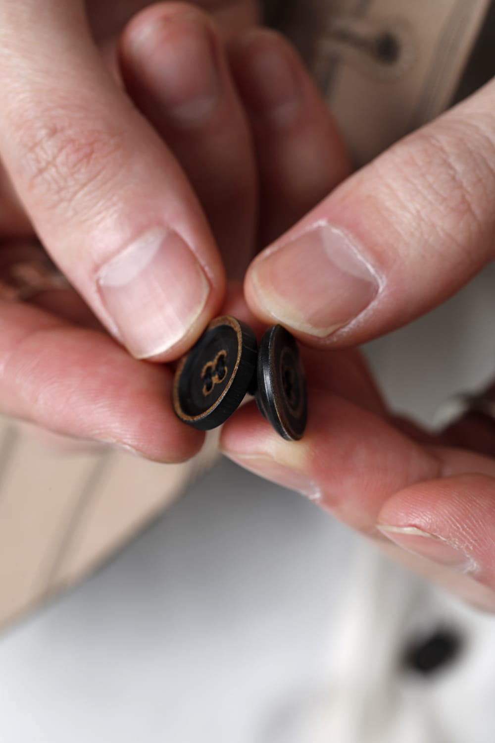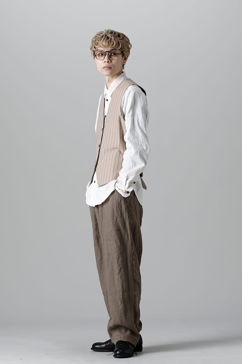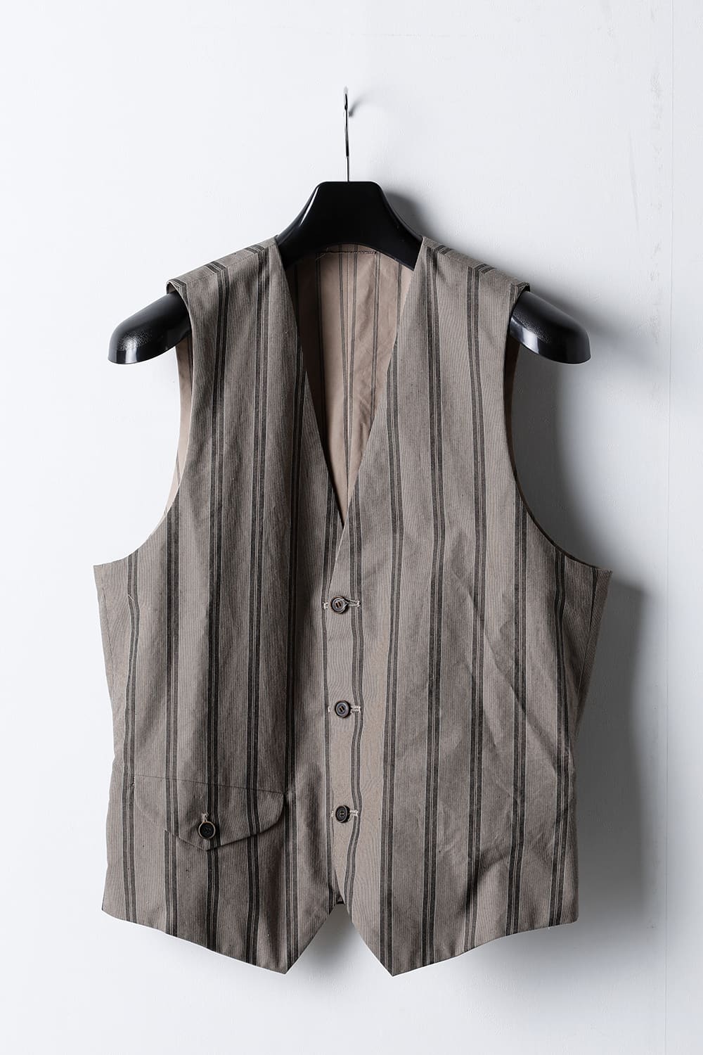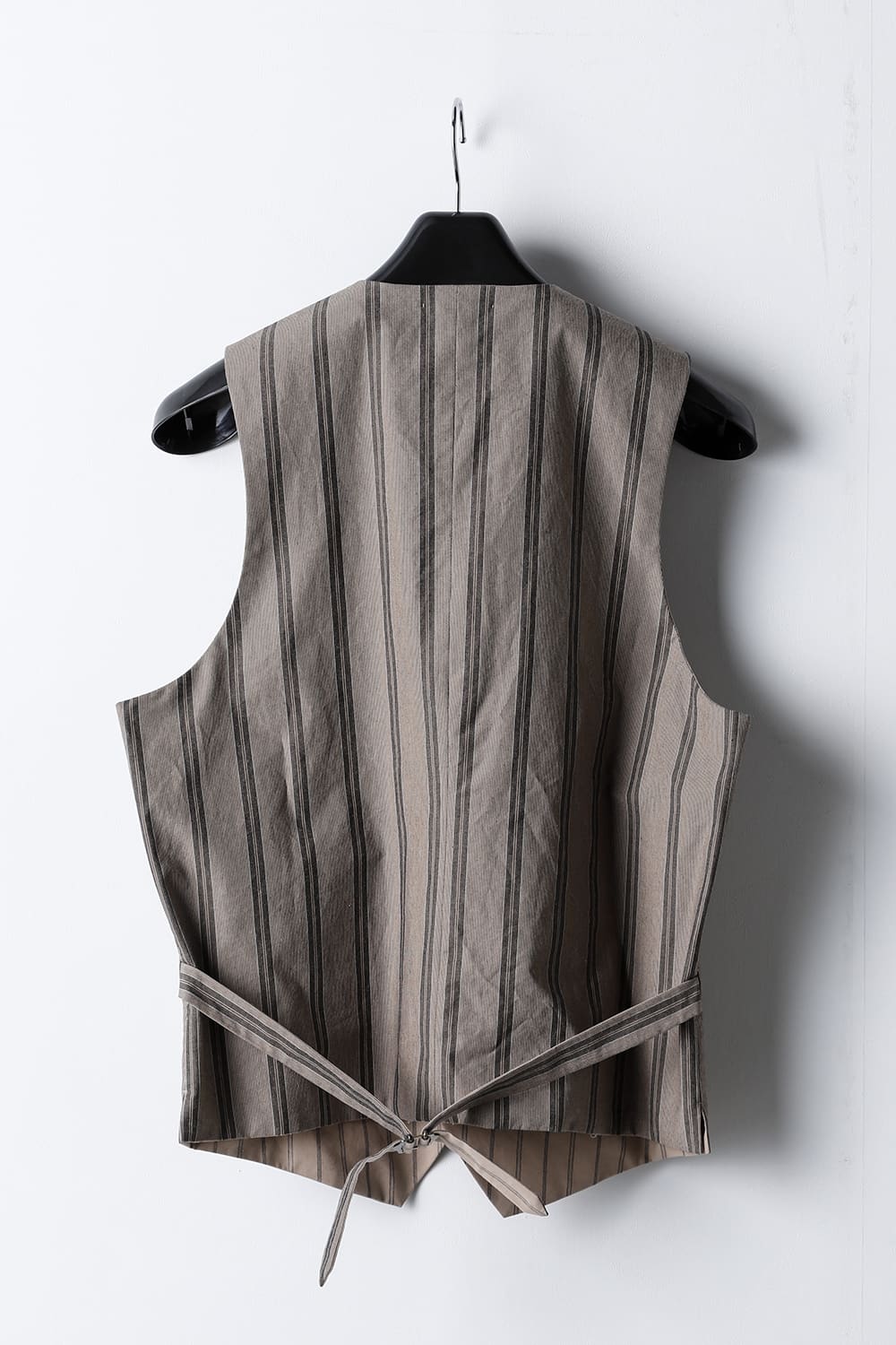 装飾デザインを施さず、素材や染色、縫製に拘り、モデル本来の良さが引き立てられたNOUSANの3Bジレ。22SSは同素材で柄違いストライプ生地のリバーシブル仕様で、片側ポケットのアシンメトリーデザインとなっています。ボタンも表裏で違うものが配らわれているため、雰囲気の異なる二面性を愉しむことができます。背面のベルトもスリットから反対側に抜き出せる丁寧なつくり。ミニマルなデザインに表裏ともにストライプ柄という粋なリバーシブルを組み合わせた味わい深い一着です。