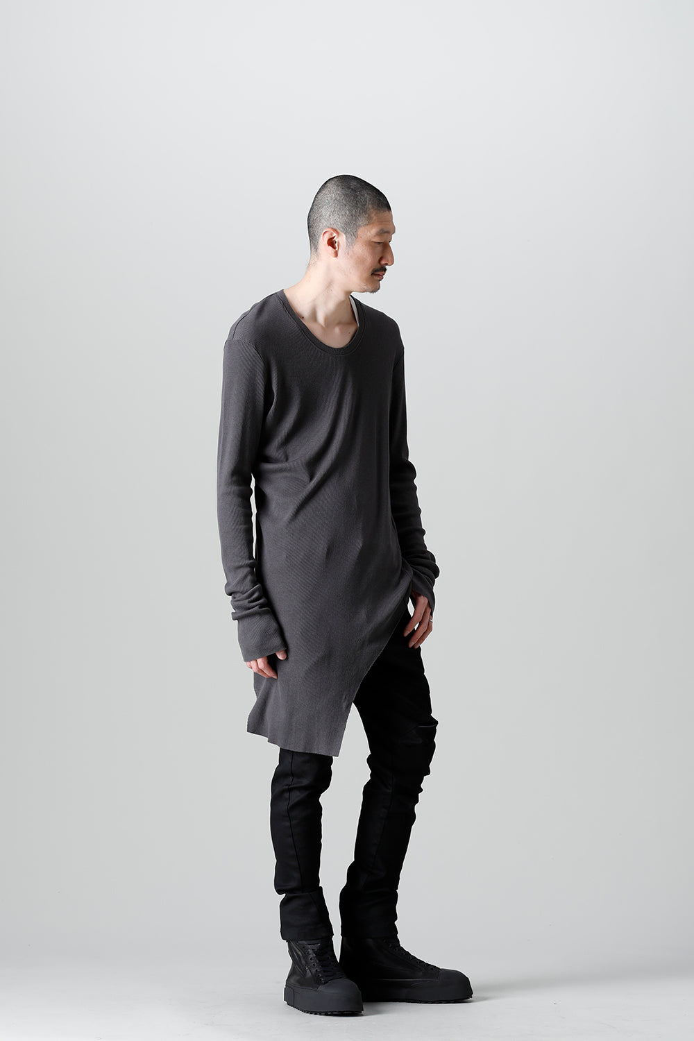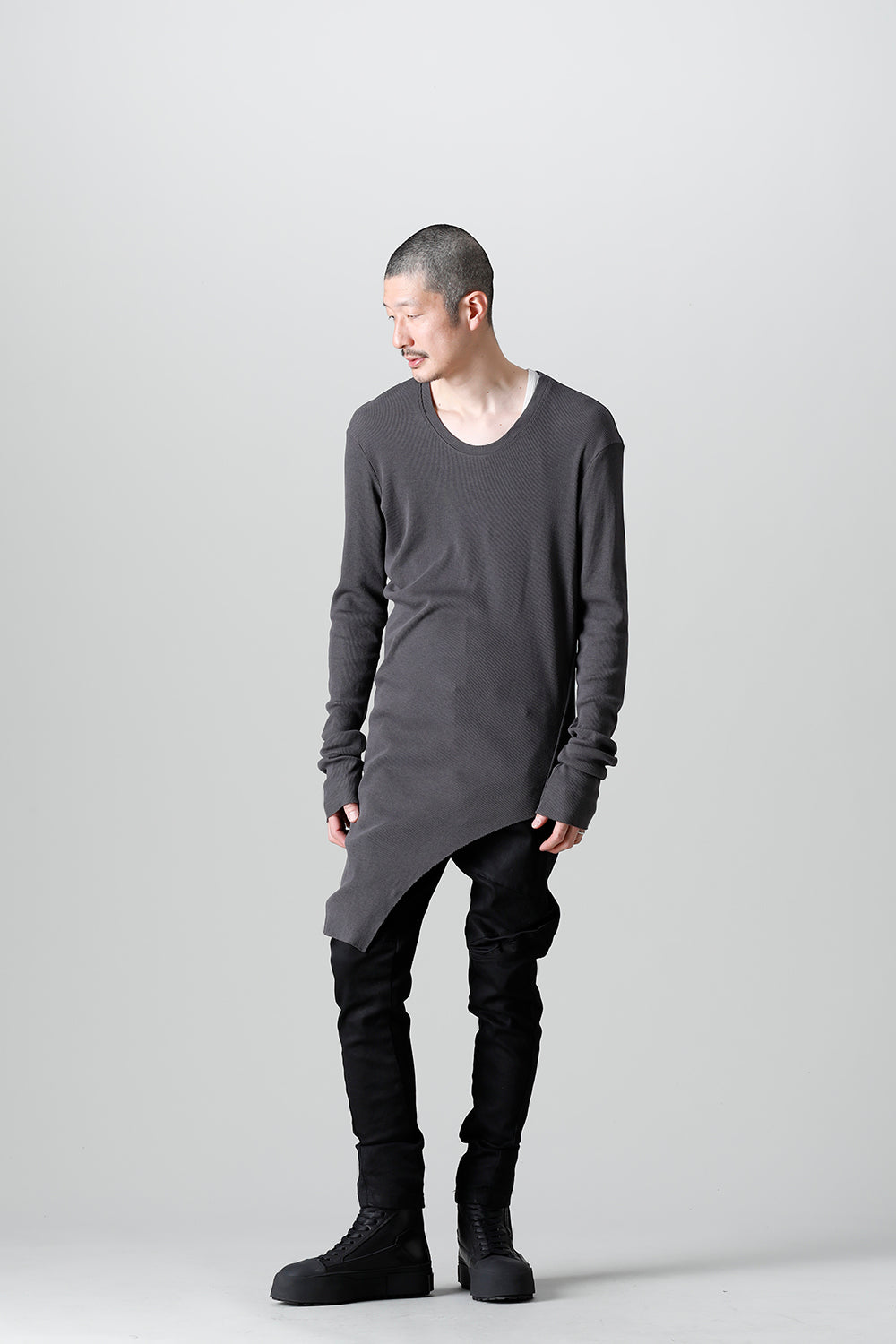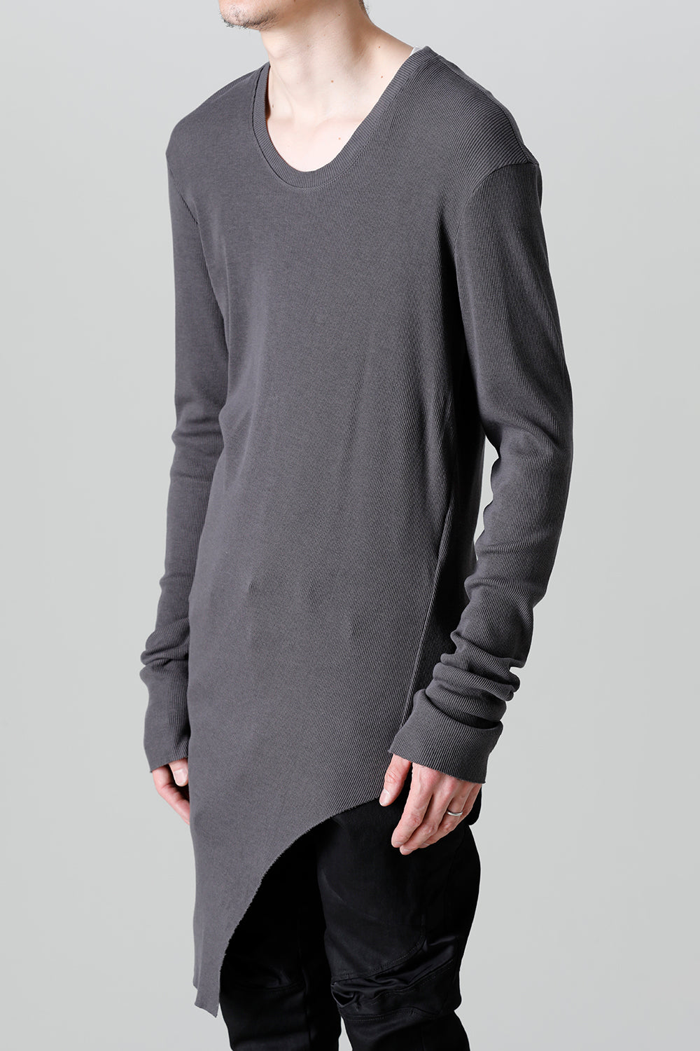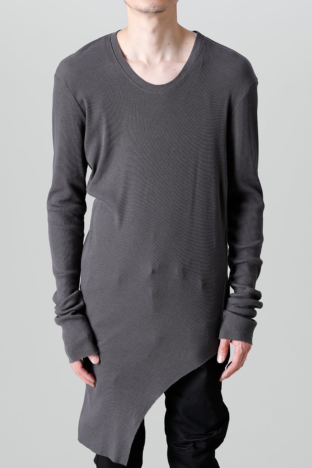 右裾が長く設計されたアシンメトリーなデザインで一癖あるレイヤードをお楽しみいただけます。