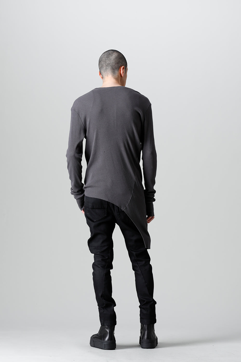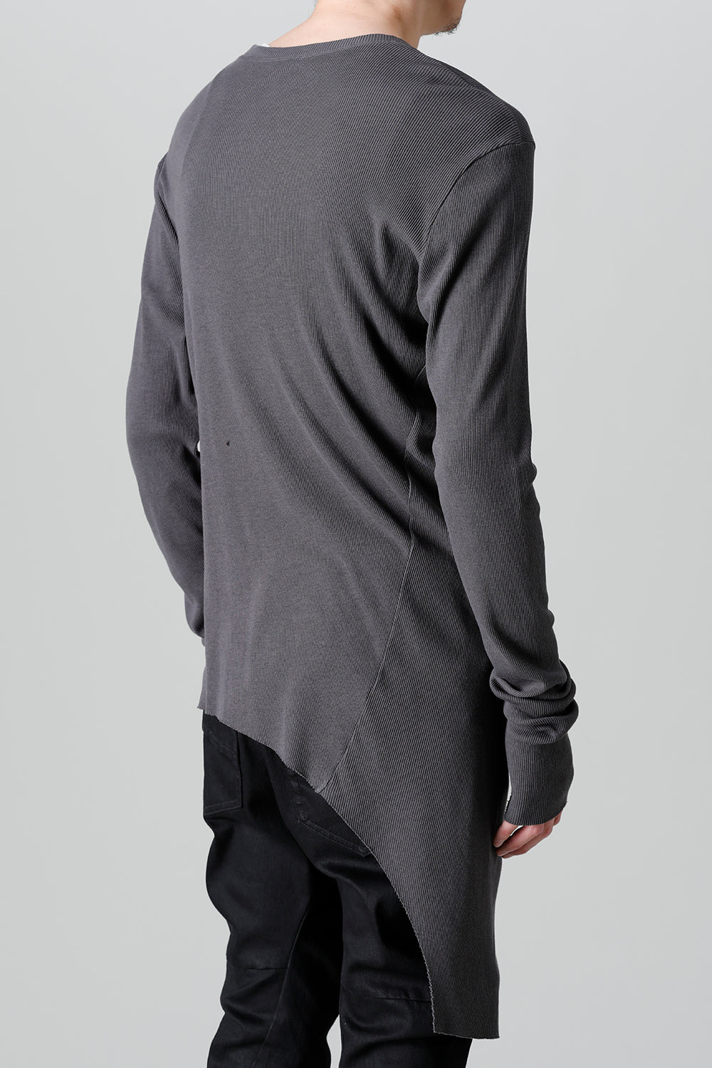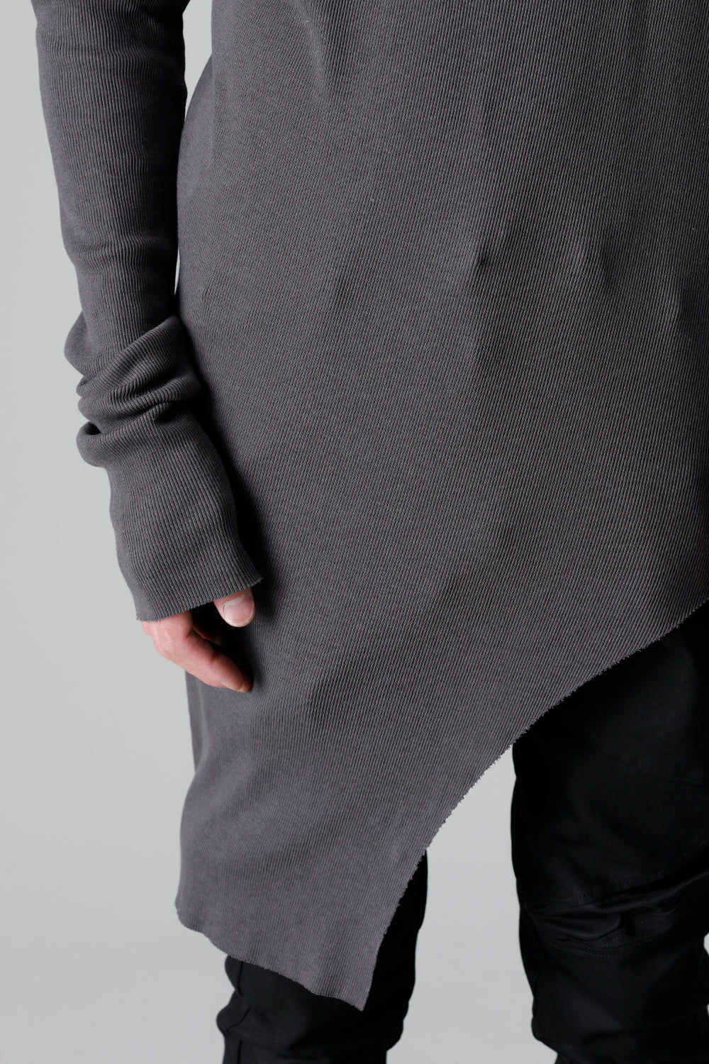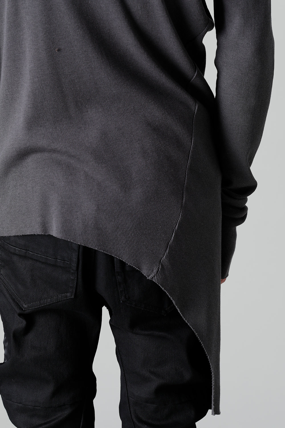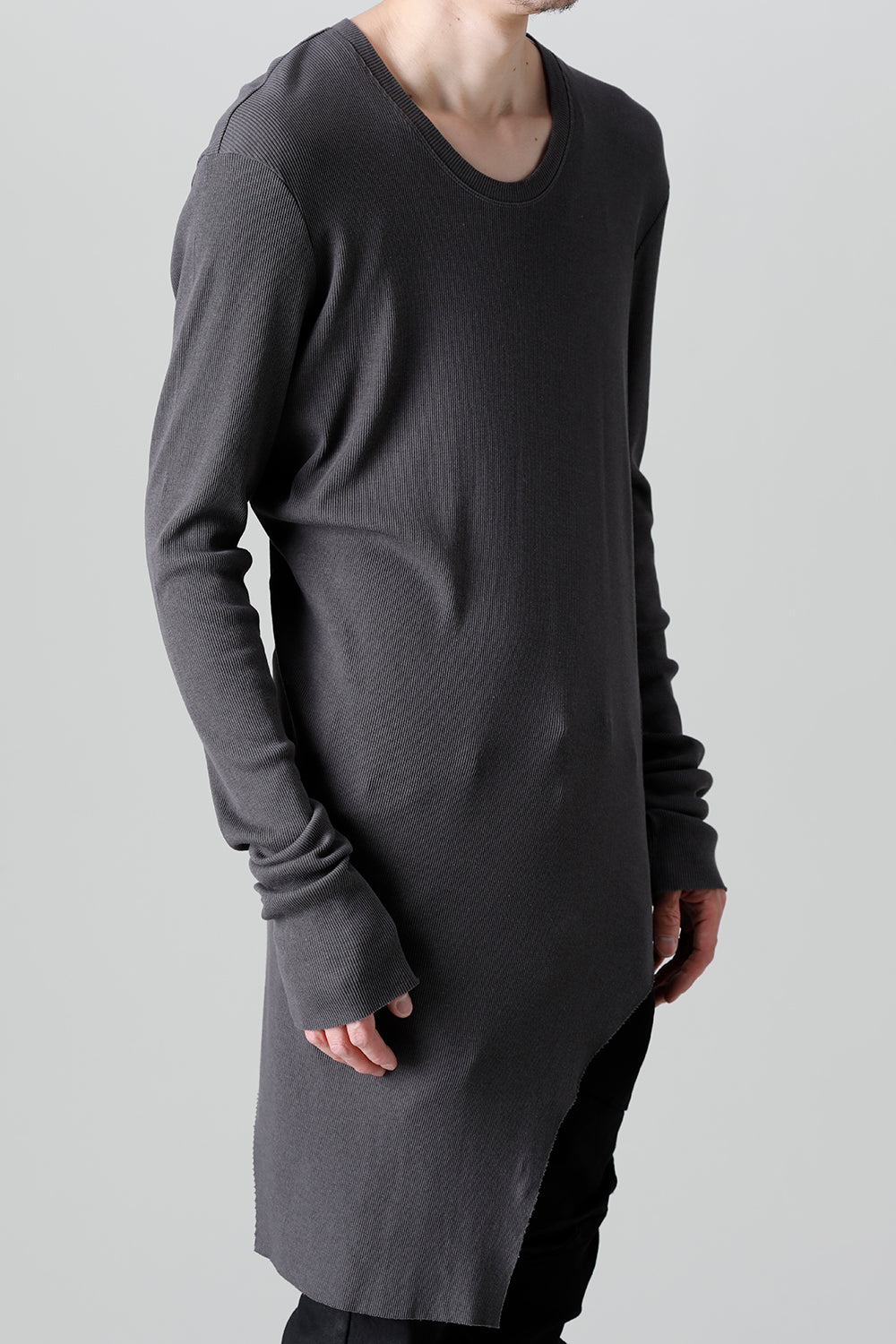右裾が長く設計されたアシンメトリーなデザインで一癖あるレイヤードをお楽しみいただけます。