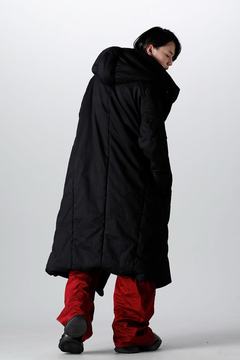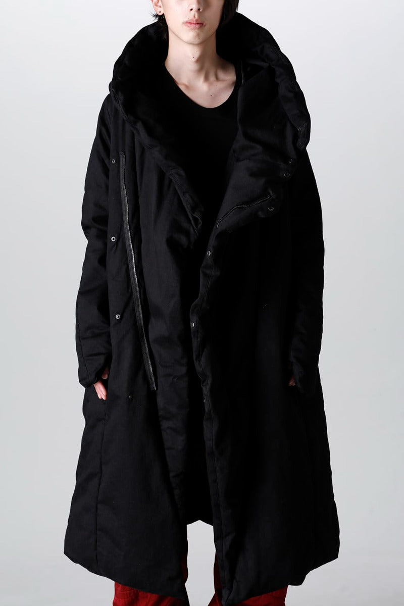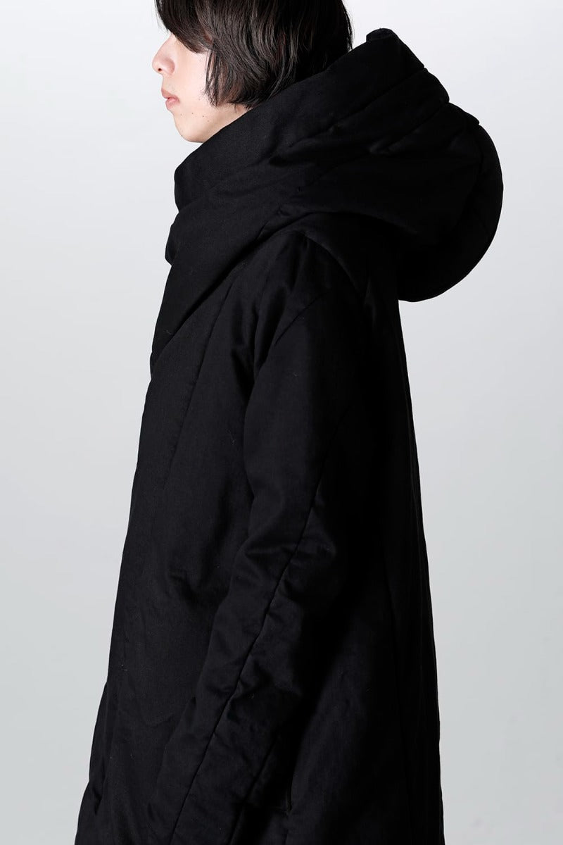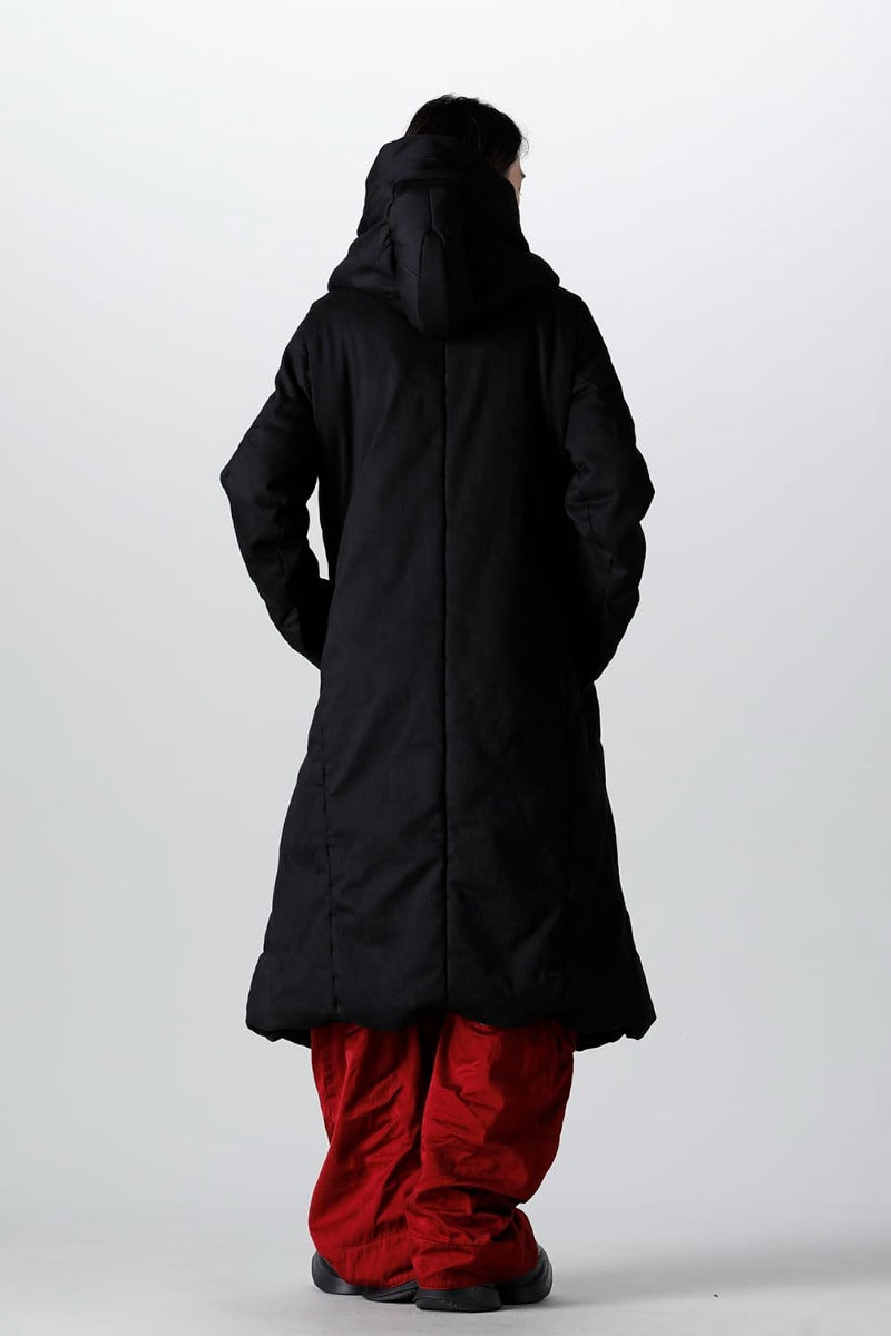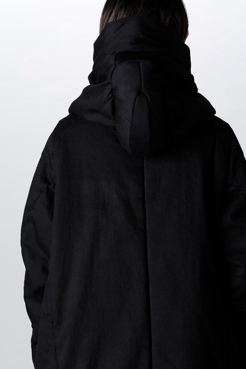 JULIUS 23-24FWのコレクションテーマ [ elytra; ] - エリトラのコレクションピースの1つになるロング丈のコート。 フーディーのトップにはシェルパーツが配備やシームのデザインが随所に施されており、モード感のある1着に仕上がっています。 袖口も手の甲が隠れるパターンになっています。 また、全体的にしっかりと中綿が入っており、冬場でも暖かく着用していただけます。