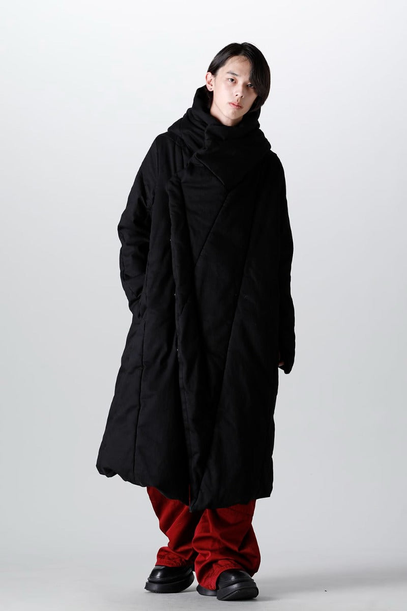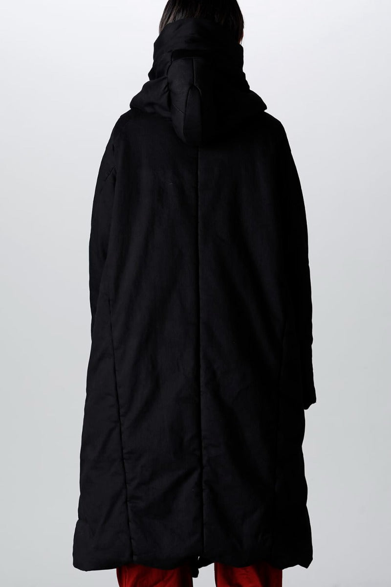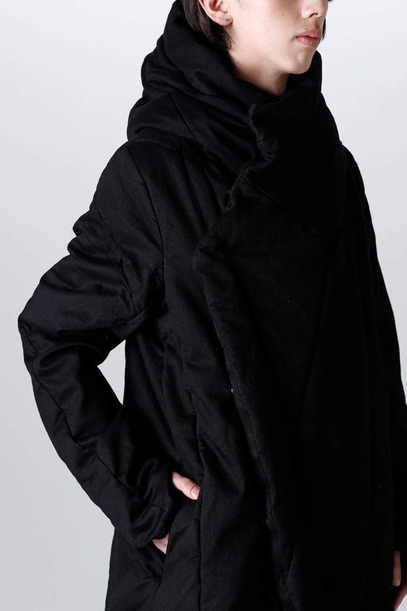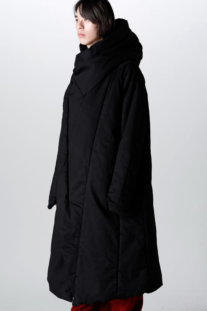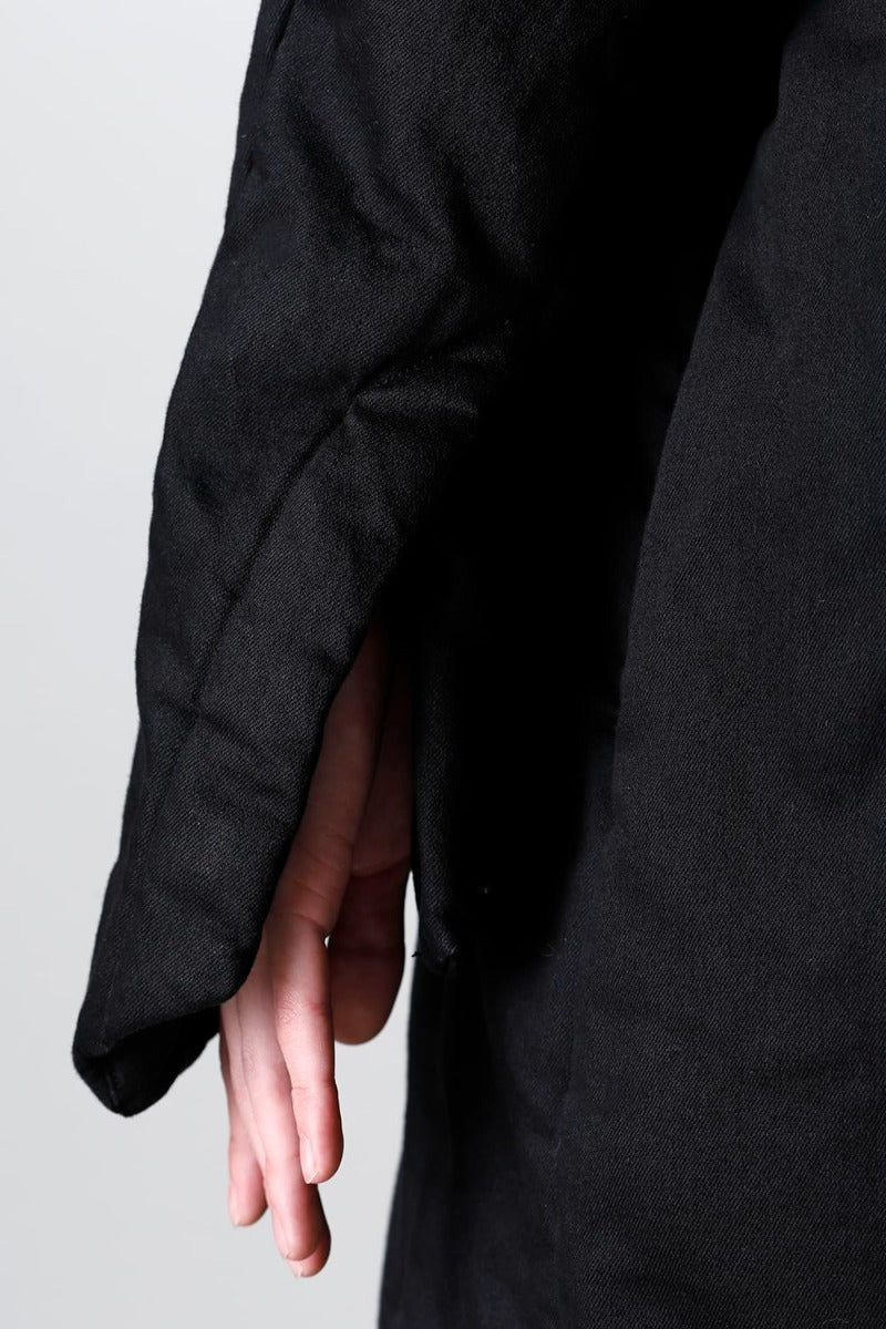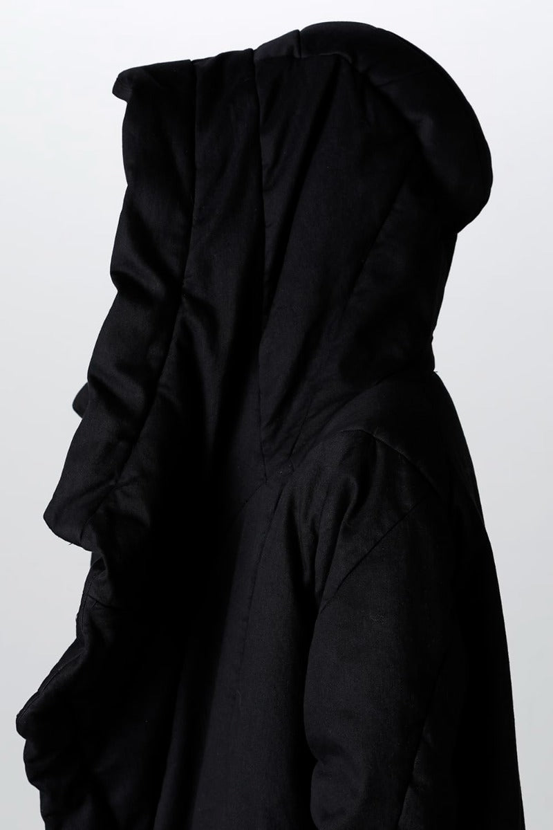 JULIUS 23-24FWのコレクションテーマ [ elytra; ] - エリトラのコレクションピースの1つになるロング丈のコート。 フーディーのトップにはシェルパーツが配備やシームのデザインが随所に施されており、モード感のある1着に仕上がっています。 袖口も手の甲が隠れるパターンになっています。 また、全体的にしっかりと中綿が入っており、冬場でも暖かく着用していただけます。