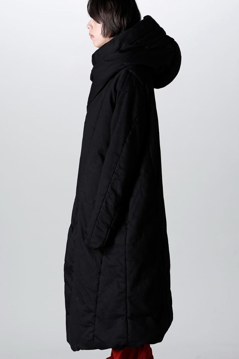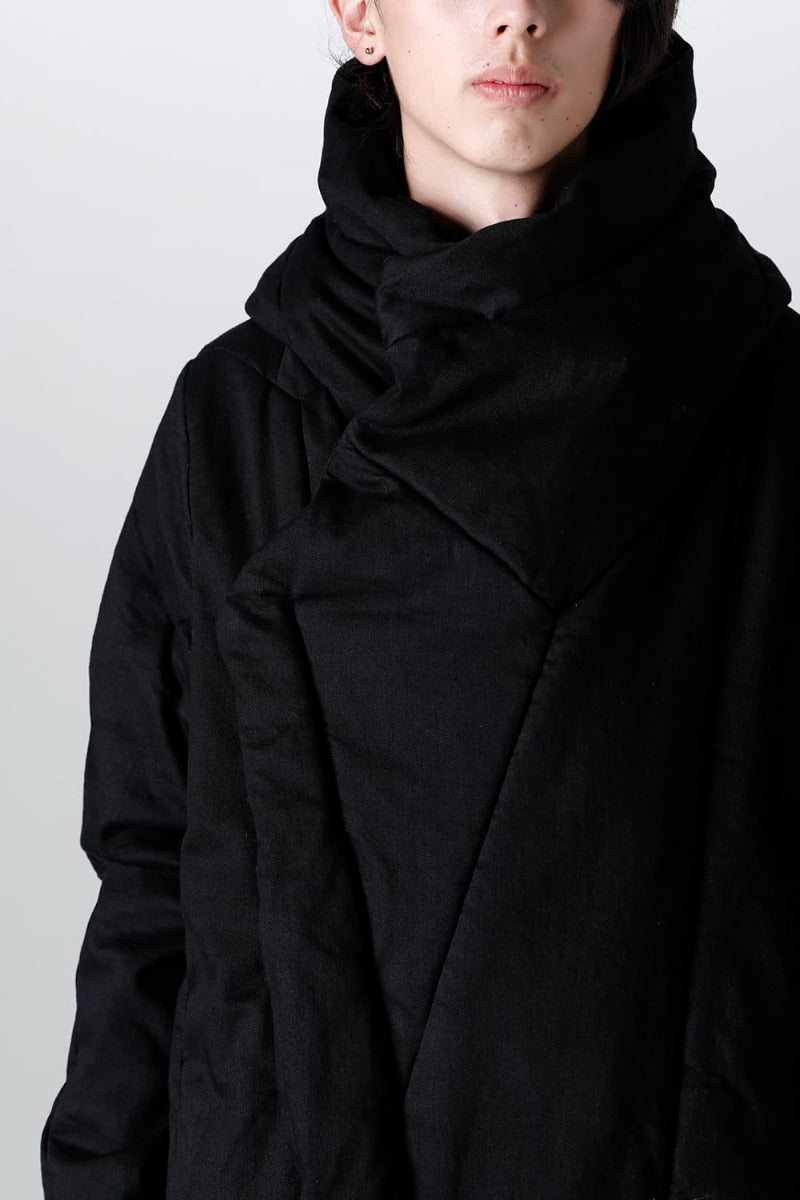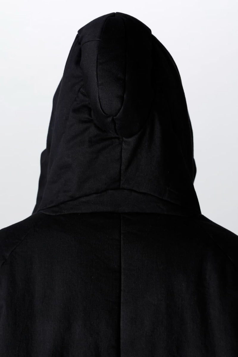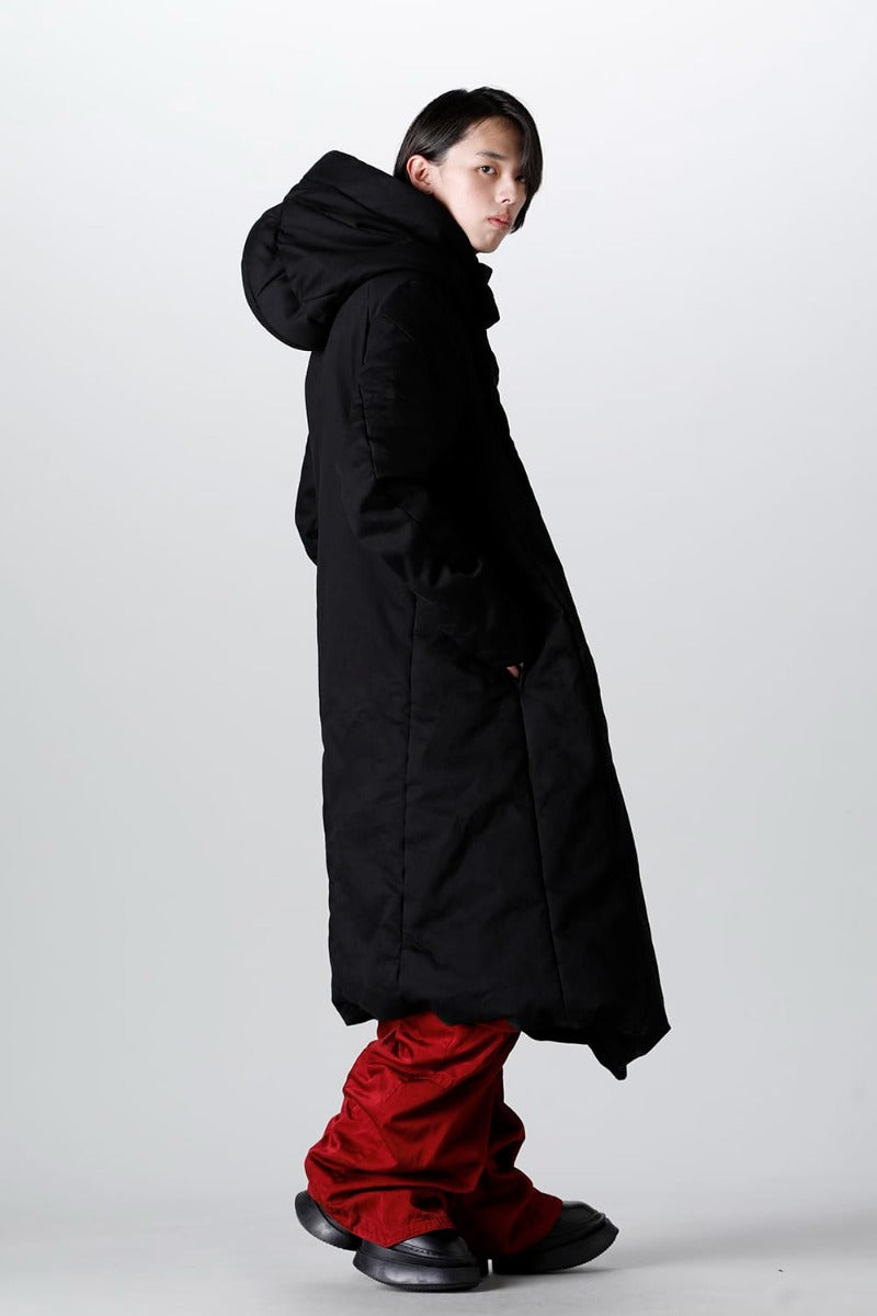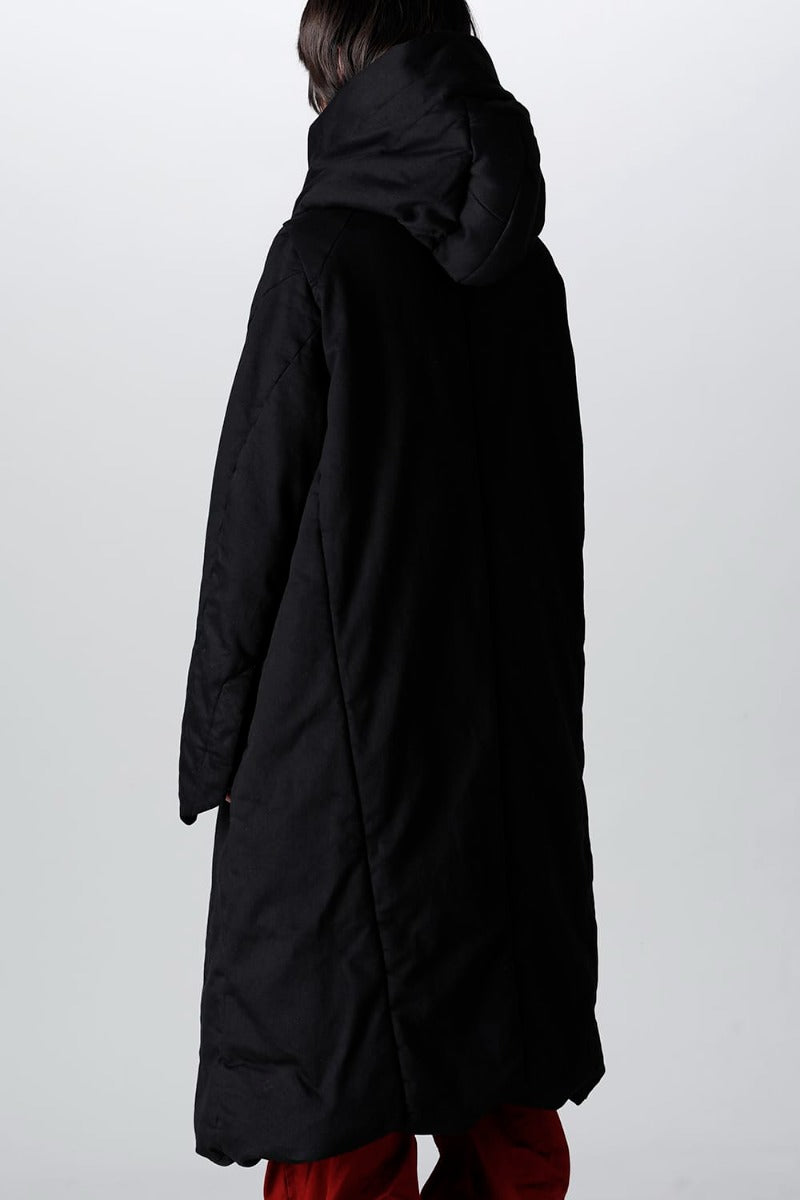 JULIUS 23-24FWのコレクションテーマ [ elytra; ] - エリトラのコレクションピースの1つになるロング丈のコート。 フーディーのトップにはシェルパーツが配備やシームのデザインが随所に施されており、モード感のある1着に仕上がっています。 袖口も手の甲が隠れるパターンになっています。 また、全体的にしっかりと中綿が入っており、冬場でも暖かく着用していただけます。
