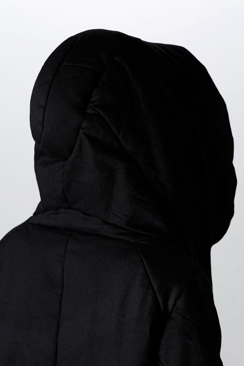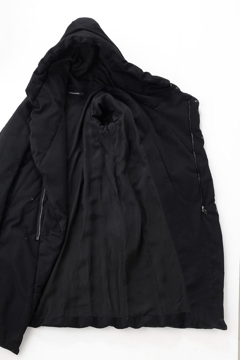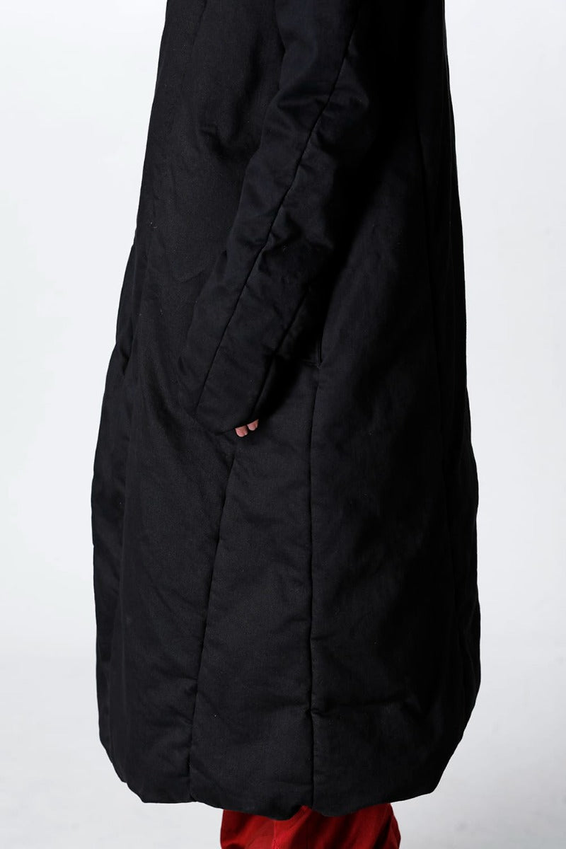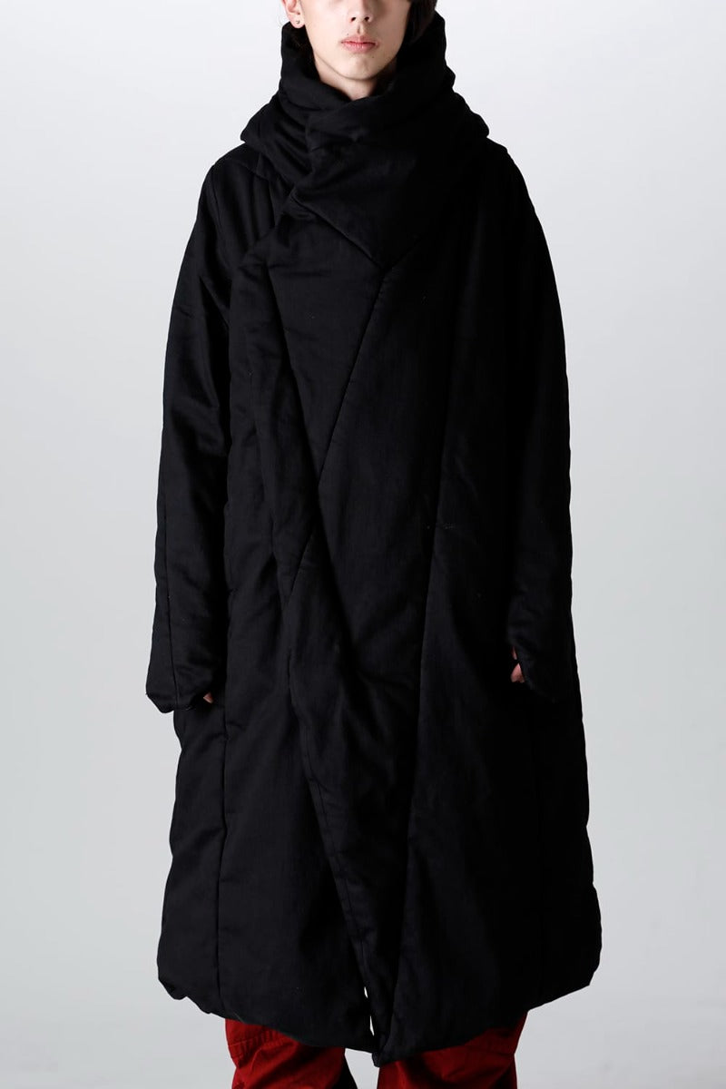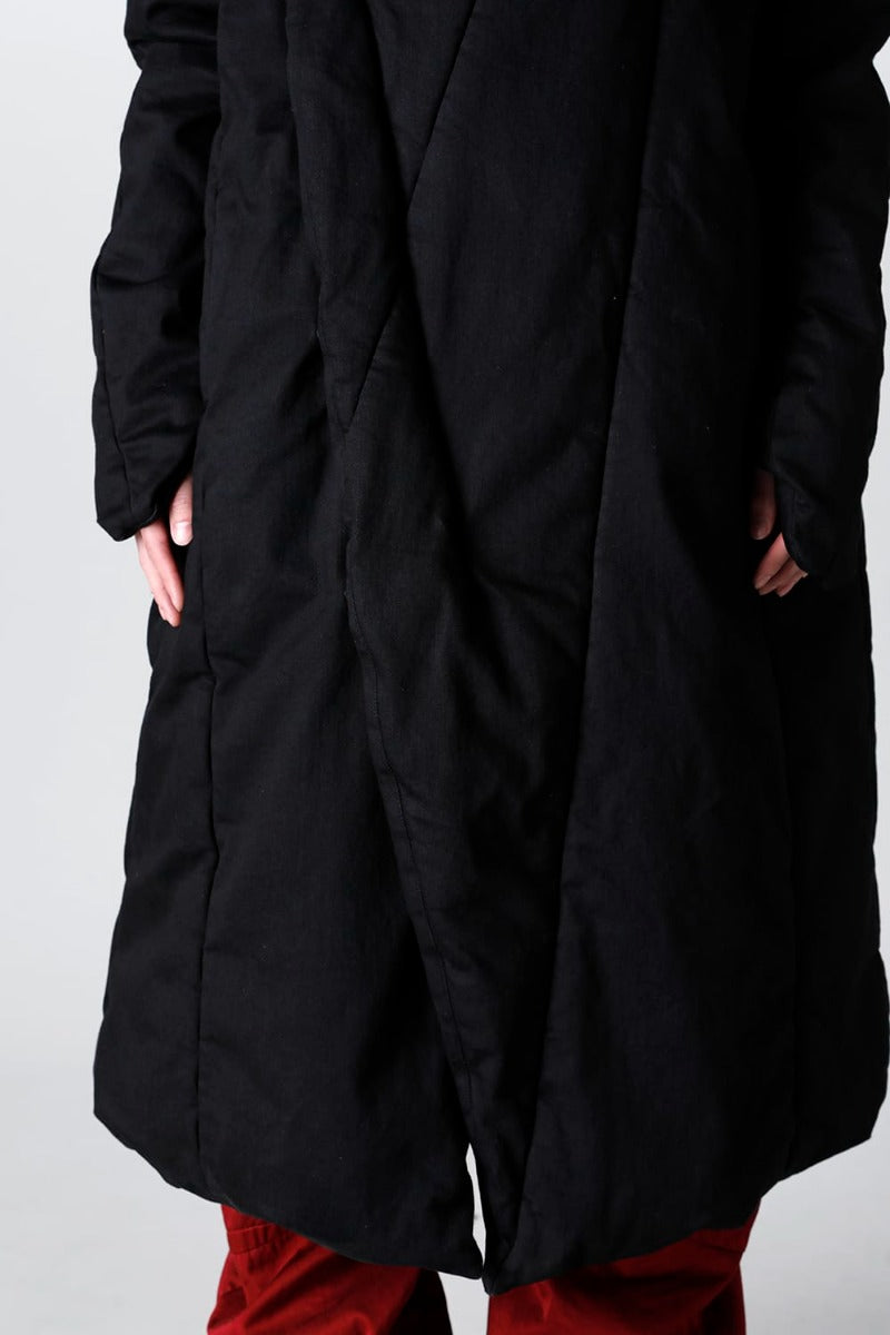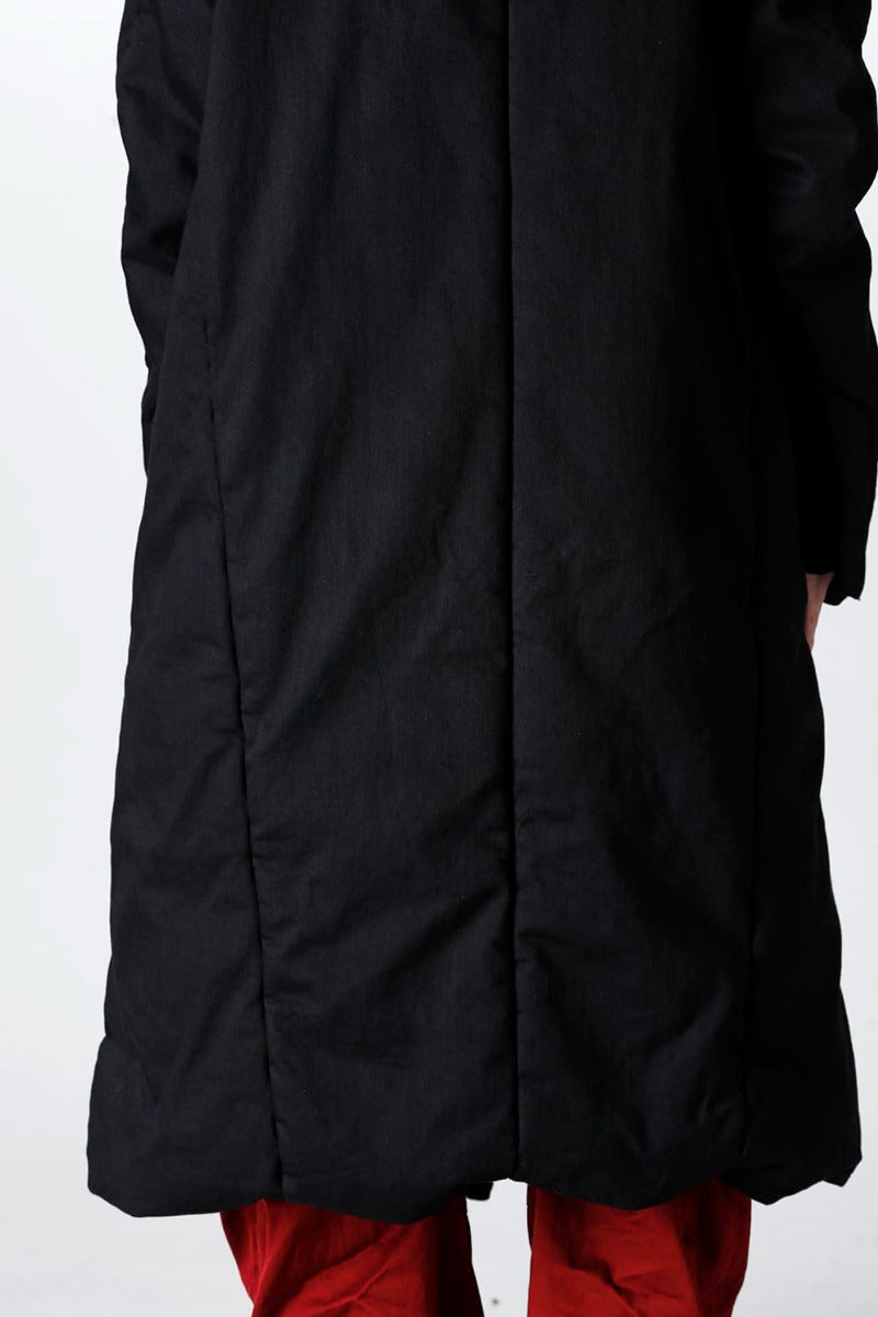 JULIUS 23-24FWのコレクションテーマ [ elytra; ] - エリトラのコレクションピースの1つになるロング丈のコート。 フーディーのトップにはシェルパーツが配備やシームのデザインが随所に施されており、モード感のある1着に仕上がっています。 袖口も手の甲が隠れるパターンになっています。 また、全体的にしっかりと中綿が入っており、冬場でも暖かく着用していただけます。