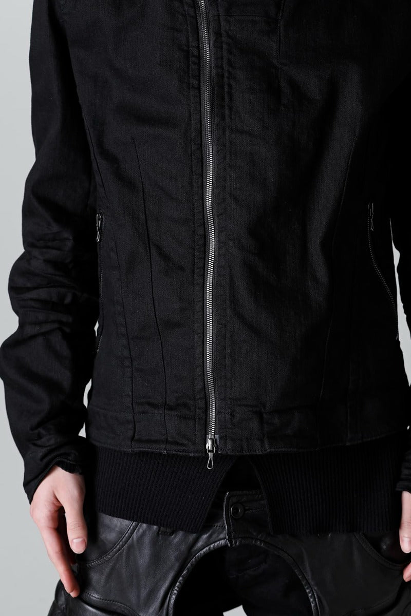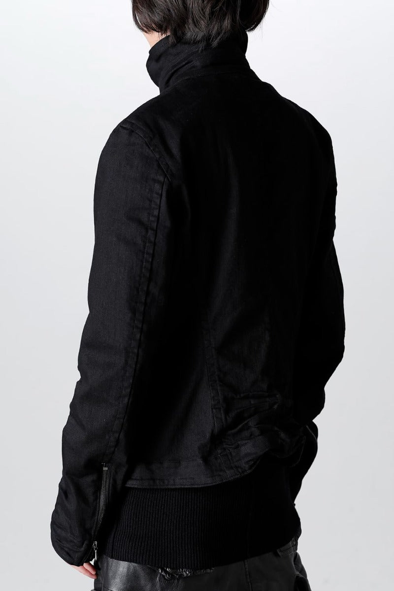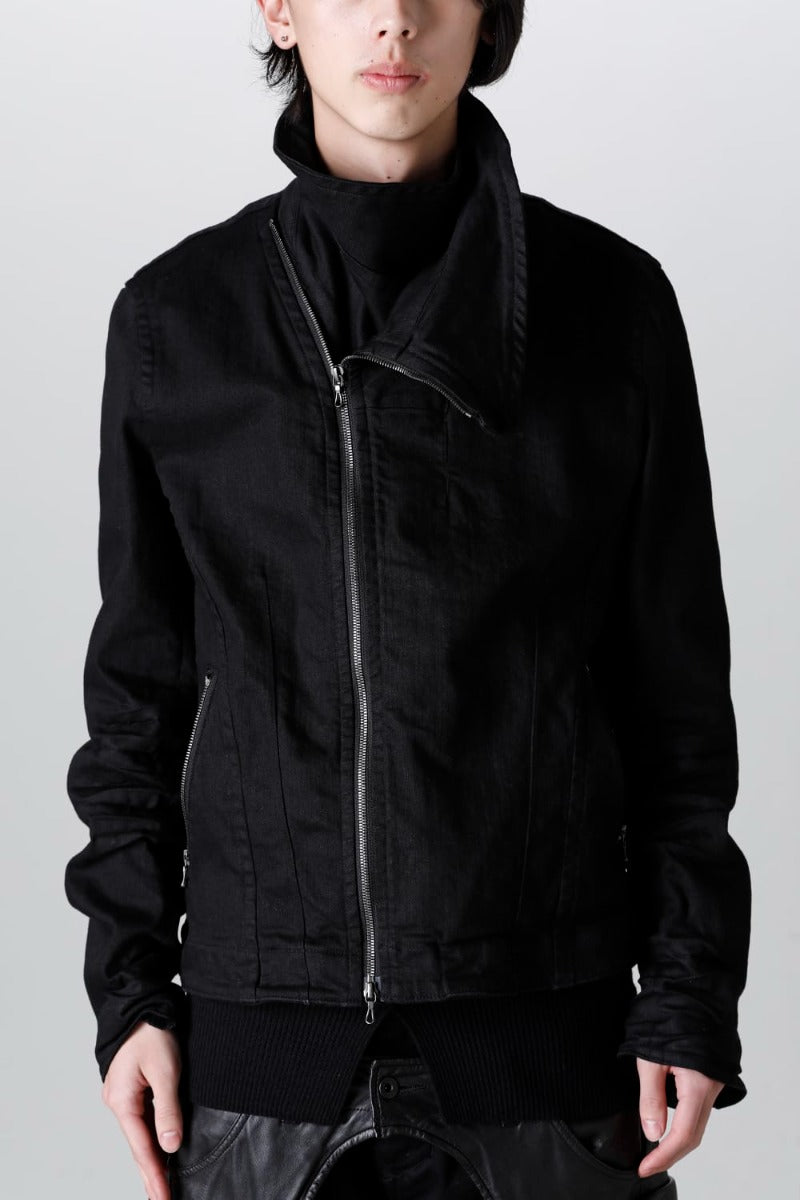 JULIUSのパーマネントシリーズよりジャットネックWジャケットが復刻。 首に巻きつくようなオリジナルパターンで仕上げたハイネック仕様のジェットネックが特徴の作品です。 斜めに走らせたフロントファスナーを開くと襟のように変化してくれるパターン構成。 ストレッチ性の高いブラックデニムを採用しストレスフリーで着用できる仕上がりになっています。