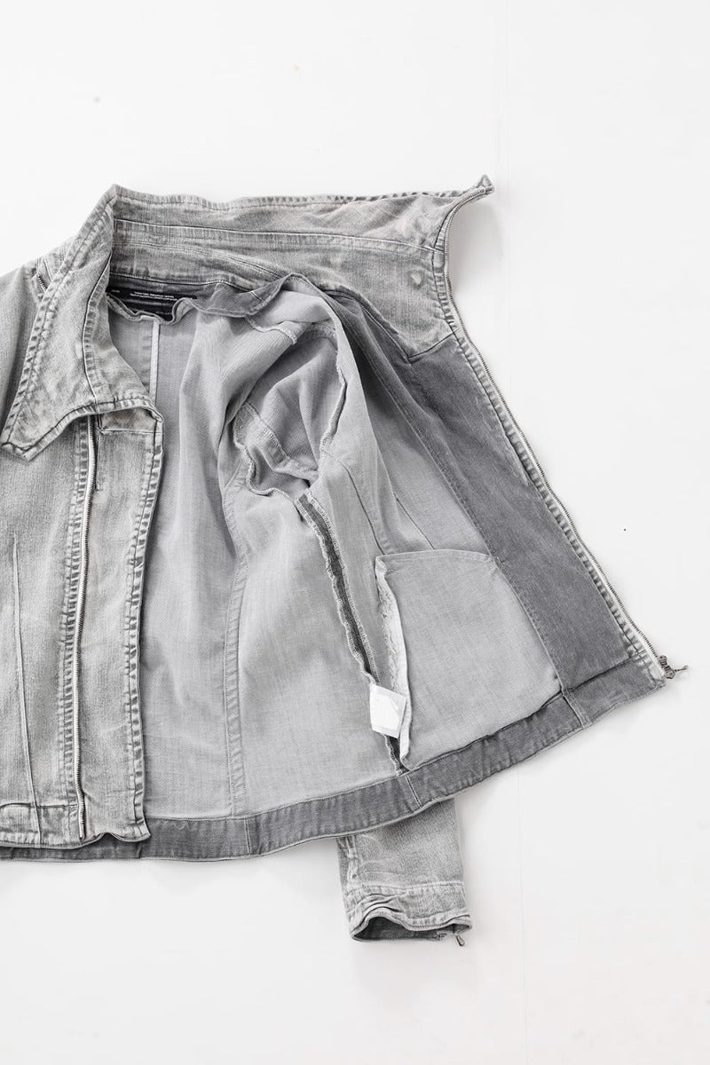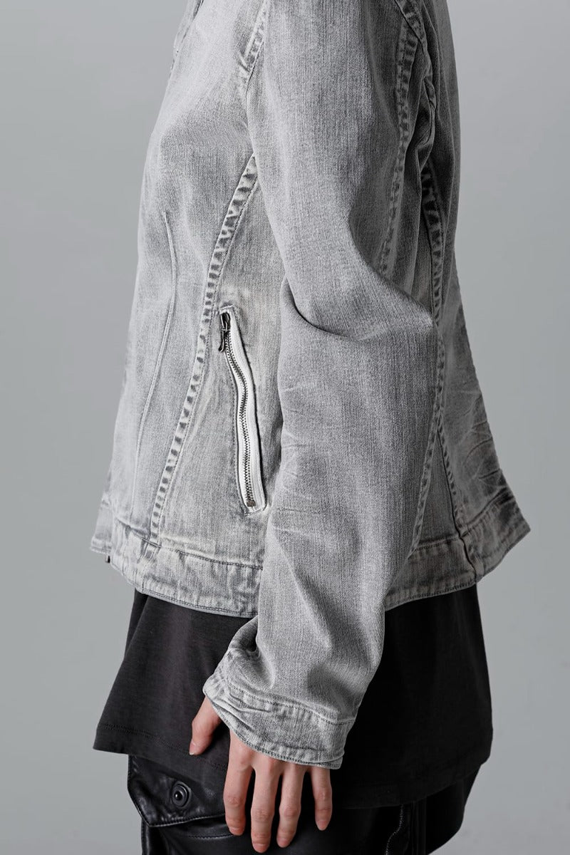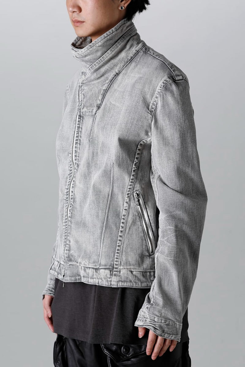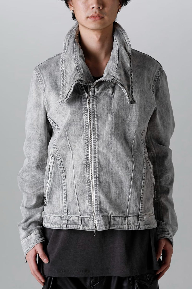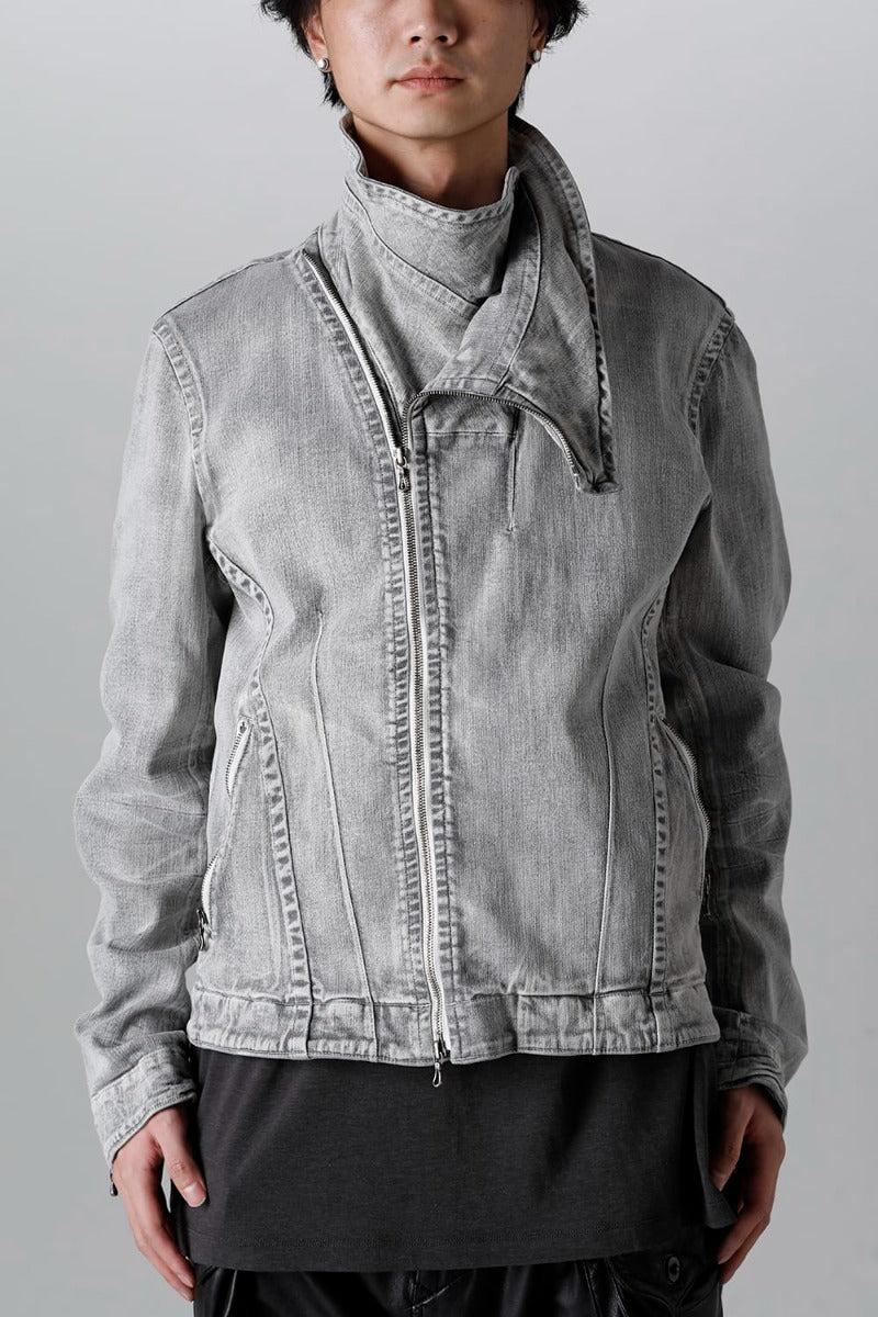 JULIUSのパーマネントシリーズよりジャットネックWジャケットが復刻。 首に巻きつくようなオリジナルパターンで仕上げたハイネック仕様のジェットネックが特徴の作品です。 斜めに走らせたフロントファスナーを開くと襟のように変化してくれるパターン構成。 ストレッチ性の高いデニムでストレスフリーに着用できる仕上がりになっています。 プラスターカラーはブラックデニムをブリーチ加工を施し脱色を行っています。