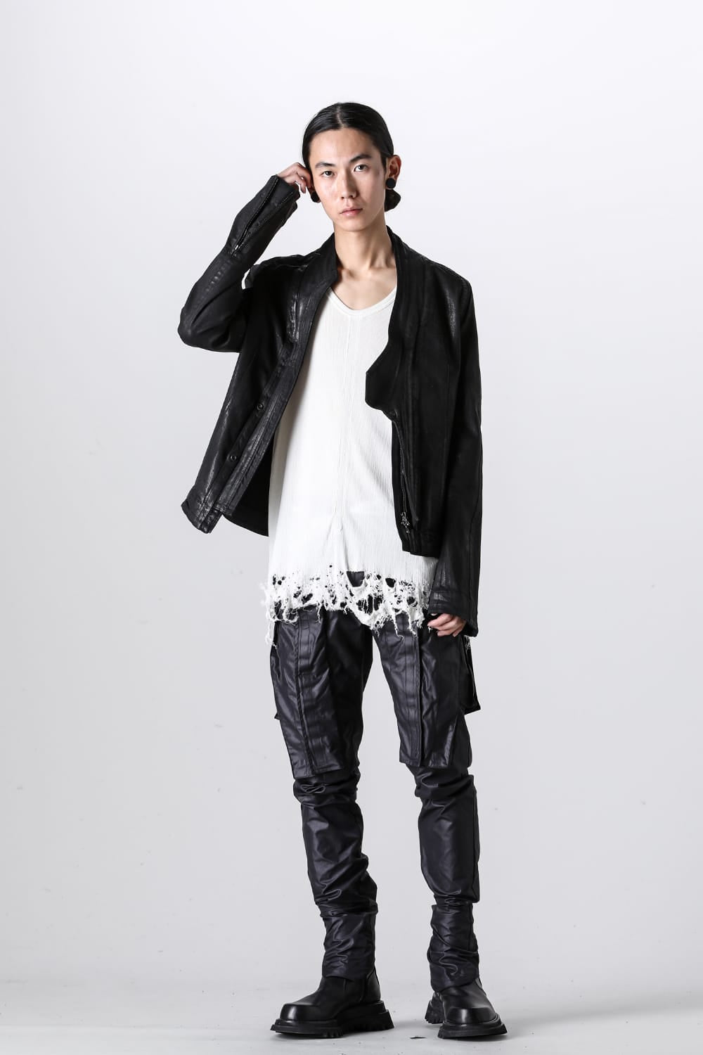 両サイドの袖先にはジッパーを配備し、ライダースのような男らしいデザインを採用しています。