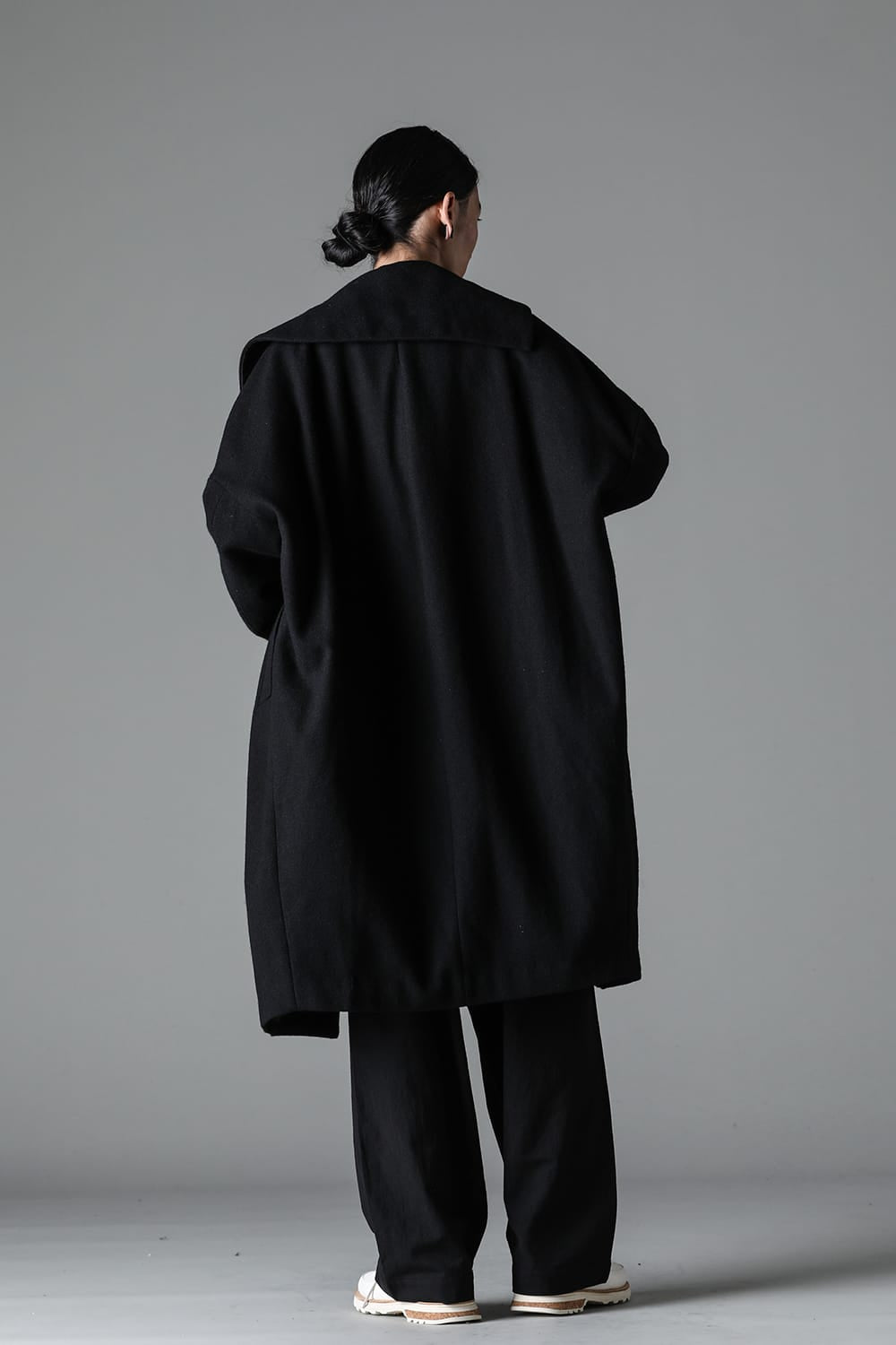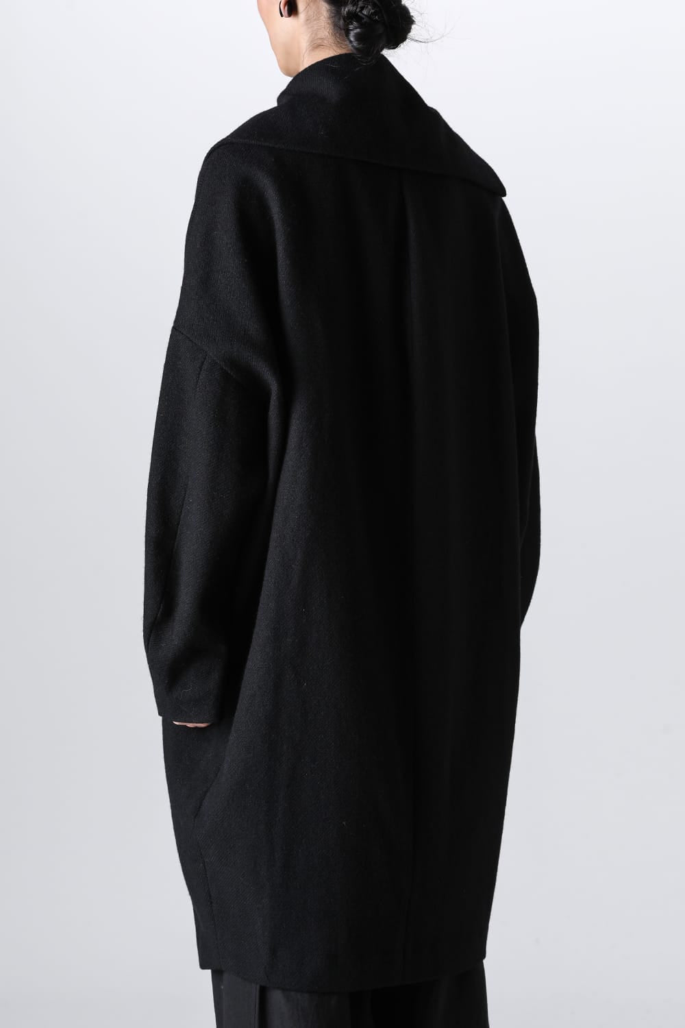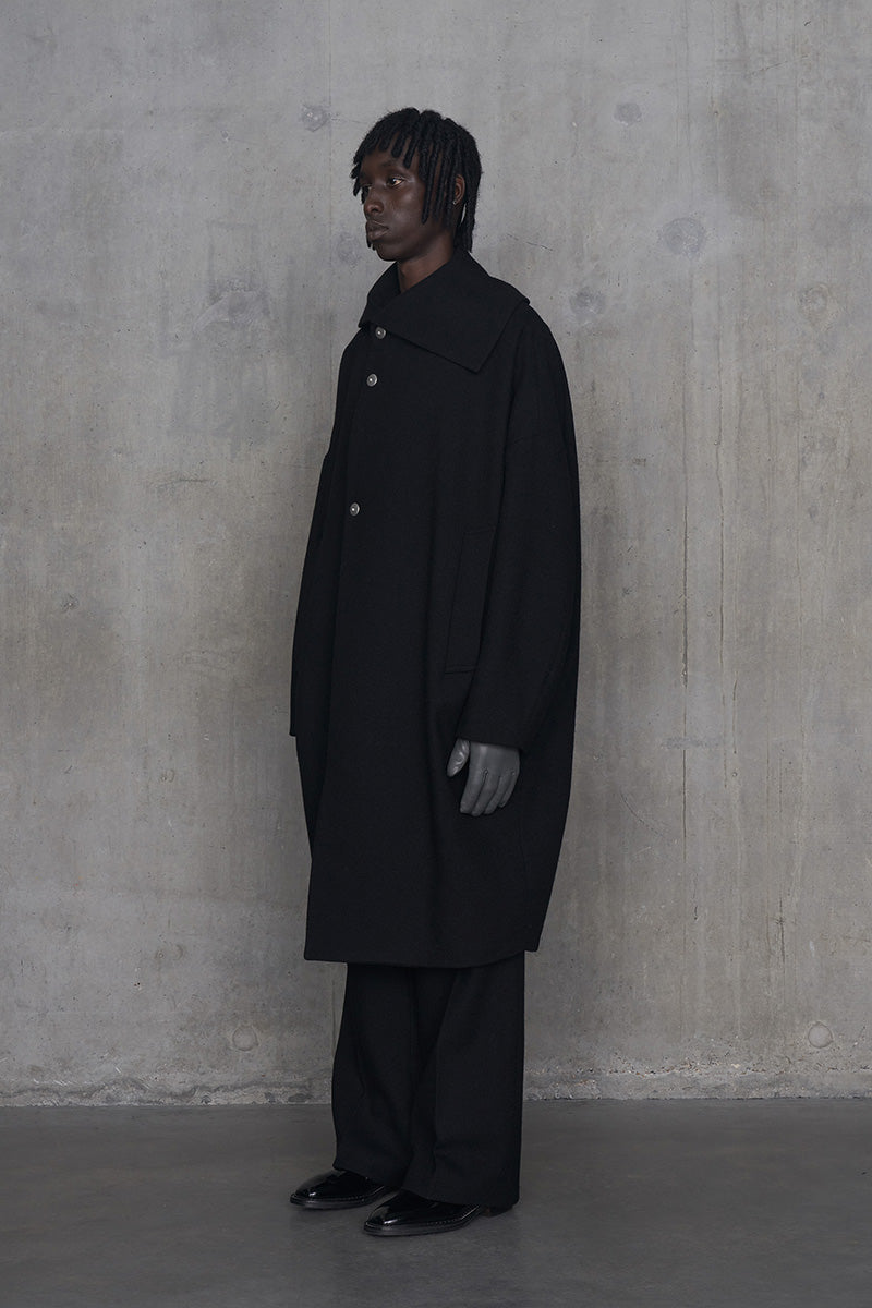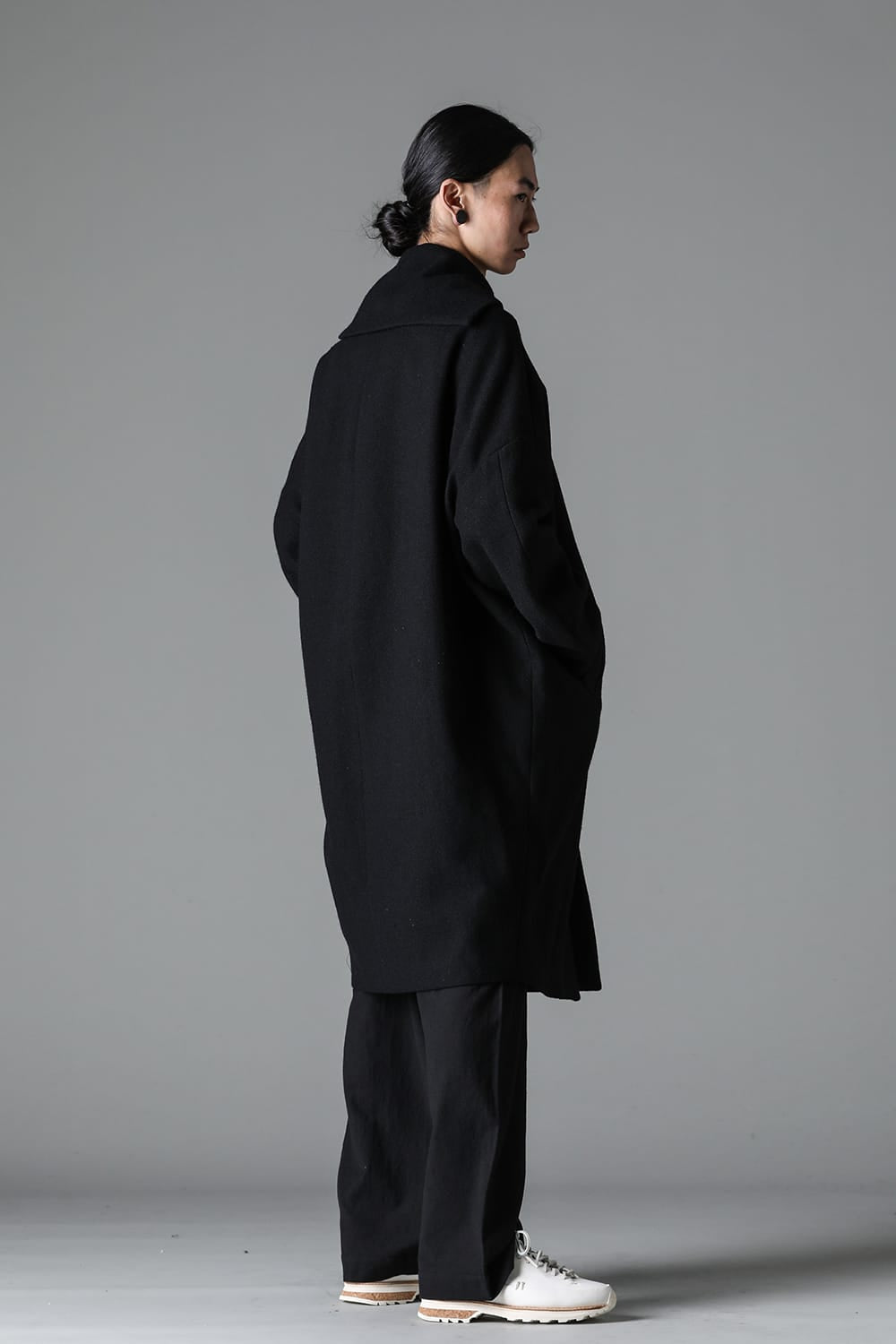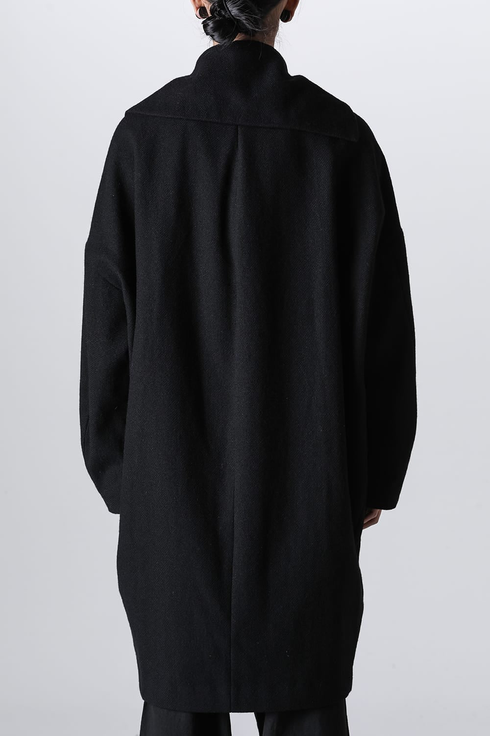 脱脂加工を施すことでドライタッチな風合いを作り出したドライウールツイルを使用したコクーンシルエットコート。