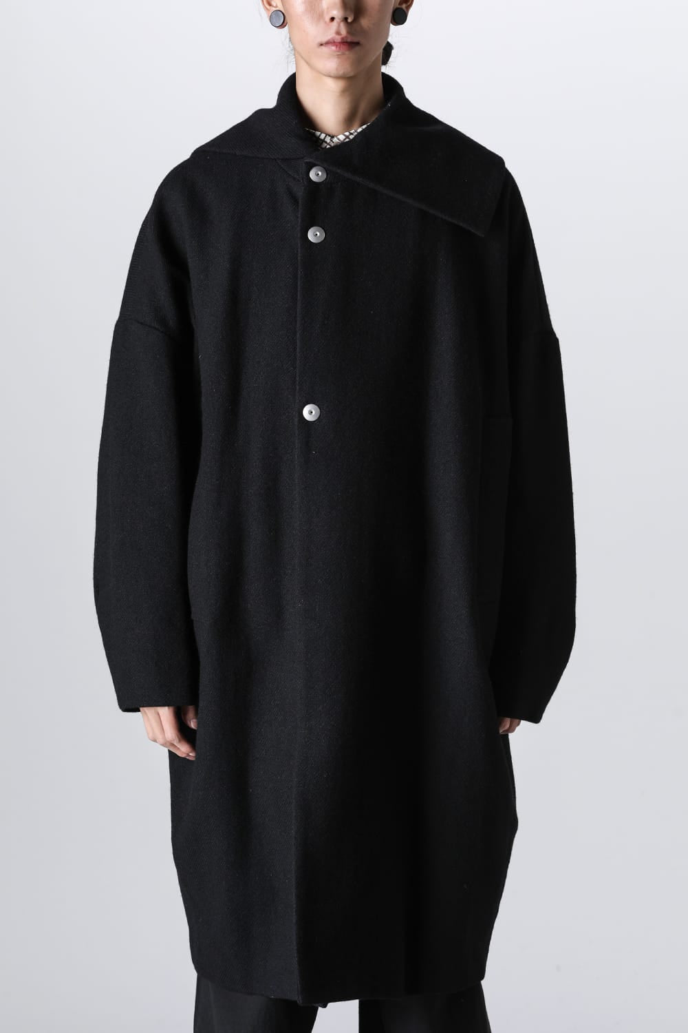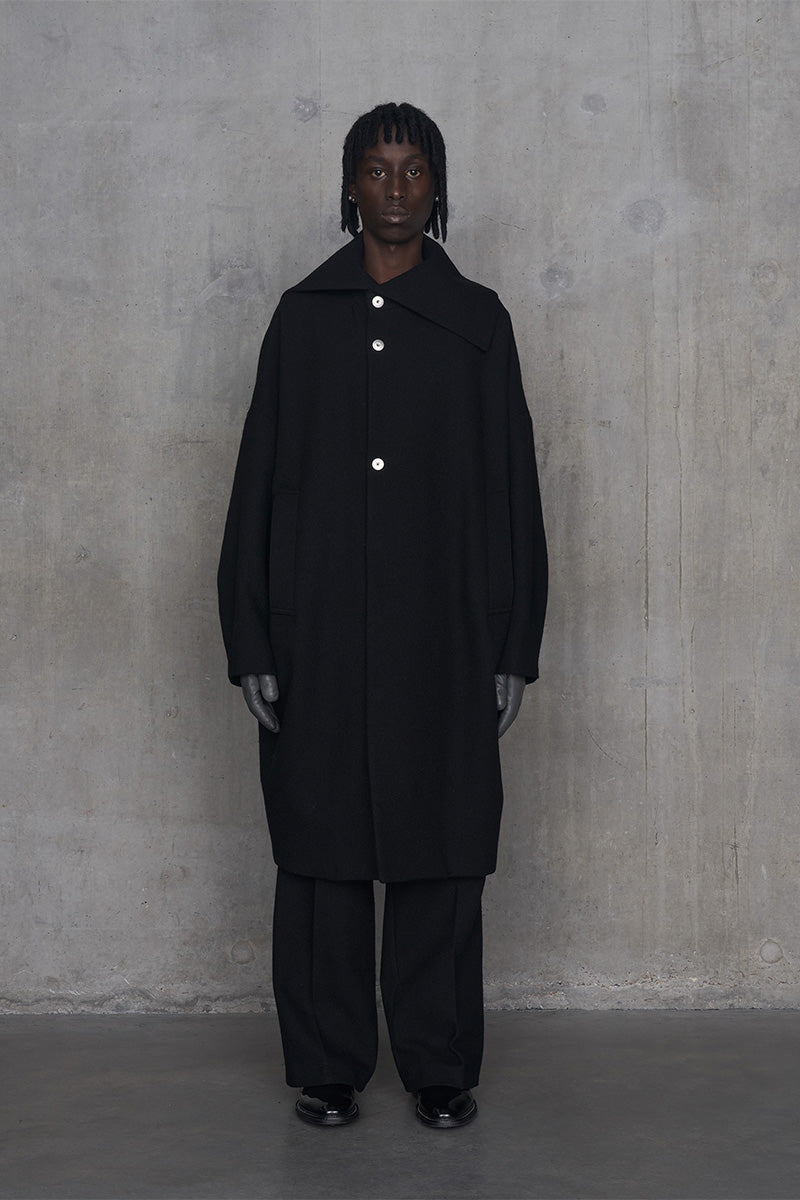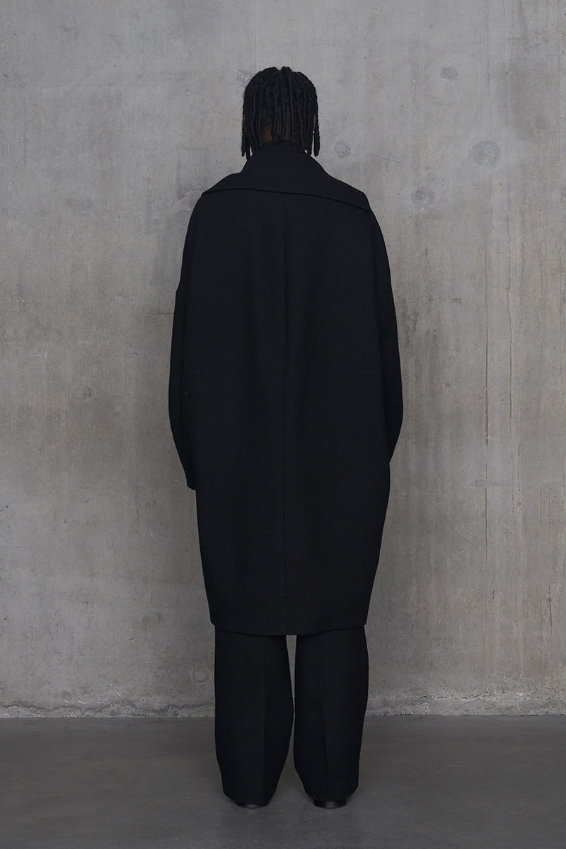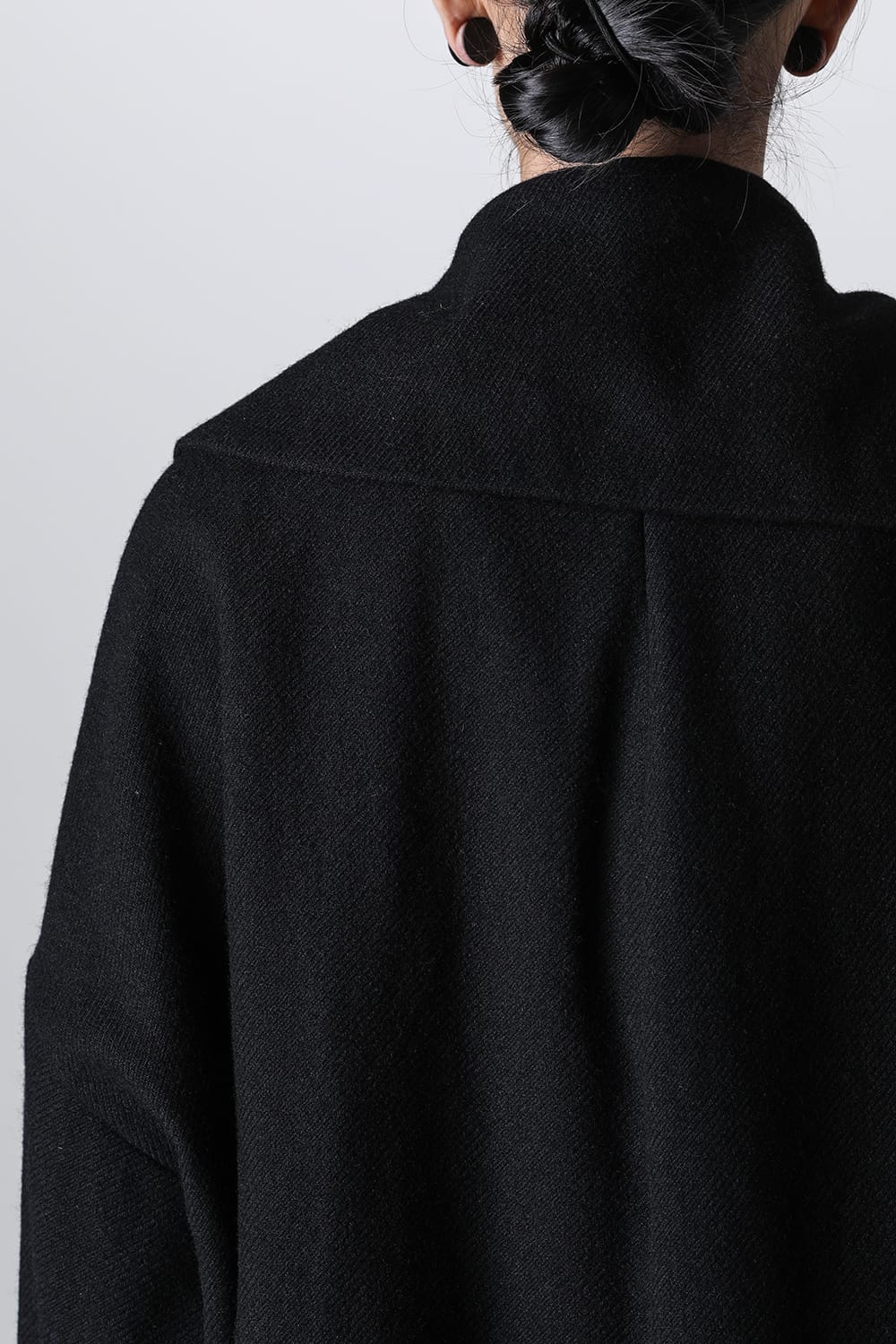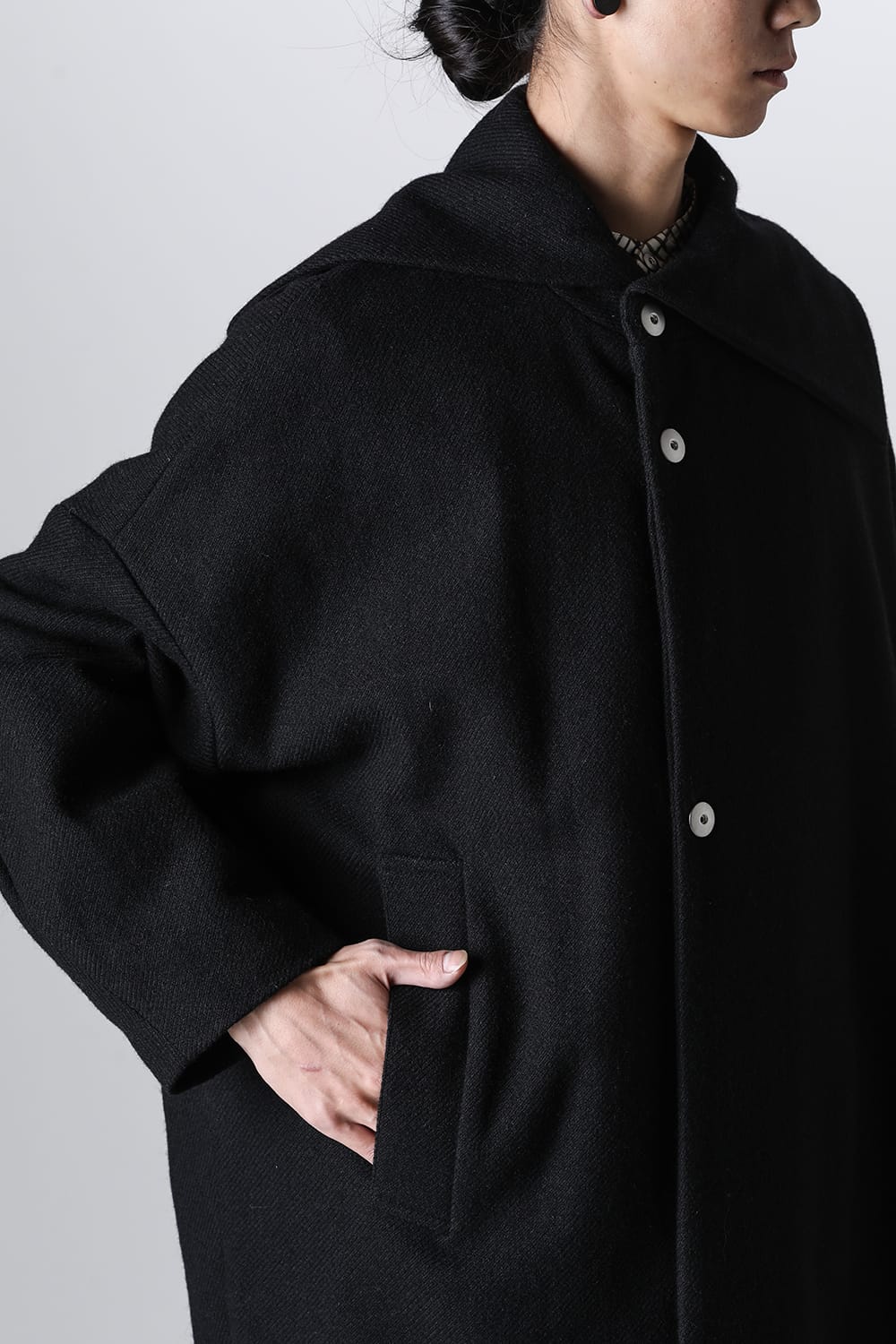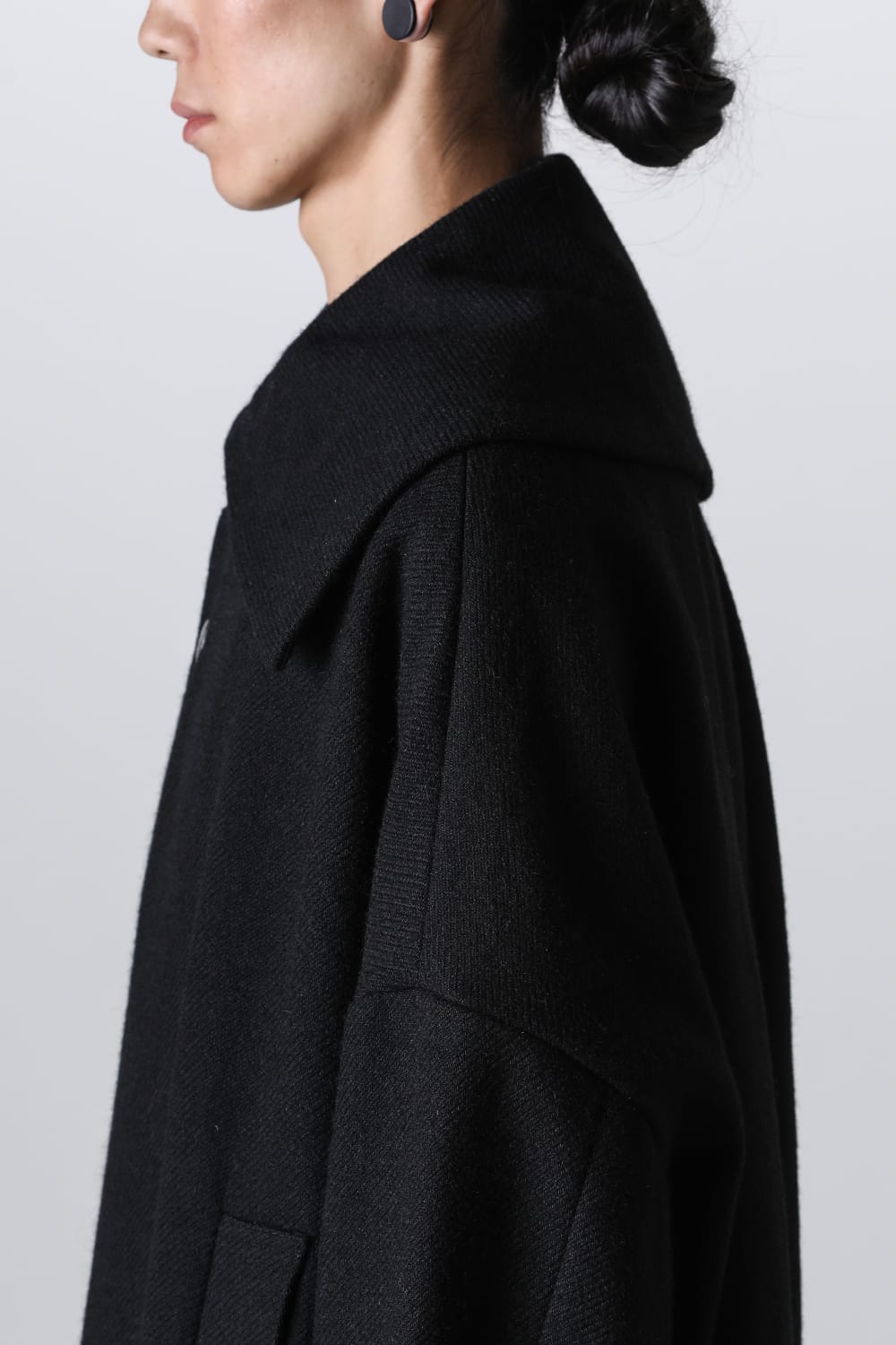 脱脂加工を施すことでドライタッチな風合いを作り出したドライウールツイルを使用したコクーンシルエットコート。