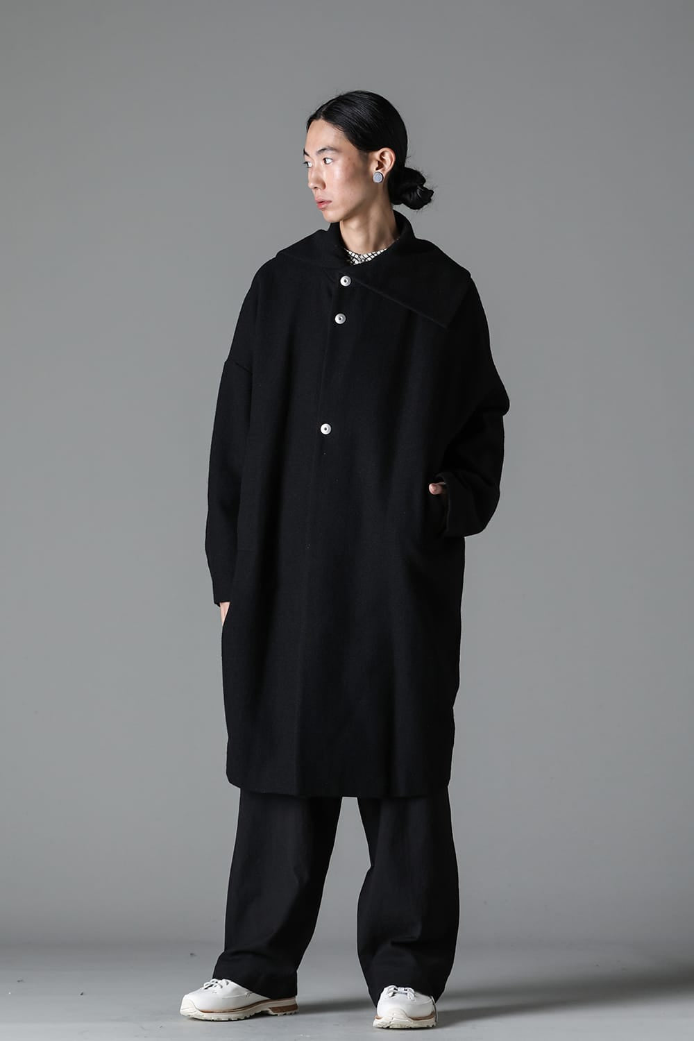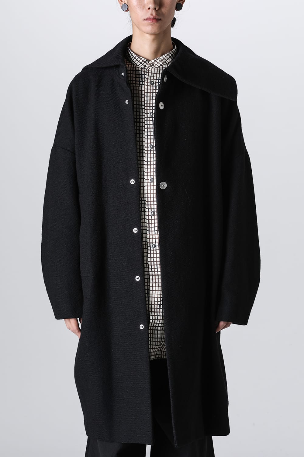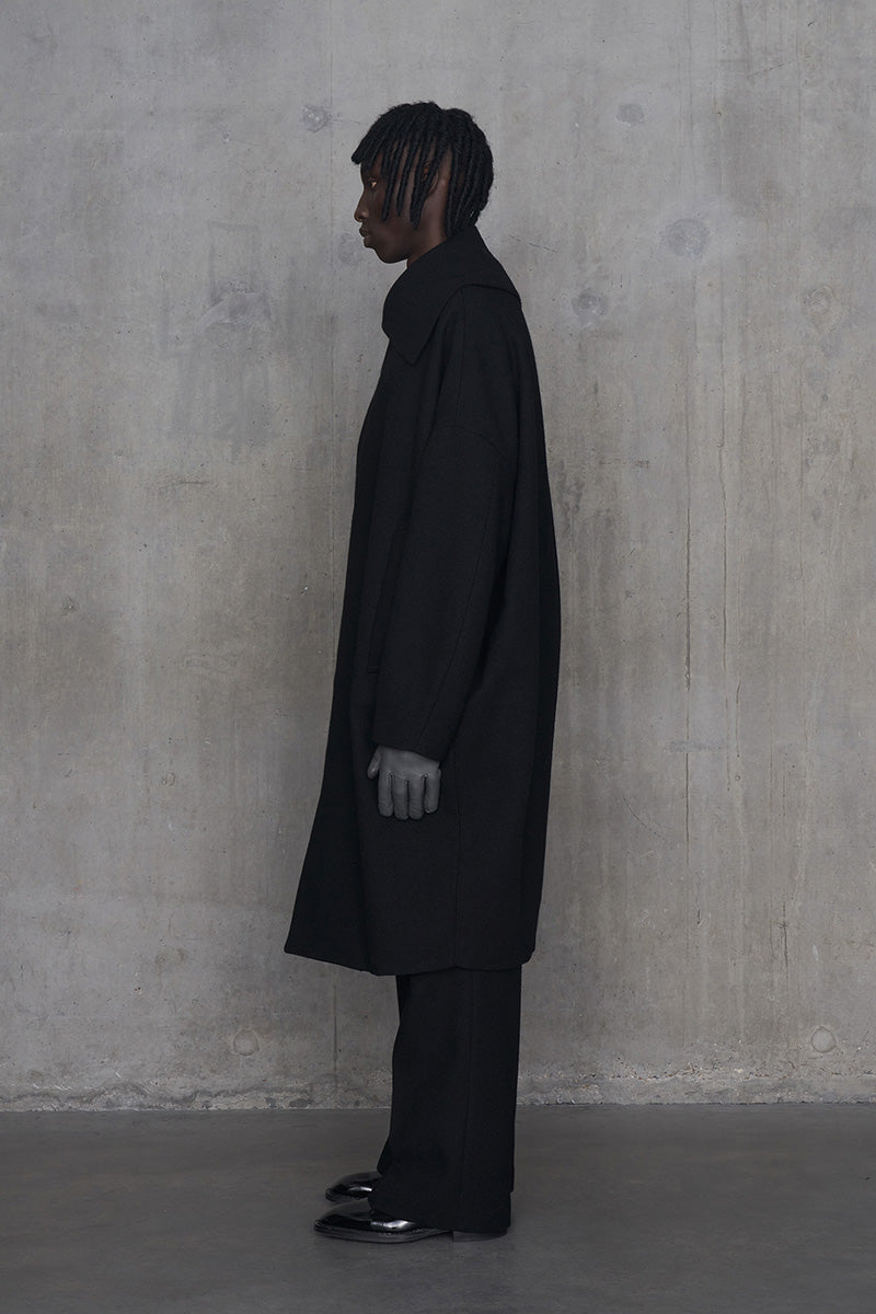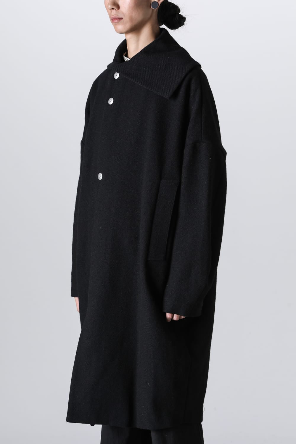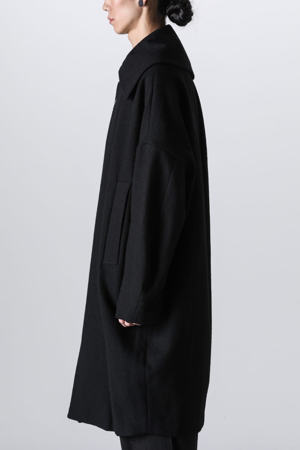 脱脂加工を施すことでドライタッチな風合いを作り出したドライウールツイルを使用したコクーンシルエットコート。