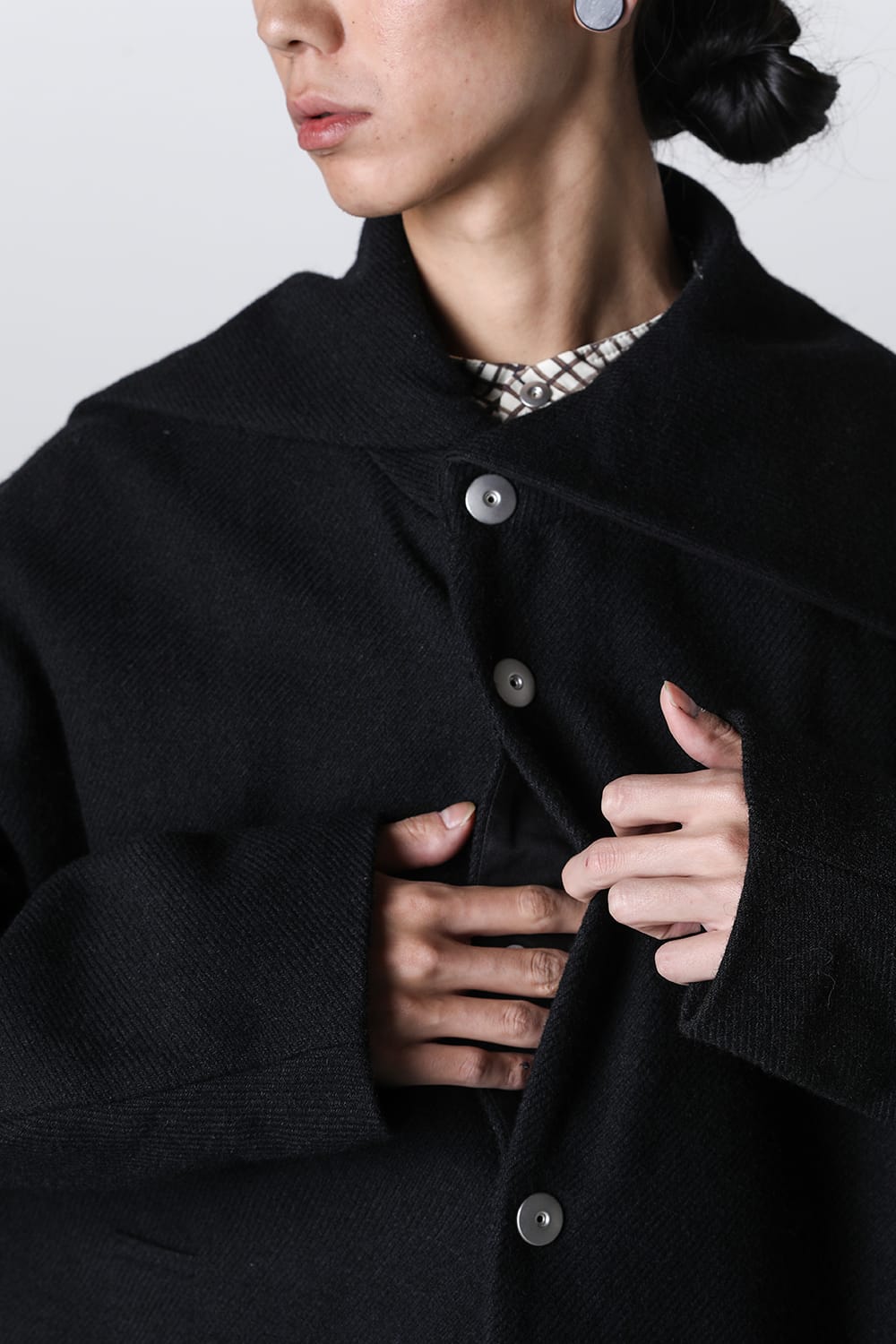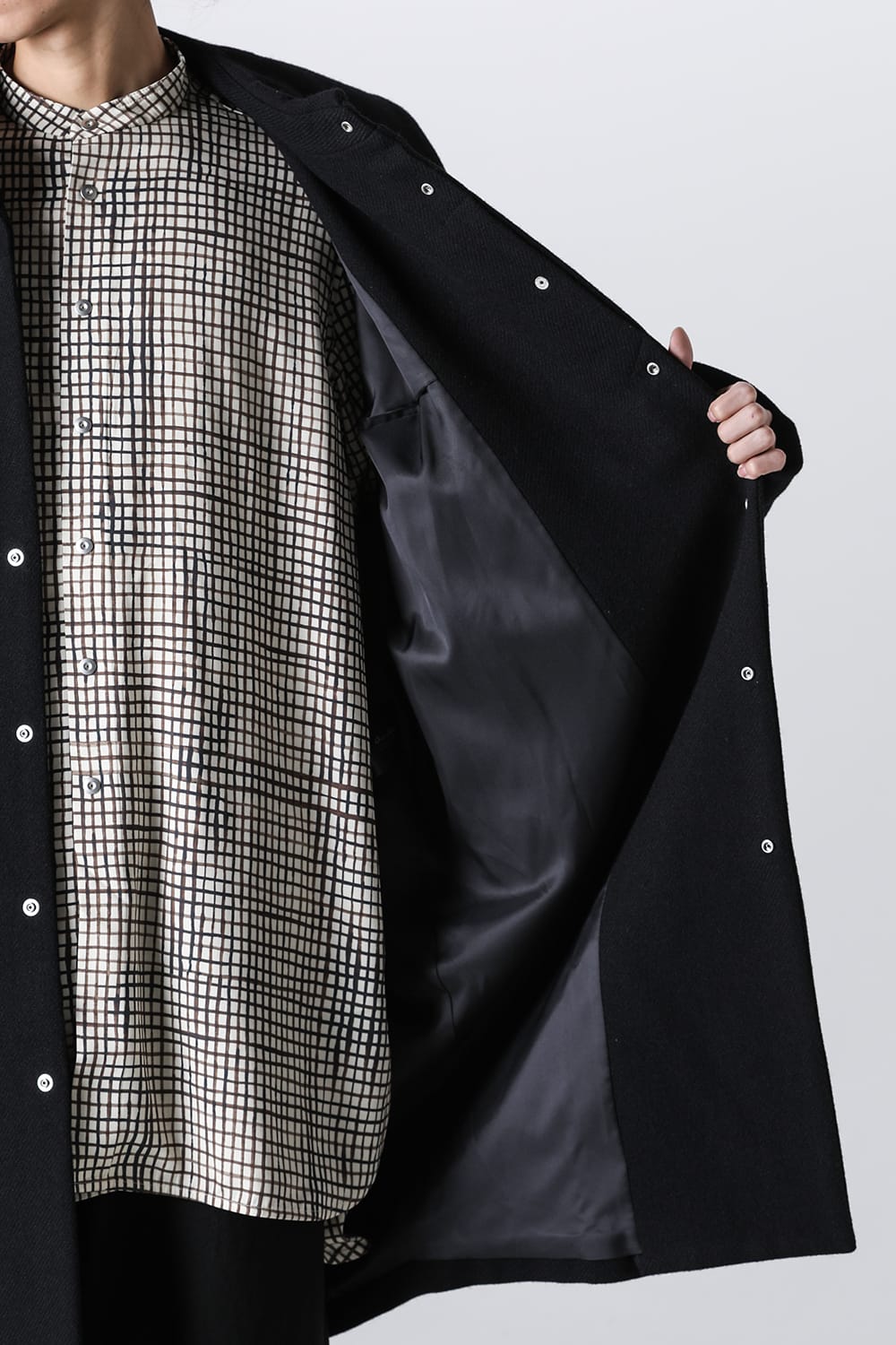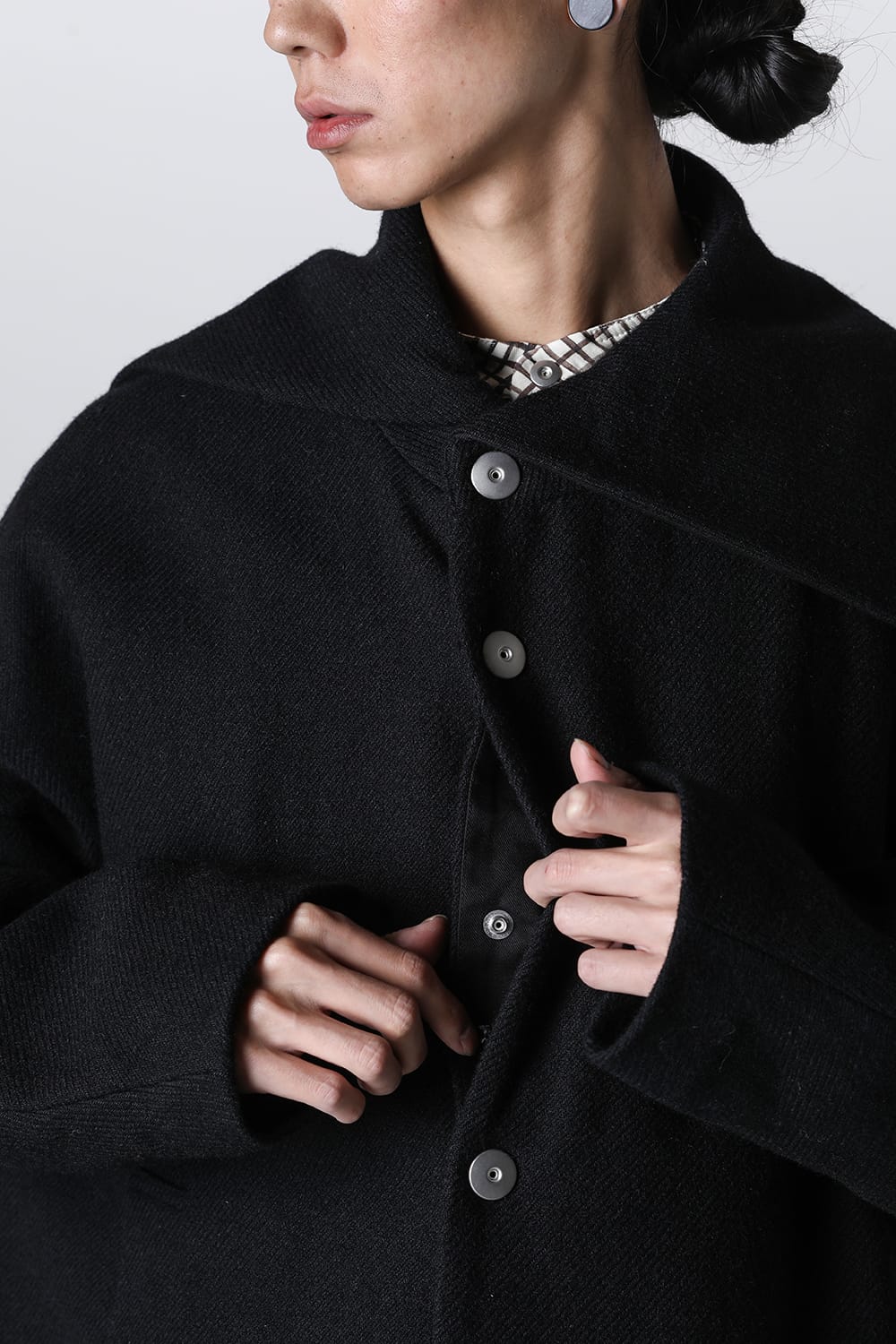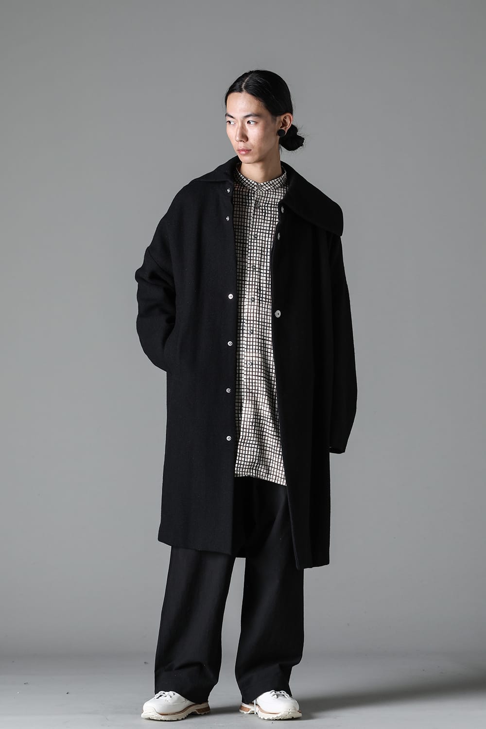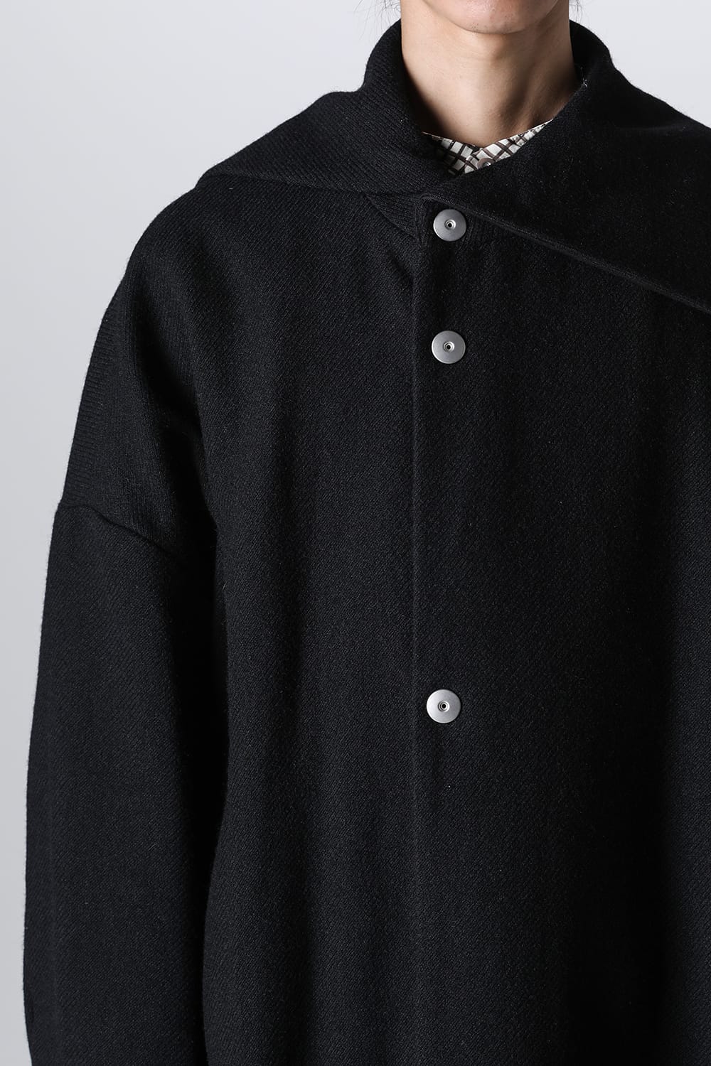脱脂加工を施すことでドライタッチな風合いを作り出したドライウールツイルを使用したコクーンシルエットコート。