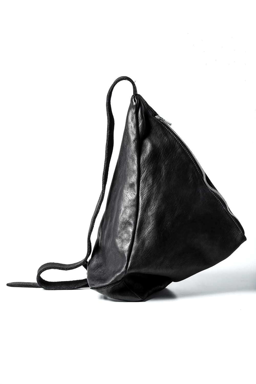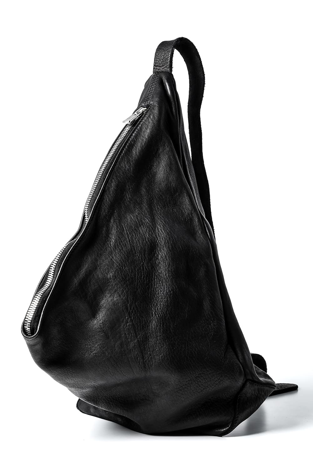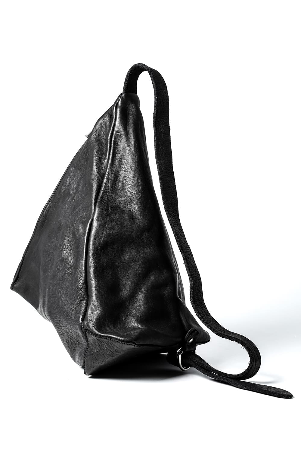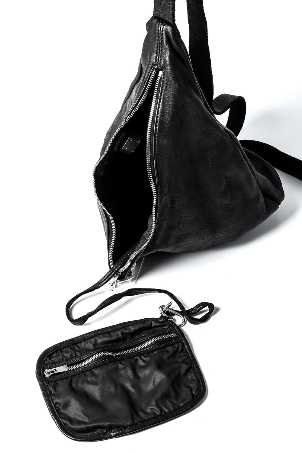 背中に当たる部分と底、ファスナーがついている表側の3つのパーツで構成された、立体的な三角形のフォルムがユニークなワンショルダーバッグ。内側にサブポケットの代わりにレザーコード付きポーチがついており、ポーチは取り外して単体で使用も可能です。横から見ると大きく見えますが、正面から見るとすっきりとした見た目になり、視覚的にもユニークですので、スタイリングのアクセントとしても有用です。レザーはヌメりのある独特の光沢と荒々しさを感じるアタリが特徴のホースレザーです。