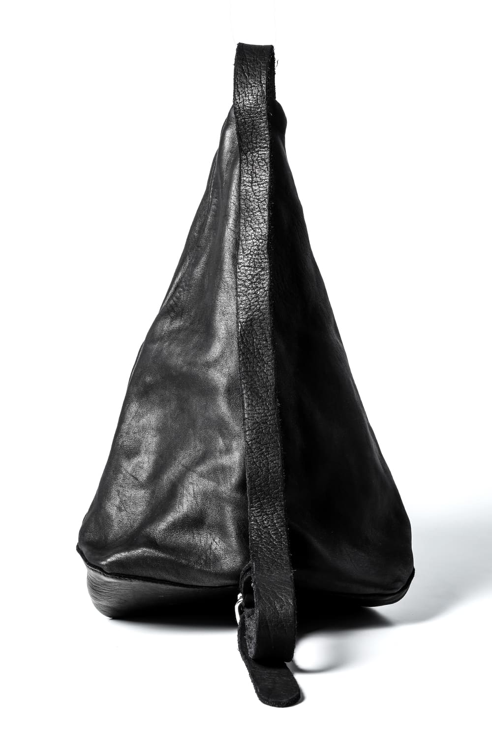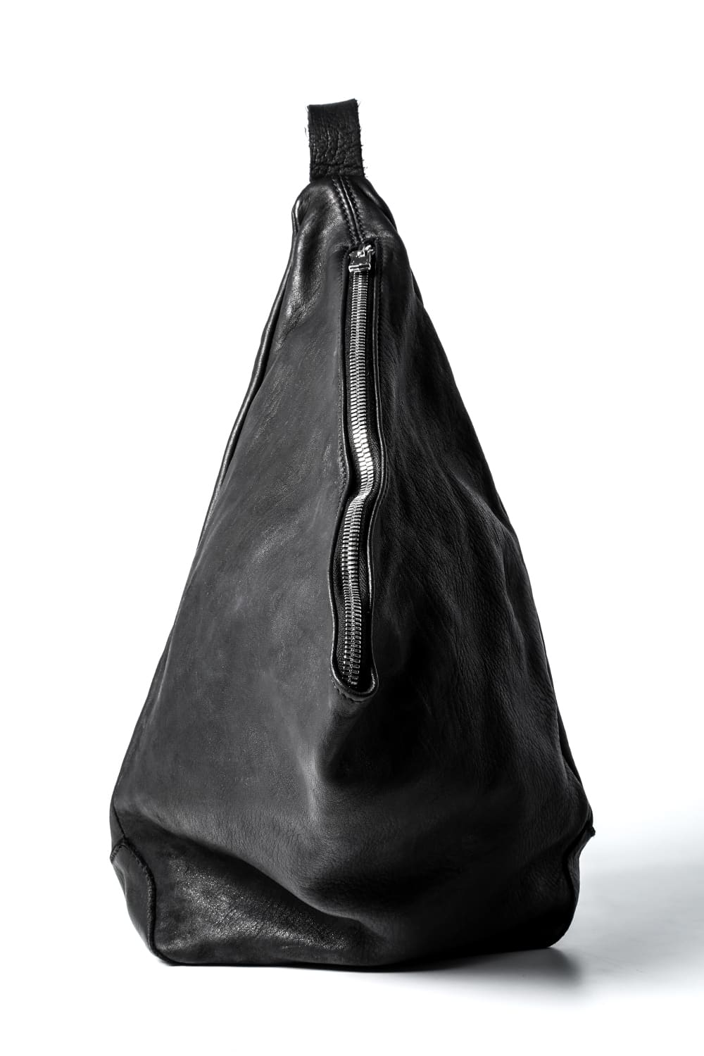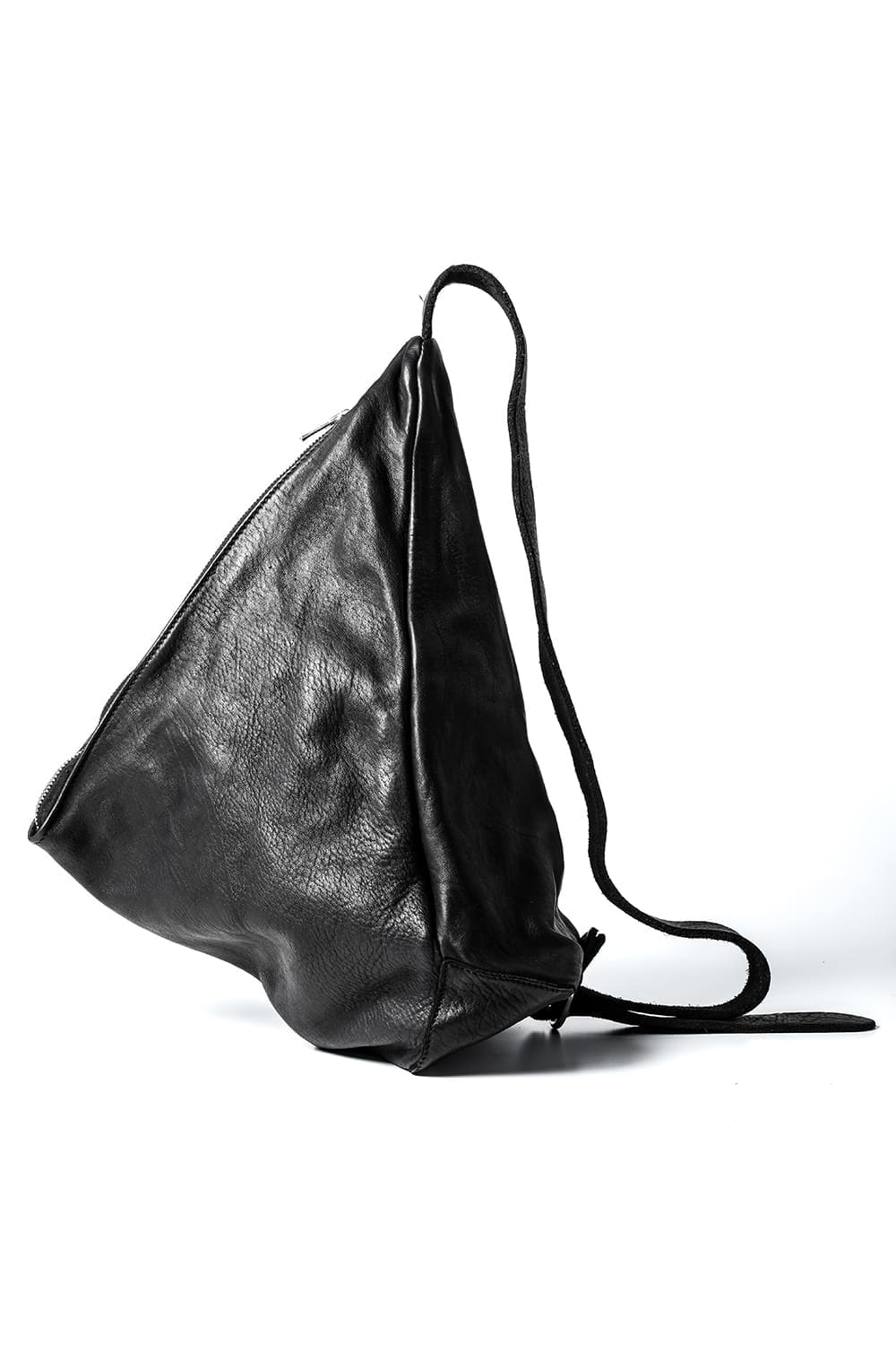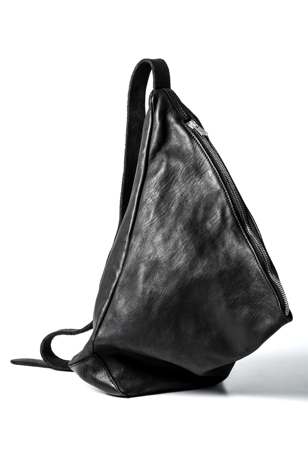 背中に当たる部分と底、ファスナーがついている表側の3つのパーツで構成された、立体的な三角形のフォルムがユニークなワンショルダーバッグ。内側にサブポケットの代わりにレザーコード付きポーチがついており、ポーチは取り外して単体で使用も可能です。横から見ると大きく見えますが、正面から見るとすっきりとした見た目になり、視覚的にもユニークですので、スタイリングのアクセントとしても有用です。レザーはヌメりのある独特の光沢と荒々しさを感じるアタリが特徴のホースレザーです。