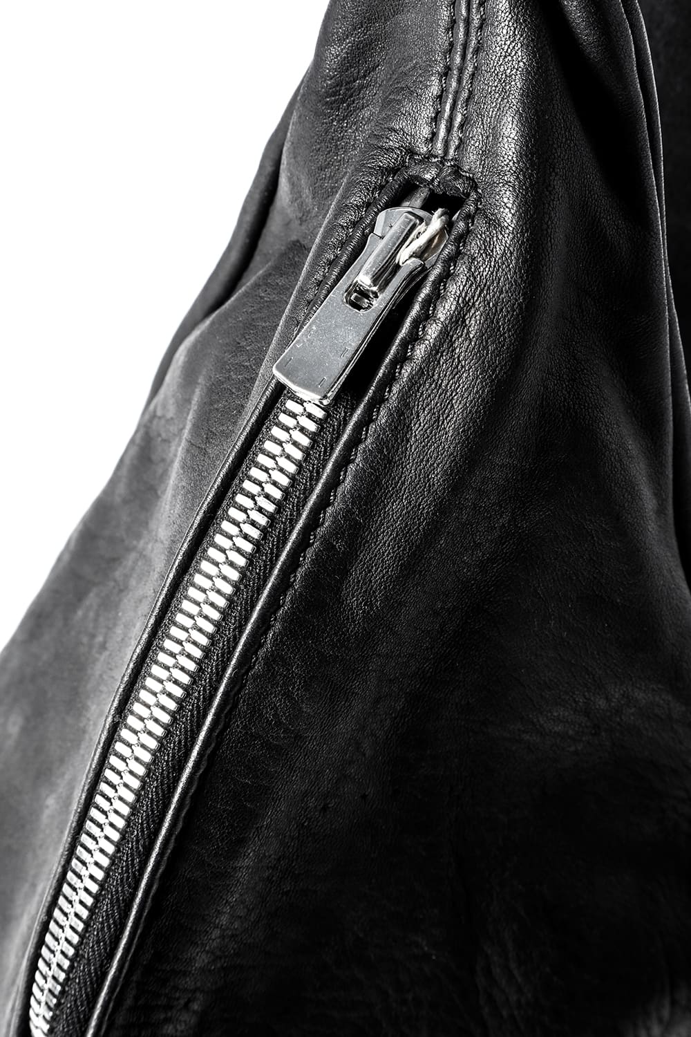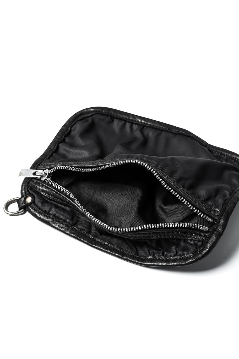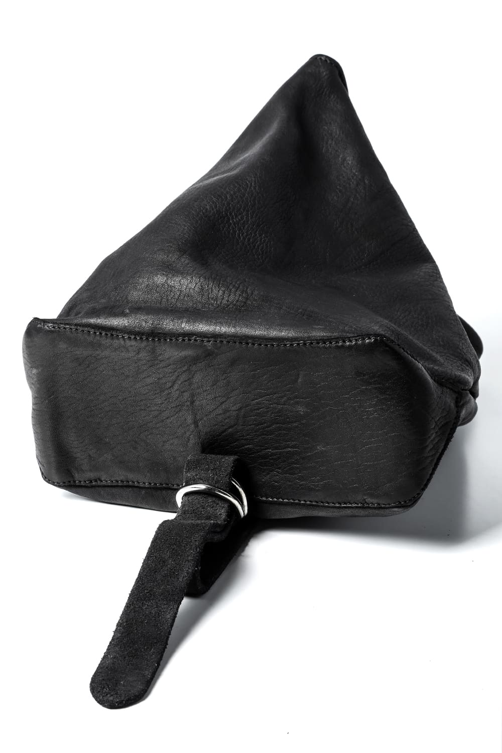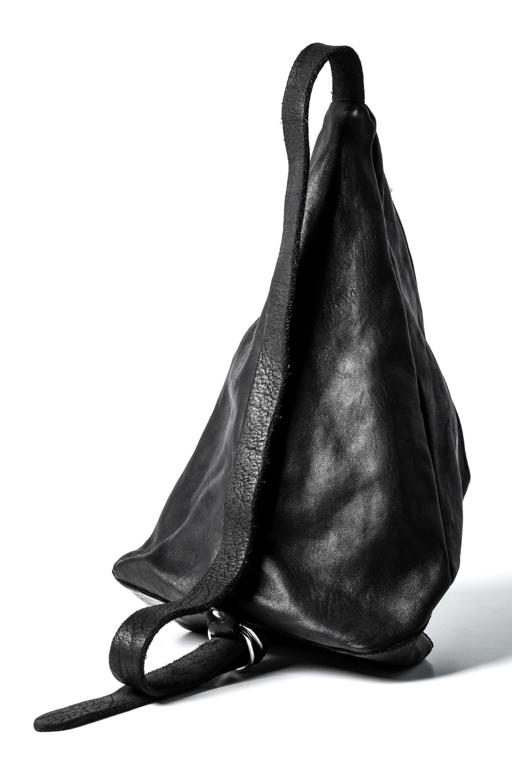 背中に当たる部分と底、ファスナーがついている表側の3つのパーツで構成された、立体的な三角形のフォルムがユニークなワンショルダーバッグ。内側にサブポケットの代わりにレザーコード付きポーチがついており、ポーチは取り外して単体で使用も可能です。横から見ると大きく見えますが、正面から見るとすっきりとした見た目になり、視覚的にもユニークですので、スタイリングのアクセントとしても有用です。レザーはヌメりのある独特の光沢と荒々しさを感じるアタリが特徴のホースレザーです。