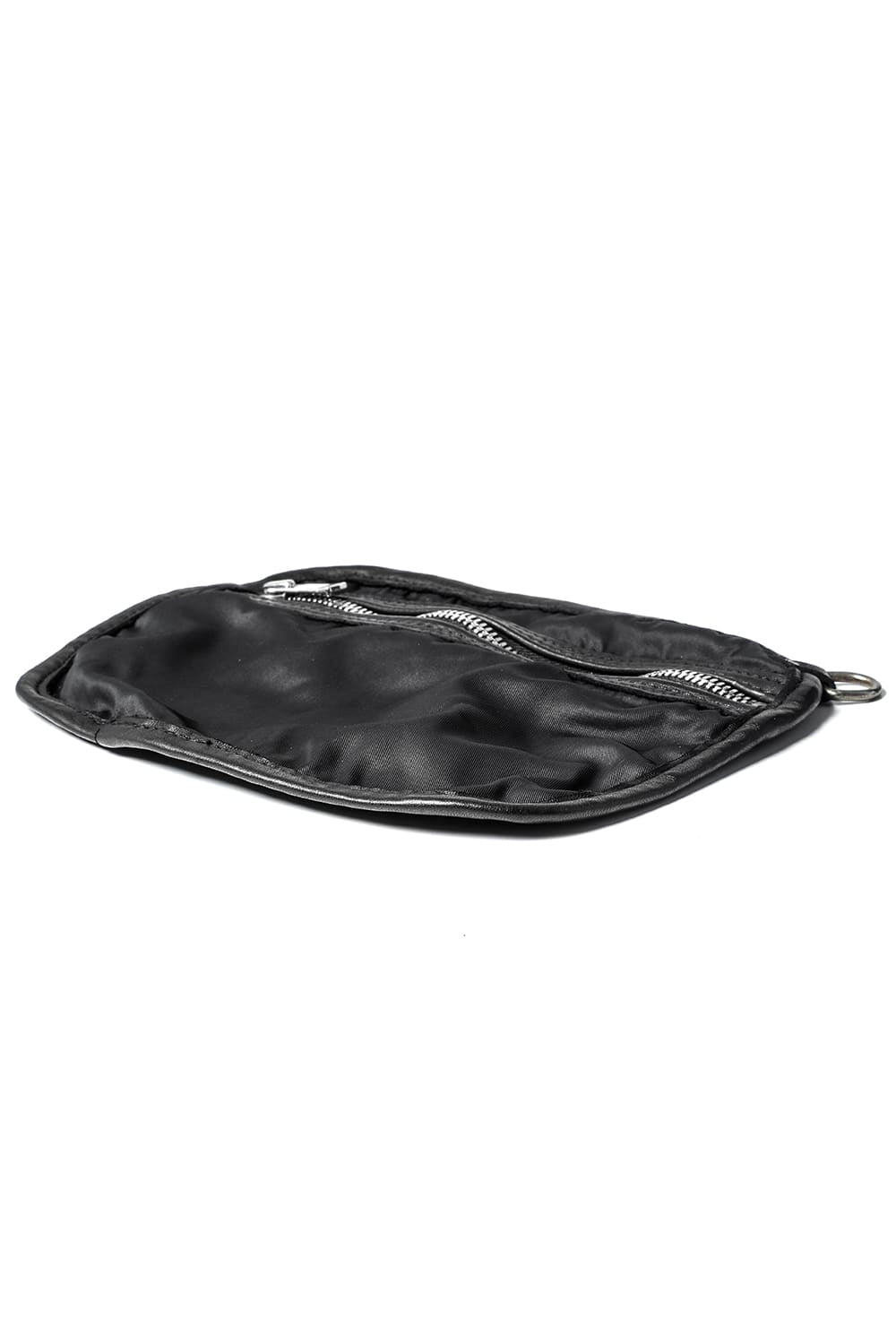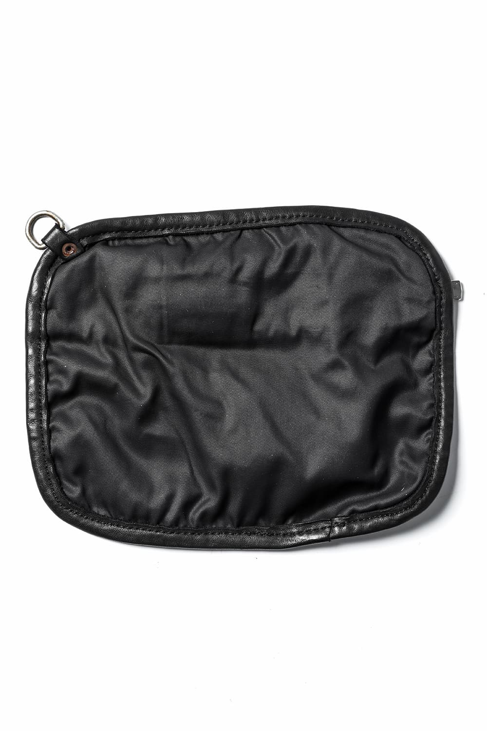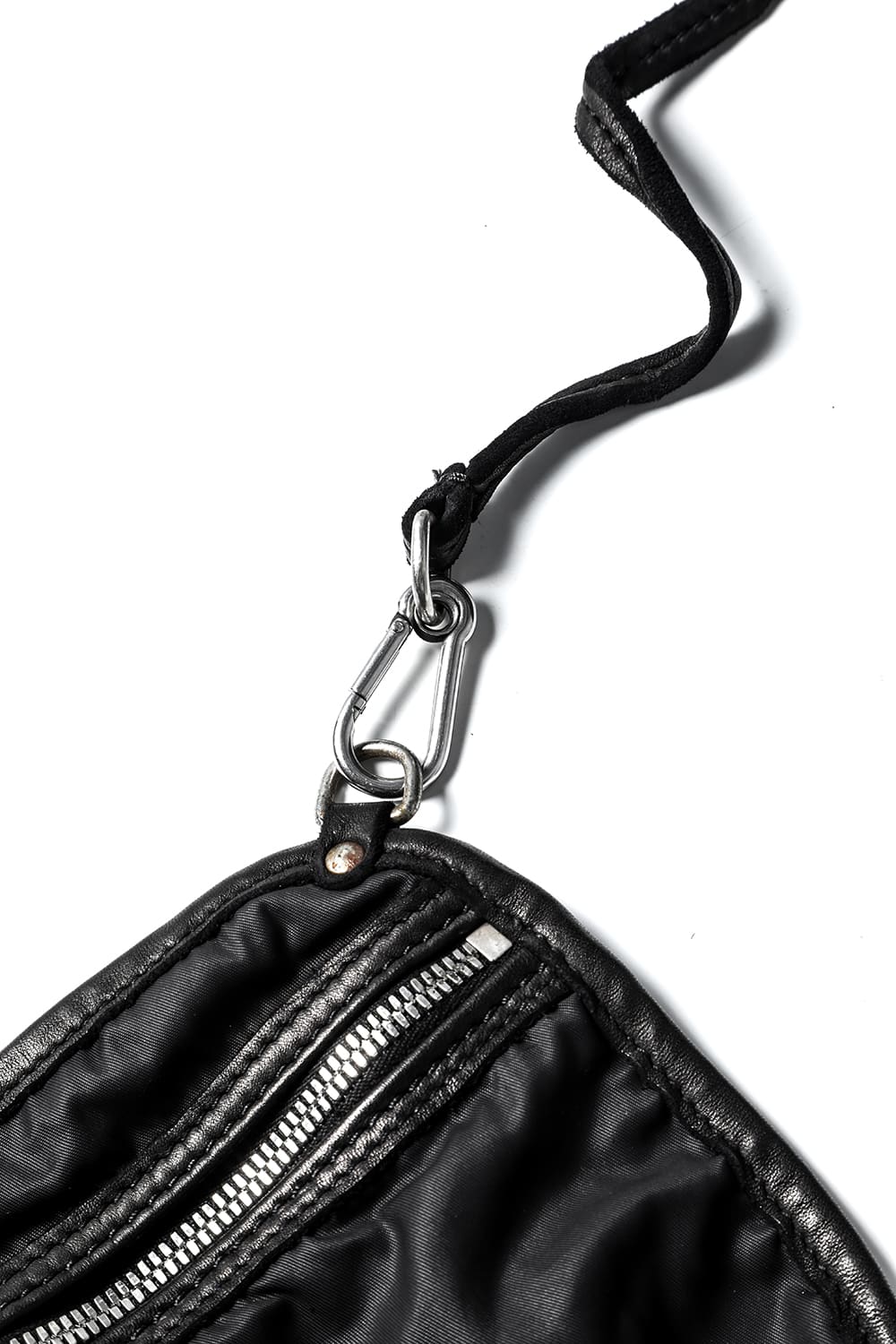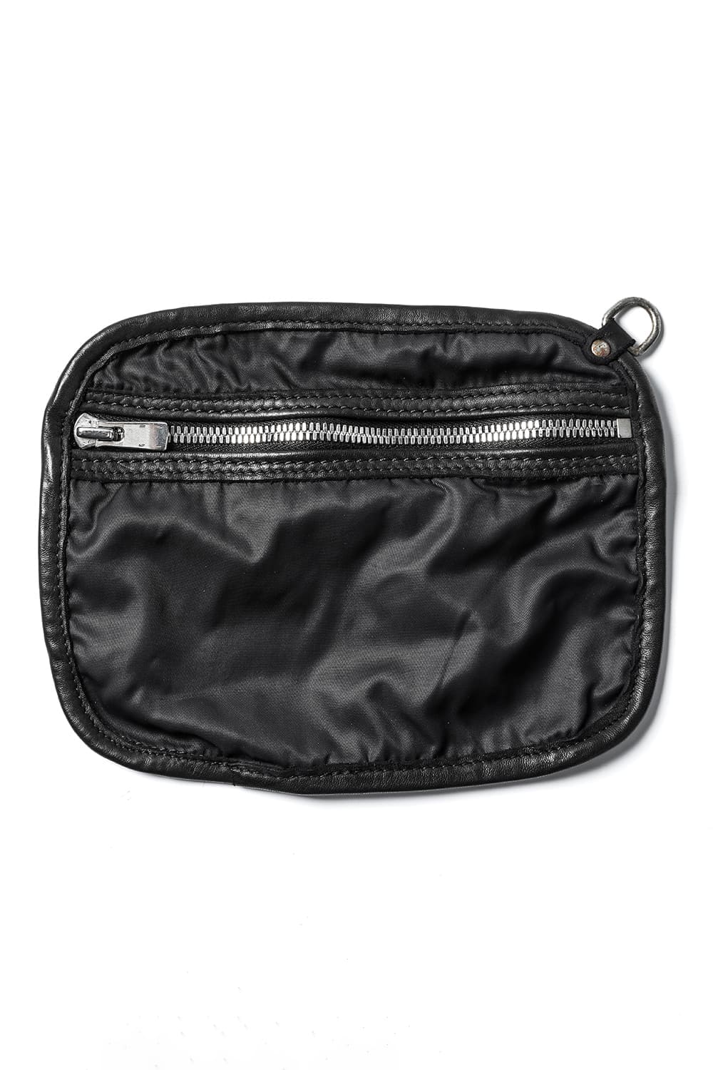 背中に当たる部分と底、ファスナーがついている表側の3つのパーツで構成された、立体的な三角形のフォルムがユニークなワンショルダーバッグ。内側にサブポケットの代わりにレザーコード付きポーチがついており、ポーチは取り外して単体で使用も可能です。横から見ると大きく見えますが、正面から見るとすっきりとした見た目になり、視覚的にもユニークですので、スタイリングのアクセントとしても有用です。レザーはヌメりのある独特の光沢と荒々しさを感じるアタリが特徴のホースレザーです。