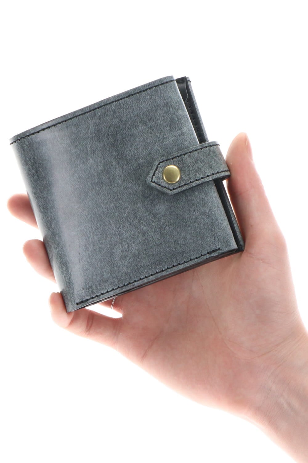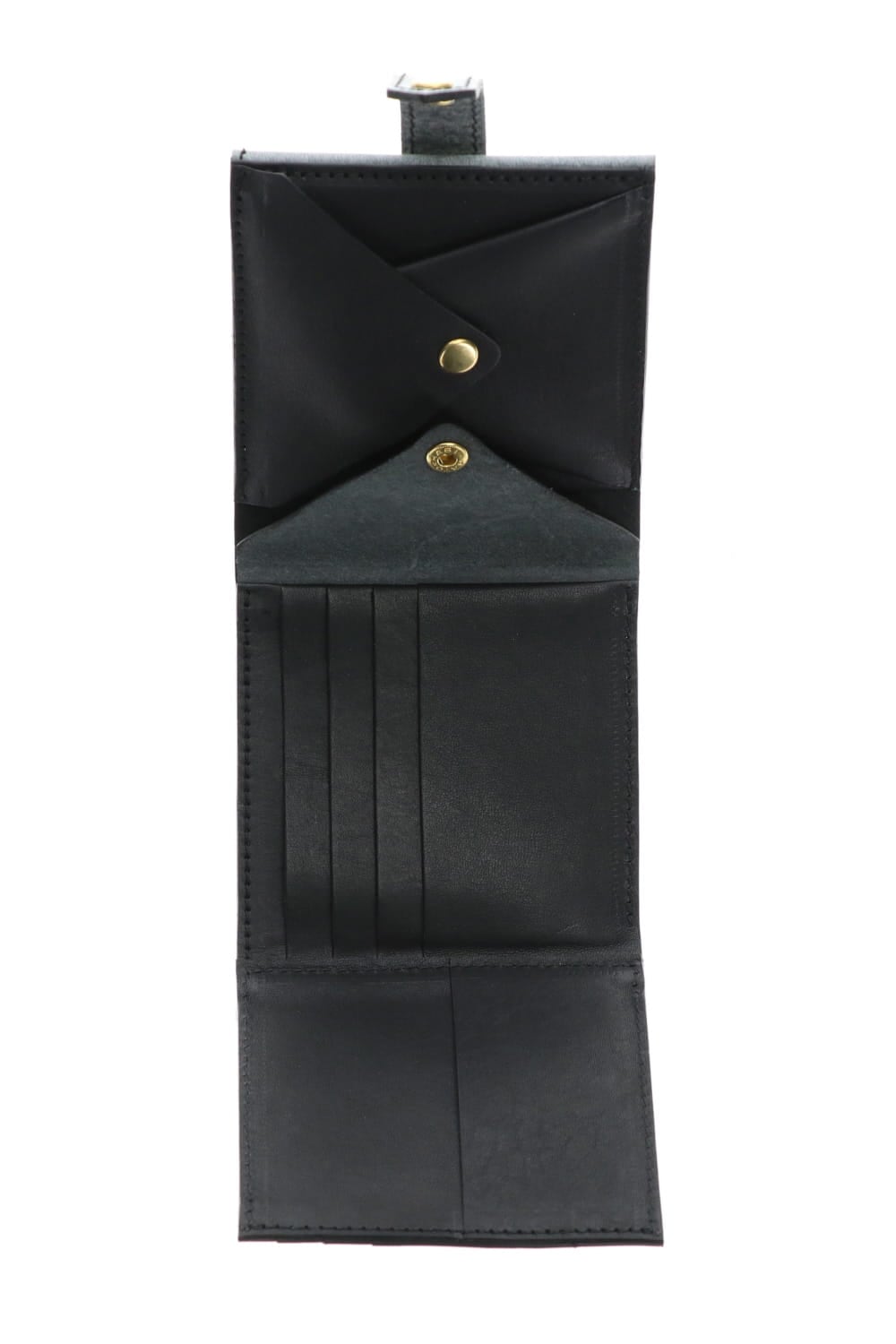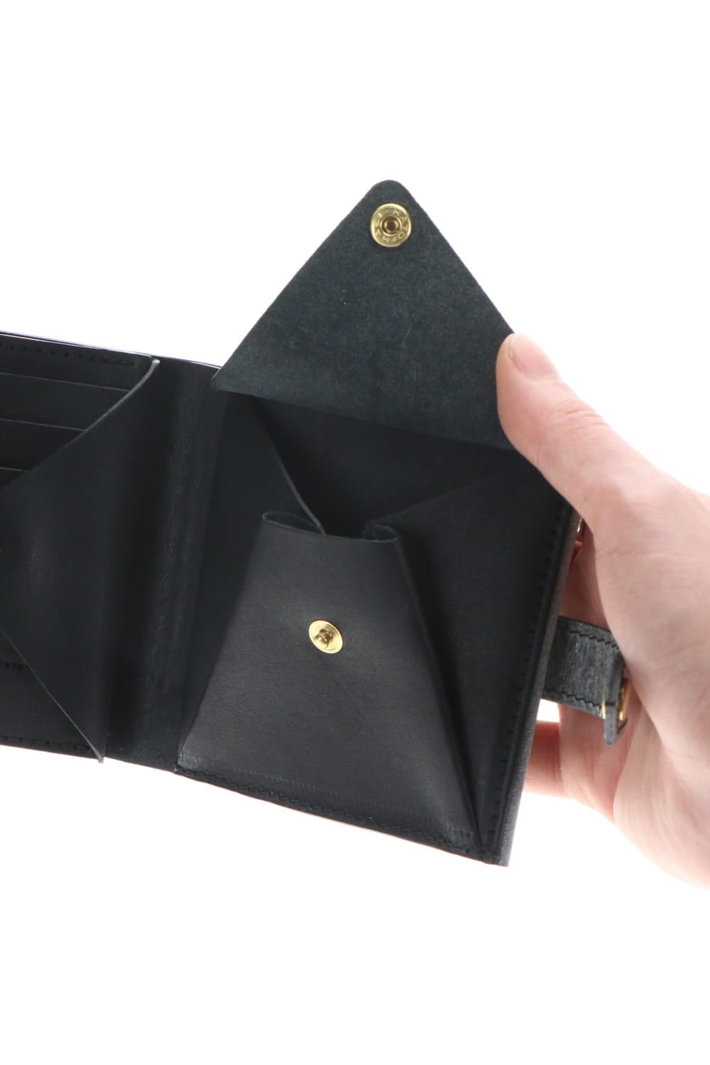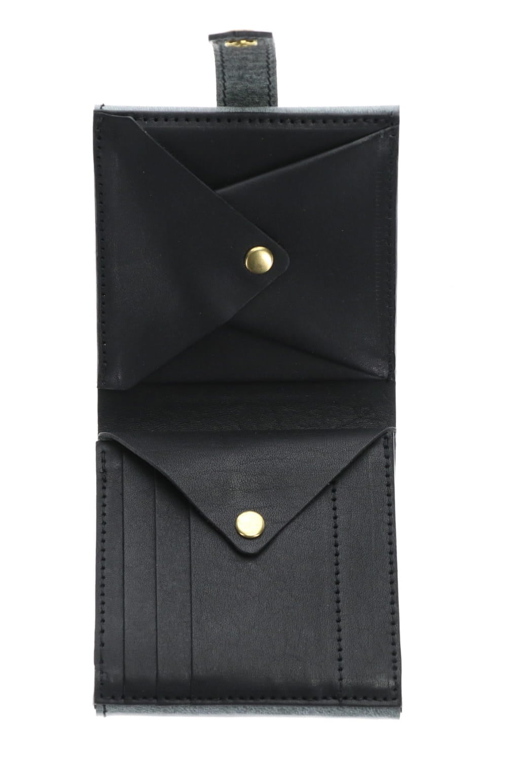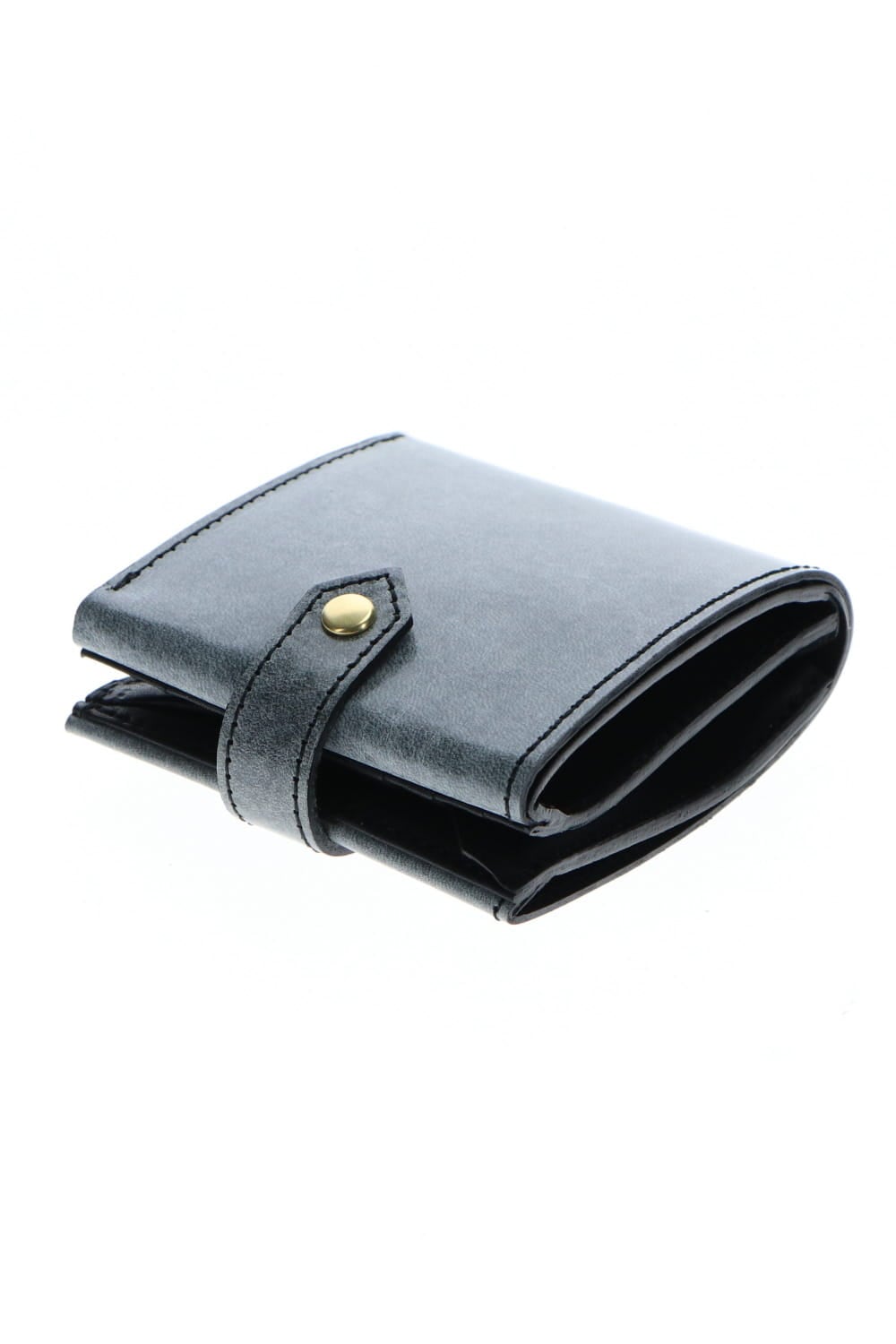 2010年のコレクションで展開されたフォールドウォレットをベースに、スナップボタンを取り付けた改良型フォールドウォレット。 一見二つ折りのように見えますが、内部のスナップボタンを取り外すことで、さらに4つのカードポケットとフリーポケットが1つ展開されます。 革は、21SSコレクションの新素材として展開された青森産ホースレザーのワックスプレスレザーを使用したウォレット。 BLACKのレザーにパラフィン系ホワイトワックスを乗せて110度のプレスをする事で、表面から奥に浸透させる加工を施しています。 この加工により、スモークのようなエフェクトと滑らかな光沢の表情が特徴的な革となっています。 使い込むごとに摩擦などでワックスがさらに浸透し、グレー系のカラーから革本来のカラーであるネイビーに変化していく経年変化を楽しむことができます。