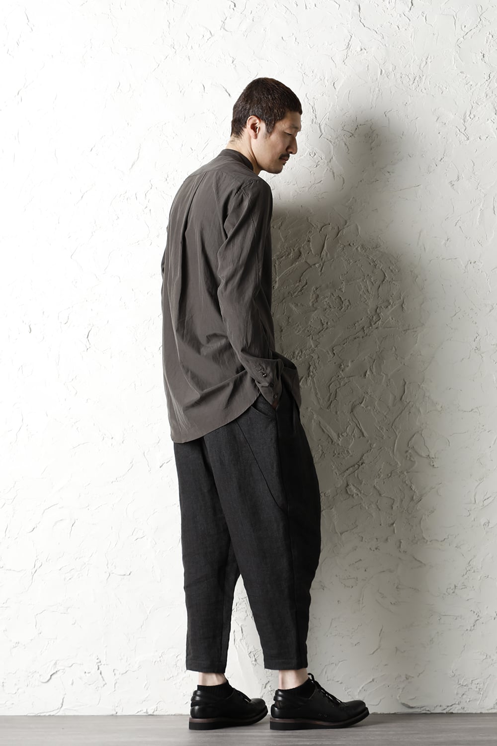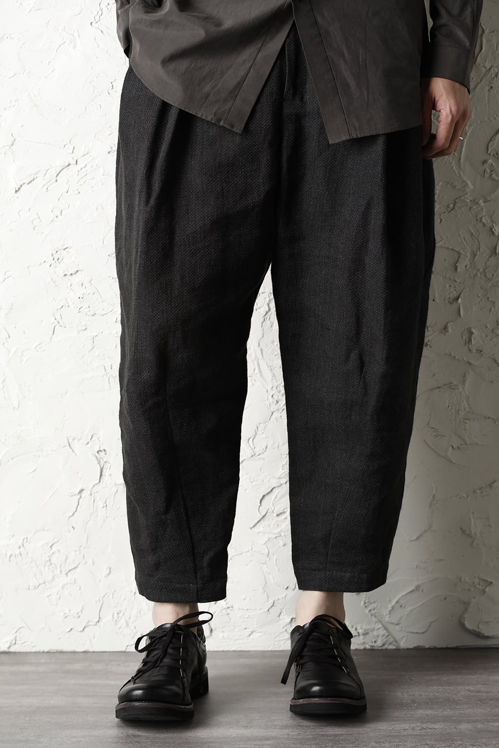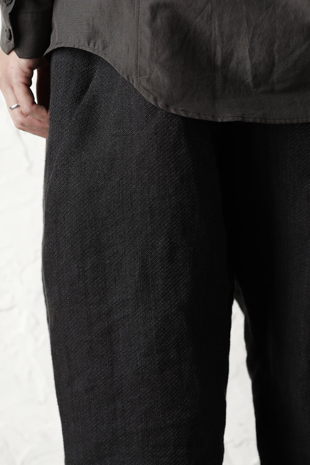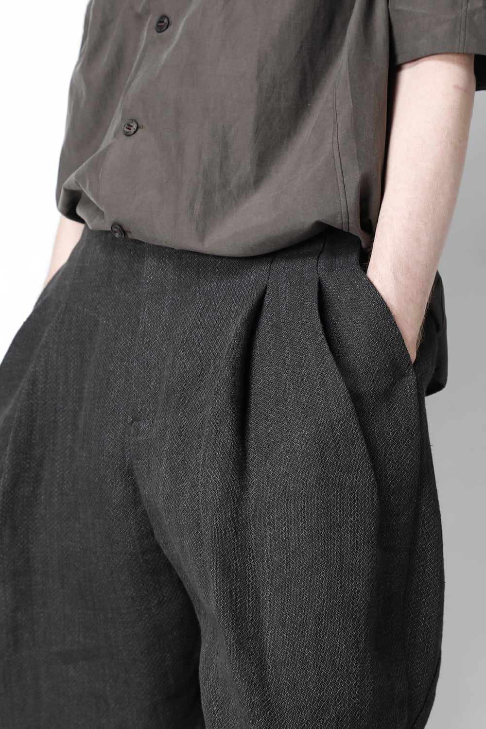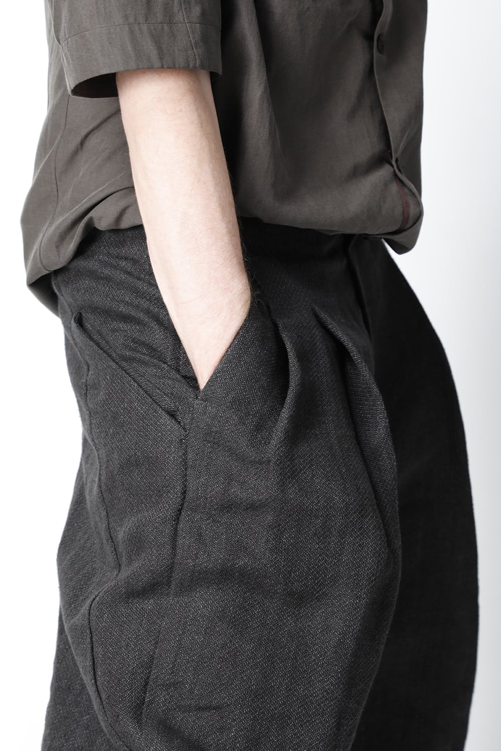 前に大きなタックを2つ取り、足の動く方向に分量を多くとって少し丸みのあるシルエットを形成し、後ろは余計な余りが出ないように分量を削ったおなじみの形。タックは膝あたりまで長く取ることに加えて、裾からもダーツを入れ、膝の運動量を確保しています。 切り替えを余り使わずに、シンプルな形で立体的な形状を作りつつ、シルエットバランスに優れた見た目も両立させています。生地は軽くハリのある和紙とリネンの混紡生地で、リネンの糸は外側だけを染めて芯の部分は白く仕上げることで、色合いに奥行きが生まれ、独特の表情を生み出しています。 通気性と速乾性、耐久性にも優れ、家庭での選択も可能な生地です。 着用していくと経年変化によって、生地が柔らかくなり着用者独自の敏が生地に反映されます。