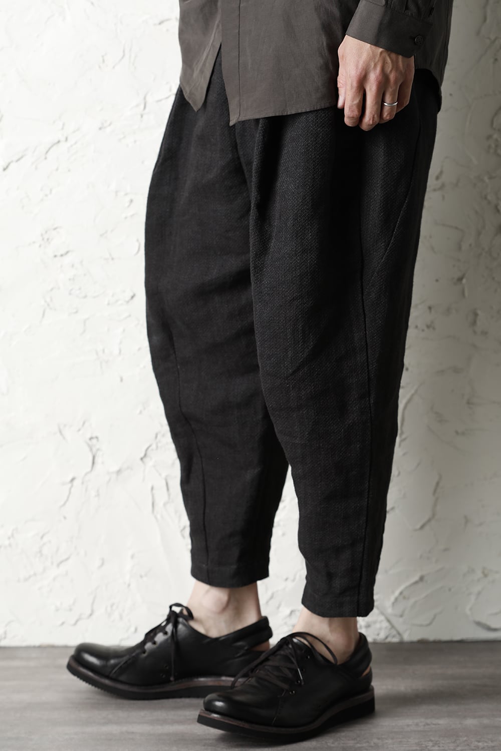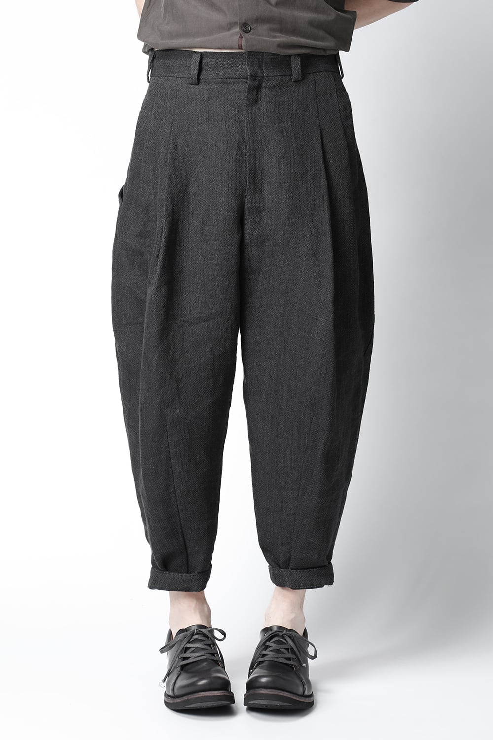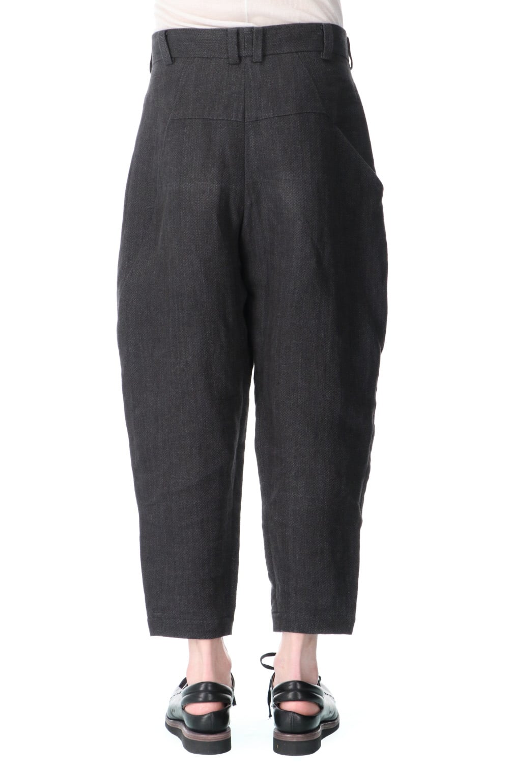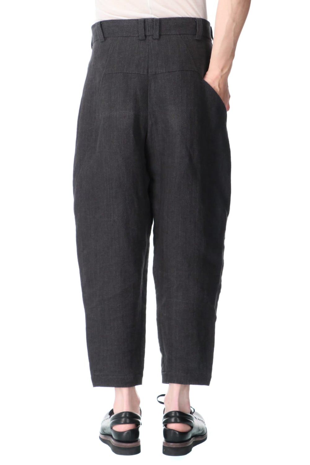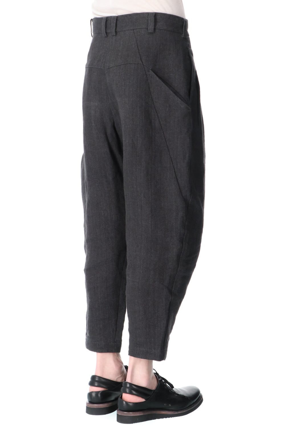 前に大きなタックを2つ取り、足の動く方向に分量を多くとって少し丸みのあるシルエットを形成し、後ろは余計な余りが出ないように分量を削ったおなじみの形。タックは膝あたりまで長く取ることに加えて、裾からもダーツを入れ、膝の運動量を確保しています。 切り替えを余り使わずに、シンプルな形で立体的な形状を作りつつ、シルエットバランスに優れた見た目も両立させています。生地は軽くハリのある和紙とリネンの混紡生地で、リネンの糸は外側だけを染めて芯の部分は白く仕上げることで、色合いに奥行きが生まれ、独特の表情を生み出しています。 通気性と速乾性、耐久性にも優れ、家庭での選択も可能な生地です。 着用していくと経年変化によって、生地が柔らかくなり着用者独自の敏が生地に反映されます。