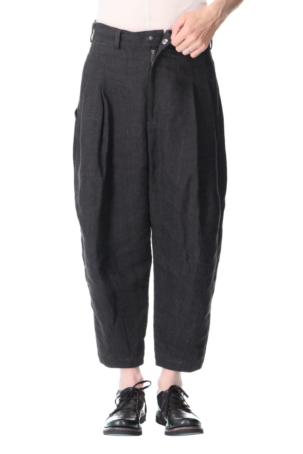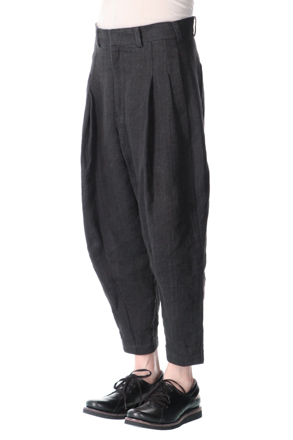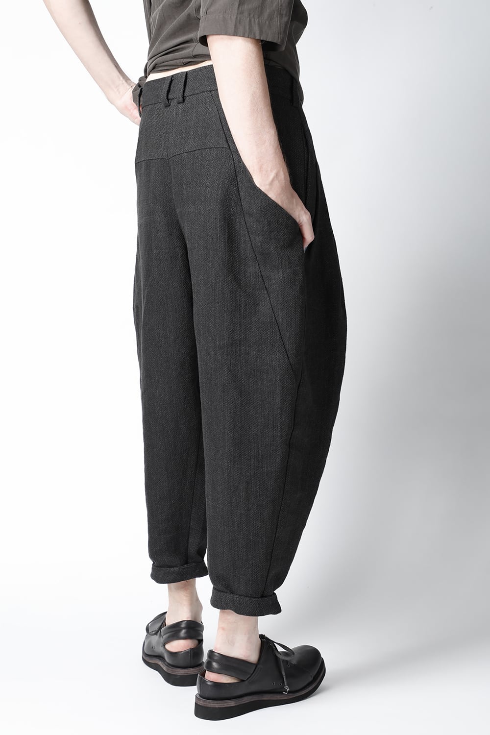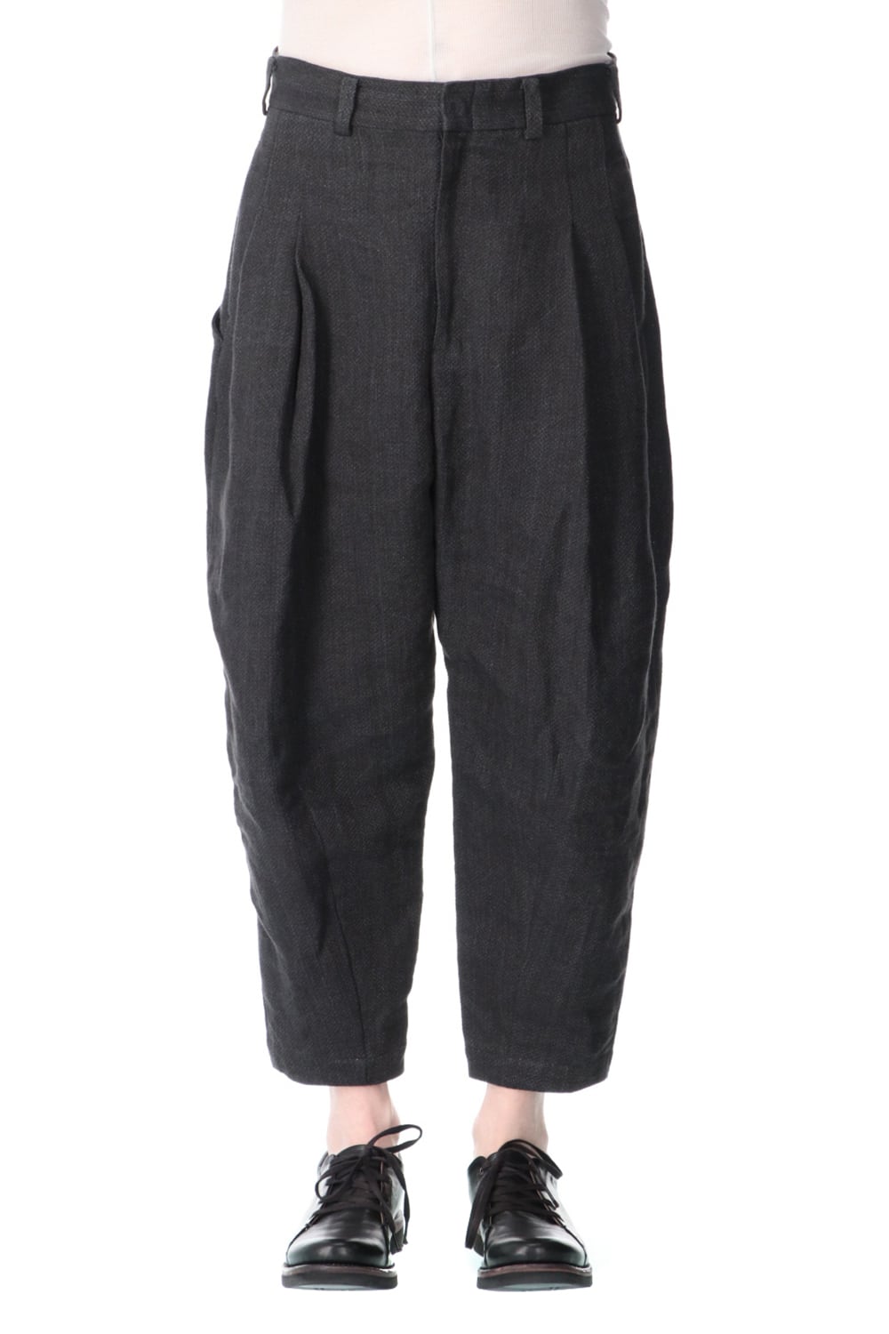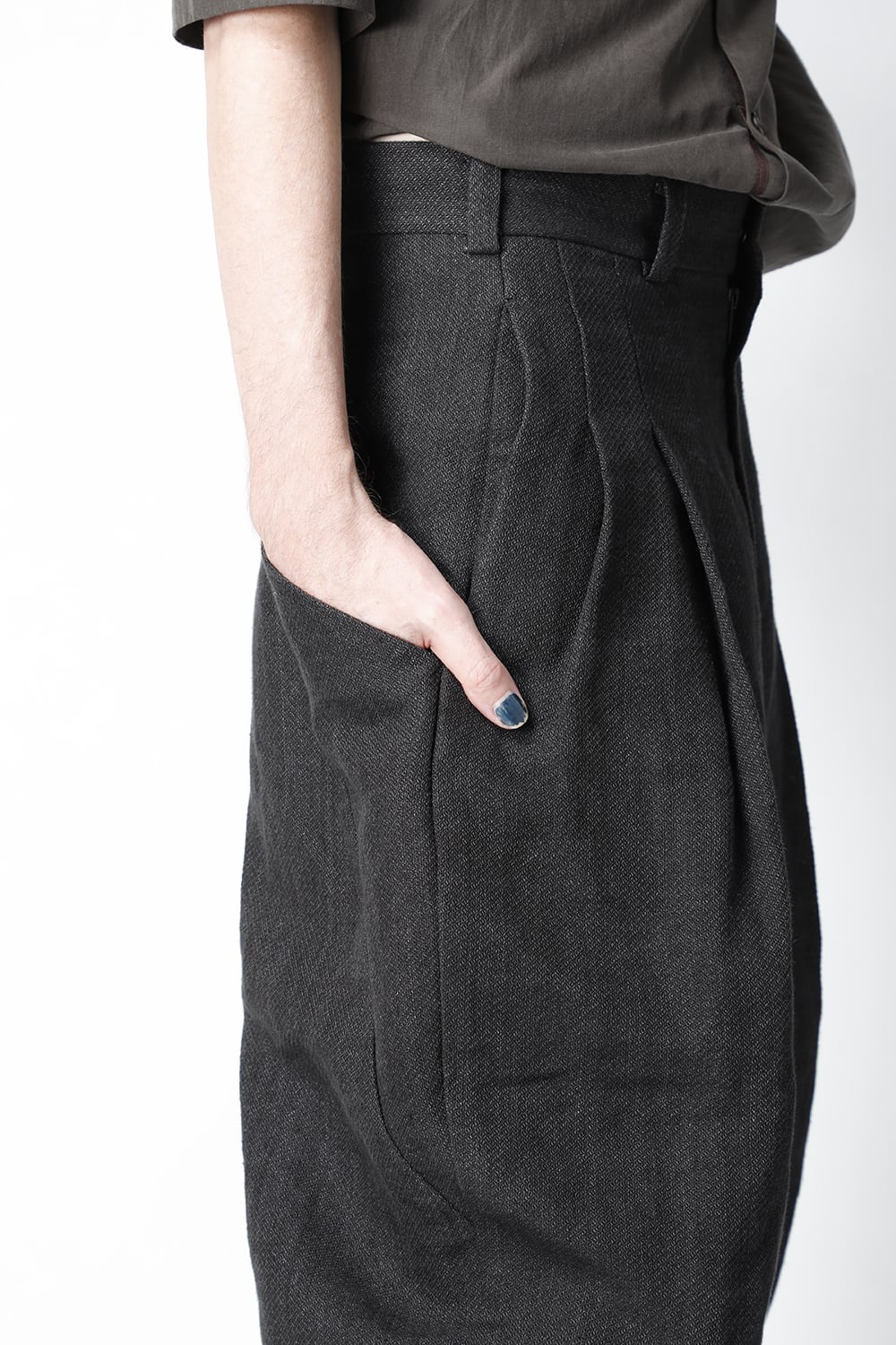 前に大きなタックを2つ取り、足の動く方向に分量を多くとって少し丸みのあるシルエットを形成し、後ろは余計な余りが出ないように分量を削ったおなじみの形。タックは膝あたりまで長く取ることに加えて、裾からもダーツを入れ、膝の運動量を確保しています。 切り替えを余り使わずに、シンプルな形で立体的な形状を作りつつ、シルエットバランスに優れた見た目も両立させています。生地は軽くハリのある和紙とリネンの混紡生地で、リネンの糸は外側だけを染めて芯の部分は白く仕上げることで、色合いに奥行きが生まれ、独特の表情を生み出しています。 通気性と速乾性、耐久性にも優れ、家庭での選択も可能な生地です。 着用していくと経年変化によって、生地が柔らかくなり着用者独自の敏が生地に反映されます。