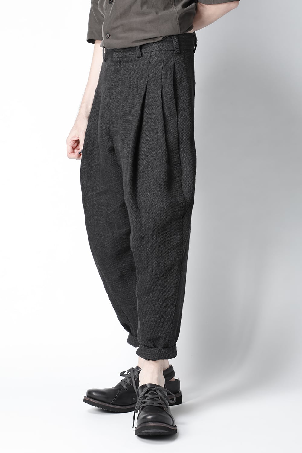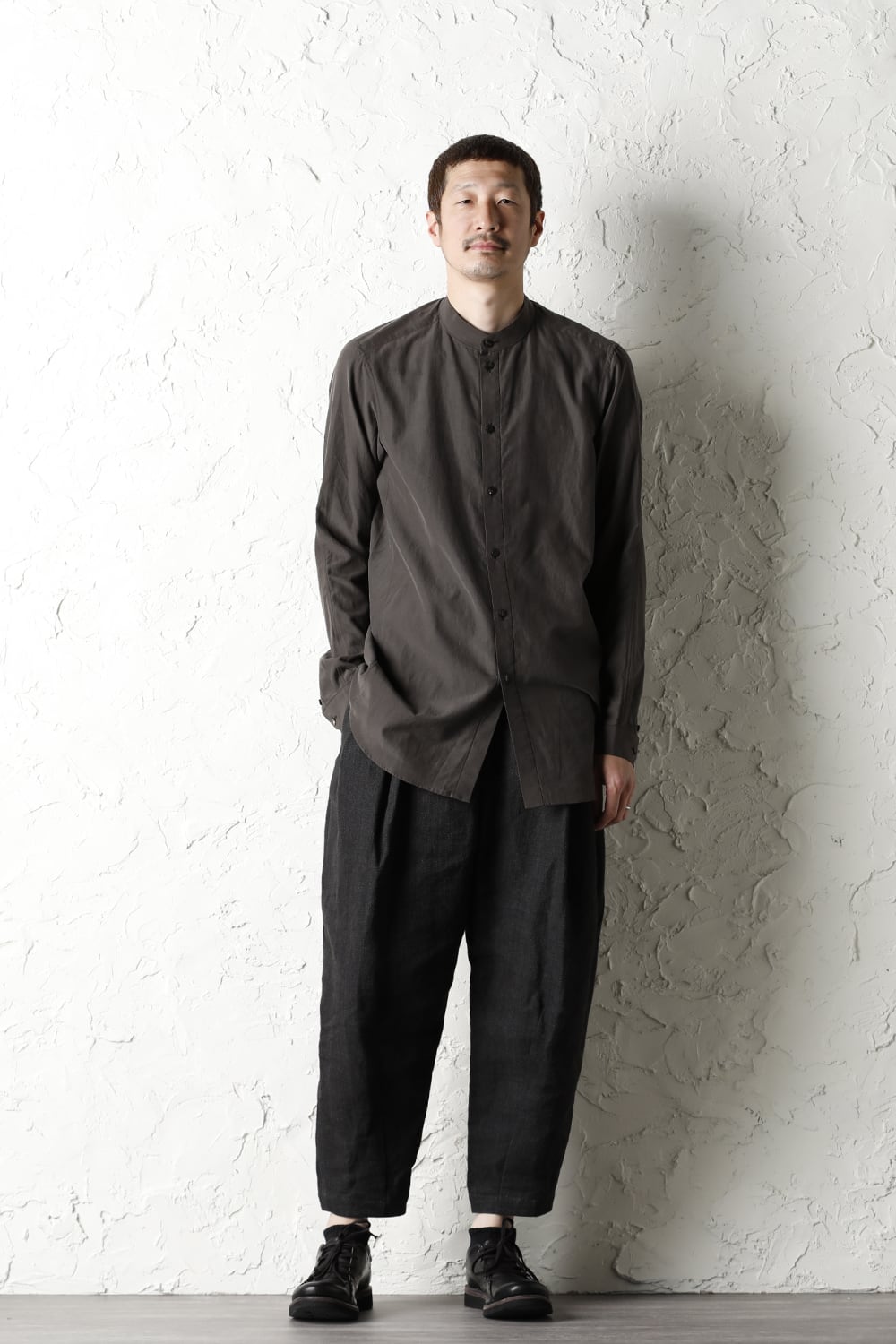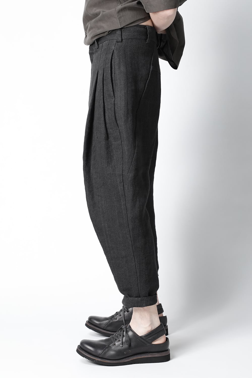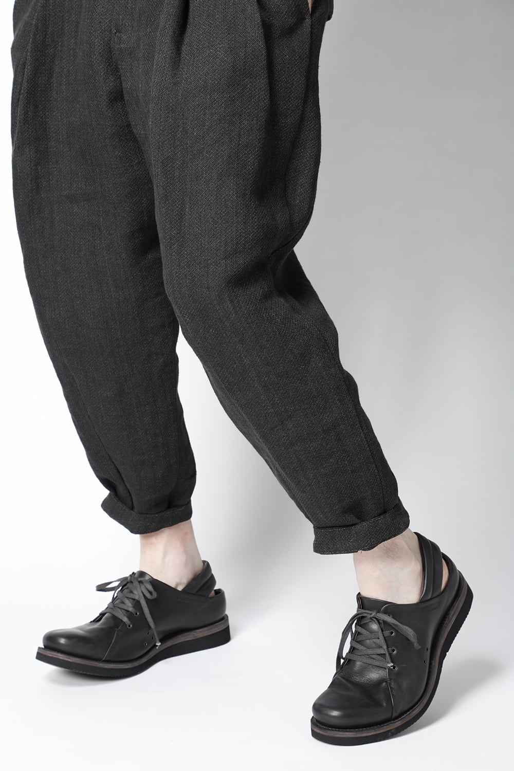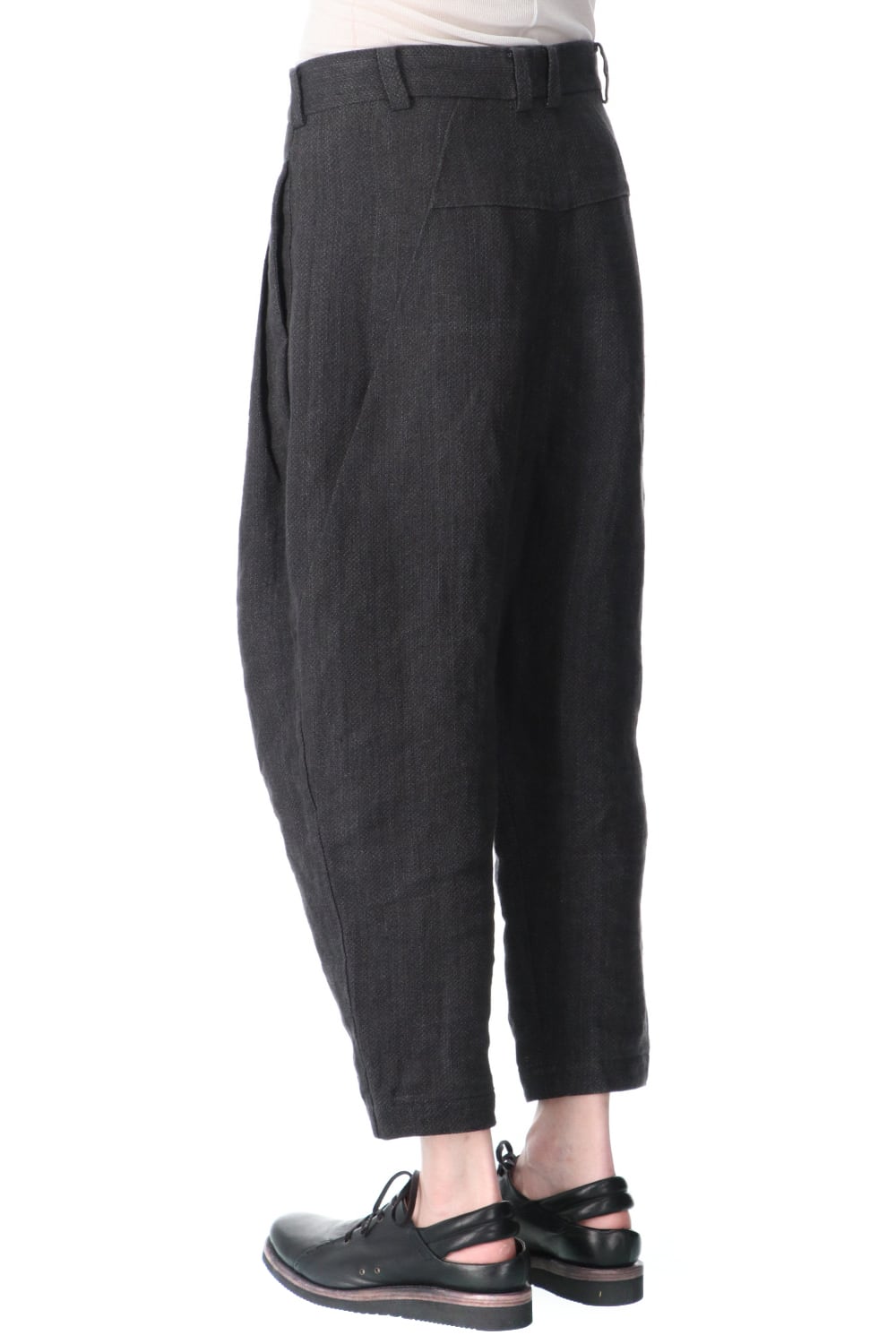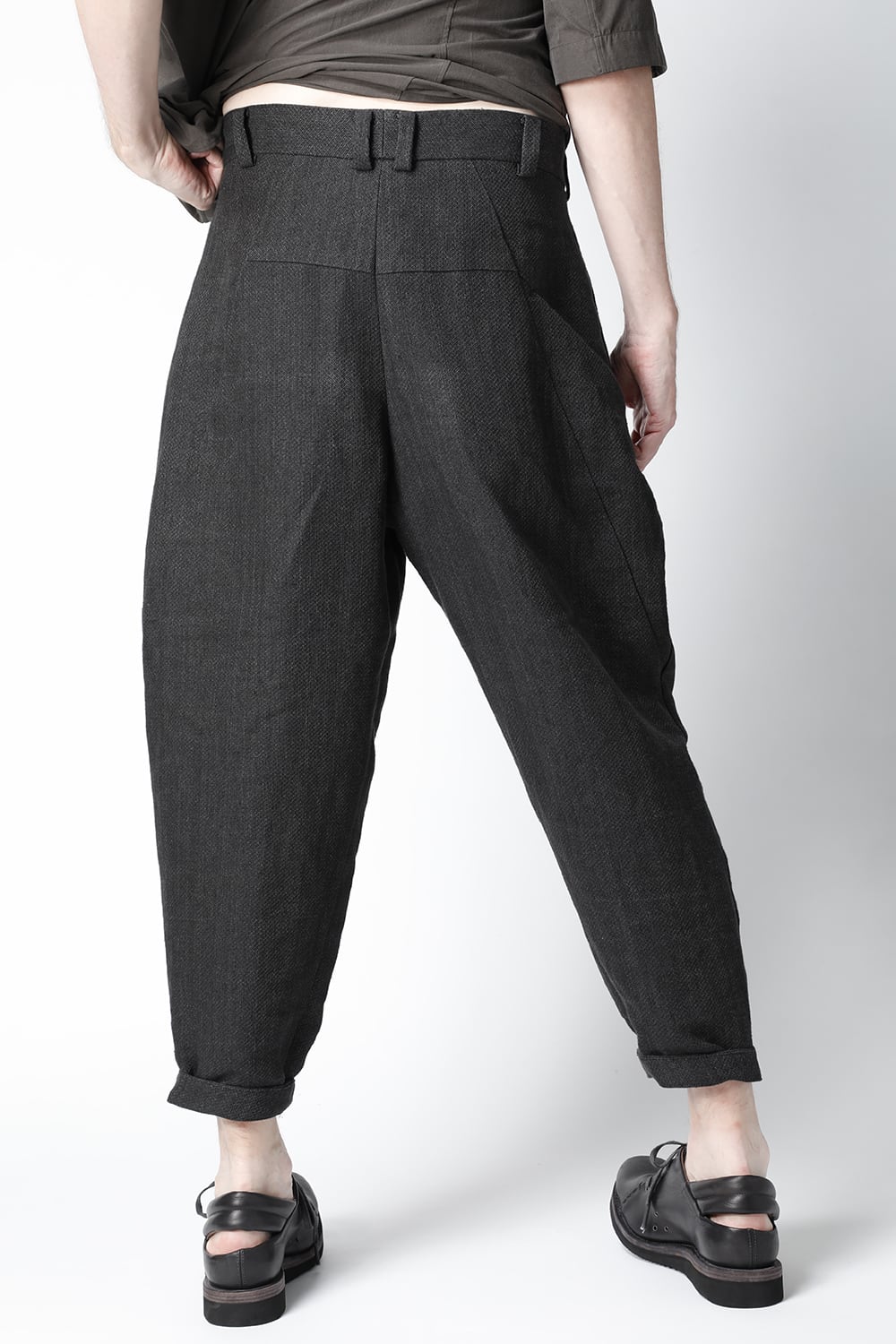 前に大きなタックを2つ取り、足の動く方向に分量を多くとって少し丸みのあるシルエットを形成し、後ろは余計な余りが出ないように分量を削ったおなじみの形。タックは膝あたりまで長く取ることに加えて、裾からもダーツを入れ、膝の運動量を確保しています。 切り替えを余り使わずに、シンプルな形で立体的な形状を作りつつ、シルエットバランスに優れた見た目も両立させています。生地は軽くハリのある和紙とリネンの混紡生地で、リネンの糸は外側だけを染めて芯の部分は白く仕上げることで、色合いに奥行きが生まれ、独特の表情を生み出しています。 通気性と速乾性、耐久性にも優れ、家庭での選択も可能な生地です。 着用していくと経年変化によって、生地が柔らかくなり着用者独自の敏が生地に反映されます。