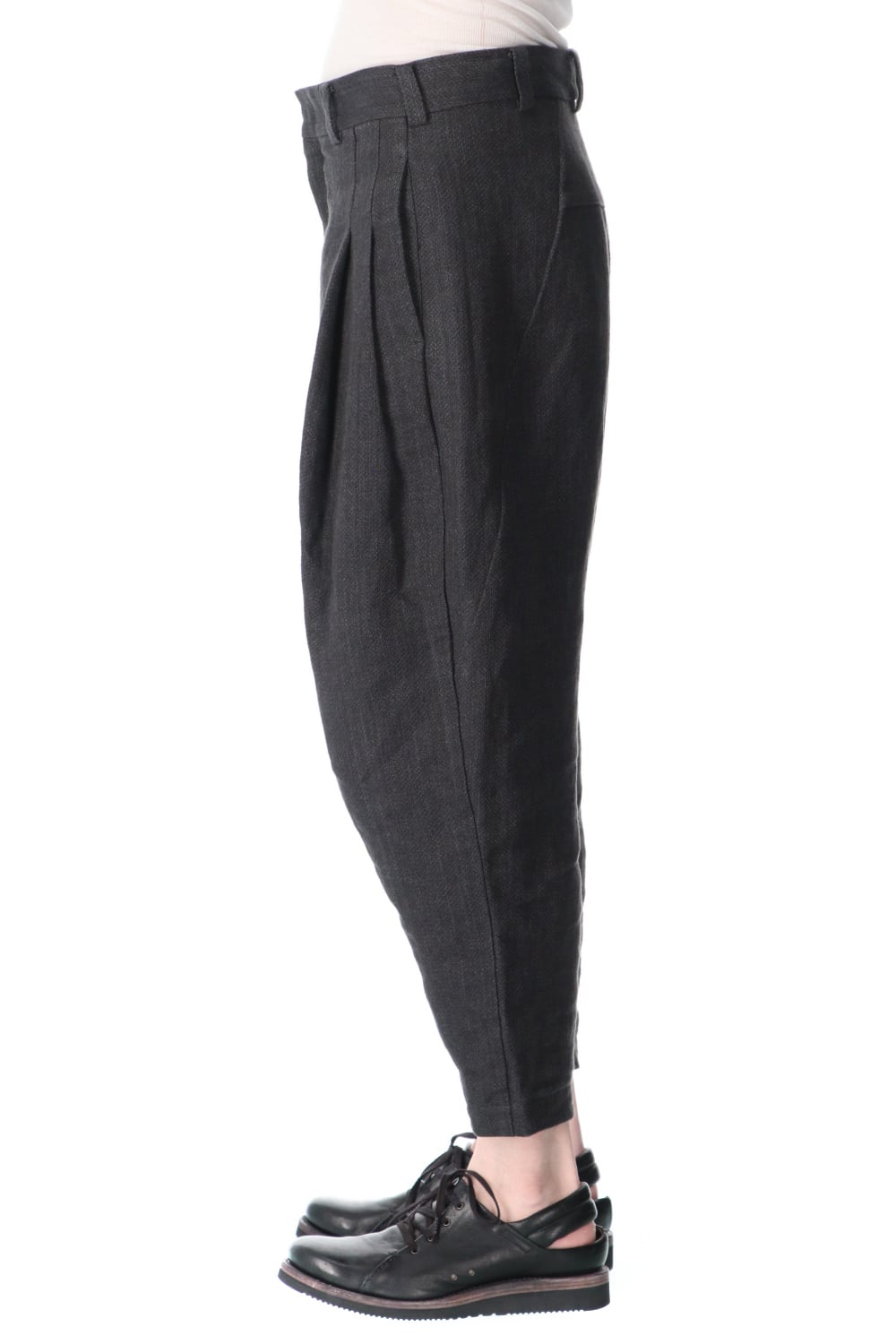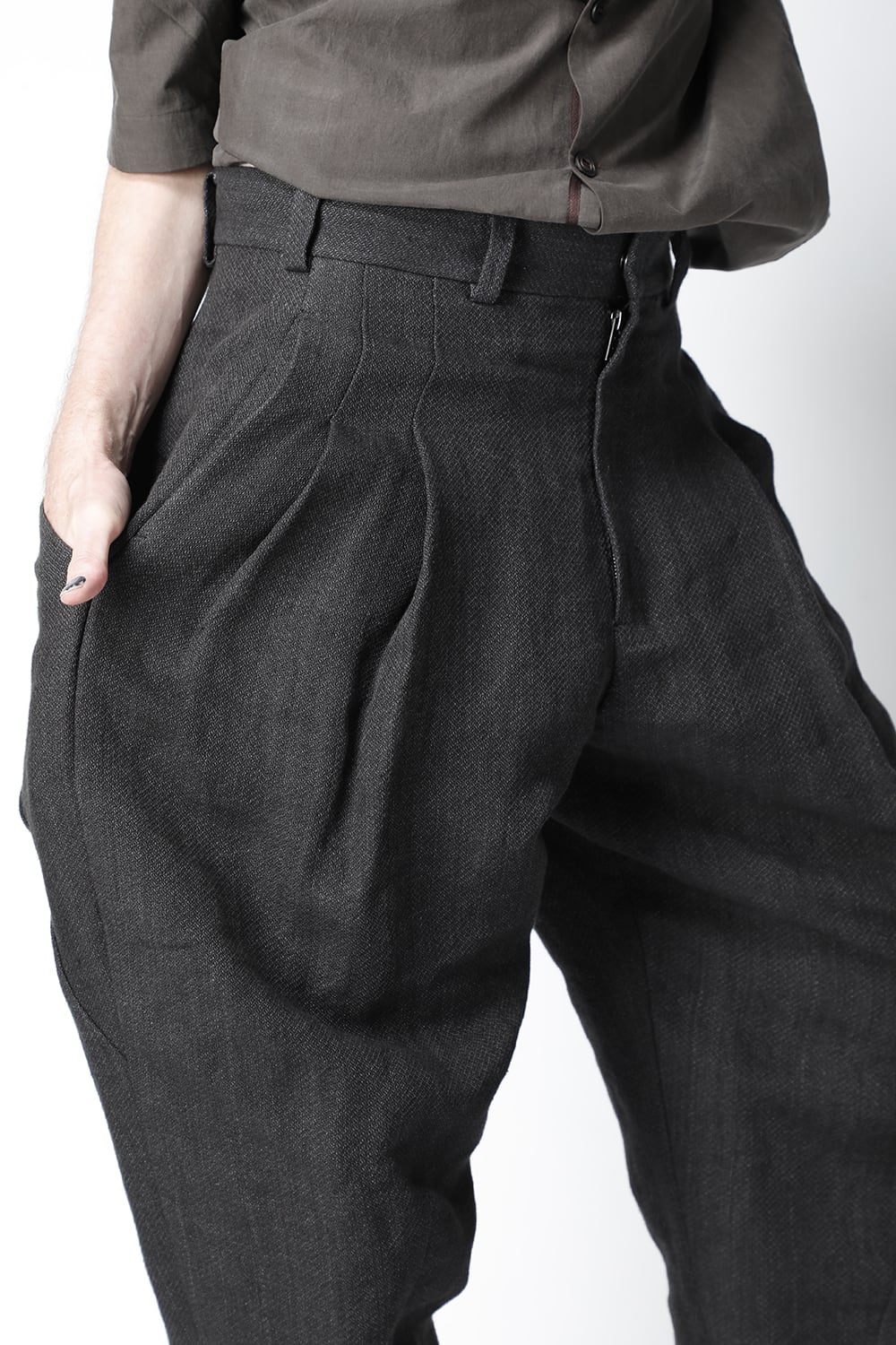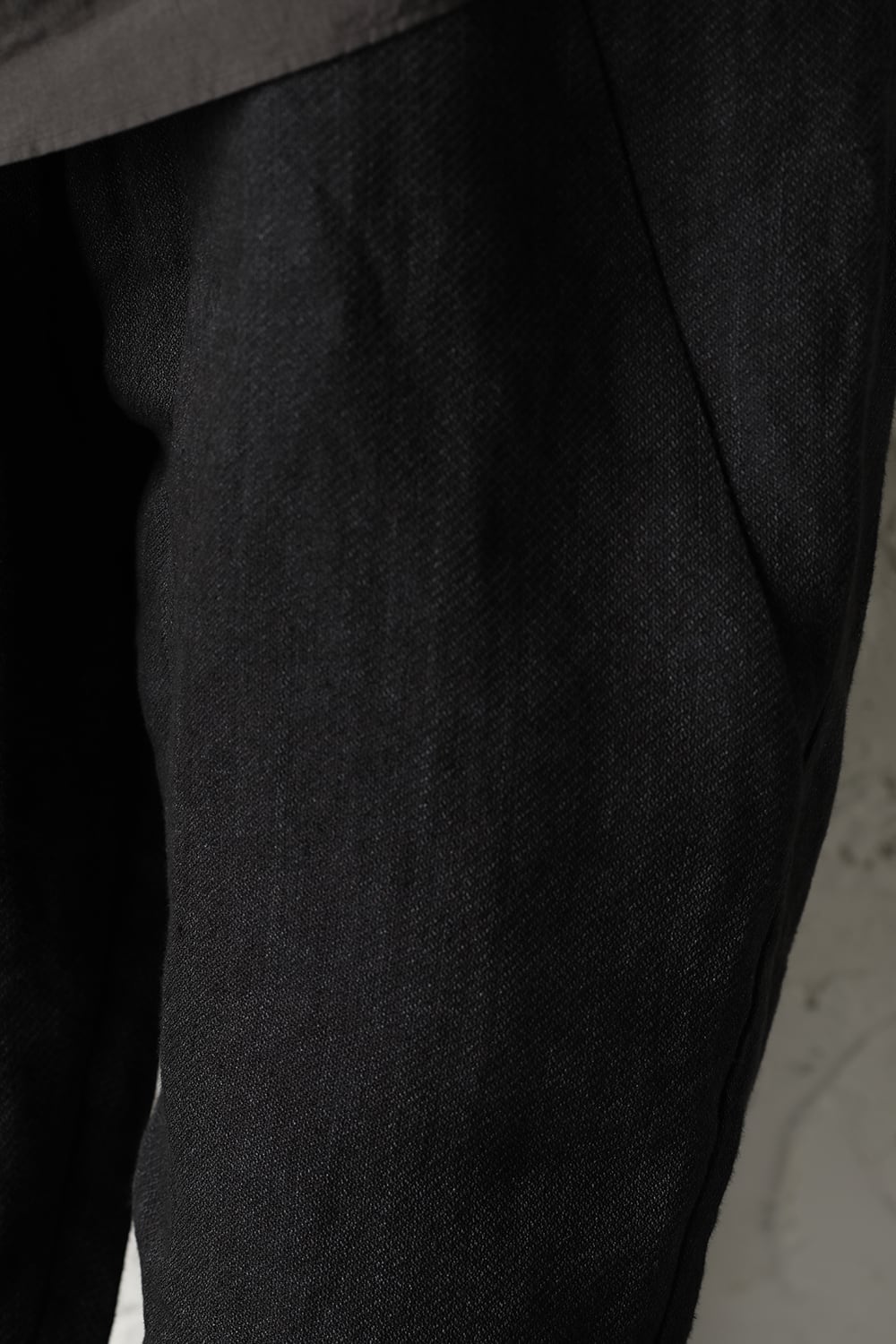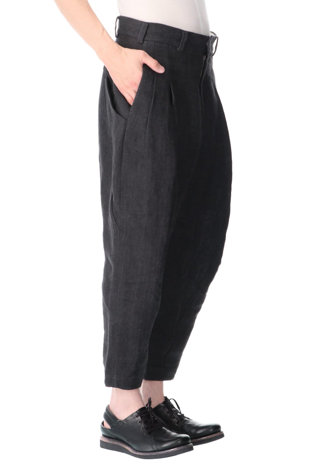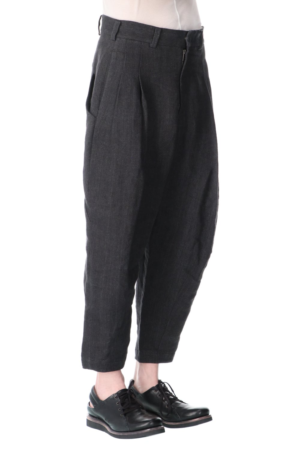 前に大きなタックを2つ取り、足の動く方向に分量を多くとって少し丸みのあるシルエットを形成し、後ろは余計な余りが出ないように分量を削ったおなじみの形。タックは膝あたりまで長く取ることに加えて、裾からもダーツを入れ、膝の運動量を確保しています。 切り替えを余り使わずに、シンプルな形で立体的な形状を作りつつ、シルエットバランスに優れた見た目も両立させています。生地は軽くハリのある和紙とリネンの混紡生地で、リネンの糸は外側だけを染めて芯の部分は白く仕上げることで、色合いに奥行きが生まれ、独特の表情を生み出しています。 通気性と速乾性、耐久性にも優れ、家庭での選択も可能な生地です。 着用していくと経年変化によって、生地が柔らかくなり着用者独自の敏が生地に反映されます。