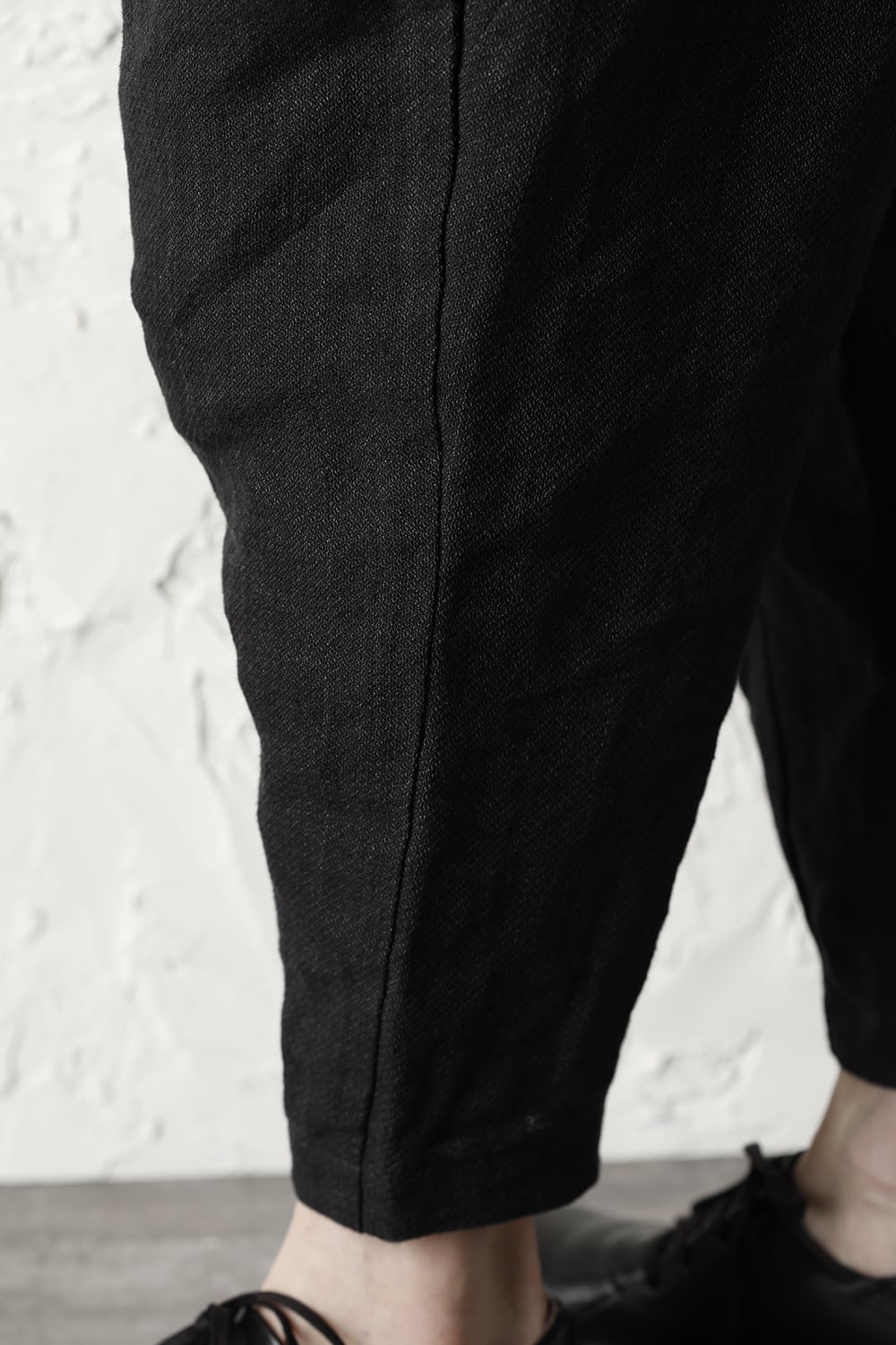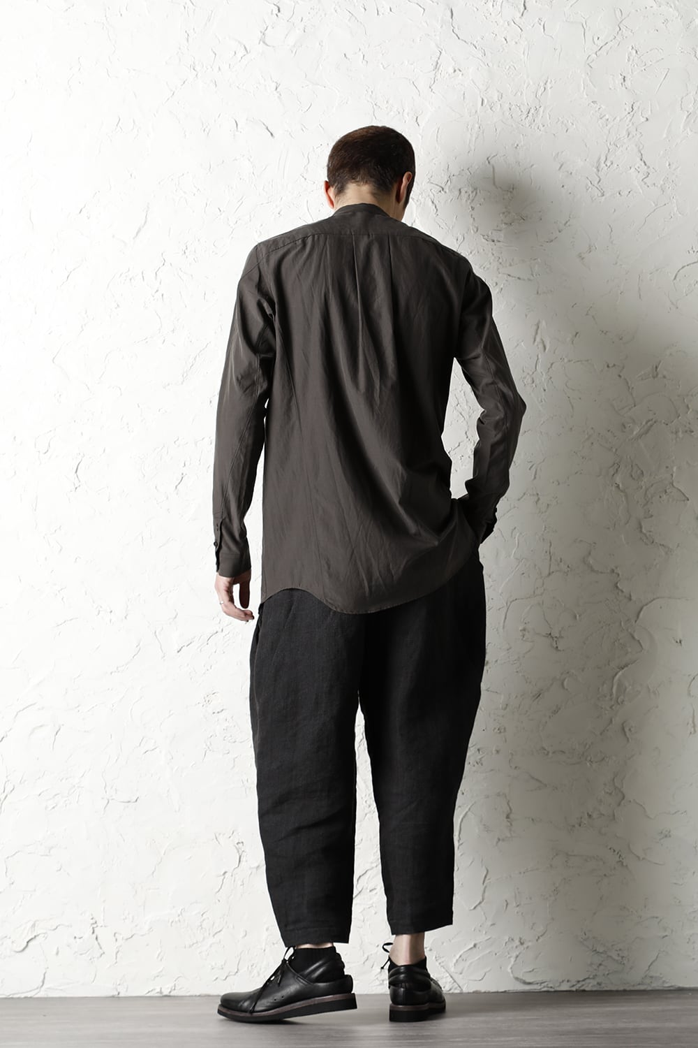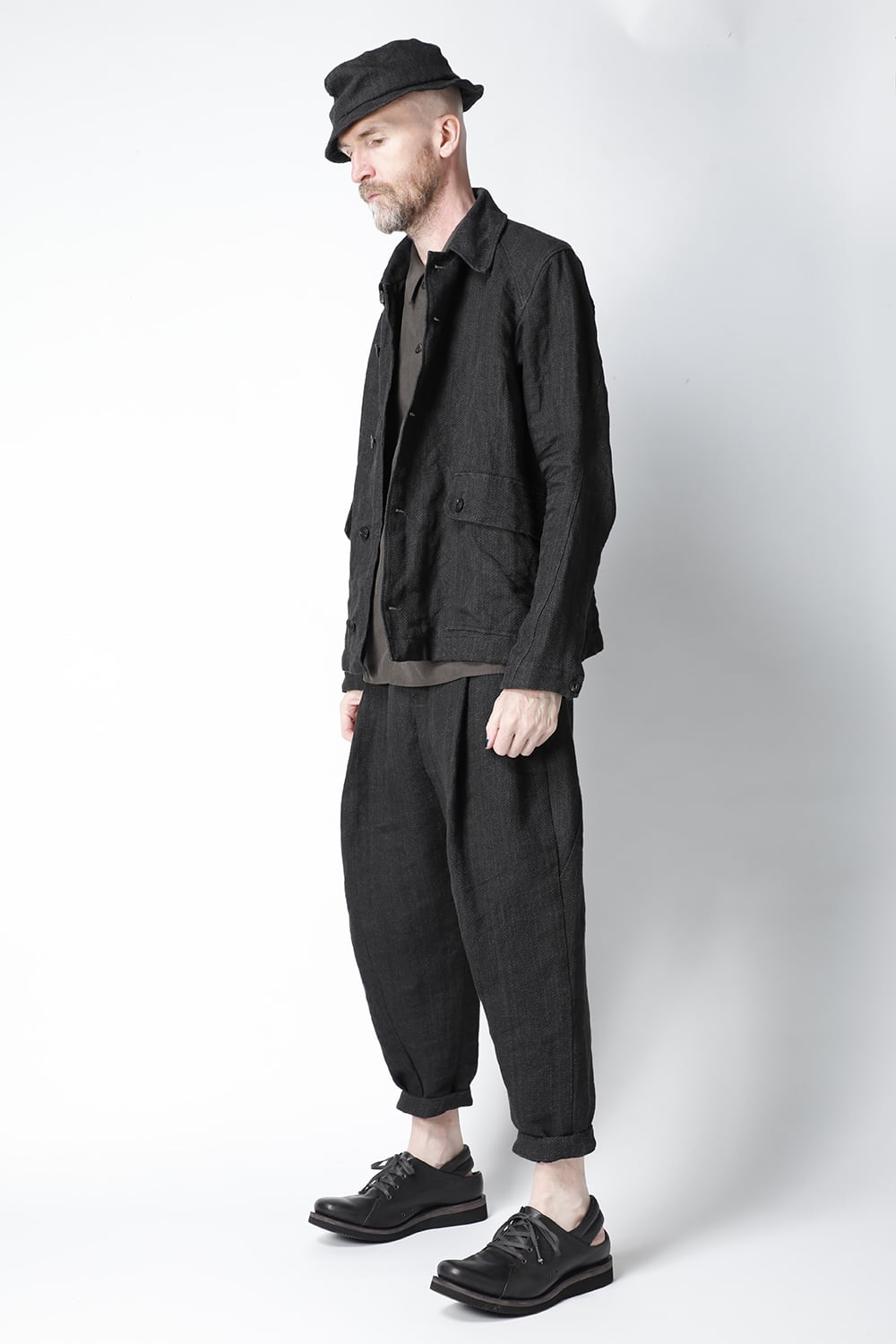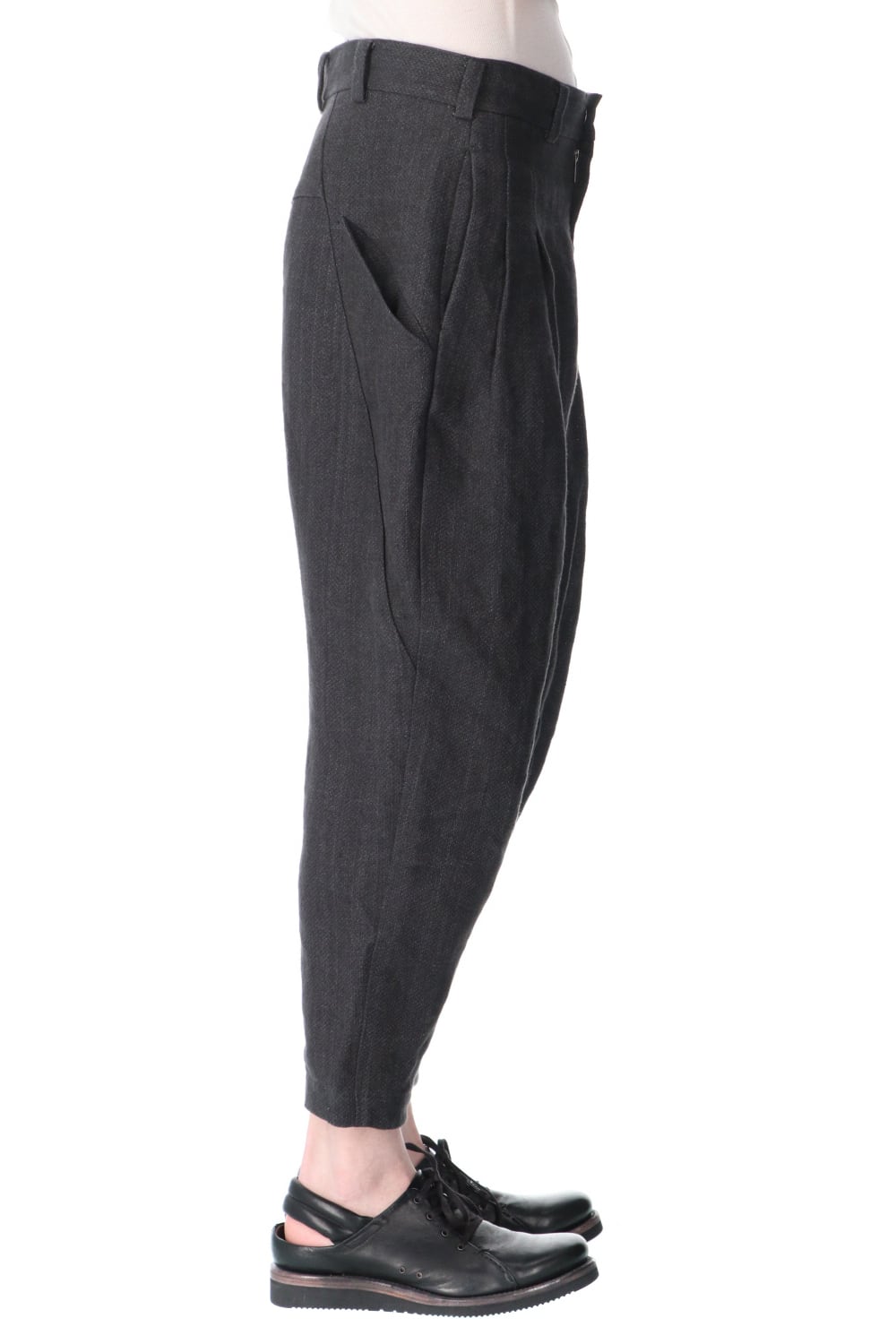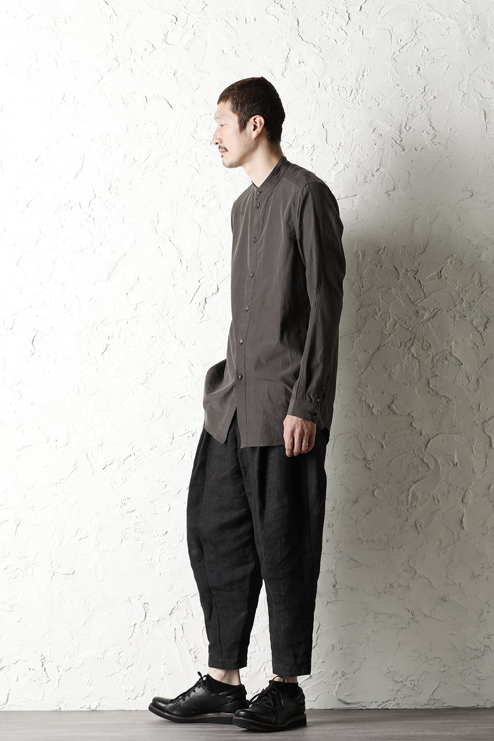 前に大きなタックを2つ取り、足の動く方向に分量を多くとって少し丸みのあるシルエットを形成し、後ろは余計な余りが出ないように分量を削ったおなじみの形。タックは膝あたりまで長く取ることに加えて、裾からもダーツを入れ、膝の運動量を確保しています。 切り替えを余り使わずに、シンプルな形で立体的な形状を作りつつ、シルエットバランスに優れた見た目も両立させています。生地は軽くハリのある和紙とリネンの混紡生地で、リネンの糸は外側だけを染めて芯の部分は白く仕上げることで、色合いに奥行きが生まれ、独特の表情を生み出しています。 通気性と速乾性、耐久性にも優れ、家庭での選択も可能な生地です。 着用していくと経年変化によって、生地が柔らかくなり着用者独自の敏が生地に反映されます。