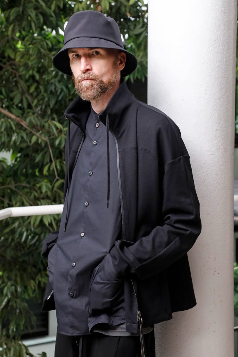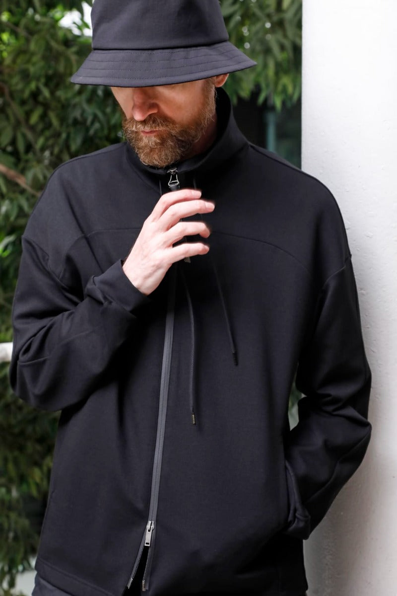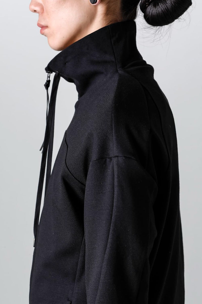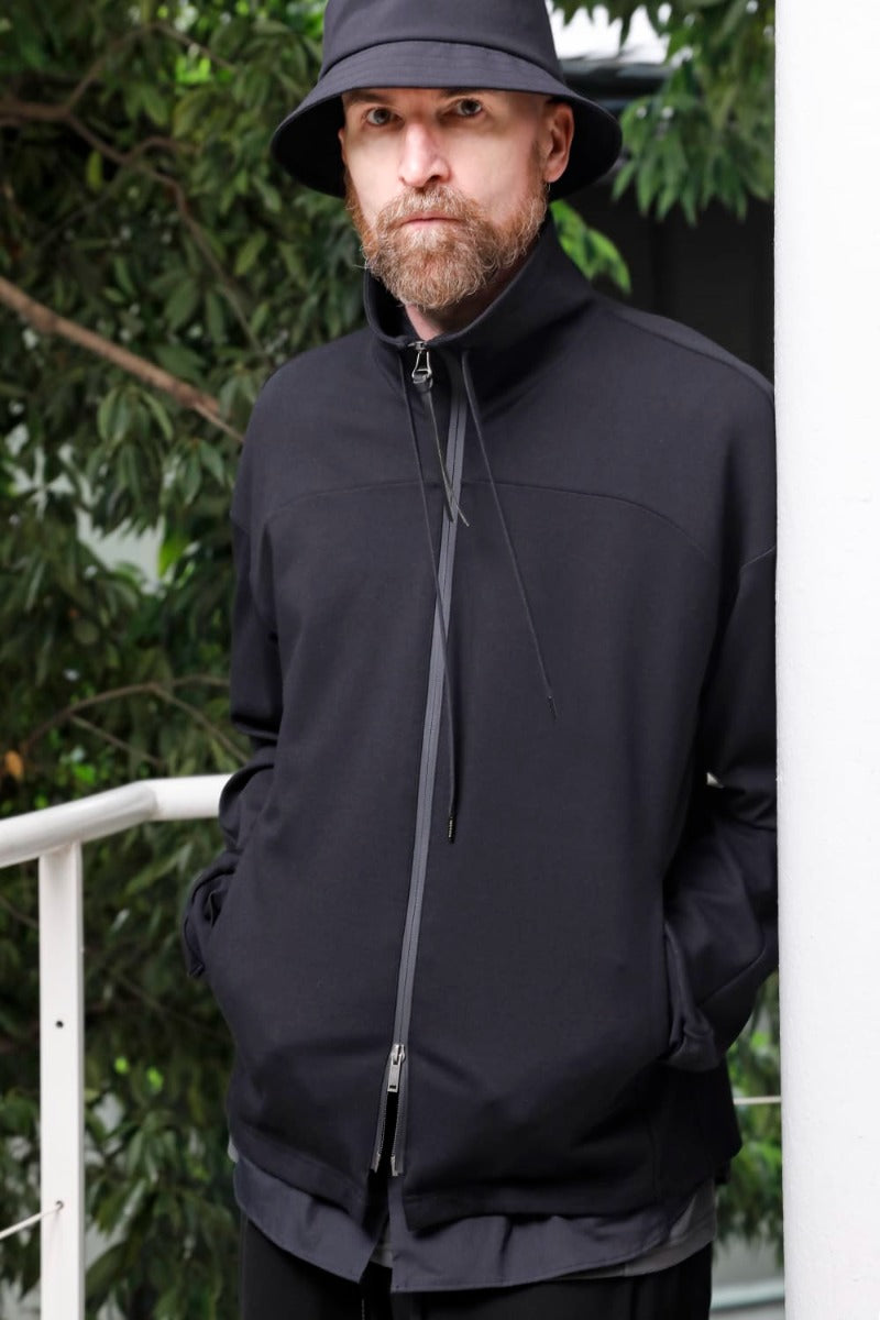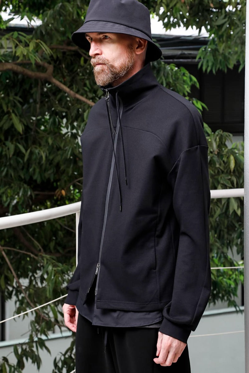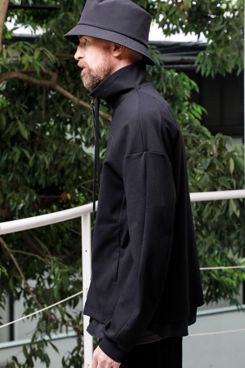 独自の立体的パターンを使ったゆとりのある身幅でドロップショルダー、襟ぐりを緩く設定したハイネックブルゾン。