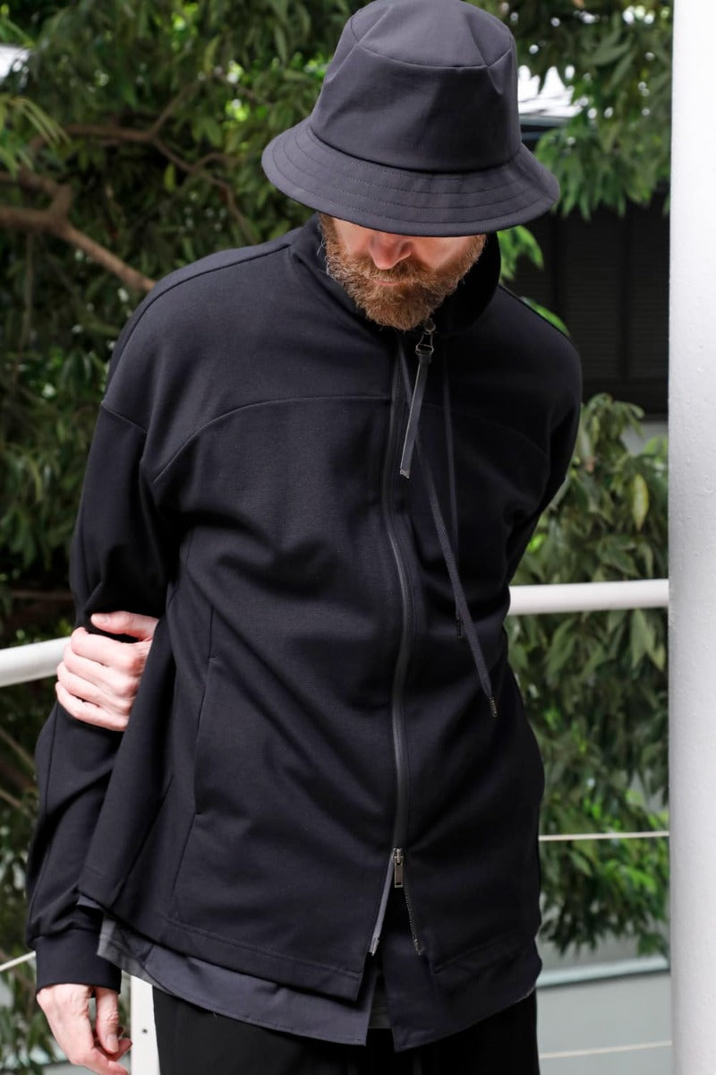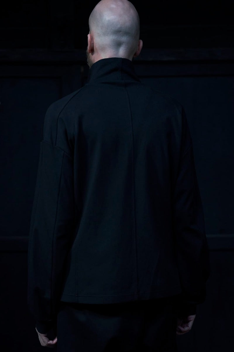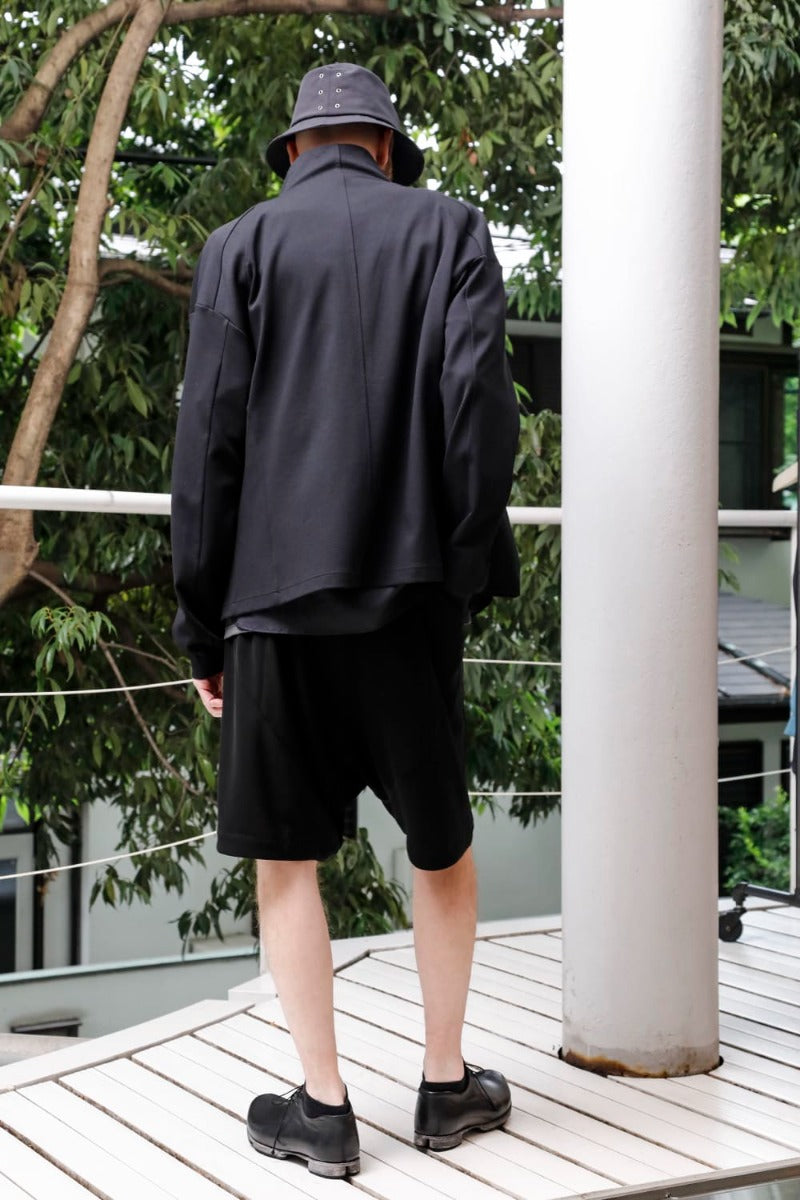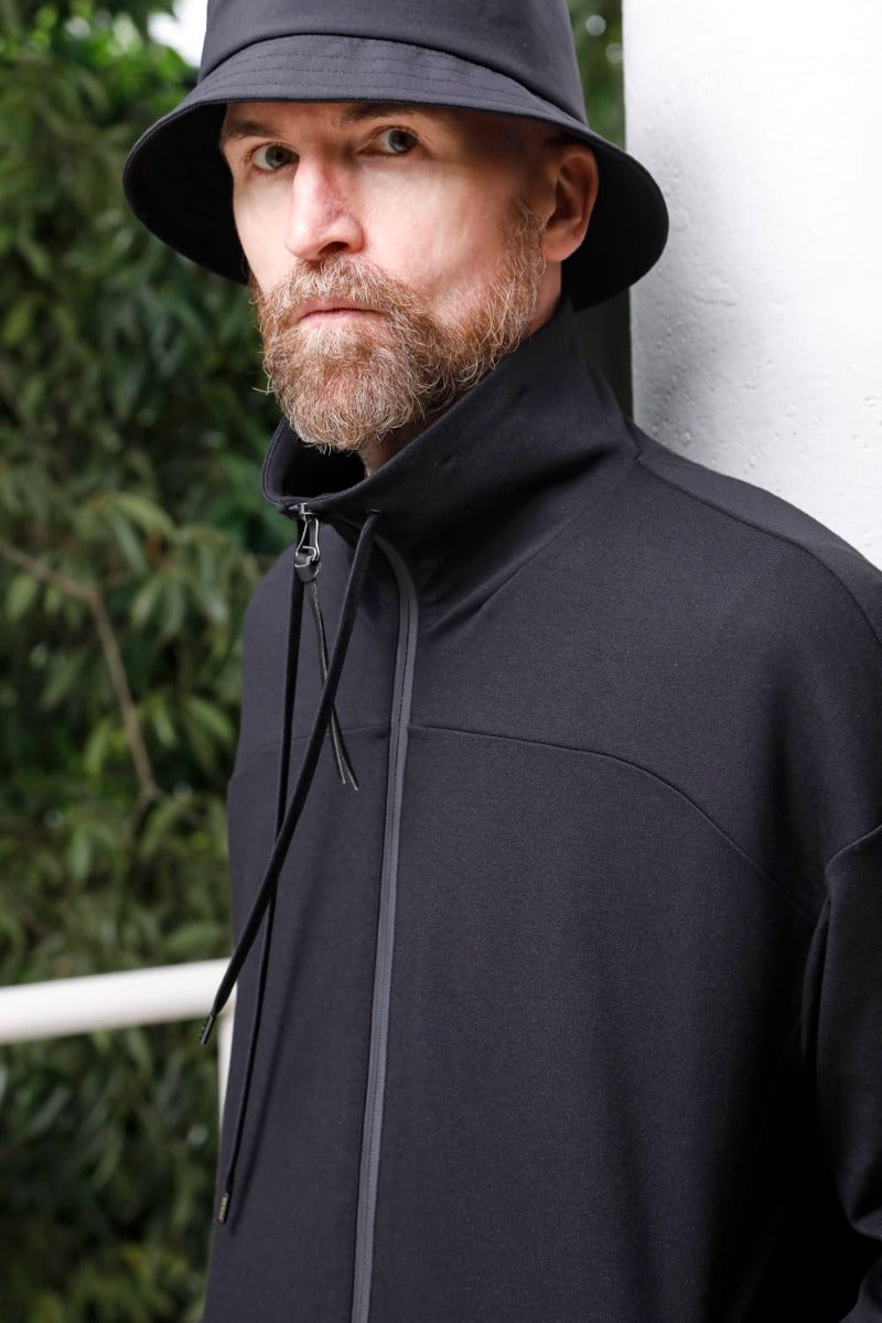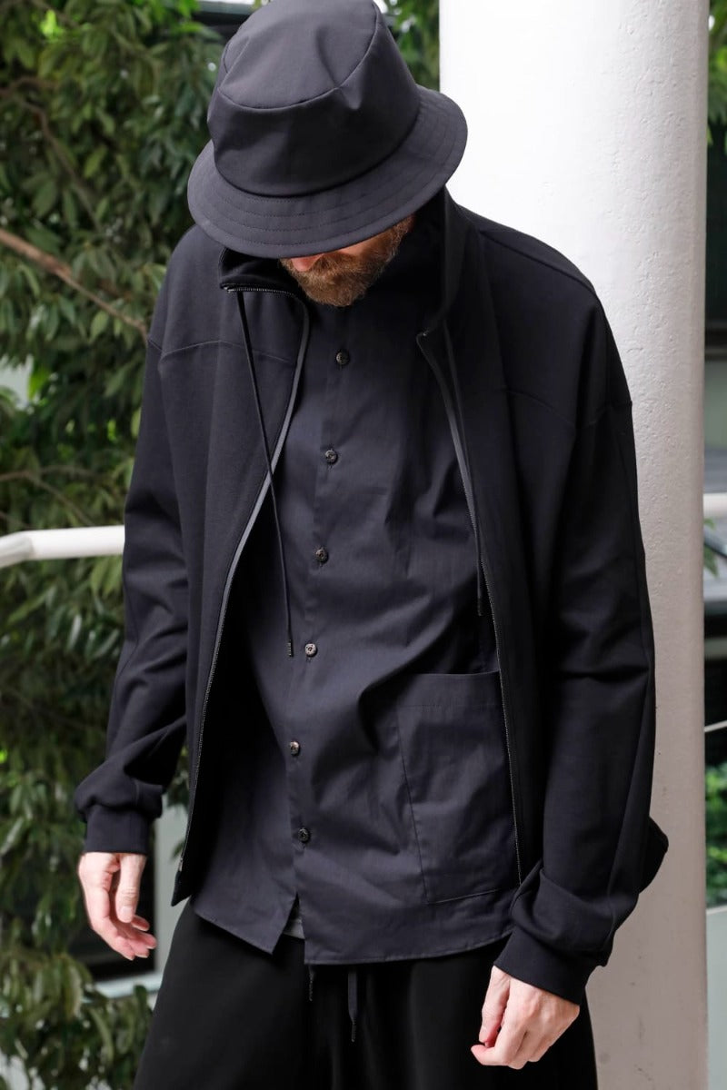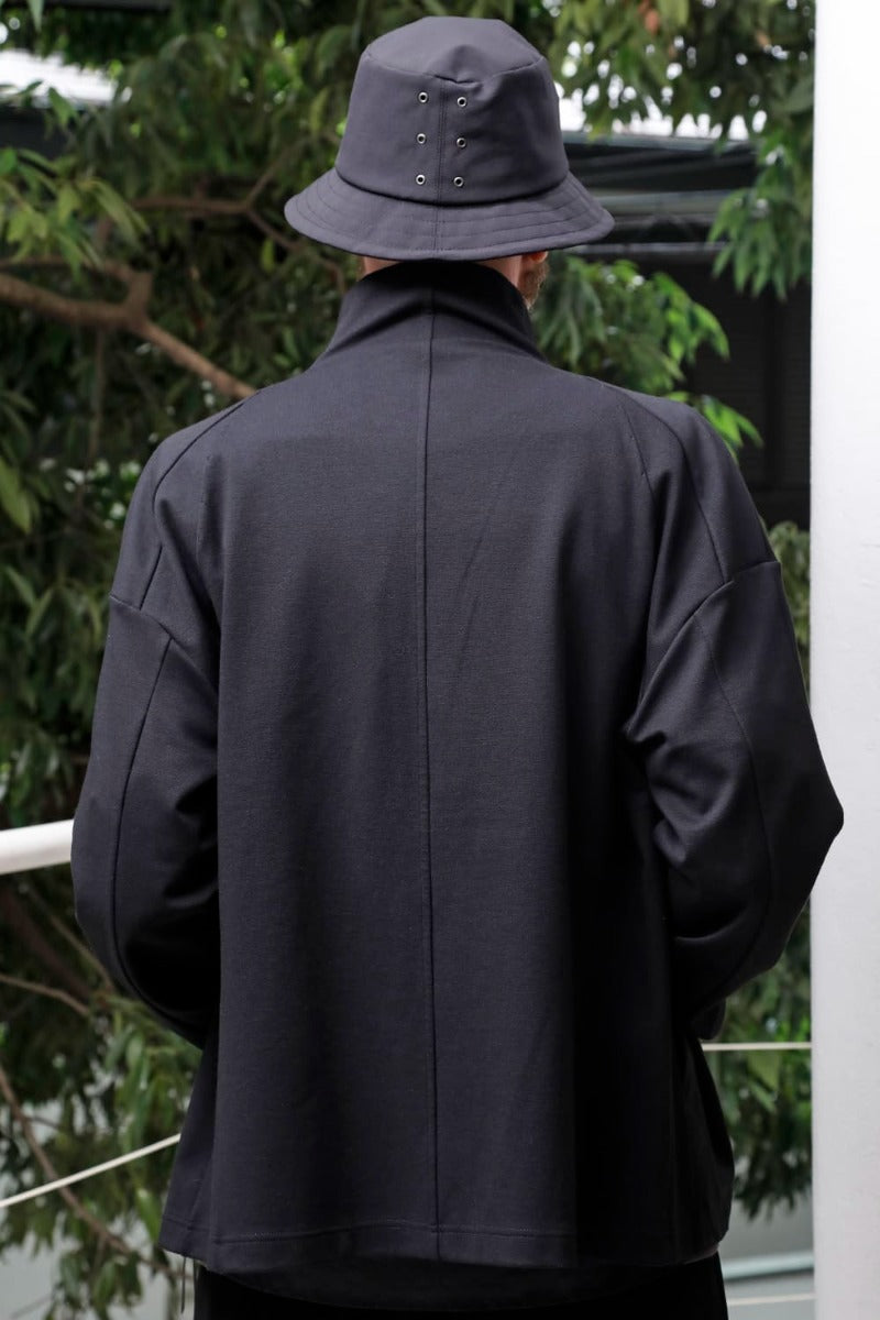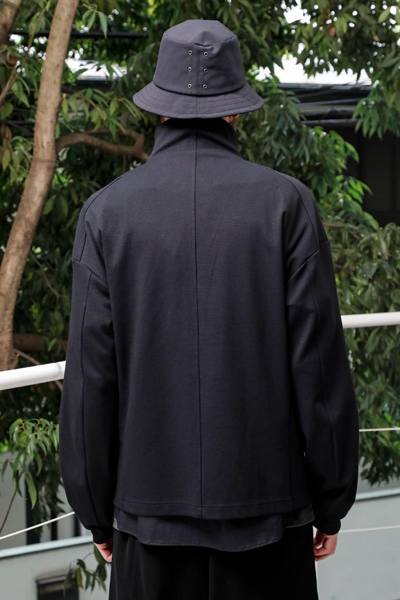 独自の立体的パターンを使ったゆとりのある身幅でドロップショルダー、襟ぐりを緩く設定したハイネックブルゾン。