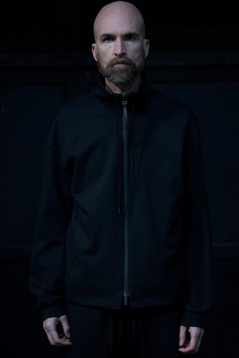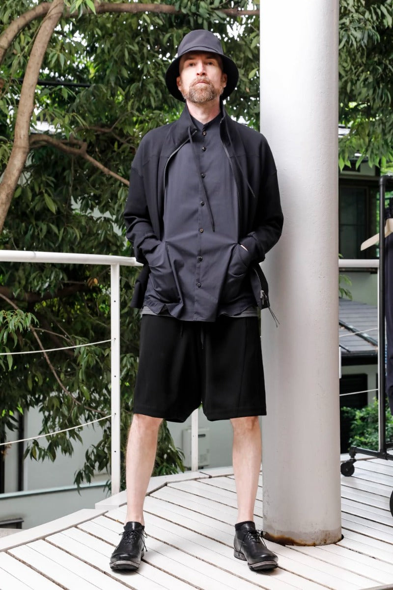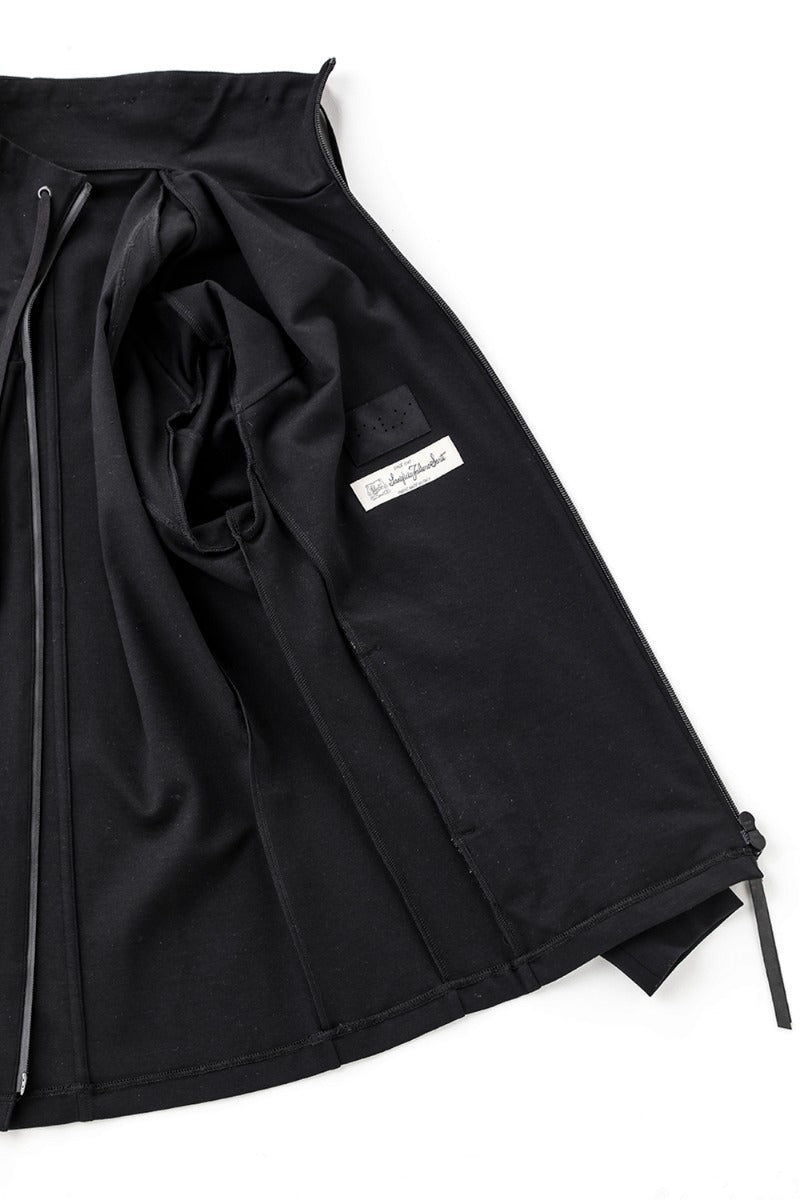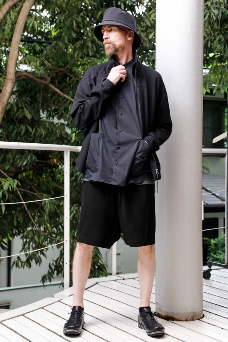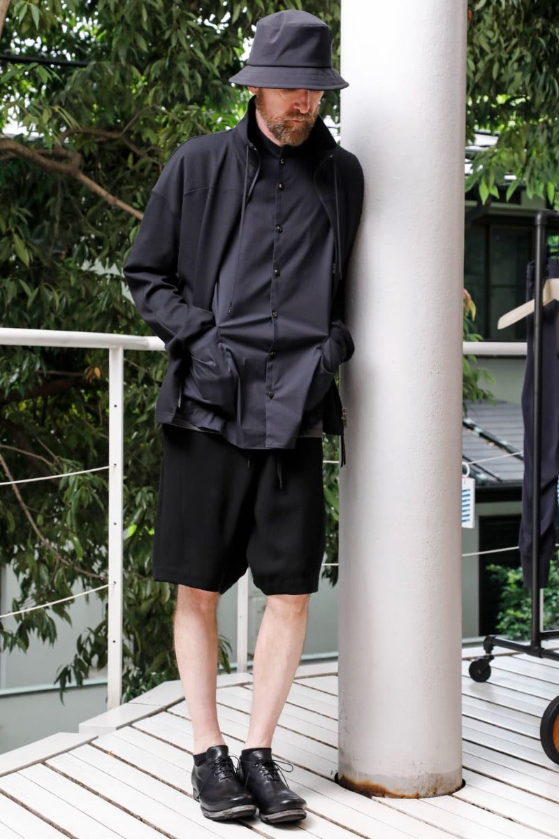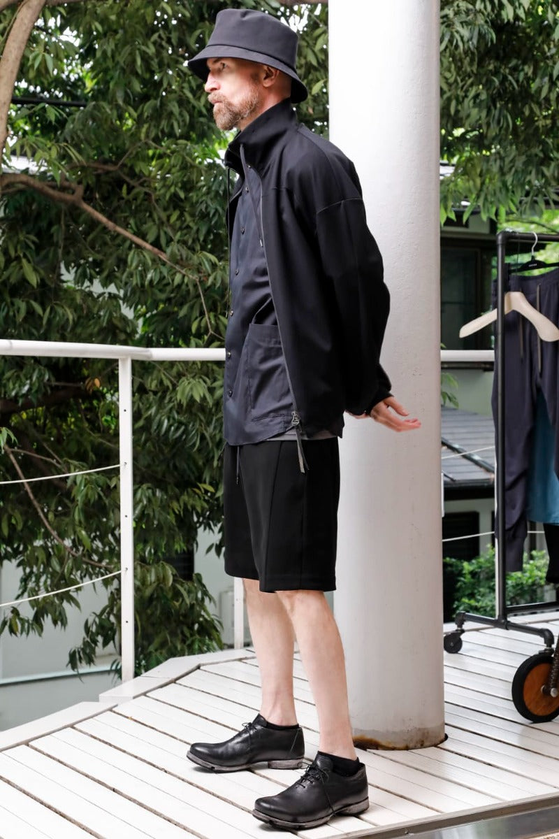 独自の立体的パターンを使ったゆとりのある身幅でドロップショルダー、襟ぐりを緩く設定したハイネックブルゾン。