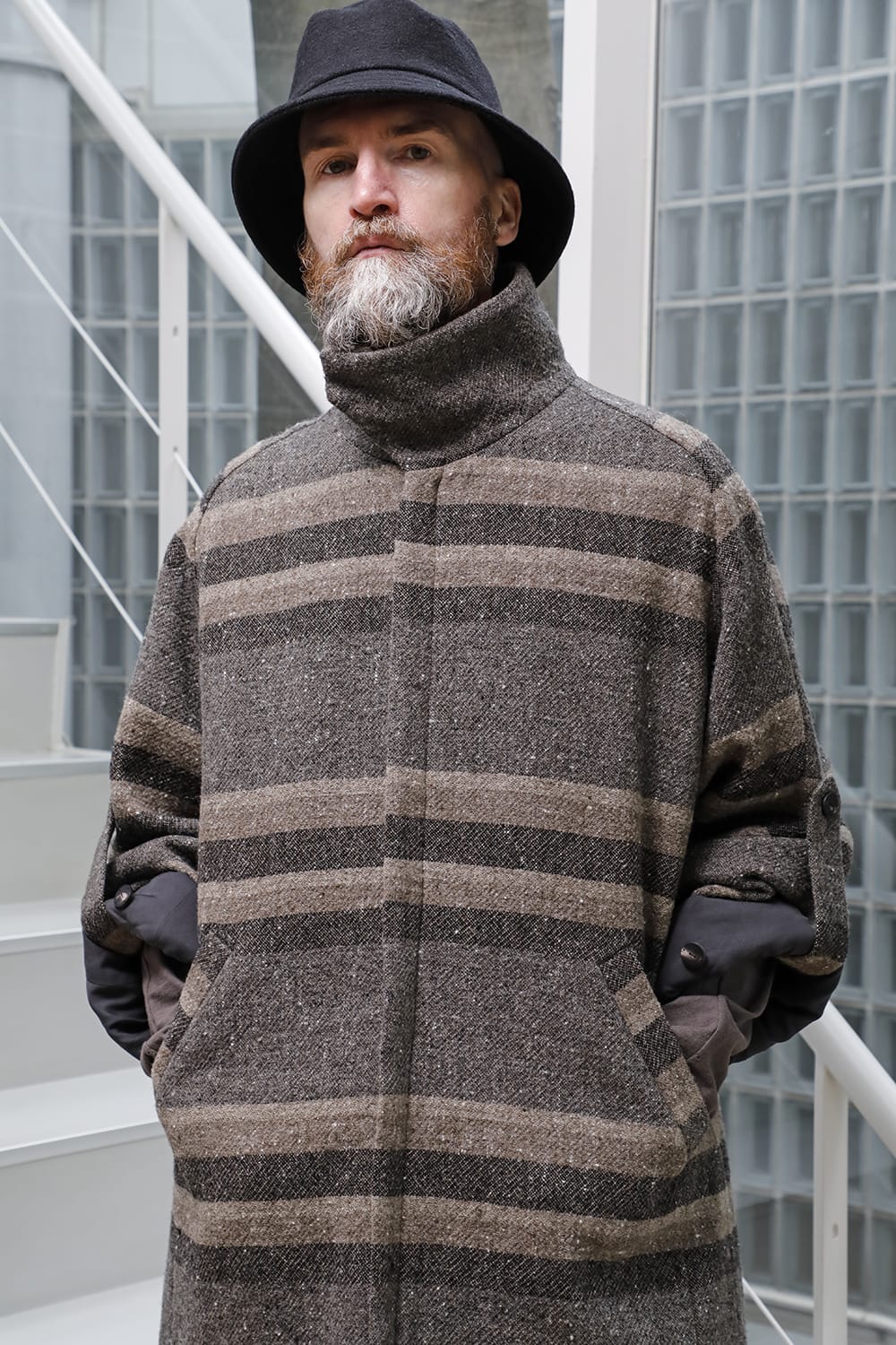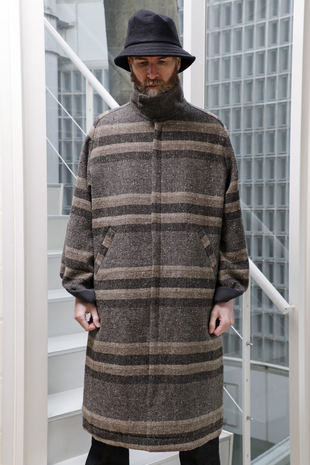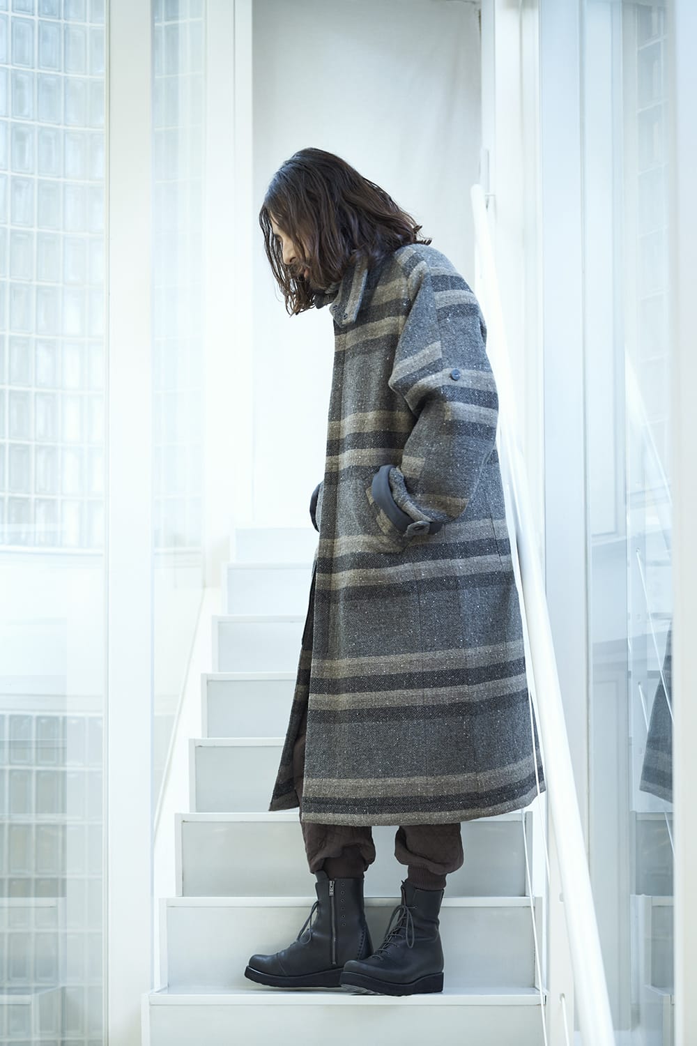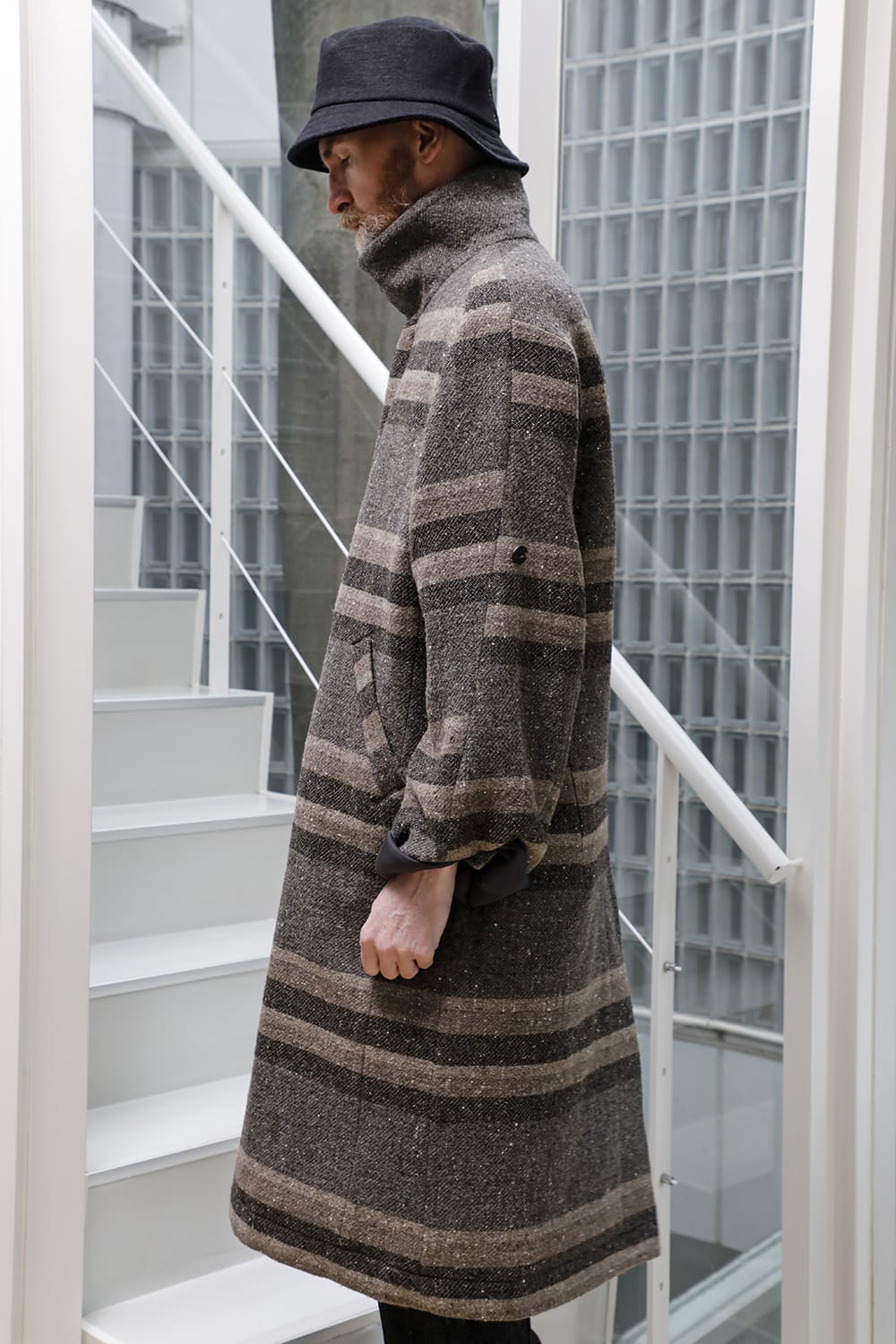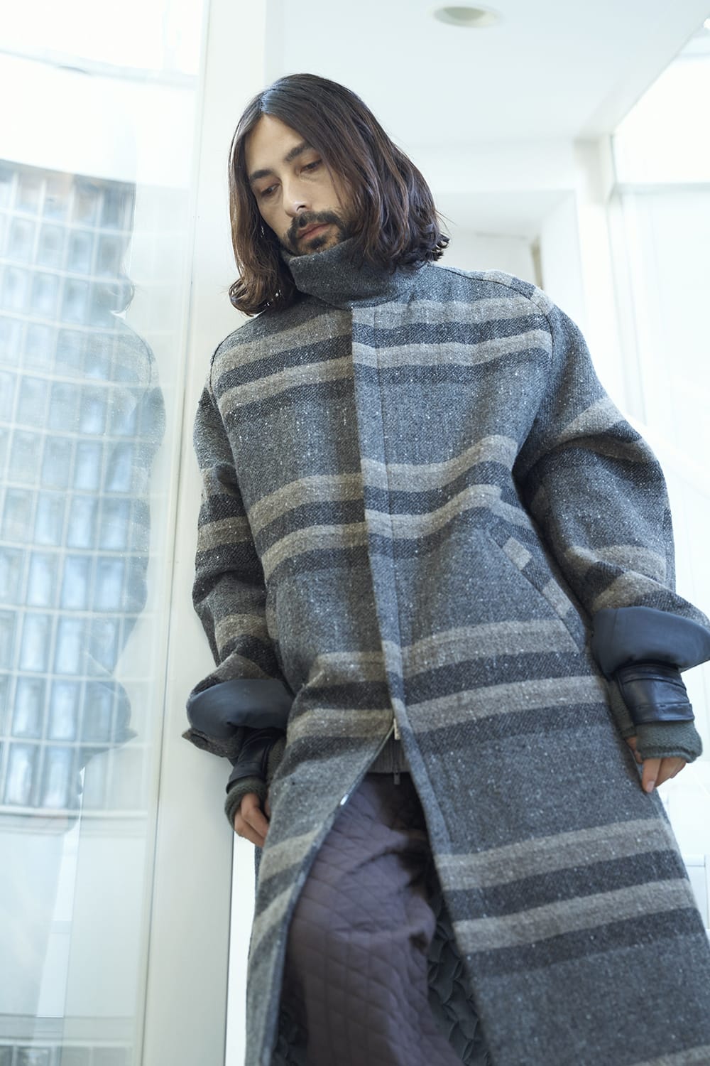 オーバーコートのようなルーズフィットシルエットで制作したハイネックコート。